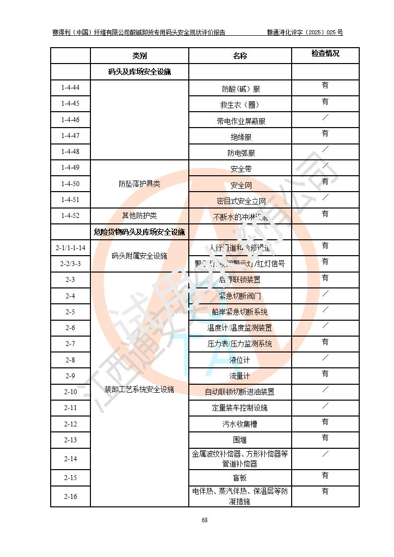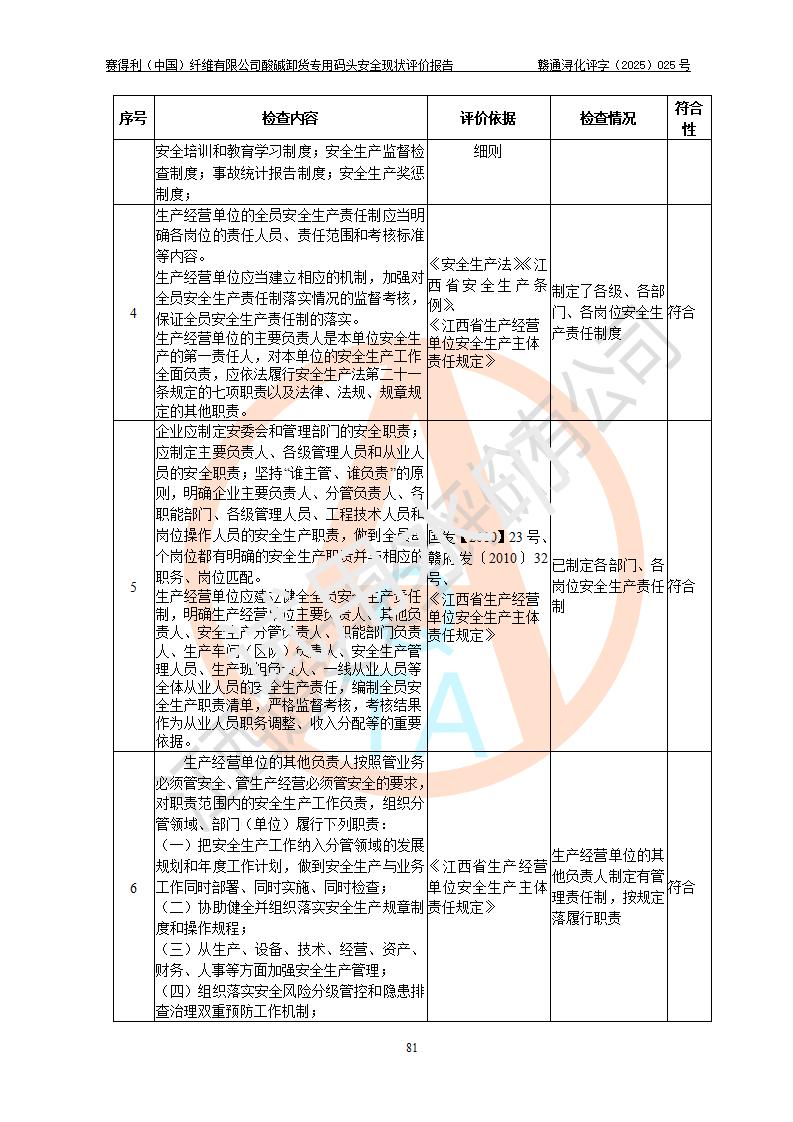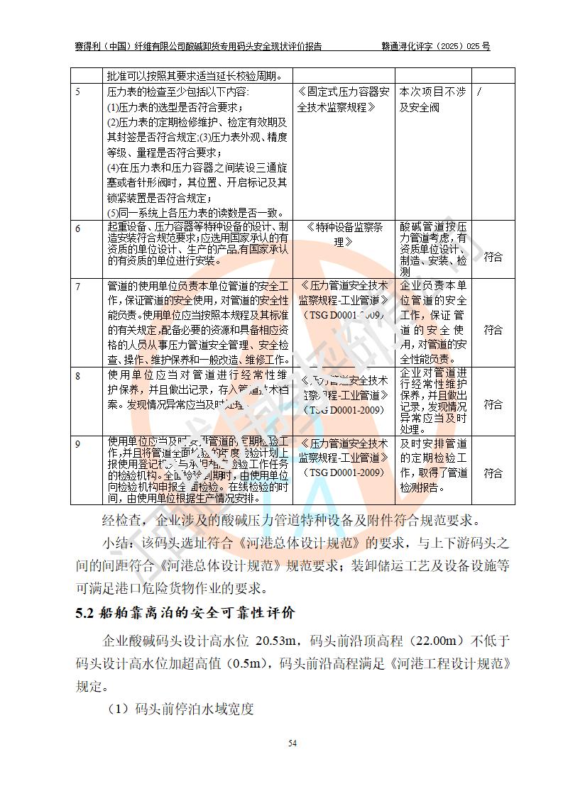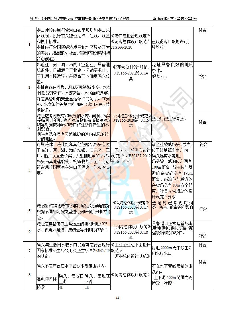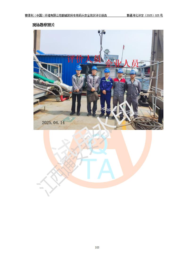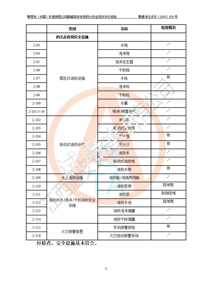 評價(jià)結(jié)論 | 經(jīng)評價(jià)組評價(jià),賽得利(中國)纖維有限公司酸堿卸貨**碼頭配套安全裝置、防護(hù)設(shè)施以及采取的安全管理措施符合**有關(guān)法規(guī)、標(biāo)準(zhǔn)、規(guī)范要求,符合《港口經(jīng)營管理規(guī)定》《港口危險(xiǎn)貨物安全管理規(guī)定》等規(guī)定的安全生產(chǎn)條件;酸堿卸貨**碼頭風(fēng)險(xiǎn)可控,可滿足危險(xiǎn)貨物港口作業(yè)的安全生產(chǎn)條件。 | |||||