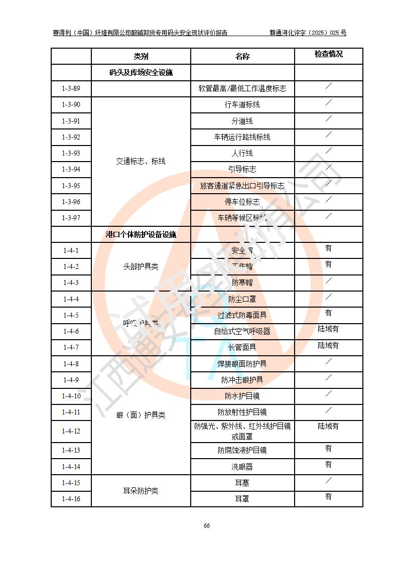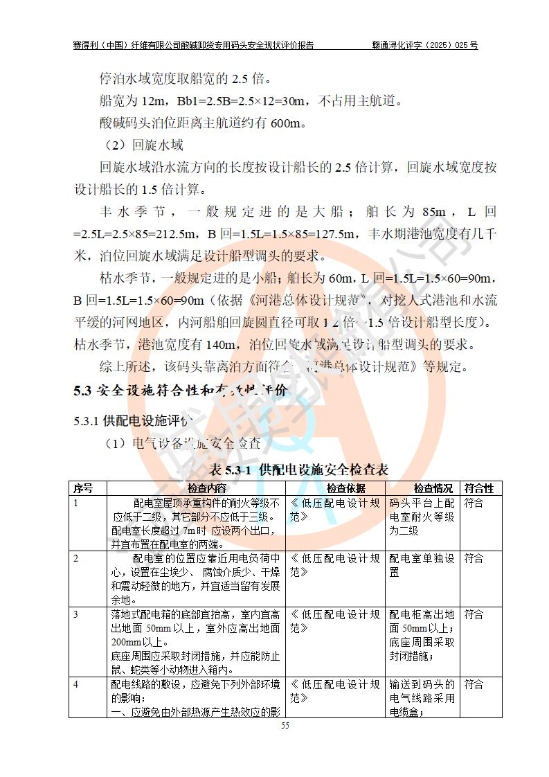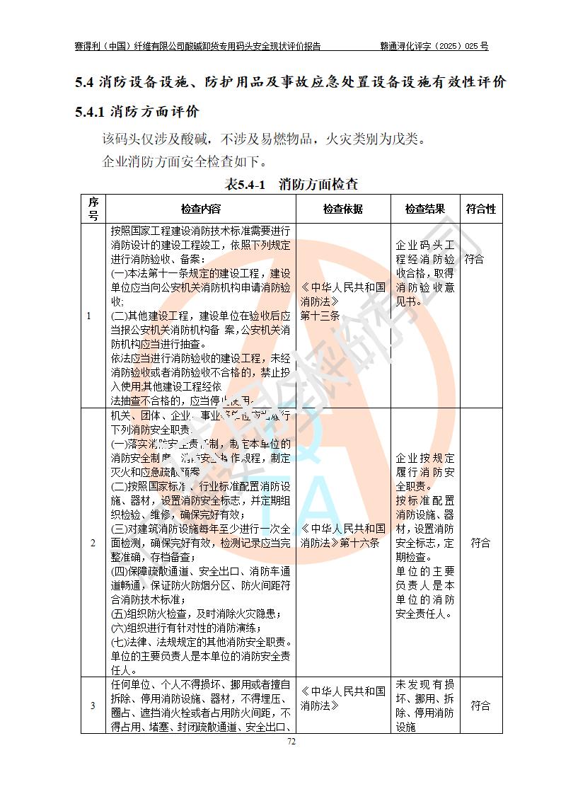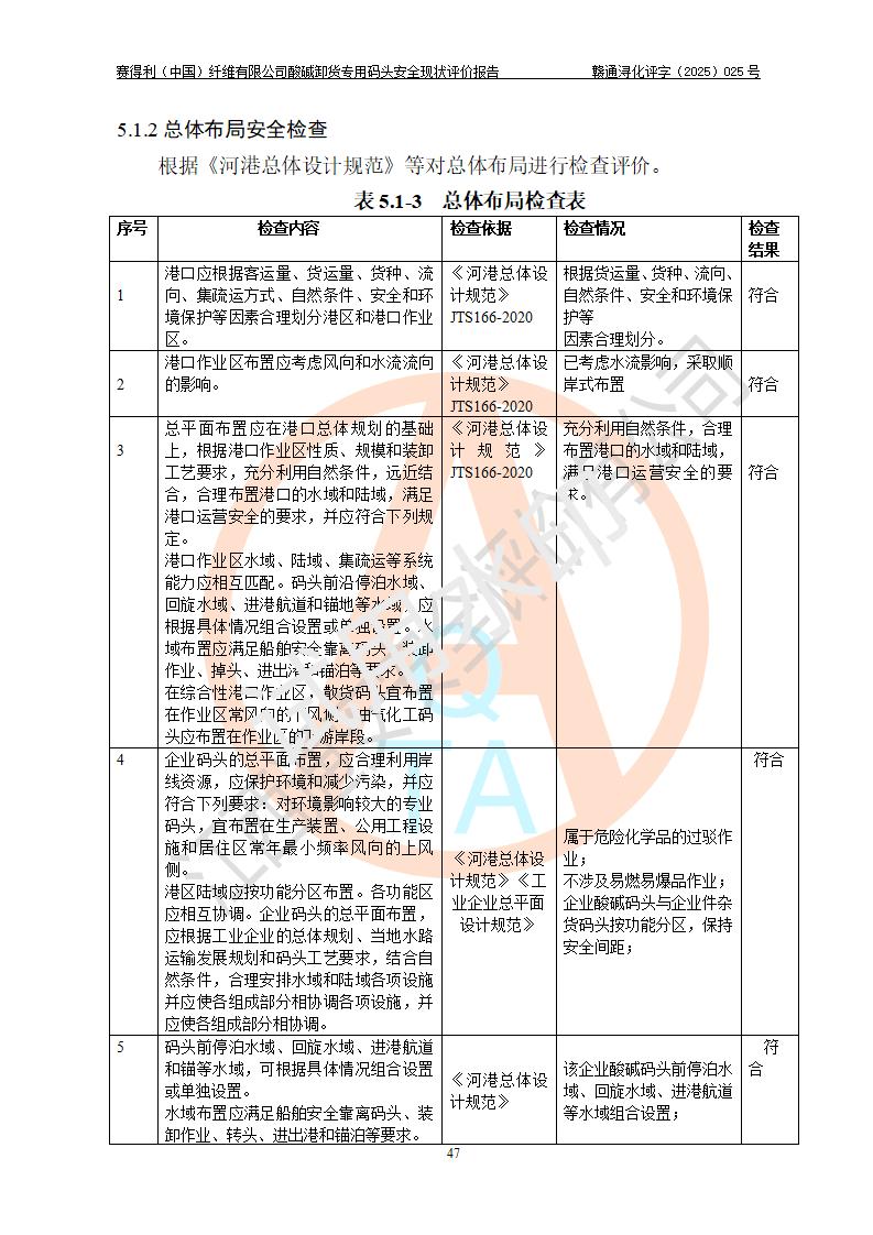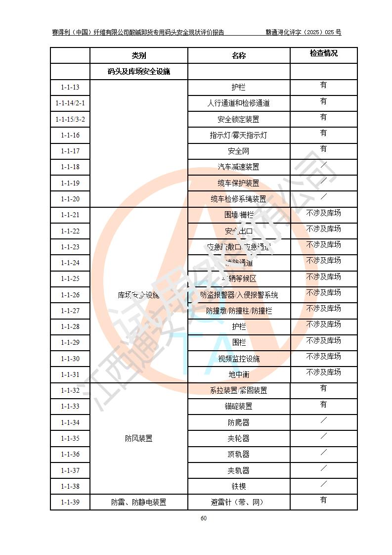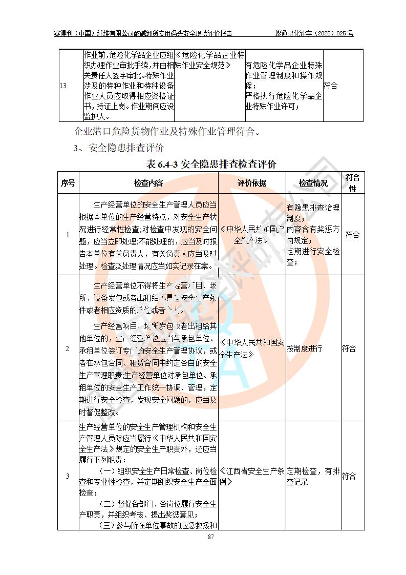 評價(jià)結(jié)論 | 經(jīng)評價(jià)組評價(jià),賽得利(中國)纖維有限公司酸堿卸貨**碼頭配套安全裝置、防護(hù)設(shè)施以及采取的安全管理措施符合**有關(guān)法規(guī)、標(biāo)準(zhǔn)、規(guī)范要求,符合《港口經(jīng)營管理規(guī)定》《港口危險(xiǎn)貨物安全管理規(guī)定》等規(guī)定的安全生產(chǎn)條件;酸堿卸貨**碼頭風(fēng)險(xiǎn)可控,可滿足危險(xiǎn)貨物港口作業(yè)的安全生產(chǎn)條件。 | |||||