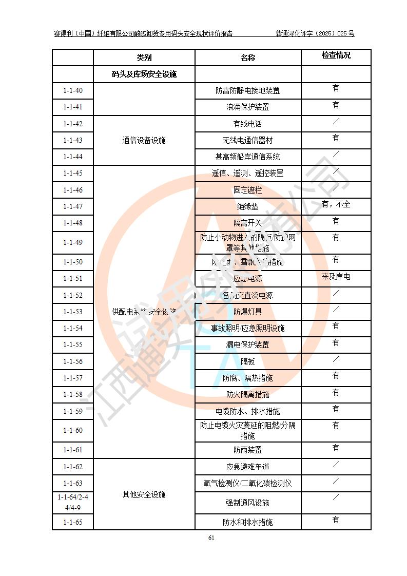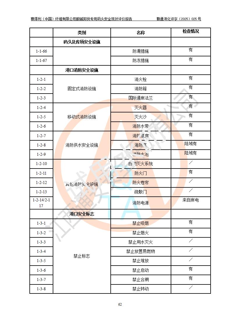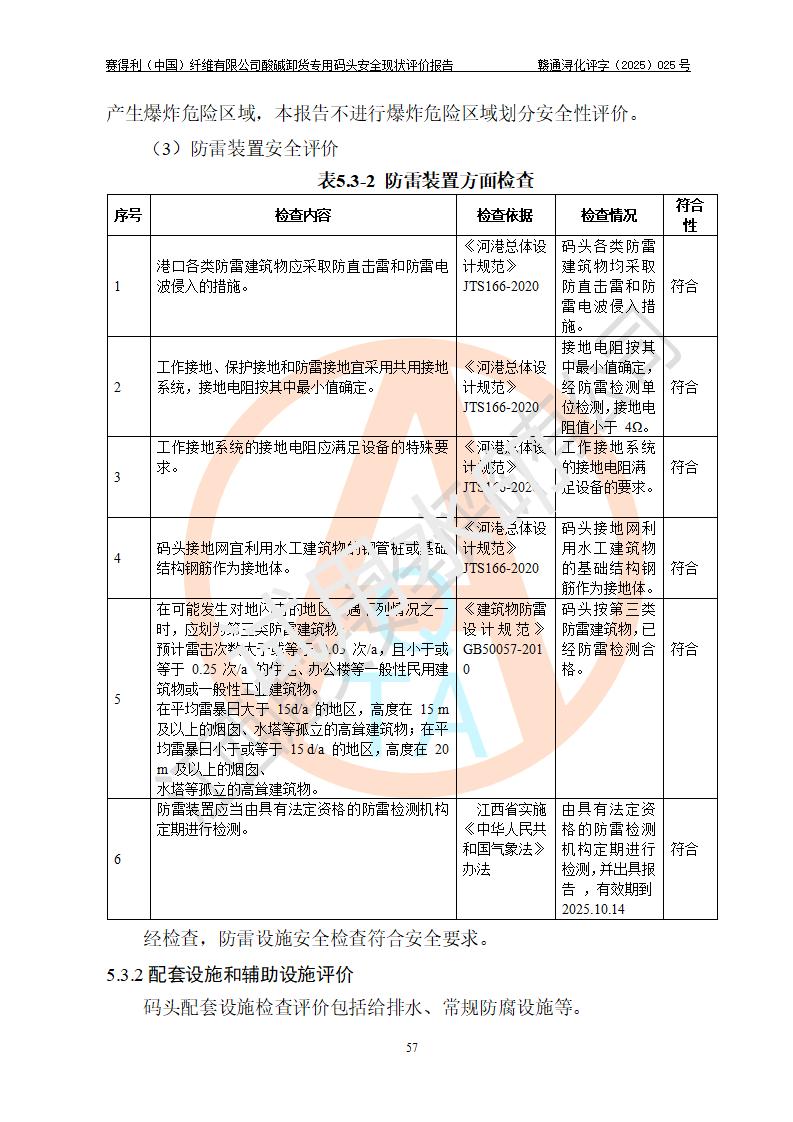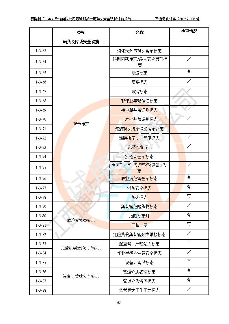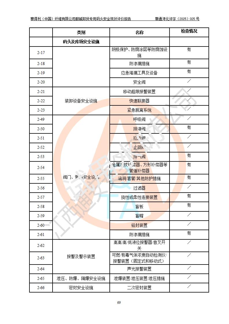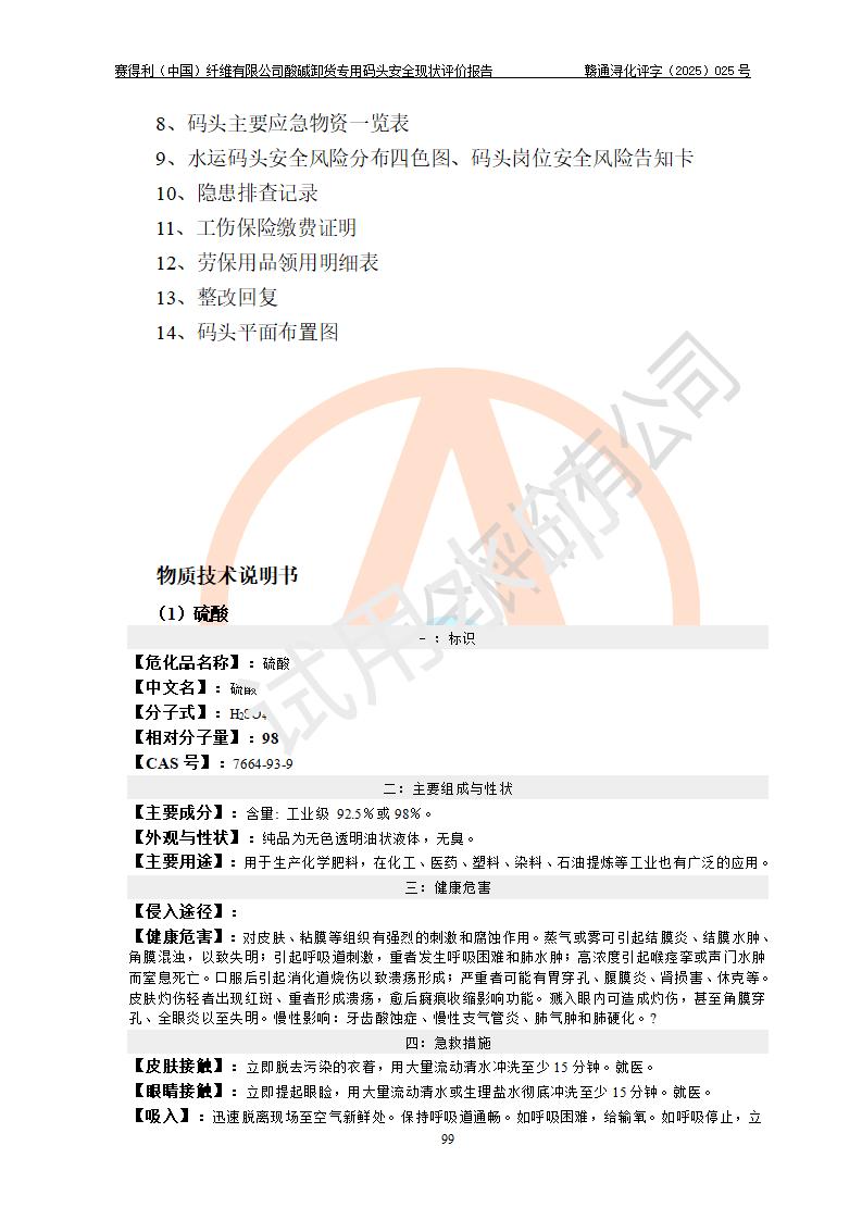 評價(jià)結(jié)論 | 經(jīng)評價(jià)組評價(jià),賽得利(中國)纖維有限公司酸堿卸貨**碼頭配套安全裝置、防護(hù)設(shè)施以及采取的安全管理措施符合**有關(guān)法規(guī)、標(biāo)準(zhǔn)、規(guī)范要求,符合《港口經(jīng)營管理規(guī)定》《港口危險(xiǎn)貨物安全管理規(guī)定》等規(guī)定的安全生產(chǎn)條件;酸堿卸貨**碼頭風(fēng)險(xiǎn)可控,可滿足危險(xiǎn)貨物港口作業(yè)的安全生產(chǎn)條件。 | |||||
