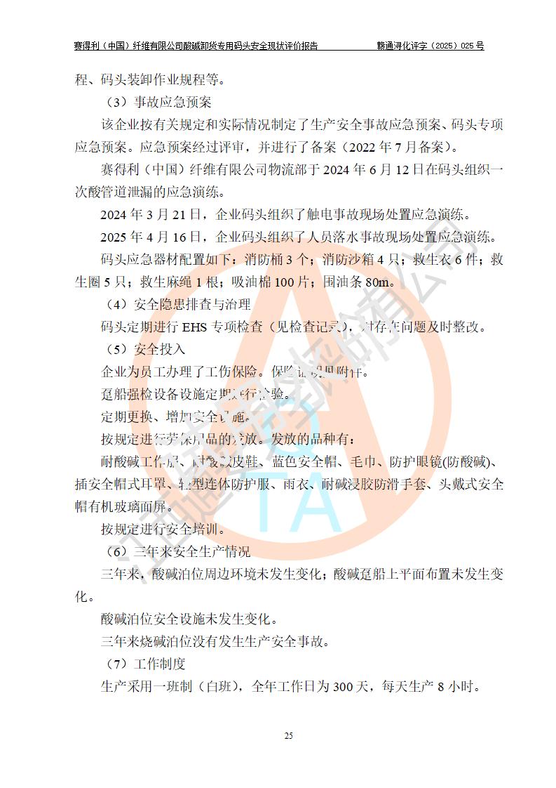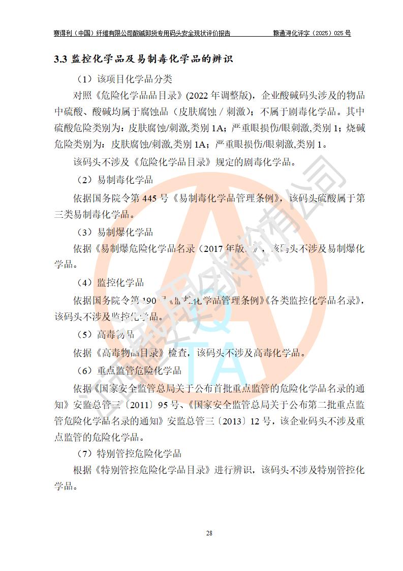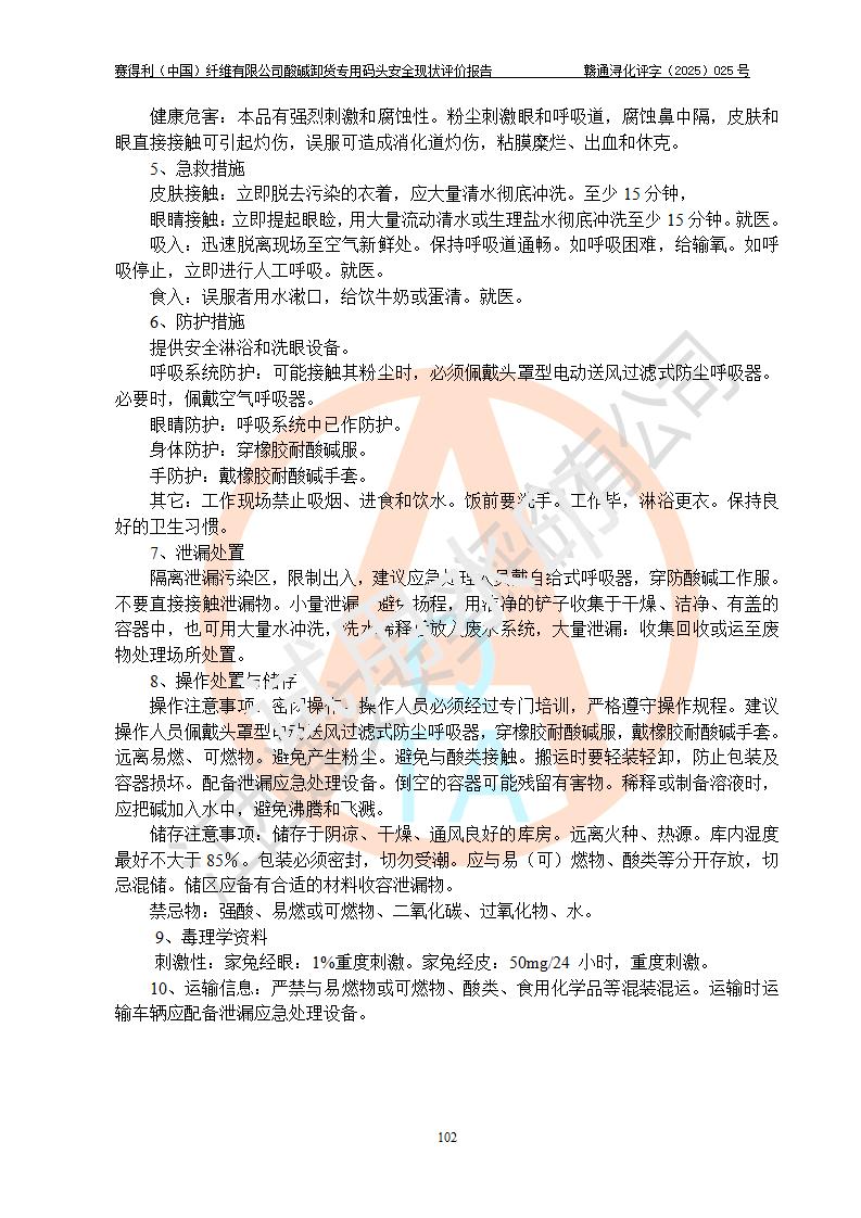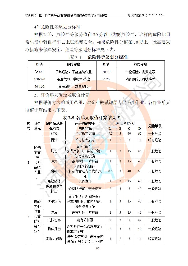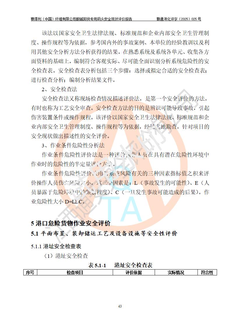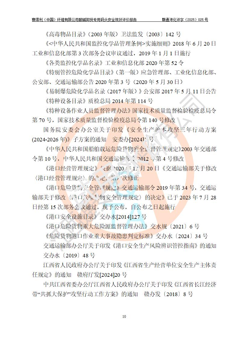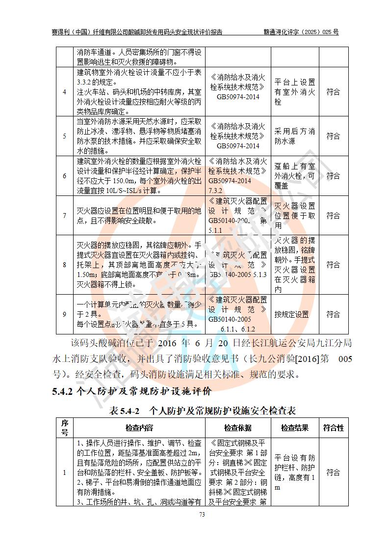 評價(jià)結(jié)論 | 經(jīng)評價(jià)組評價(jià),賽得利(中國)纖維有限公司酸堿卸貨**碼頭配套安全裝置、防護(hù)設(shè)施以及采取的安全管理措施符合**有關(guān)法規(guī)、標(biāo)準(zhǔn)、規(guī)范要求,符合《港口經(jīng)營管理規(guī)定》《港口危險(xiǎn)貨物安全管理規(guī)定》等規(guī)定的安全生產(chǎn)條件;酸堿卸貨**碼頭風(fēng)險(xiǎn)可控,可滿足危險(xiǎn)貨物港口作業(yè)的安全生產(chǎn)條件。 | |||||