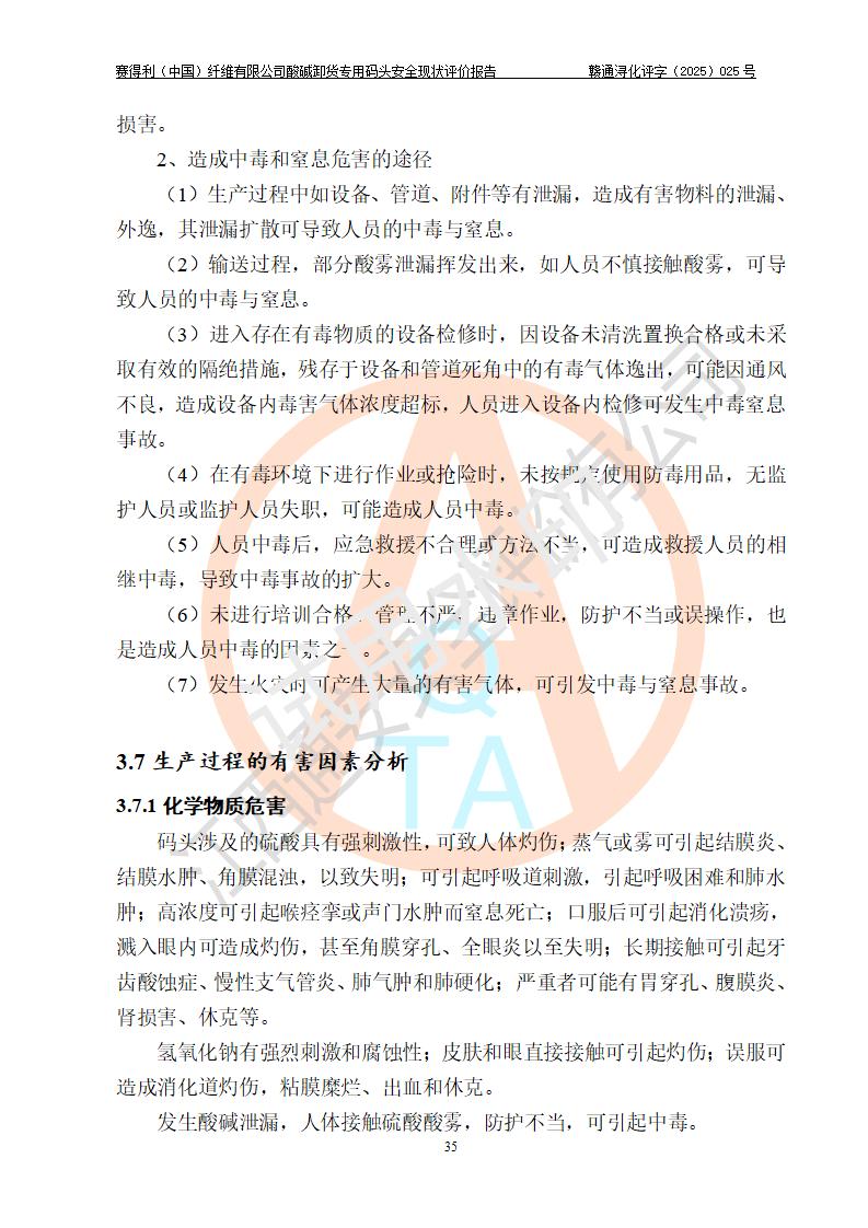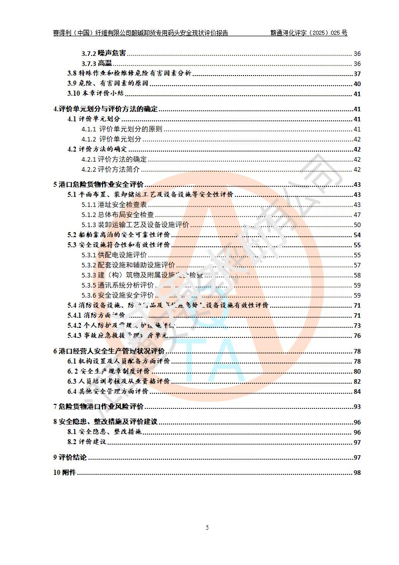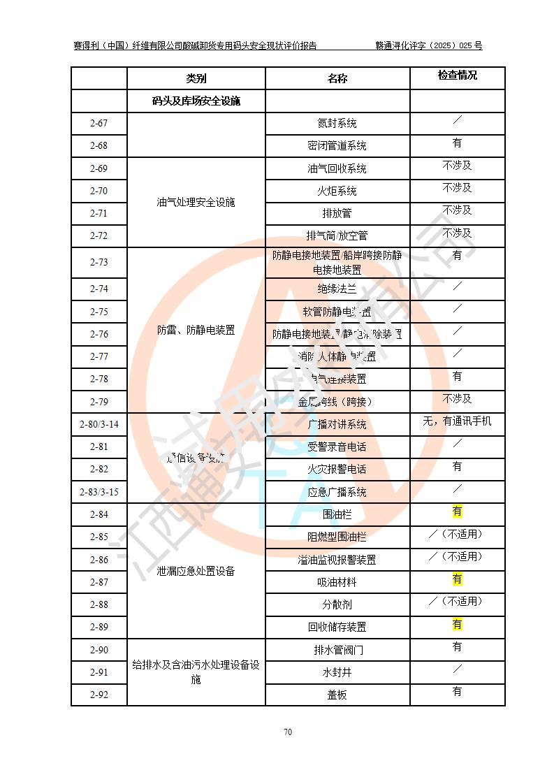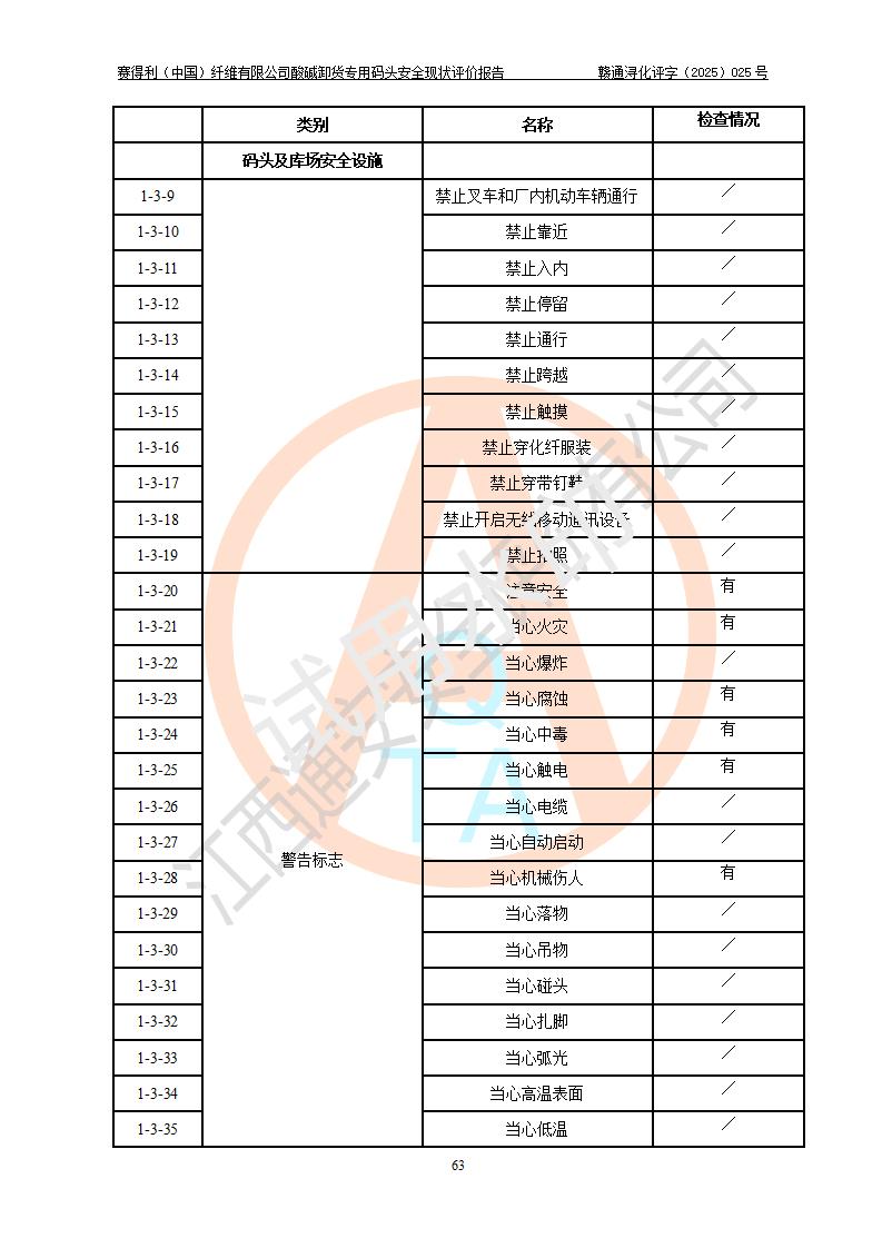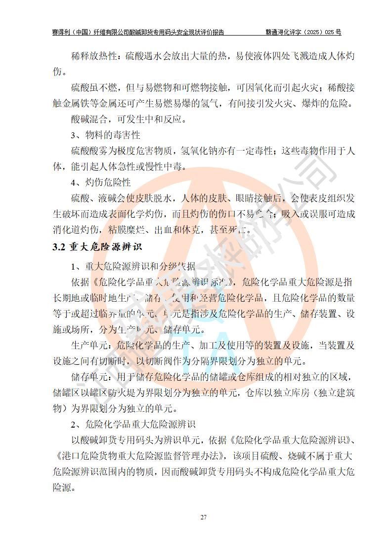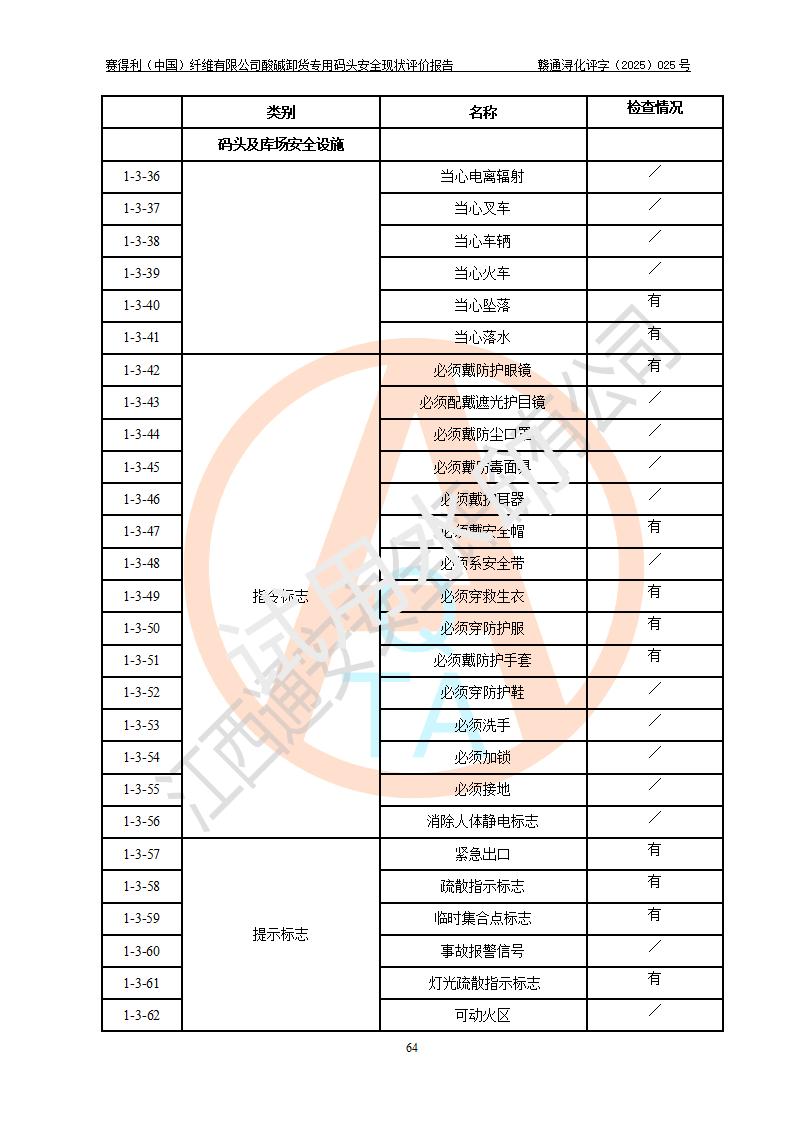 評價(jià)結(jié)論 | 經(jīng)評價(jià)組評價(jià),賽得利(中國)纖維有限公司酸堿卸貨**碼頭配套安全裝置、防護(hù)設(shè)施以及采取的安全管理措施符合**有關(guān)法規(guī)、標(biāo)準(zhǔn)、規(guī)范要求,符合《港口經(jīng)營管理規(guī)定》《港口危險(xiǎn)貨物安全管理規(guī)定》等規(guī)定的安全生產(chǎn)條件;酸堿卸貨**碼頭風(fēng)險(xiǎn)可控,可滿足危險(xiǎn)貨物港口作業(yè)的安全生產(chǎn)條件。 | |||||