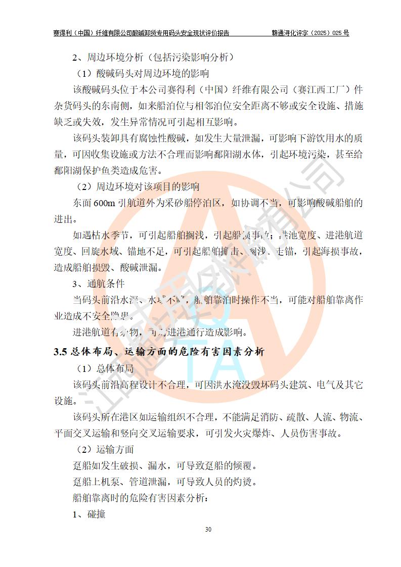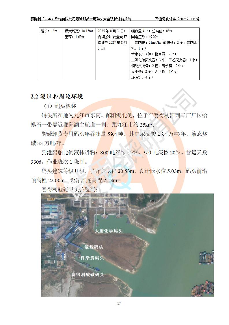 項(xiàng)目簡介 | 賽得利(中國)纖維有限公司酸堿卸貨**碼頭(2009.12-2011.6在鄱陽湖水域建設(shè)了一個(gè)酸堿貨運(yùn)**碼頭, 2016年進(jìn)行了驗(yàn)收評價(jià))位于鄱陽湖邊、廠區(qū)的東面,年吞吐量59.4萬噸,其中濃硫酸26.4萬噸/年,液態(tài)燒堿33萬噸/年。企業(yè)酸堿卸貨**碼頭靠泊能力為800噸級兼顧1000噸級。碼頭酸、堿單泊位長68m;岸線長度:225m(港口非深水岸線)。年吞吐量:59.4萬噸/年,其中,酸26.4萬噸/年,堿33萬噸/年;結(jié)構(gòu)型式:高樁梁板式。 安全管理方面,賽得利(中國)纖維有限公司執(zhí)行“一企一策”,執(zhí)行了安全生產(chǎn)檢查表(港口企業(yè)),加強(qiáng)安全管理。 | |||||