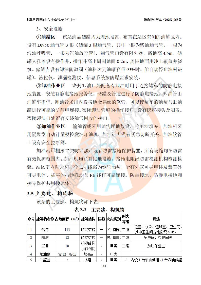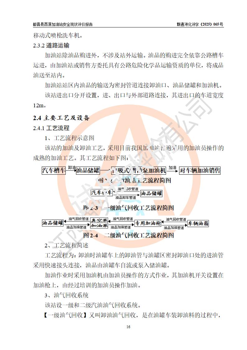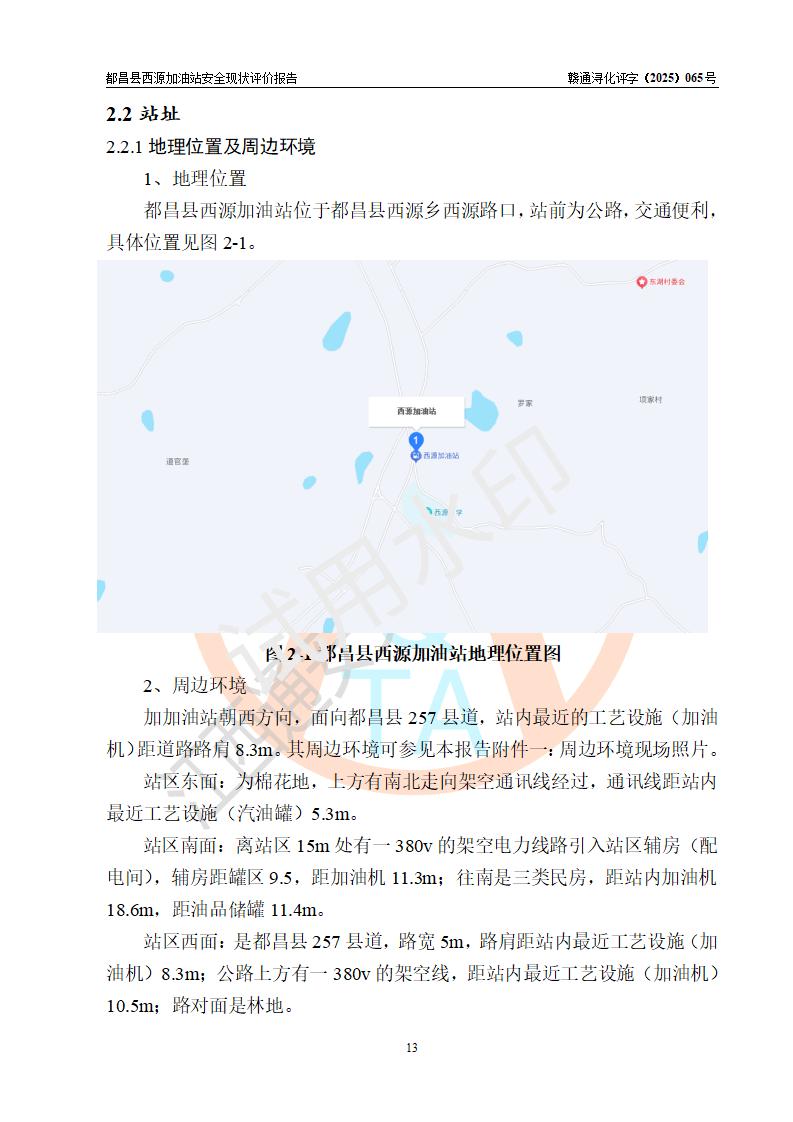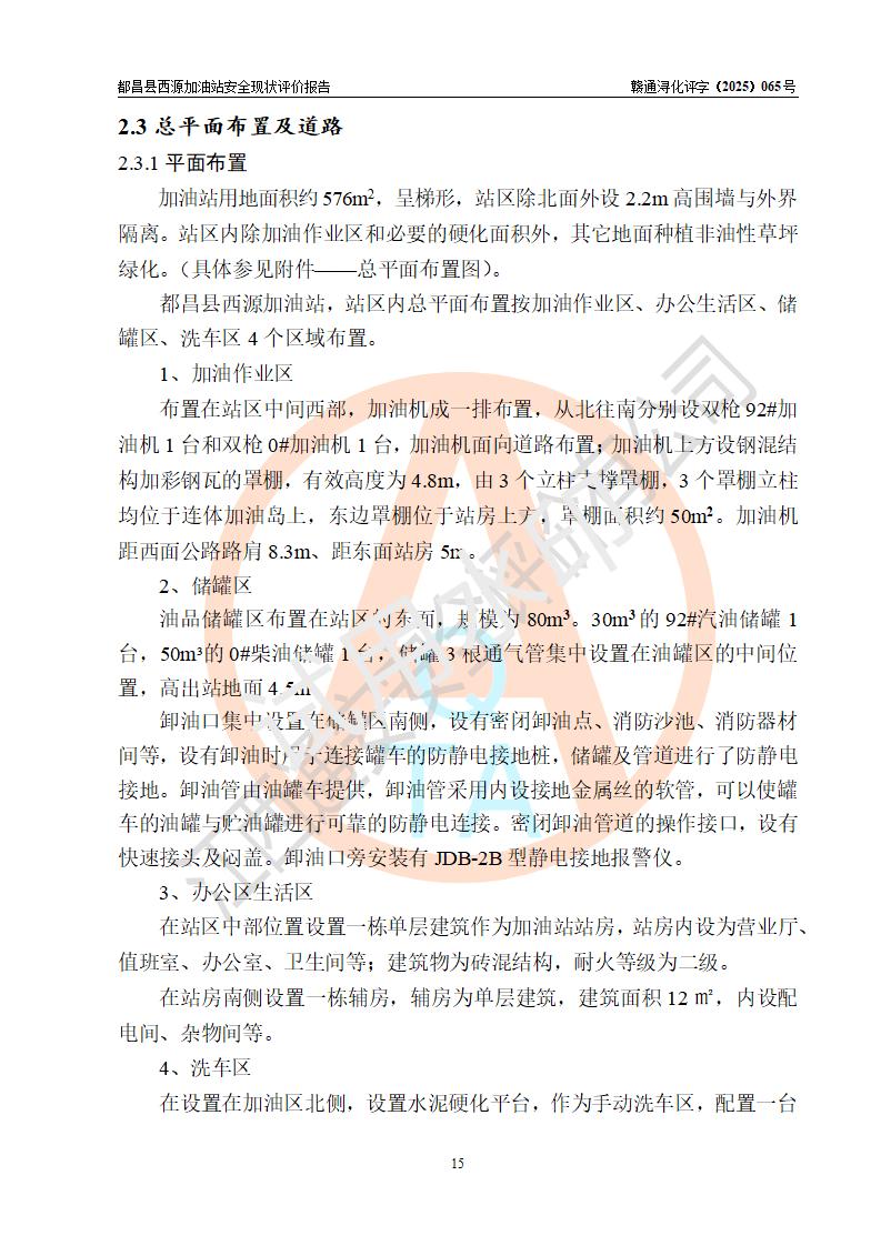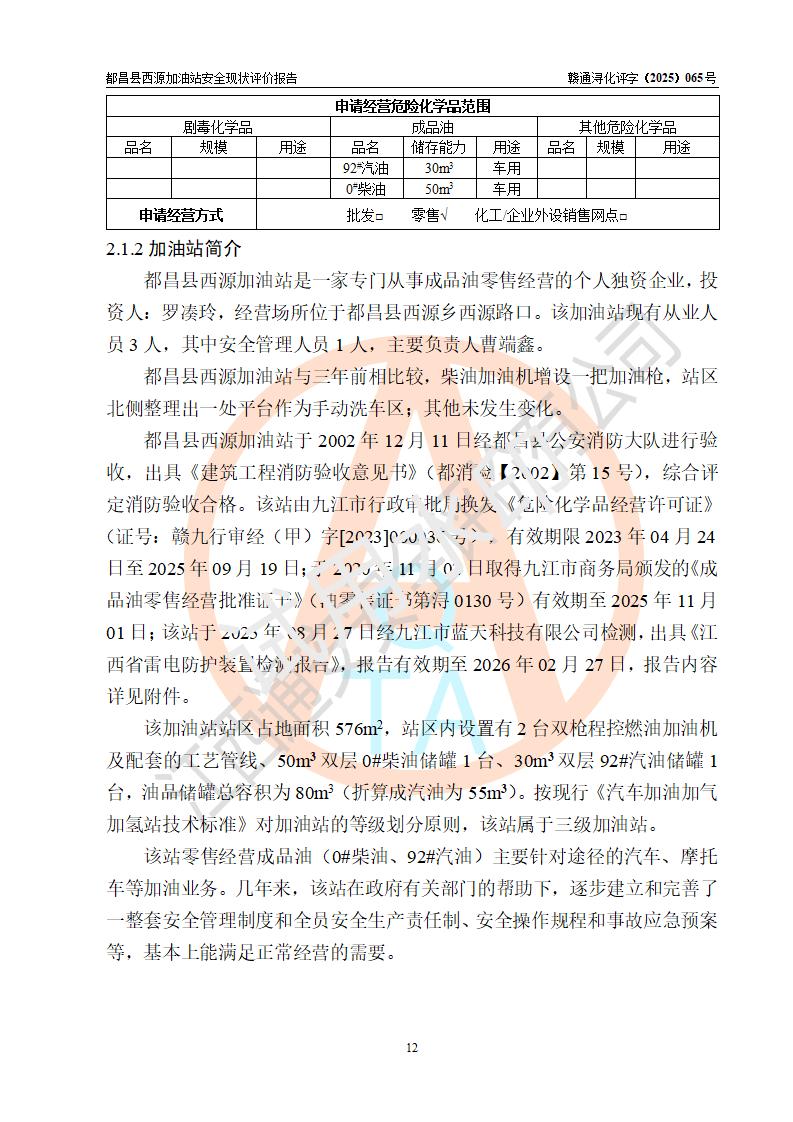 項(xiàng)目簡(jiǎn)介 | 都昌縣西源加油站是一家專門從事成品油零售經(jīng)營(yíng)的個(gè)人獨(dú)資企業(yè),投資人:羅湊玲,經(jīng)營(yíng)場(chǎng)所位于都昌縣西源鄉(xiāng)西源路口。該加油站現(xiàn)有從業(yè)人員3人,其中安全管理人員1人,主要負(fù)責(zé)人曹端鑫。 該加油站站區(qū)占地面積約576m2,站區(qū)內(nèi)設(shè)置有2臺(tái)雙槍程控燃油加油機(jī)及配套的工藝管線、50m3雙層0#柴油儲(chǔ)罐1臺(tái)、30m3雙層92#汽油儲(chǔ)罐1臺(tái),油品儲(chǔ)罐總?cè)莘e為80m3(折算成汽油為55m3)。按現(xiàn)行《汽車加油加氣加氫站技術(shù)標(biāo)準(zhǔn)》對(duì)加油站的等級(jí)劃分原則,該站屬于三級(jí)加油站。 該站由九江市行政審批局換發(fā)《危險(xiǎn)化學(xué)品經(jīng)營(yíng)許可證》(證號(hào):贛九行審經(jīng)(甲)字[2023]000036號(hào)),**期限2023年04月24日至2025年09月19日。 | |||