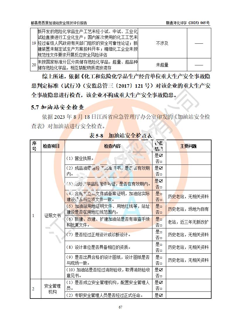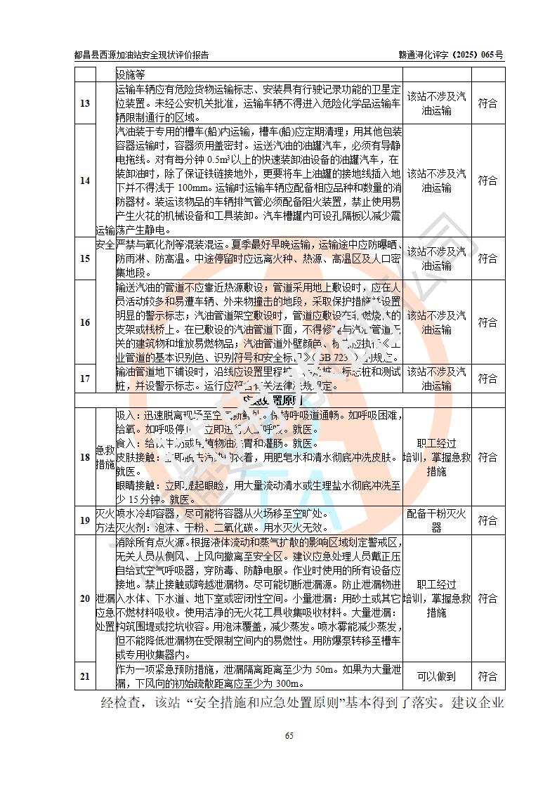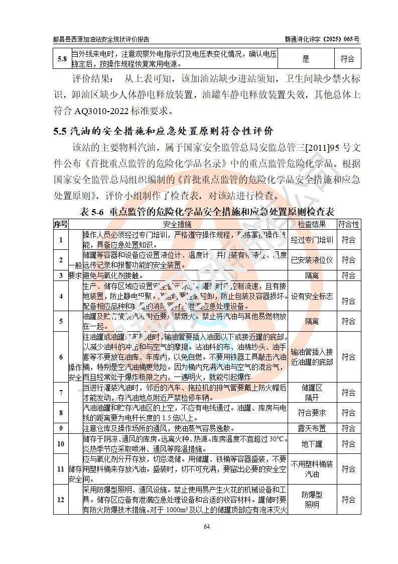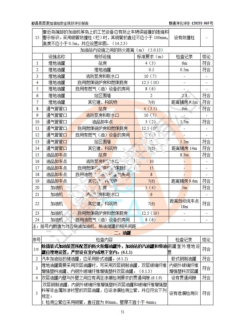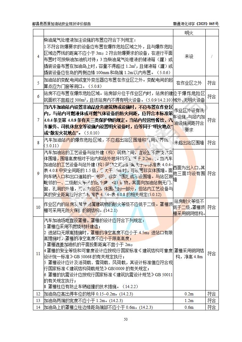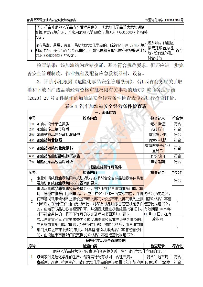 評(píng)價(jià)結(jié)論 | 都昌縣西源加油站涉及的安全條件、安全經(jīng)營(yíng)條件、安全生產(chǎn)管理符合《危險(xiǎn)化學(xué)品經(jīng)營(yíng)許可證管理辦法》、《汽車加油加氣加氫站技術(shù)標(biāo)準(zhǔn)》等**有關(guān)法規(guī)、標(biāo)準(zhǔn)、規(guī)范要求,能滿足危險(xiǎn)化學(xué)品經(jīng)營(yíng)安全條件。 | |||