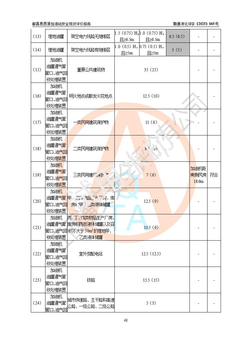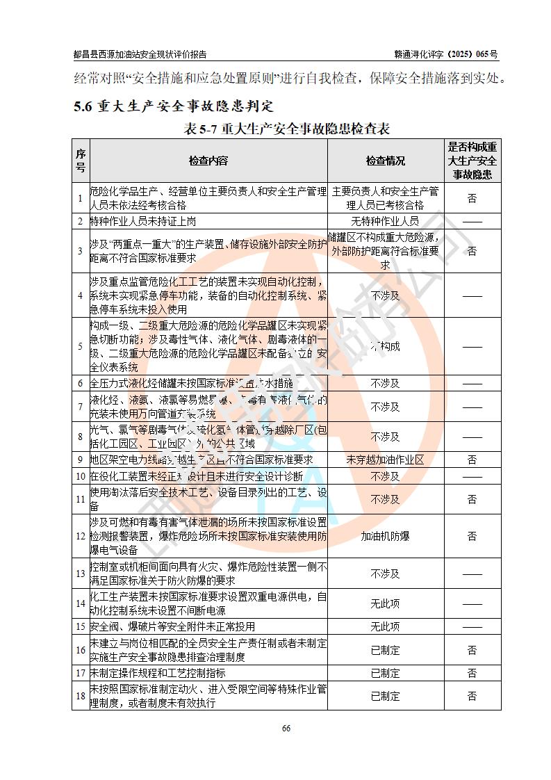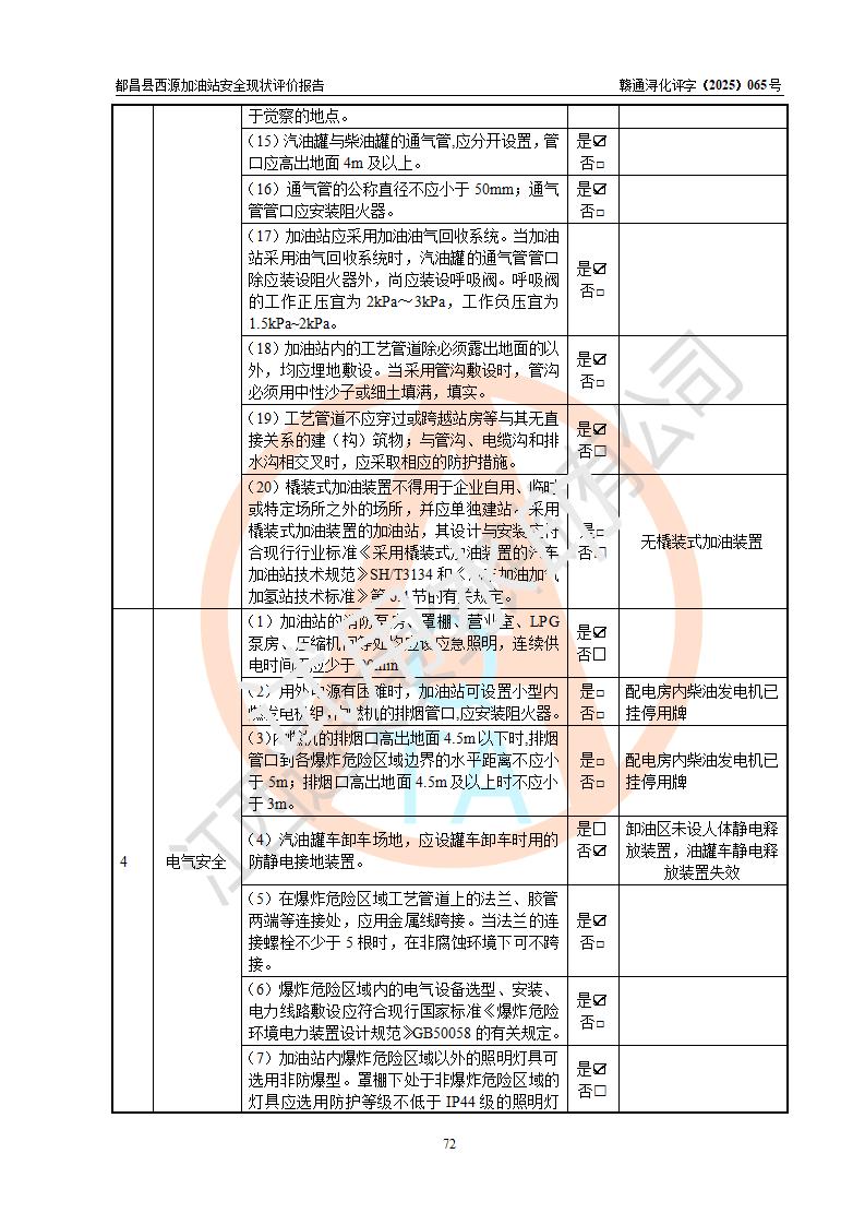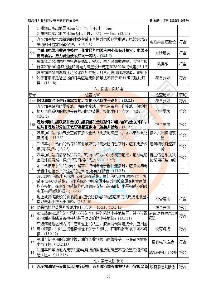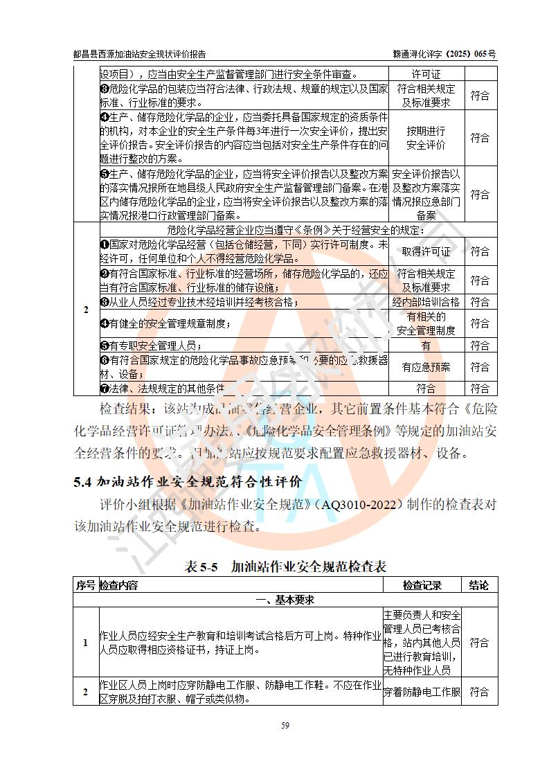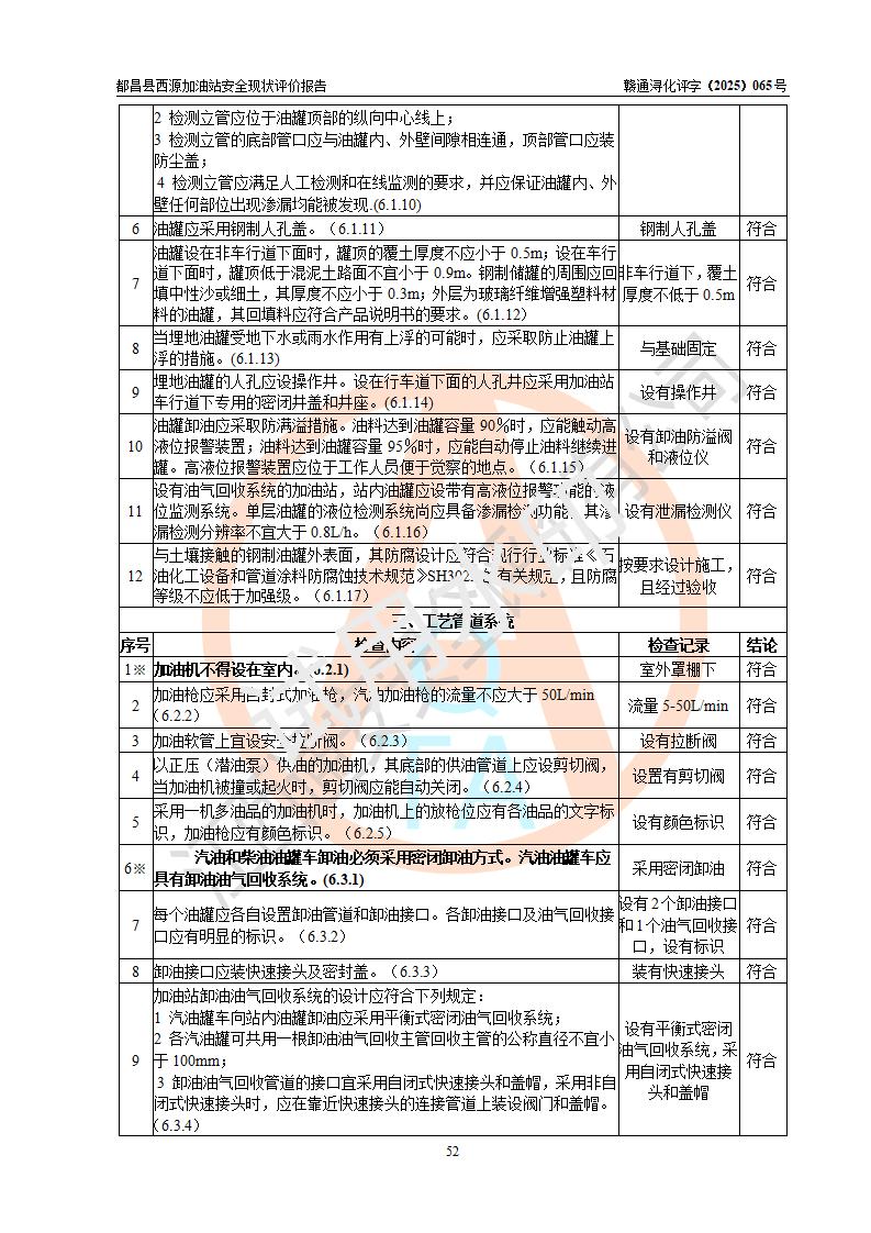 評(píng)價(jià)結(jié)論 | 都昌縣西源加油站涉及的安全條件、安全經(jīng)營(yíng)條件、安全生產(chǎn)管理符合《危險(xiǎn)化學(xué)品經(jīng)營(yíng)許可證管理辦法》、《汽車加油加氣加氫站技術(shù)標(biāo)準(zhǔn)》等**有關(guān)法規(guī)、標(biāo)準(zhǔn)、規(guī)范要求,能滿足危險(xiǎn)化學(xué)品經(jīng)營(yíng)安全條件。 | |||