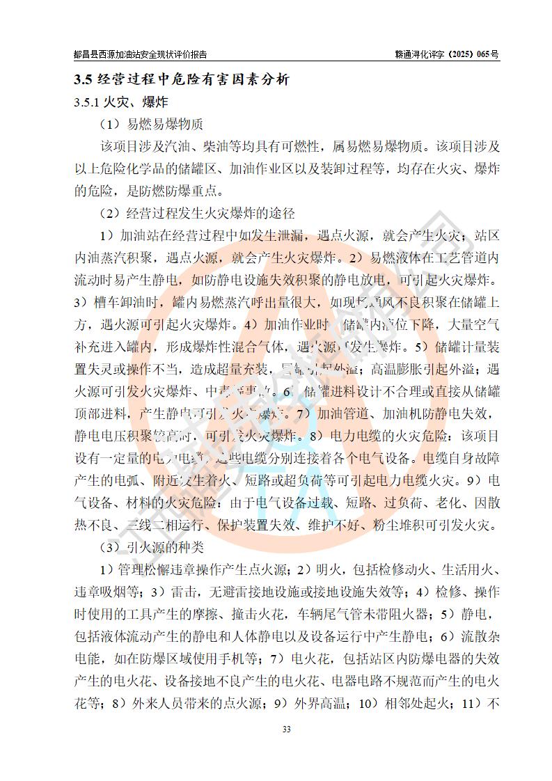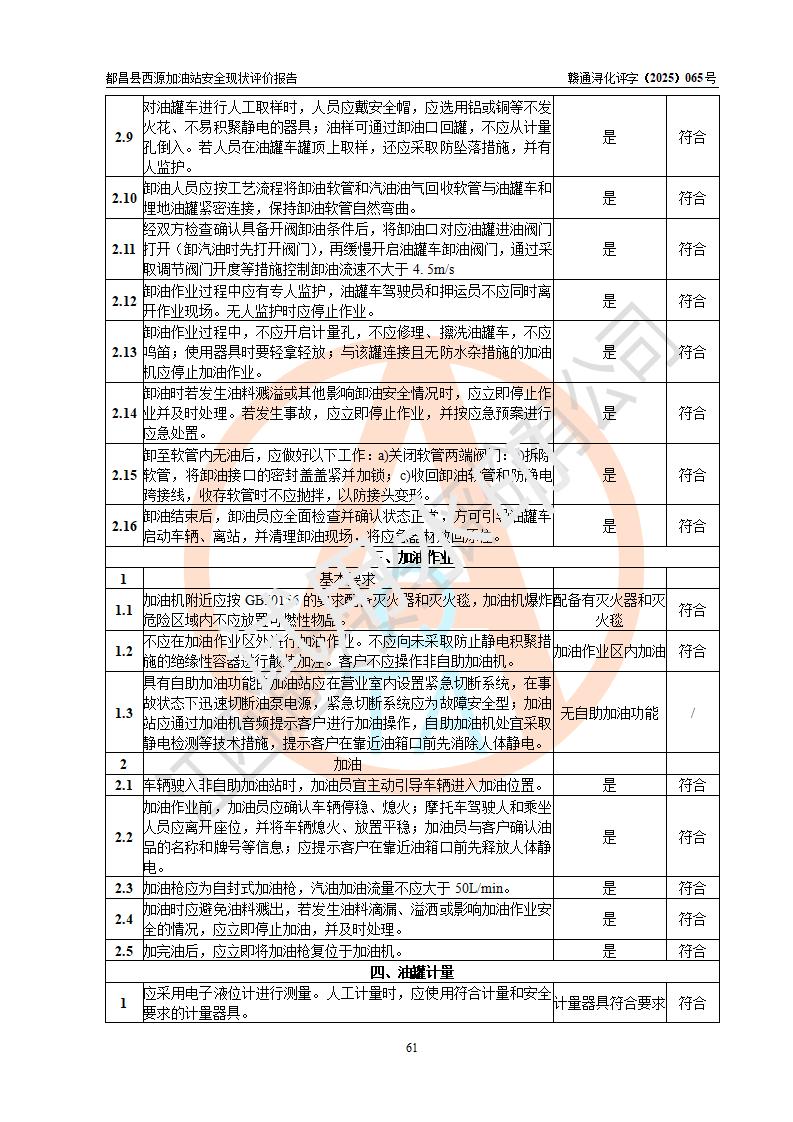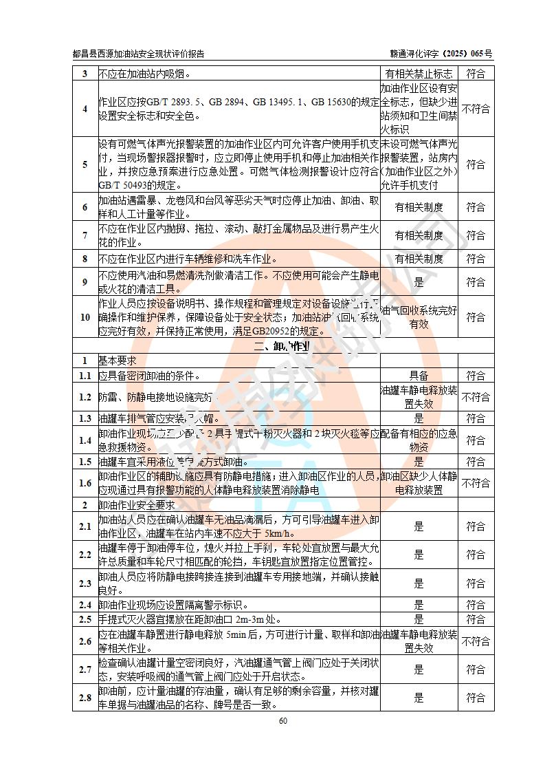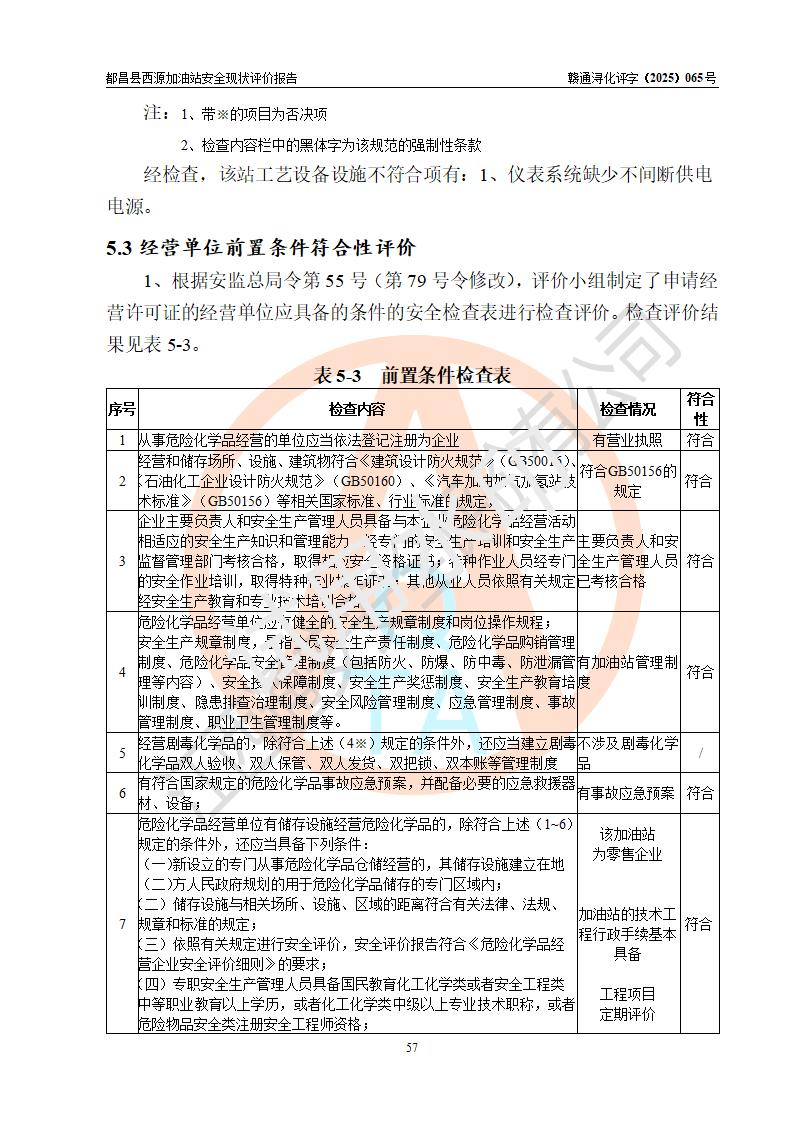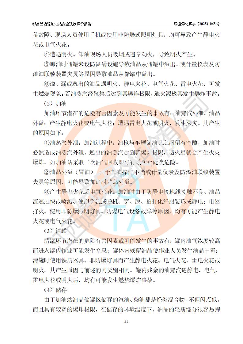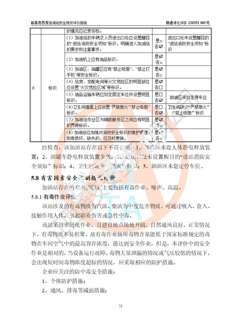 評(píng)價(jià)結(jié)論 | 都昌縣西源加油站涉及的安全條件、安全經(jīng)營(yíng)條件、安全生產(chǎn)管理符合《危險(xiǎn)化學(xué)品經(jīng)營(yíng)許可證管理辦法》、《汽車加油加氣加氫站技術(shù)標(biāo)準(zhǔn)》等**有關(guān)法規(guī)、標(biāo)準(zhǔn)、規(guī)范要求,能滿足危險(xiǎn)化學(xué)品經(jīng)營(yíng)安全條件。 | |||
