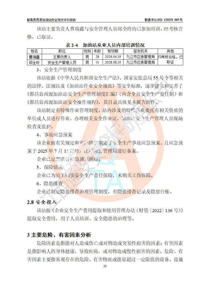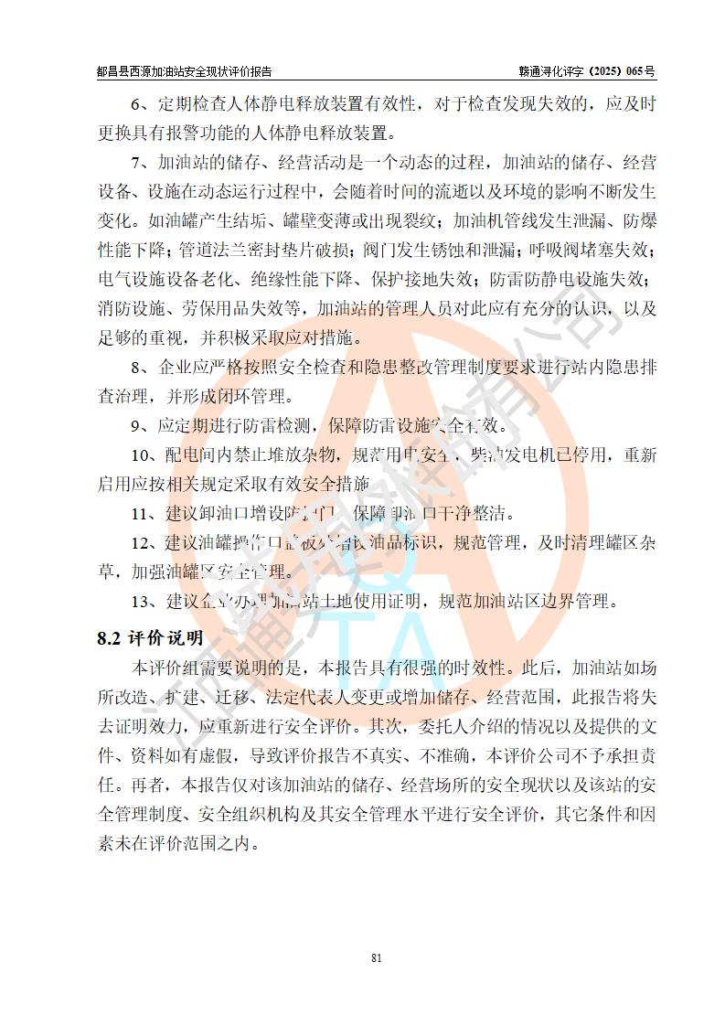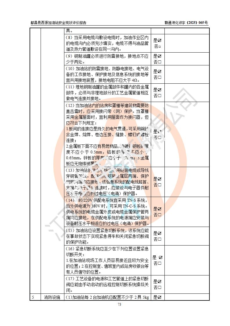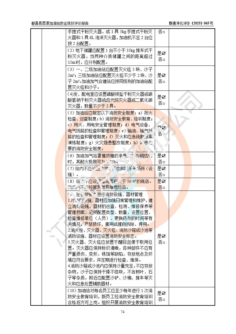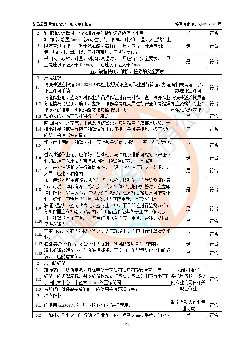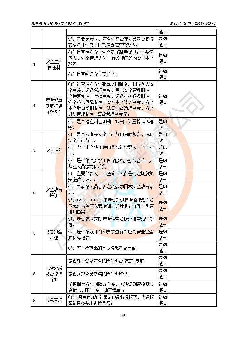 評(píng)價(jià)結(jié)論 | 都昌縣西源加油站涉及的安全條件、安全經(jīng)營(yíng)條件、安全生產(chǎn)管理符合《危險(xiǎn)化學(xué)品經(jīng)營(yíng)許可證管理辦法》、《汽車加油加氣加氫站技術(shù)標(biāo)準(zhǔn)》等**有關(guān)法規(guī)、標(biāo)準(zhǔn)、規(guī)范要求,能滿足危險(xiǎn)化學(xué)品經(jīng)營(yíng)安全條件。 | |||