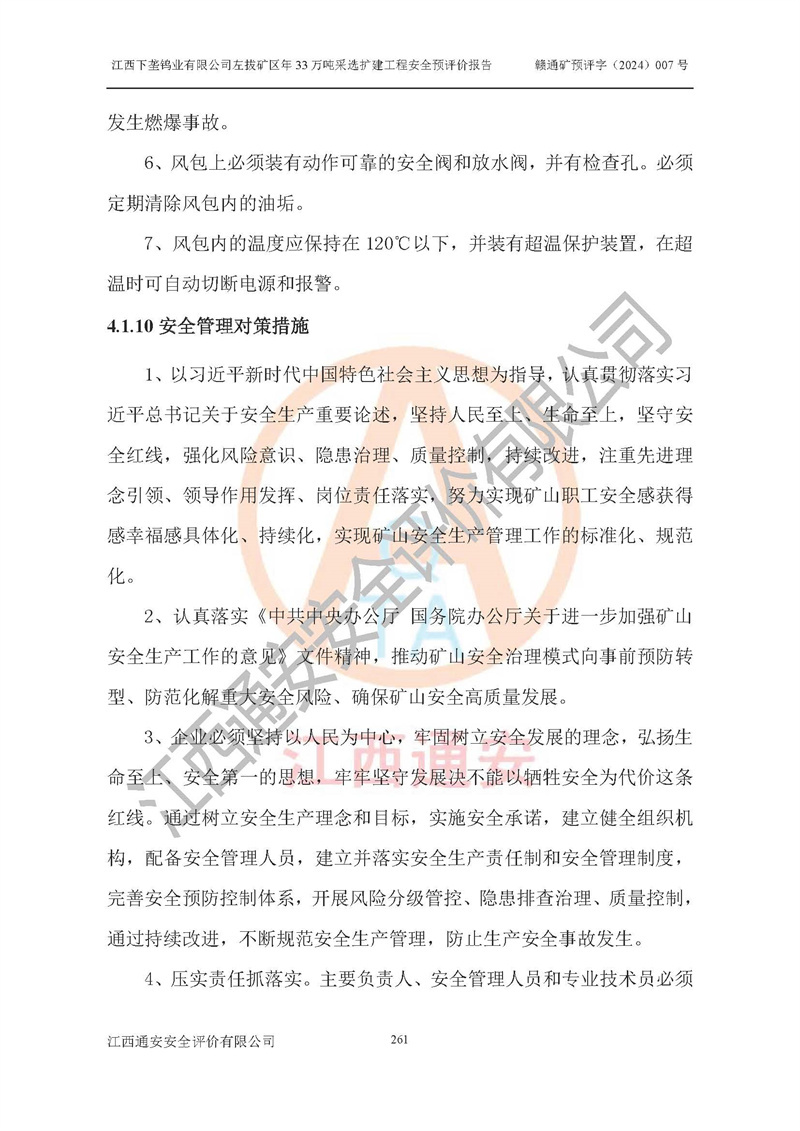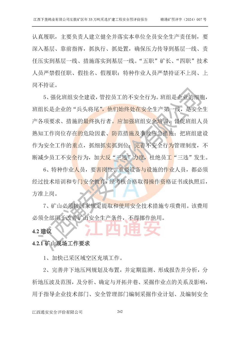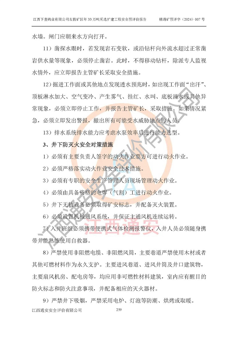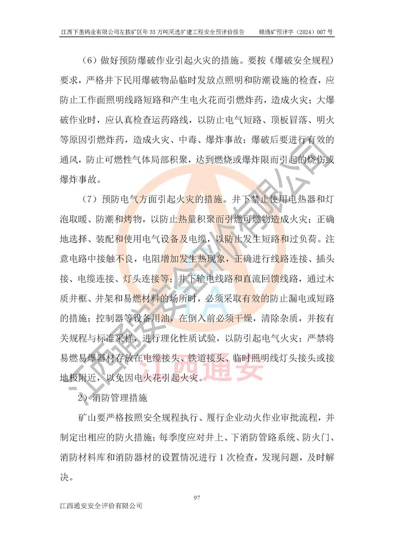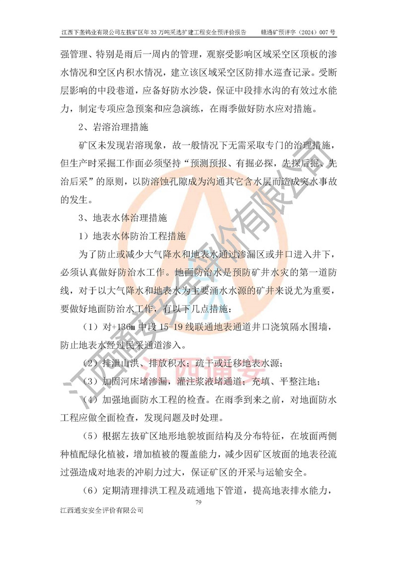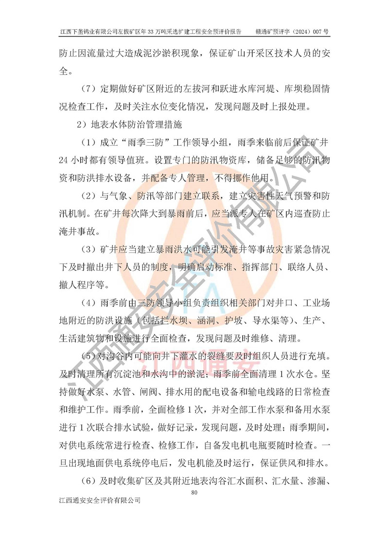其它 | 江西下壟鎢業(yè)有限公司左拔礦區(qū)年33萬(wàn)噸采選擴(kuò)建工程方案可行、選用的工藝和設(shè)備成熟、系統(tǒng)總體可靠,礦山具有建設(shè)、生產(chǎn)和管理的經(jīng)驗(yàn)和基礎(chǔ),在采納《可研報(bào)告》和本安全預(yù)評(píng)價(jià)報(bào)告提出的安全對(duì)策措施的基礎(chǔ)上,嚴(yán)把工程建設(shè)質(zhì)量關(guān)和現(xiàn)場(chǎng)安全管理,安全設(shè)施做到與主體工程同時(shí)設(shè)計(jì)、同時(shí)施工、同時(shí)投產(chǎn)使用,該擴(kuò)建工程安全風(fēng)險(xiǎn)處在可控制的范圍,符合**有關(guān)安全生產(chǎn)法律、法規(guī)、規(guī)章、標(biāo)準(zhǔn)和規(guī)范的要求。 | ||||