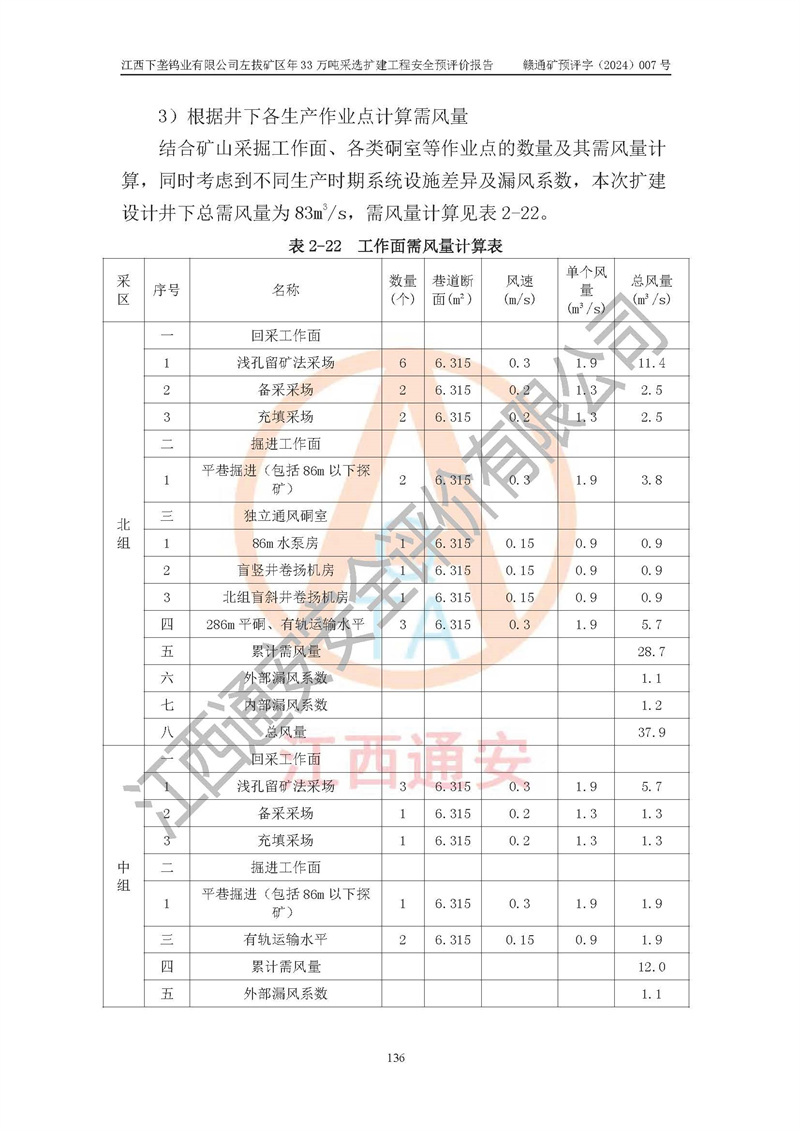 項(xiàng)目簡(jiǎn)介 | 江西下壟鎢業(yè)有限公司左拔礦區(qū)是一個(gè)歷經(jīng)80多年開采歷史的老礦山。左拔礦區(qū)位于江西省大余縣左拔鎮(zhèn)境內(nèi),礦區(qū)中心地理坐標(biāo):東經(jīng)114°26′15″,北緯25°32′05″,礦區(qū)位于大余縣城26°方位,直距18**。左拔礦區(qū)往南22**到達(dá)323國(guó)道(大余縣黃龍鎮(zhèn))及柏油公路省道。323國(guó)道西行約24**到達(dá)大余縣城、西行97**到達(dá)廣東省韶關(guān)市;東行53**到達(dá)105國(guó)道、東行71**到達(dá)贛州市。附近有贛韶鐵路、南韶高速,交通較便利。 江西下壟鎢業(yè)有限公司目前在產(chǎn)礦區(qū)為左拔礦區(qū)和樟斗礦區(qū),左拔礦區(qū)證載生產(chǎn)規(guī)模為11萬(wàn)t/a,樟斗礦區(qū)證載生產(chǎn)規(guī)模為19萬(wàn)t/a。兩礦區(qū)共同供礦到樟斗選廠。目前,樟斗礦區(qū)資源儲(chǔ)備較少,逐步進(jìn)入減產(chǎn)階段,礦山主要生產(chǎn)重心已轉(zhuǎn)至左拔礦區(qū)。為保障下壟鎢業(yè)生產(chǎn)的可持續(xù)性,樟斗礦區(qū)逐步減產(chǎn),左拔礦區(qū)原礦生產(chǎn)規(guī)模需由現(xiàn)有的11萬(wàn)t/a擴(kuò)大至33萬(wàn)t/a。 2006年7月南昌有色冶金設(shè)計(jì)院編制了《江西下壟鎢業(yè)有限公司左拔礦區(qū)初步設(shè)計(jì)說(shuō)明書》。2011年通過(guò)江西省安全生產(chǎn)監(jiān)督管理局組織的竣工驗(yàn)收。礦山在前期設(shè)計(jì)中考慮了以后擴(kuò)建的可能,原設(shè)計(jì)已經(jīng)對(duì)控制工程進(jìn)行了預(yù)留,現(xiàn)有部分系統(tǒng)仍滿足本次擴(kuò)建的需要,但需對(duì)不足部分進(jìn)行補(bǔ)充完善。因此,江西下壟鎢業(yè)有限公司委托金建工程設(shè)計(jì)有限公司在左拔礦區(qū)現(xiàn)有礦權(quán)范圍內(nèi),開展左拔礦區(qū)年33萬(wàn)噸采選擴(kuò)建工程的設(shè)計(jì)工作。2023年10月金建工程設(shè)計(jì)有限公司編制完成了《江西下壟鎢業(yè)有限公司左拔礦區(qū)年33萬(wàn)噸采選擴(kuò)建工程可行性研究報(bào)告》(以下簡(jiǎn)稱《可研報(bào)告》),為整體設(shè)計(jì)的前期技術(shù)工作,作為礦山立項(xiàng)、采礦證變更等工作的依據(jù)。江西下壟鎢業(yè)有限公司已向江西省工業(yè)和信息化廳申請(qǐng)江西下壟鎢業(yè)有限公司左拔礦區(qū)年33萬(wàn)噸采選擴(kuò)建工程項(xiàng)目核準(zhǔn)備案手續(xù)。 根據(jù)《可研報(bào)告》,可研設(shè)計(jì)范圍為采礦許可證礦區(qū)范圍內(nèi)整個(gè)左拔礦區(qū)。江西下壟鎢業(yè)有限公司左拔礦區(qū)年33萬(wàn)噸采選擴(kuò)建工程項(xiàng)目性質(zhì):擴(kuò)建,生產(chǎn)規(guī)模由11萬(wàn)t/a擴(kuò)大至33萬(wàn)t/a。選礦及尾礦經(jīng)校核可利舊,無(wú)需改造。本次設(shè)計(jì)僅涉及采礦部分,新增部分采礦工程及配套輔助設(shè)施,并對(duì)現(xiàn)有工程及設(shè)施進(jìn)行校核,對(duì)不足部分予以補(bǔ)充完善。新增主要井巷工程有:北組回風(fēng)天井、中組回風(fēng)天井、南組回風(fēng)天井、進(jìn)風(fēng)天井、進(jìn)回風(fēng)聯(lián)巷、采切工程、輔助硐室等。 本項(xiàng)目已經(jīng)符合編制安全預(yù)評(píng)價(jià)的前置條件,根據(jù)《中華人民共和國(guó)安全生產(chǎn)法》、《建設(shè)項(xiàng)目安全設(shè)施“三同時(shí)”監(jiān)督管理辦法》(**安全生產(chǎn)監(jiān)督管理局令第36號(hào))和《金屬非金屬礦山建設(shè)項(xiàng)目安全設(shè)施目錄》(**安全生產(chǎn)監(jiān)督管理總局令第75號(hào))的規(guī)定,江西下壟鎢業(yè)有限公司2024年7月1日委托我公司(江西通安安全評(píng)價(jià)有限公司)對(duì)其左拔礦區(qū)年33萬(wàn)噸選擴(kuò)建工程項(xiàng)目進(jìn)行安全預(yù)評(píng)價(jià)。 | ||||