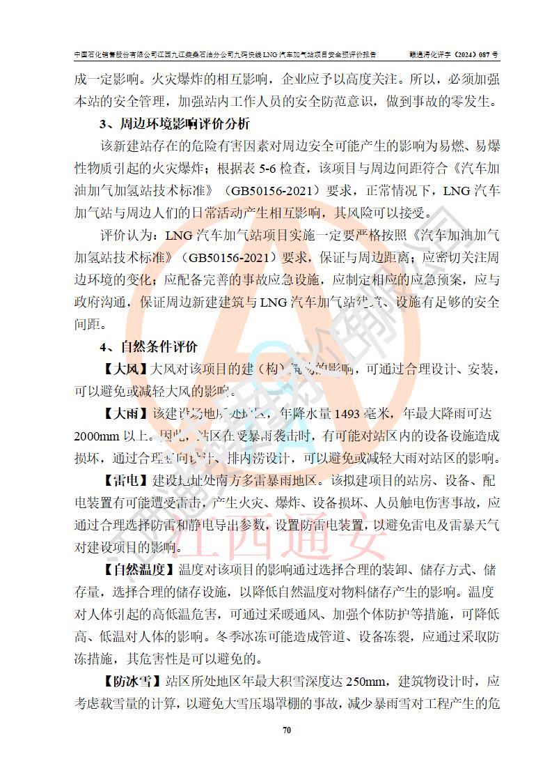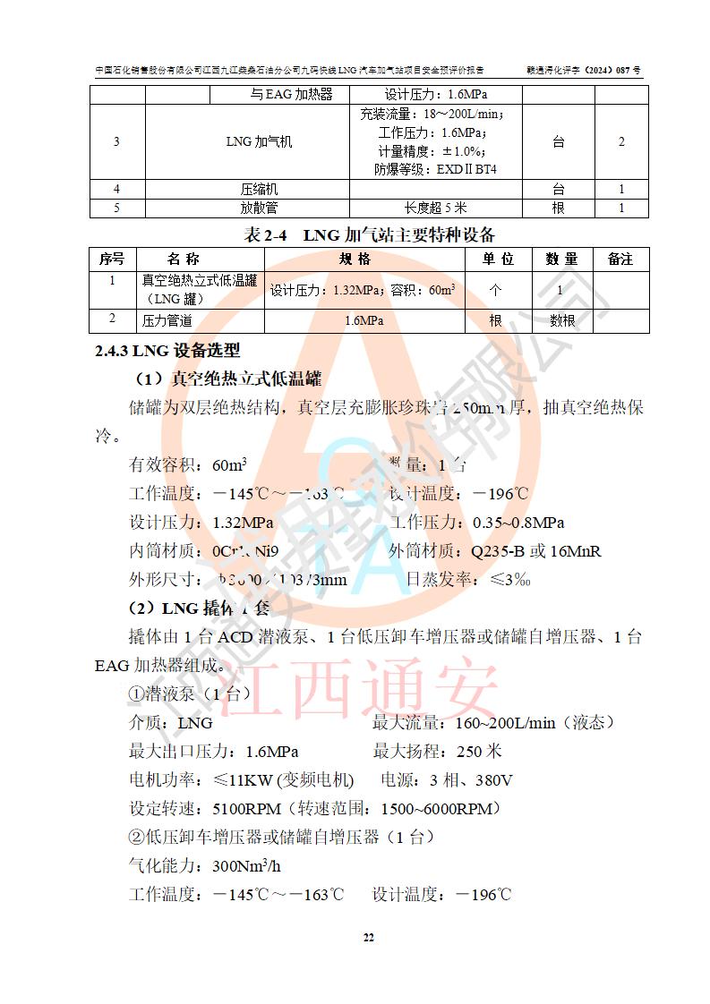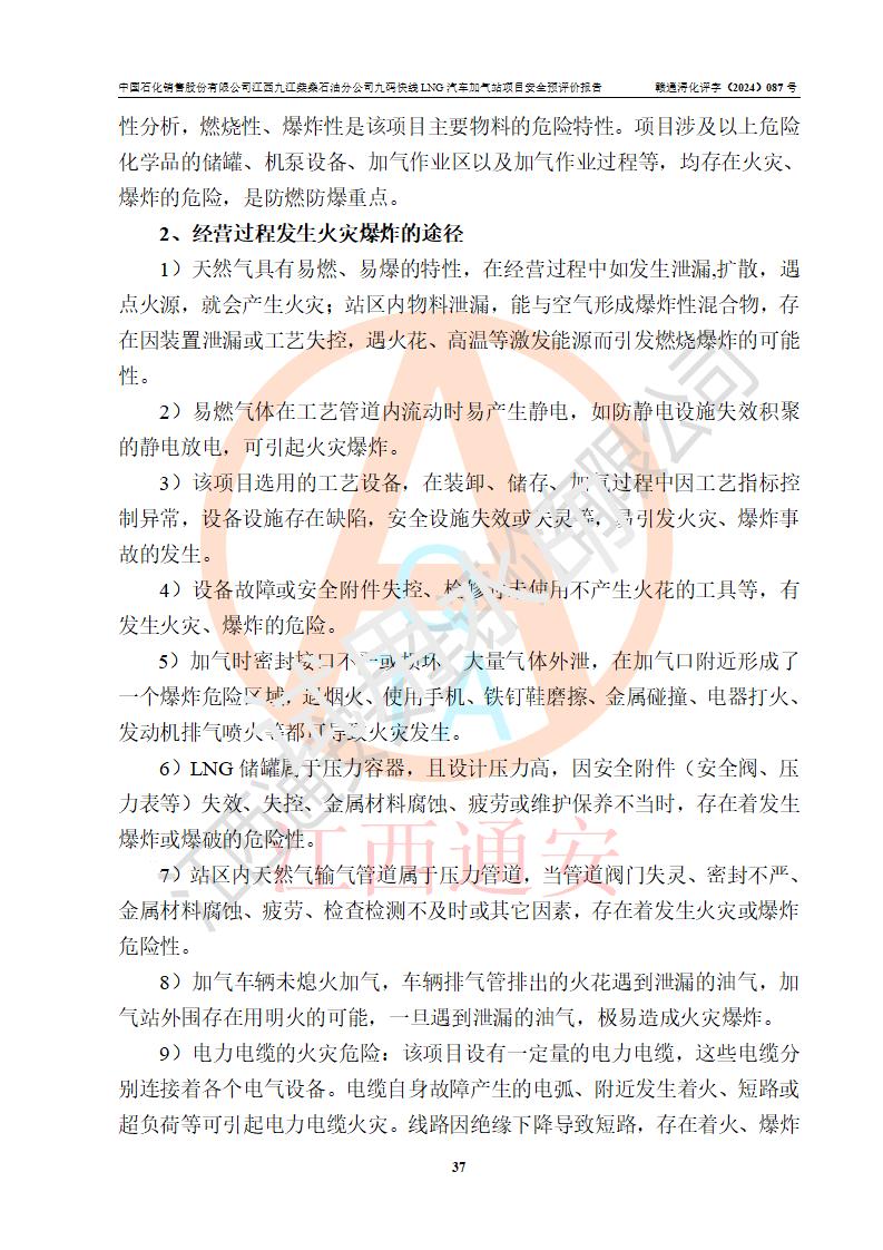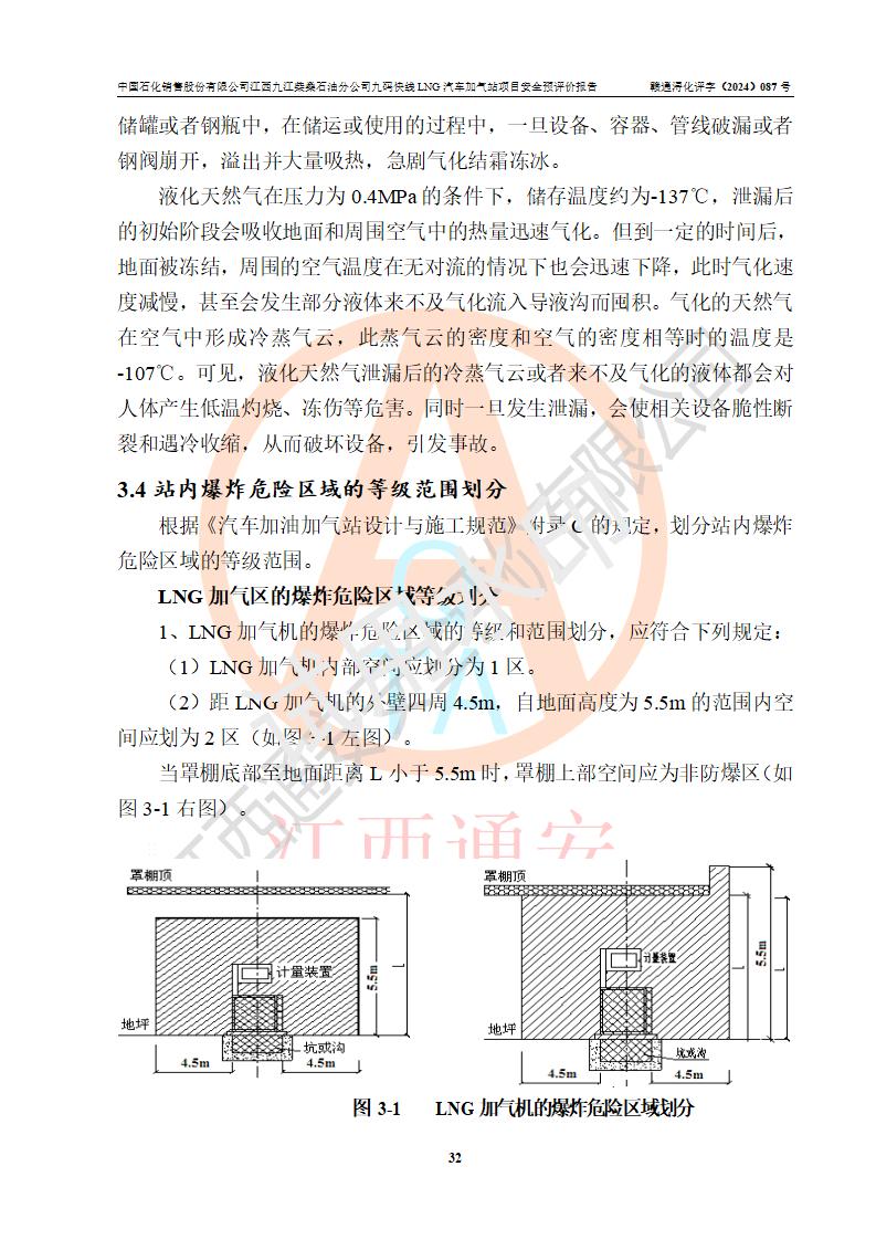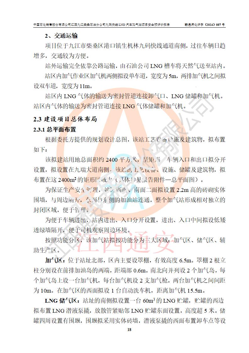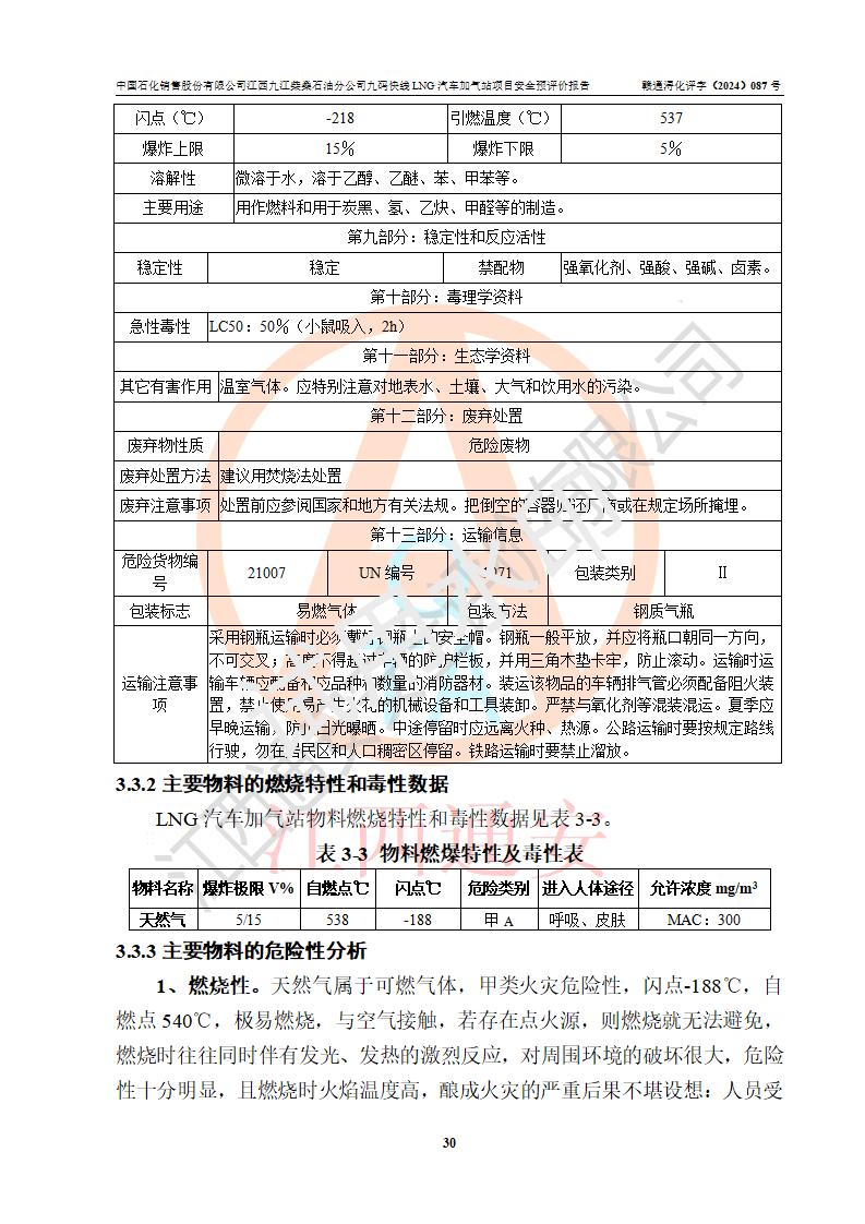 項(xiàng)目簡(jiǎn)介 | 中國(guó)石化銷(xiāo)售股份有限公司江西九江柴桑石油分公司九碼快線加氣站成立于2024年08月02日,注冊(cè)地址為江西省九江市柴桑區(qū)港口街鎮(zhèn)九碼**通道南側(cè)(港口生機(jī)林村),法定**人為陳小勇,公司類型為外商投資企業(yè)分公司。經(jīng)營(yíng)范圍:許可項(xiàng)目:食品銷(xiāo)售,煙草制品零售,餐飲服務(wù),燃?xì)饨?jīng)營(yíng),出版物零售,道路貨物運(yùn)輸(不含危險(xiǎn)貨物),旅游業(yè)務(wù),**代理業(yè)務(wù),藥品零售,發(fā)電業(yè)務(wù)、輸電業(yè)務(wù)、供(配)電業(yè)務(wù)(依法須經(jīng)批準(zhǔn)的項(xiàng)目,經(jīng)相關(guān)部門(mén)批準(zhǔn)后在許可**期內(nèi)方可開(kāi)展經(jīng)營(yíng)活動(dòng),具體經(jīng)營(yíng)項(xiàng)目和許可期限以相關(guān)部門(mén)批準(zhǔn)文件或許可證件為準(zhǔn))一般項(xiàng)日:保健食品(預(yù)包裝)銷(xiāo)售,貨物進(jìn)出口,石油制品銷(xiāo)售(不含危險(xiǎn)化學(xué)品),化工產(chǎn)品銷(xiāo)售(不零部件銷(xiāo)售,洗車(chē)服務(wù)含許可類化工產(chǎn)品),日用百貨銷(xiāo)售,機(jī)械零件,辦公設(shè)備耗材銷(xiāo)售,體育用品及器材零售,新能源汽車(chē)整車(chē)銷(xiāo)售,摩托車(chē)及零配件零售,五金產(chǎn)品零售,電子產(chǎn)品銷(xiāo)售,單用途商業(yè)預(yù)付卡代理銷(xiāo)售,銷(xiāo)售代理,計(jì)算機(jī)軟硬件及輔助設(shè)備銷(xiāo)售,汽車(chē)裝飾用品銷(xiāo)售,二手車(chē)經(jīng)紀(jì),輪胎銷(xiāo)售,肥料銷(xiāo)售,洗染服務(wù),新鮮水果批發(fā),新鮮水果零售,農(nóng)副產(chǎn)品銷(xiāo)售,金屬材料銷(xiāo)售,建筑材料銷(xiāo)售,家具銷(xiāo)售,外類醫(yī)療器械銷(xiāo)售,第二類醫(yī)療器械銷(xiāo)售,互聯(lián)網(wǎng)銷(xiāo)售(除銷(xiāo)售需要許可的商品),化妝品零售,勞動(dòng)保護(hù)用品銷(xiāo)售,消防器材銷(xiāo)售,電線、電經(jīng)營(yíng),通訊設(shè)備銷(xiāo)售,站用加氫及儲(chǔ)氫設(shè)施銷(xiāo)售,機(jī)動(dòng)車(chē)充電銷(xiāo)售,普通貨物倉(cāng)儲(chǔ)服務(wù)(不含危險(xiǎn)化學(xué)品等需許可審批的項(xiàng)日),裝卸搬運(yùn),食品銷(xiāo)售(僅銷(xiāo)售預(yù)包裝食品),包裝服務(wù),數(shù)據(jù)處理服務(wù),***纖維及復(fù)合材料銷(xiāo)售,產(chǎn)業(yè)用紡織制成品銷(xiāo)售(除依法須經(jīng)批準(zhǔn)的項(xiàng)目外,憑營(yíng)業(yè)執(zhí)照依法自主開(kāi)展經(jīng)營(yíng)活動(dòng))。 為了滿足柴桑區(qū)LNG汽車(chē)用氣需求,該公司根據(jù)九江市發(fā)展和改革委員會(huì)九能源發(fā)展字(2018)65號(hào)文件的批復(fù)在九江市柴桑區(qū)港口鎮(zhèn)生機(jī)林九碼快線通道南側(cè)擬投資建設(shè)一座LNG汽車(chē)加氣站項(xiàng)目。 該站已于2019年1月30日通過(guò)九江市柴桑區(qū)發(fā)展和改革委員會(huì)《關(guān)于轉(zhuǎn)發(fā)柴桑區(qū)九碼快線LNG汽車(chē)加氣站項(xiàng)目核準(zhǔn)批復(fù)的通知》(柴發(fā)改字(2019)07號(hào)),該站的建設(shè)用地已取得九江縣不動(dòng)產(chǎn)登記局頒發(fā)的不動(dòng)產(chǎn)權(quán)證書(shū):贛(2017)九江縣不動(dòng)產(chǎn)權(quán)第0002564號(hào)。 擬新建LNG汽車(chē)加氣站總用地面積為5779.00m2,總建筑面積為2400.00m2,站區(qū)內(nèi)加氣機(jī)擬設(shè)置為2機(jī)2槍。LNG貯氣區(qū)內(nèi)設(shè)置1個(gè)60m3的LNG儲(chǔ)氣罐,加氣能力為2×104Nm3/d。按現(xiàn)行《汽車(chē)加油加氣加氫站技術(shù)標(biāo)準(zhǔn)》對(duì)LNG加氣站的等級(jí)劃分,該LNG汽車(chē)加氣站屬三級(jí)站。 依據(jù)《中華人民共和國(guó)安全生產(chǎn)法》、《燃?xì)饨?jīng)營(yíng)許可管理辦法》、《城鎮(zhèn)燃?xì)夤芾項(xiàng)l例》、《危險(xiǎn)化學(xué)品安全管理?xiàng)l例》等法律和規(guī)定的要求,新建、改建、擴(kuò)建危險(xiǎn)化學(xué)品儲(chǔ)存裝置和設(shè)施的建設(shè)項(xiàng)目安全條件審查(審批、核準(zhǔn)、備案)前,建設(shè)單位應(yīng)當(dāng)選擇有資質(zhì)的安全評(píng)價(jià)機(jī)構(gòu)對(duì)建設(shè)項(xiàng)目進(jìn)行安全條件評(píng)價(jià),以保障工程項(xiàng)目的安全設(shè)施與主體工程同時(shí)設(shè)計(jì)、同時(shí)施工、同時(shí)投入使用,為保障工程項(xiàng)目在安全生產(chǎn)及安全管理方面符合**及行業(yè)有關(guān)法律法規(guī)及標(biāo)準(zhǔn),中國(guó)石化銷(xiāo)售股份有限公司江西九江柴桑石油分公司九碼快線加氣站委托江西通安安全評(píng)價(jià)有限公司承擔(dān)中國(guó)石化銷(xiāo)售股份有限公司江西九江柴桑石油分公司九碼快線LNG汽車(chē)加氣站新建項(xiàng)目的安全預(yù)評(píng)價(jià)。該企業(yè)應(yīng)辦理燃?xì)饨?jīng)營(yíng)許可證。 江西通安安全評(píng)價(jià)有限公司接受委托后,成立了評(píng)價(jià)組,于2024年8月踏勘了建設(shè)地址。根據(jù)相關(guān)法律、法規(guī)和標(biāo)準(zhǔn)的規(guī)定,按照《安全評(píng)價(jià)通則》(AQ8001-2007)、《安全預(yù)評(píng)價(jià)導(dǎo)則》(AQ8002-2007)的要求,在資料收集、現(xiàn)場(chǎng)勘探和類比調(diào)查的基礎(chǔ)上,對(duì)項(xiàng)目的工程技術(shù)資料進(jìn)行了認(rèn)真分析。建設(shè)項(xiàng)目?jī)?nèi)在的危險(x