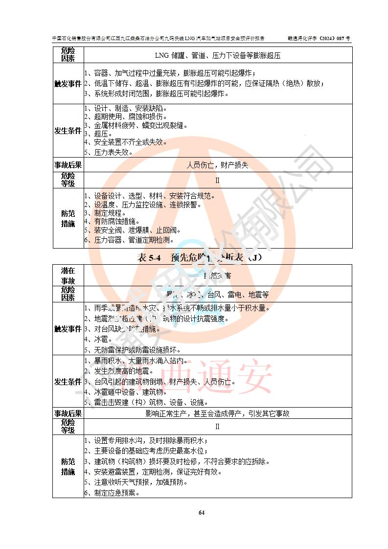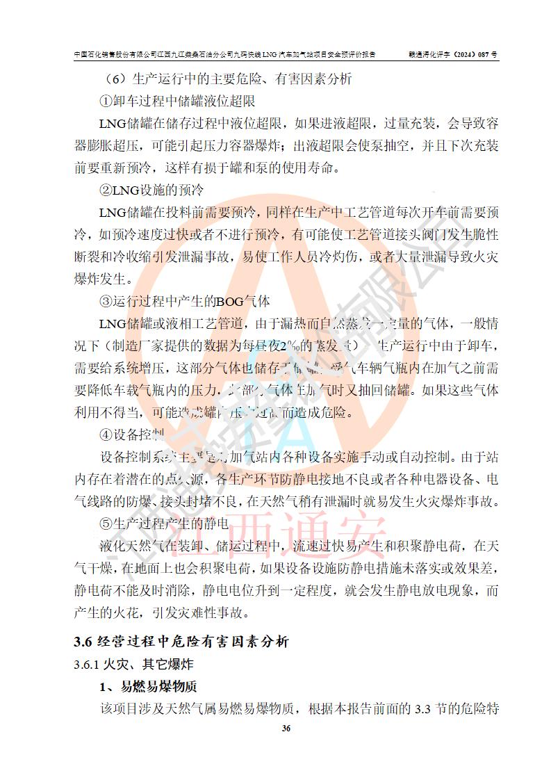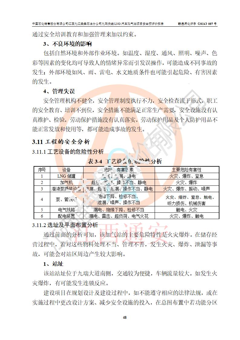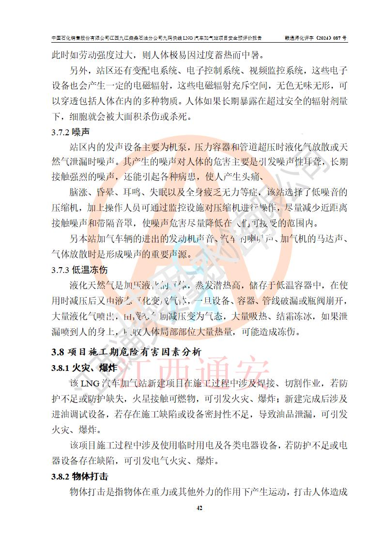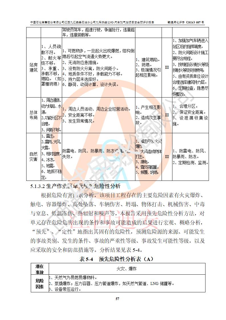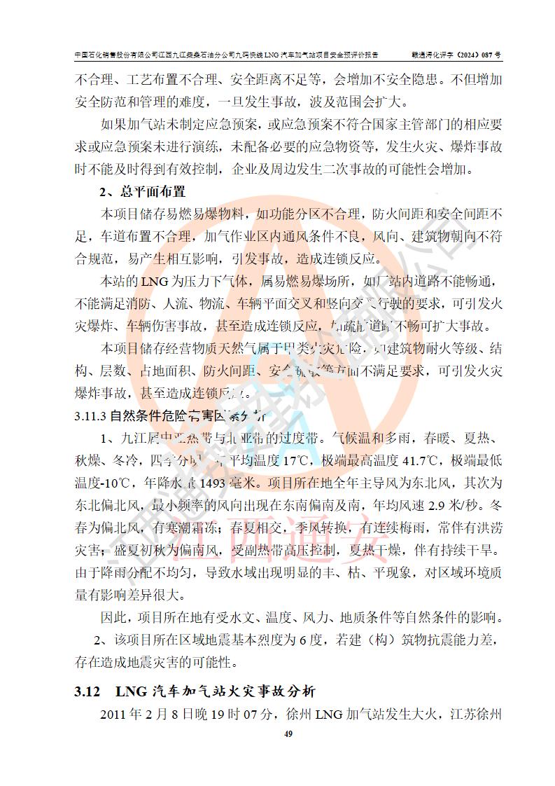 項(xiàng)目簡(jiǎn)介 | 中國(guó)石化銷(xiāo)售股份有限公司江西九江柴桑石油分公司九碼快線加氣站成立于2024年08月02日,注冊(cè)地址為江西省九江市柴桑區(qū)港口街鎮(zhèn)九碼**通道南側(cè)(港口生機(jī)林村),法定**人為陳小勇,公司類型為外商投資企業(yè)分公司。經(jīng)營(yíng)范圍:許可項(xiàng)目:食品銷(xiāo)售,煙草制品零售,餐飲服務(wù),燃?xì)饨?jīng)營(yíng),出版物零售,道路貨物運(yùn)輸(不含危險(xiǎn)貨物),旅游業(yè)務(wù),**代理業(yè)務(wù),藥品零售,發(fā)電業(yè)務(wù)、輸電業(yè)務(wù)、供(配)電業(yè)務(wù)(依法須經(jīng)批準(zhǔn)的項(xiàng)目,經(jīng)相關(guān)部門(mén)批準(zhǔn)后在許可**期內(nèi)方可開(kāi)展經(jīng)營(yíng)活動(dòng),具體經(jīng)營(yíng)項(xiàng)目和許可期限以相關(guān)部門(mén)批準(zhǔn)文件或許可證件為準(zhǔn))一般項(xiàng)日:保健食品(預(yù)包裝)銷(xiāo)售,貨物進(jìn)出口,石油制品銷(xiāo)售(不含危險(xiǎn)化學(xué)品),化工產(chǎn)品銷(xiāo)售(不零部件銷(xiāo)售,洗車(chē)服務(wù)含許可類化工產(chǎn)品),日用百貨銷(xiāo)售,機(jī)械零件,辦公設(shè)備耗材銷(xiāo)售,體育用品及器材零售,新能源汽車(chē)整車(chē)銷(xiāo)售,摩托車(chē)及零配件零售,五金產(chǎn)品零售,電子產(chǎn)品銷(xiāo)售,單用途商業(yè)預(yù)付卡代理銷(xiāo)售,銷(xiāo)售代理,計(jì)算機(jī)軟硬件及輔助設(shè)備銷(xiāo)售,汽車(chē)裝飾用品銷(xiāo)售,二手車(chē)經(jīng)紀(jì),輪胎銷(xiāo)售,肥料銷(xiāo)售,洗染服務(wù),新鮮水果批發(fā),新鮮水果零售,農(nóng)副產(chǎn)品銷(xiāo)售,金屬材料銷(xiāo)售,建筑材料銷(xiāo)售,家具銷(xiāo)售,外類醫(yī)療器械銷(xiāo)售,第二類醫(yī)療器械銷(xiāo)售,互聯(lián)網(wǎng)銷(xiāo)售(除銷(xiāo)售需要許可的商品),化妝品零售,勞動(dòng)保護(hù)用品銷(xiāo)售,消防器材銷(xiāo)售,電線、電經(jīng)營(yíng),通訊設(shè)備銷(xiāo)售,站用加氫及儲(chǔ)氫設(shè)施銷(xiāo)售,機(jī)動(dòng)車(chē)充電銷(xiāo)售,普通貨物倉(cāng)儲(chǔ)服務(wù)(不含危險(xiǎn)化學(xué)品等需許可審批的項(xiàng)日),裝卸搬運(yùn),食品銷(xiāo)售(僅銷(xiāo)售預(yù)包裝食品),包裝服務(wù),數(shù)據(jù)處理服務(wù),***纖維及復(fù)合材料銷(xiāo)售,產(chǎn)業(yè)用紡織制成品銷(xiāo)售(除依法須經(jīng)批準(zhǔn)的項(xiàng)目外,憑營(yíng)業(yè)執(zhí)照依法自主開(kāi)展經(jīng)營(yíng)活動(dòng))。 為了滿足柴桑區(qū)LNG汽車(chē)用氣需求,該公司根據(jù)九江市發(fā)展和改革委員會(huì)九能源發(fā)展字(2018)65號(hào)文件的批復(fù)在九江市柴桑區(qū)港口鎮(zhèn)生機(jī)林九碼快線通道南側(cè)擬投資建設(shè)一座LNG汽車(chē)加氣站項(xiàng)目。 該站已于2019年1月30日通過(guò)九江市柴桑區(qū)發(fā)展和改革委員會(huì)《關(guān)于轉(zhuǎn)發(fā)柴桑區(qū)九碼快線LNG汽車(chē)加氣站項(xiàng)目核準(zhǔn)批復(fù)的通知》(柴發(fā)改字(2019)07號(hào)),該站的建設(shè)用地已取得九江縣不動(dòng)產(chǎn)登記局頒發(fā)的不動(dòng)產(chǎn)權(quán)證書(shū):贛(2017)九江縣不動(dòng)產(chǎn)權(quán)第0002564號(hào)。 擬新建LNG汽車(chē)加氣站總用地面積為5779.00m2,總建筑面積為2400.00m2,站區(qū)內(nèi)加氣機(jī)擬設(shè)置為2機(jī)2槍。LNG貯氣區(qū)內(nèi)設(shè)置1個(gè)60m3的LNG儲(chǔ)氣罐,加氣能力為2×104Nm3/d。按現(xiàn)行《汽車(chē)加油加氣加氫站技術(shù)標(biāo)準(zhǔn)》對(duì)LNG加氣站的等級(jí)劃分,該LNG汽車(chē)加氣站屬三級(jí)站。 依據(jù)《中華人民共和國(guó)安全生產(chǎn)法》、《燃?xì)饨?jīng)營(yíng)許可管理辦法》、《城鎮(zhèn)燃?xì)夤芾項(xiàng)l例》、《危險(xiǎn)化學(xué)品安全管理?xiàng)l例》等法律和規(guī)定的要求,新建、改建、擴(kuò)建危險(xiǎn)化學(xué)品儲(chǔ)存裝置和設(shè)施的建設(shè)項(xiàng)目安全條件審查(審批、核準(zhǔn)、備案)前,建設(shè)單位應(yīng)當(dāng)選擇有資質(zhì)的安全評(píng)價(jià)機(jī)構(gòu)對(duì)建設(shè)項(xiàng)目進(jìn)行安全條件評(píng)價(jià),以保障工程項(xiàng)目的安全設(shè)施與主體工程同時(shí)設(shè)計(jì)、同時(shí)施工、同時(shí)投入使用,為保障工程項(xiàng)目在安全生產(chǎn)及安全管理方面符合**及行業(yè)有關(guān)法律法規(guī)及標(biāo)準(zhǔn),中國(guó)石化銷(xiāo)售股份有限公司江西九江柴桑石油分公司九碼快線加氣站委托江西通安安全評(píng)價(jià)有限公司承擔(dān)中國(guó)石化銷(xiāo)售股份有限公司江西九江柴桑石油分公司九碼快線LNG汽車(chē)加氣站新建項(xiàng)目的安全預(yù)評(píng)價(jià)。該企業(yè)應(yīng)辦理燃?xì)饨?jīng)營(yíng)許可證。 江西通安安全評(píng)價(jià)有限公司接受委托后,成立了評(píng)價(jià)組,于2024年8月踏勘了建設(shè)地址。根據(jù)相關(guān)法律、法規(guī)和標(biāo)準(zhǔn)的規(guī)定,按照《安全評(píng)價(jià)通則》(AQ8001-2007)、《安全預(yù)評(píng)價(jià)導(dǎo)則》(AQ8002-2007)的要求,在資料收集、現(xiàn)場(chǎng)勘探和類比調(diào)查的基礎(chǔ)上,對(duì)項(xiàng)目的工程技術(shù)資料進(jìn)行了認(rèn)真分析。建設(shè)項(xiàng)目?jī)?nèi)在的危險(x