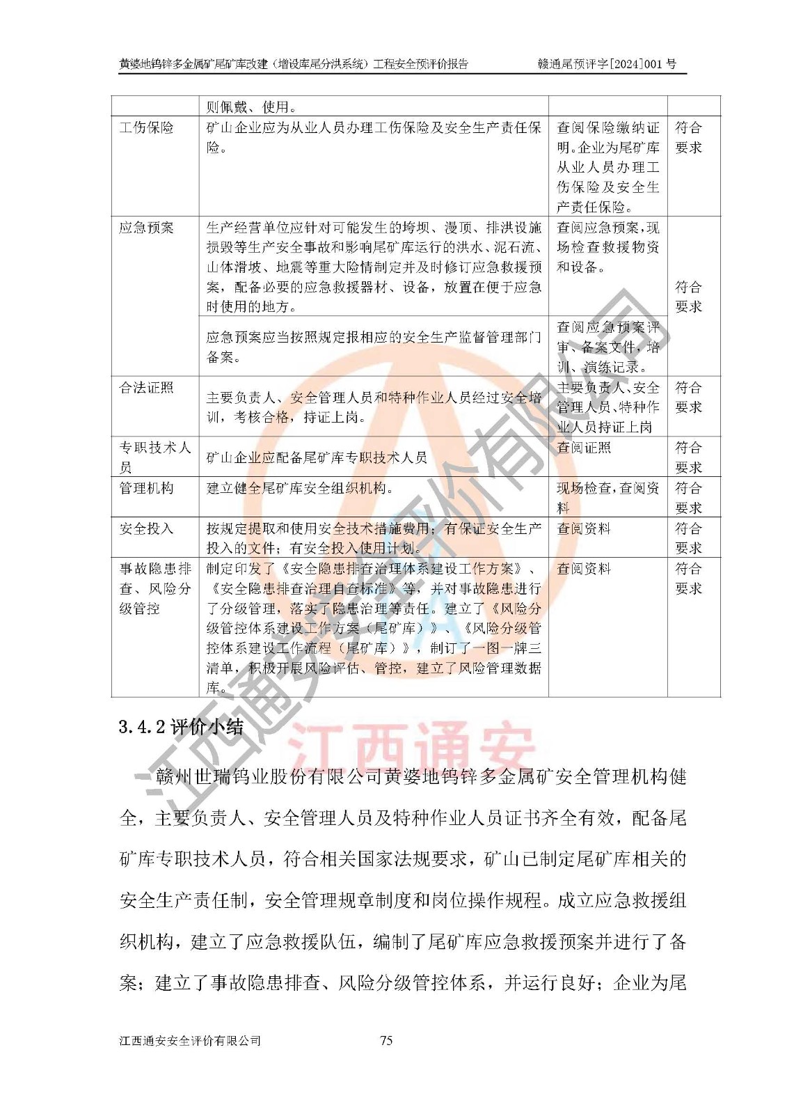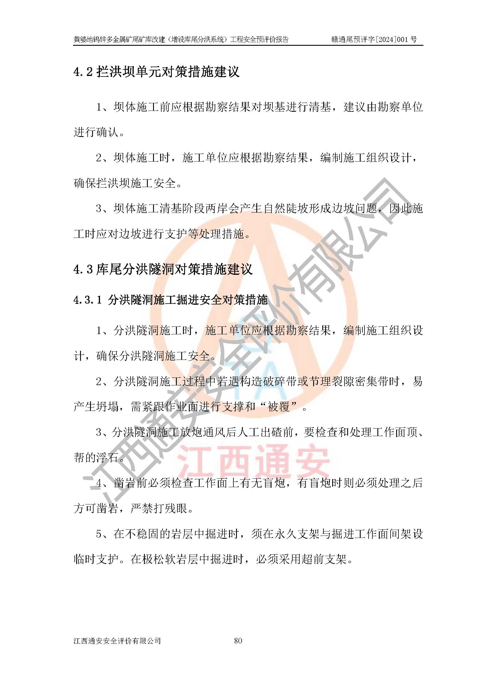評價結(jié)論 | 綜合以上評價結(jié)果,建設(shè)單位依據(jù)《可研》建設(shè)方案,結(jié)合本報告提出的安全措施建議,進行贛州世瑞鎢業(yè)股份有限公司黃婆地鎢鋅多金屬礦尾礦庫改建(增設(shè)庫尾分洪系統(tǒng))工程后續(xù)設(shè)計、施工、生產(chǎn)、管理,則尾礦庫改建(增設(shè)庫尾分洪系統(tǒng))工程危險、有害因素的風險程度可以控制在可承受的范圍之內(nèi),贛州世瑞鎢業(yè)股份有限公司黃婆地鎢鋅多金屬礦尾礦庫改建(增設(shè)庫尾分洪系統(tǒng))工程安全條件可滿足安全生產(chǎn)需要。 | |||
