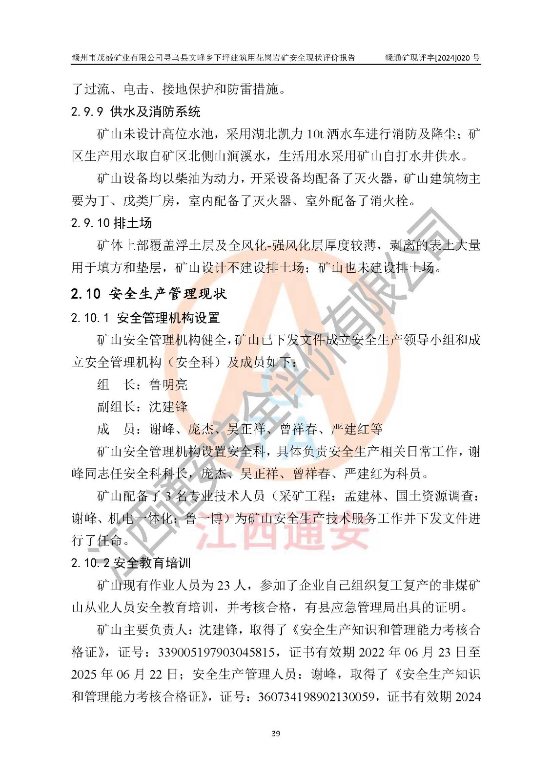 項目簡介 | 贛州市茂盛礦業(yè)有限公司尋烏縣文峰鄉(xiāng)下坪建筑用花崗巖礦,位于尋烏縣縣城240°方向,直線距離12**處,行政區(qū)劃隸屬尋烏縣文峰鄉(xiāng)管轄。礦區(qū)位置地理坐標:東經(jīng)115°34′12″~115°34′45″,北緯24°54′11″~25°54′30″。礦區(qū)至X484縣道約3**,交通方便。 礦山采用開拓公路汽車運輸,礦山上山公路從礦區(qū)東側(cè)工業(yè)場地開始修建,經(jīng)過礦區(qū)北部(+470m)折返至礦區(qū)中部再到礦區(qū)北側(cè)山頂+530m、+515m 、+500m臺階;礦山經(jīng)過多年的開采,自上而形成了+530m、 +515m 、+500m共3個開采臺階,其中+530m、+515m臺階已到設(shè)計*終邊坡,+530m、+515m為安全平臺,平臺寬度6m,臺階**8m/15m(剝離8m,開采15m),剝離坡面角約45°,開采坡面角約65°。 2022年4月12日,礦山取得贛州市應(yīng)急管理局頒發(fā)的安全生產(chǎn)標準化三級企業(yè)(非煤礦山)證書,證書編號:贛市AQBKSⅢ[2023]15號,**期至2026年4月11日。 | ||||