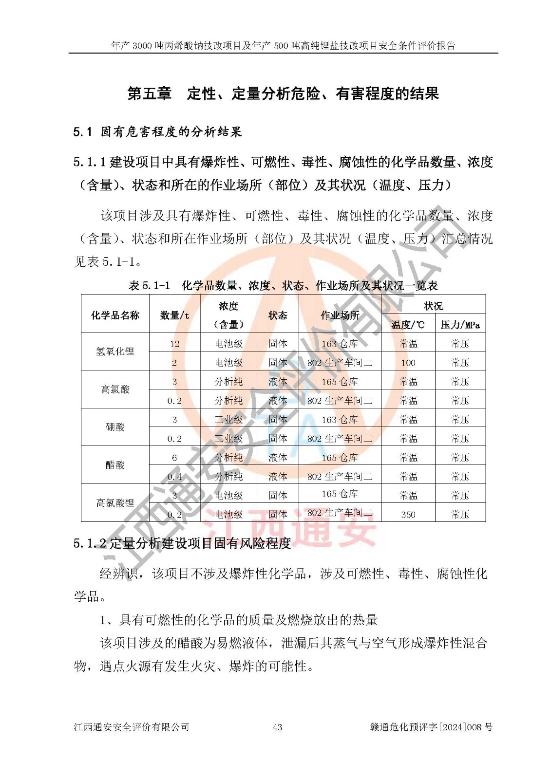 項(xiàng)目簡介 | 贛州朗固新材料科技有限公司(以下簡稱朗固新材料)成立于2020年03月31日,法定**人為陳學(xué)重,注冊(cè)資本伍**元整,經(jīng)營范圍為一般項(xiàng)目:光固化材料生產(chǎn)、銷售。(除許可業(yè)務(wù)外,可自主依法經(jīng)營法律法規(guī)非禁止或限制的項(xiàng)目) 贛州朗固新材料科技有限公司年產(chǎn)3000噸丙烯酸鈉技改項(xiàng)目及年產(chǎn)500噸高純鋰鹽技改項(xiàng)目已分別取得備案通知書,建設(shè)項(xiàng)目取得了項(xiàng)目規(guī)劃許可資料,建設(shè)地點(diǎn)位于贛縣區(qū)稀金新材料產(chǎn)業(yè)園區(qū)化工集中區(qū)。該項(xiàng)目生產(chǎn)過程中涉及使用的原輔材料有10%丙烯酸鈉溶液、氫氧化鋰、高氯酸、草酸、硼酸和醋酸,產(chǎn)品為丙烯酸鈉、高氯酸鋰、草酸鋰、硼酸鋰和醋酸鋰。經(jīng)辨識(shí),氫氧化鋰、高氯酸、硼酸、醋酸和高氯酸鋰屬于危險(xiǎn)化學(xué)品,高氯酸和高氯酸鋰屬于易制爆危險(xiǎn)化學(xué)品,不涉及重點(diǎn)監(jiān)管的危險(xiǎn)化學(xué)品,不涉及重點(diǎn)監(jiān)管的危險(xiǎn)化工工藝,生產(chǎn)、儲(chǔ)存單元均不構(gòu)成危險(xiǎn)化學(xué)品重大危險(xiǎn)源。該項(xiàng)目生產(chǎn)過程中主要的危險(xiǎn)有害因素為火災(zāi)、爆炸、灼燙。根據(jù)《安全生產(chǎn)許可證條例》、《危險(xiǎn)化學(xué)品安全管理?xiàng)l例》和《危險(xiǎn)化學(xué)品生產(chǎn)企業(yè)安全生產(chǎn)許可實(shí)施辦法》等相關(guān)規(guī)定,該項(xiàng)目產(chǎn)品中高氯酸鋰屬于危險(xiǎn)化學(xué)品,需要辦理危險(xiǎn)化學(xué)品安全生產(chǎn)許可證。 | |||