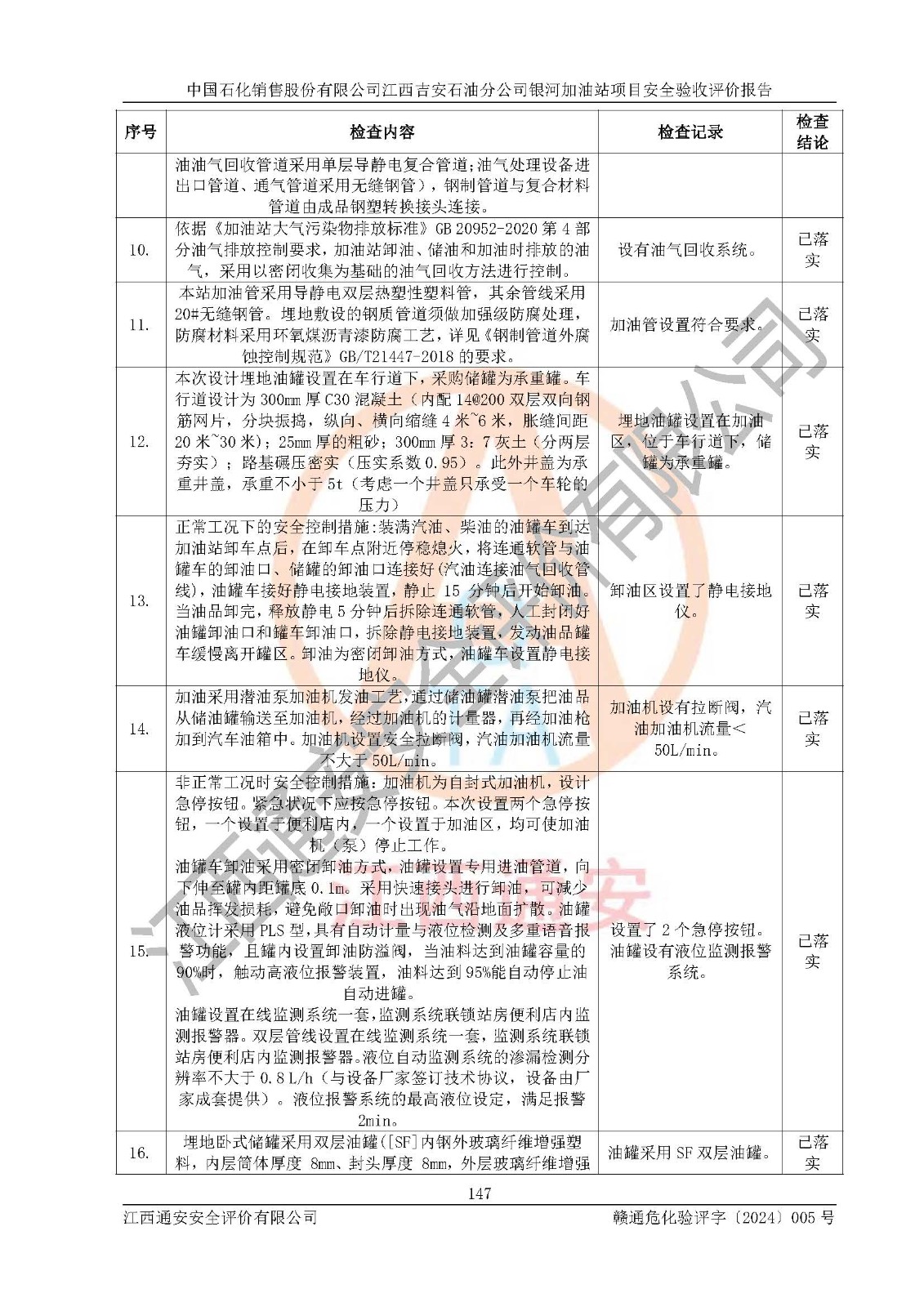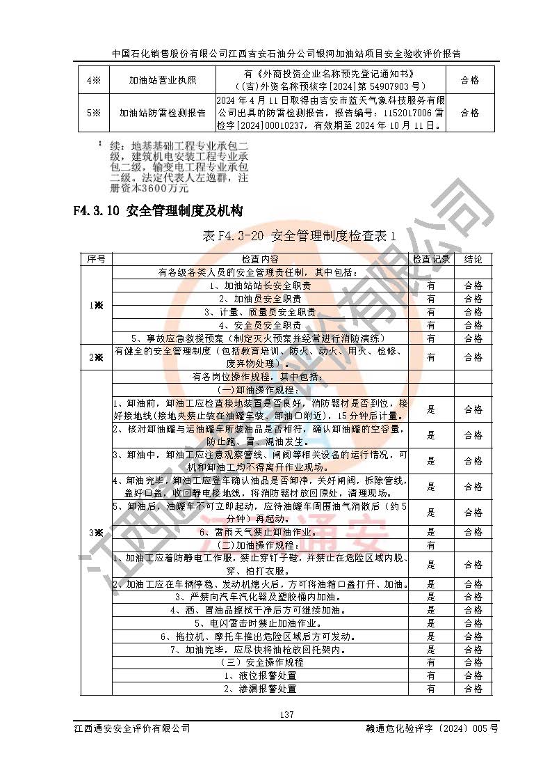 評(píng)價(jià)結(jié)論 | 中國(guó)石化銷售股份有限公司江西吉安石油分公司銀河加油站具備**有關(guān)安全生產(chǎn)法律、法規(guī)、部門規(guī)章及標(biāo)準(zhǔn)規(guī)范要求的安全條件,符合經(jīng)營(yíng)和儲(chǔ)存危險(xiǎn)化學(xué)品的安全條件要求,具備安全驗(yàn)收的要求。 | |||