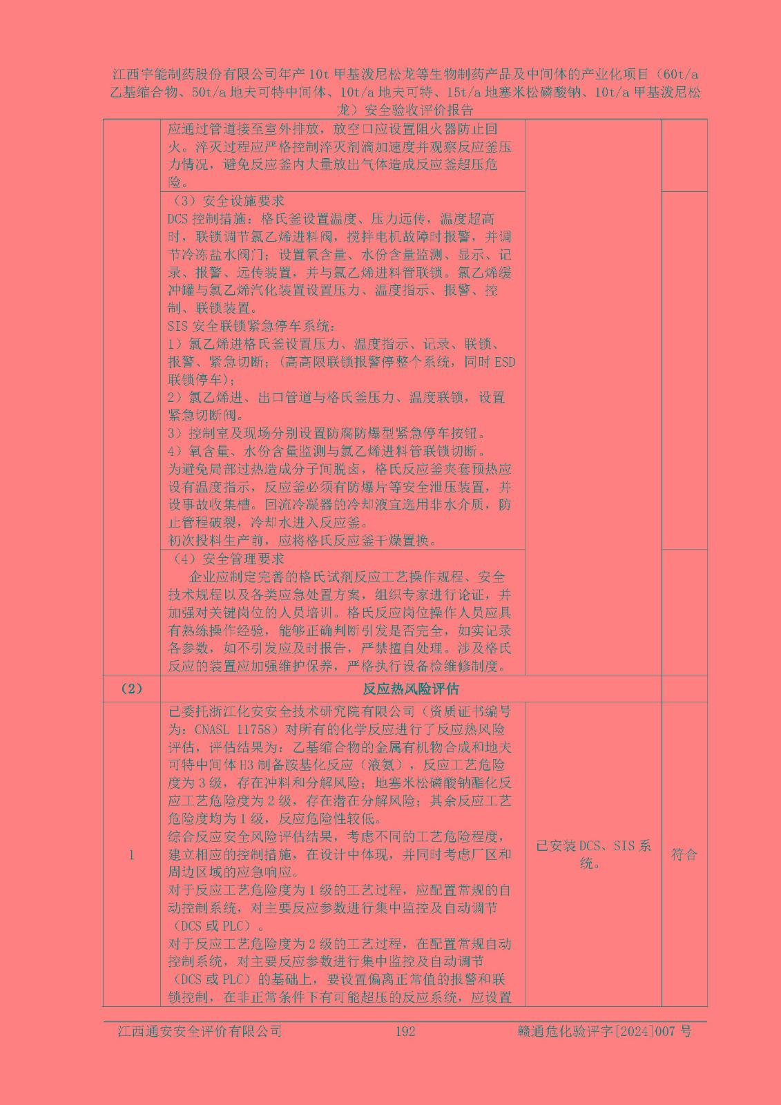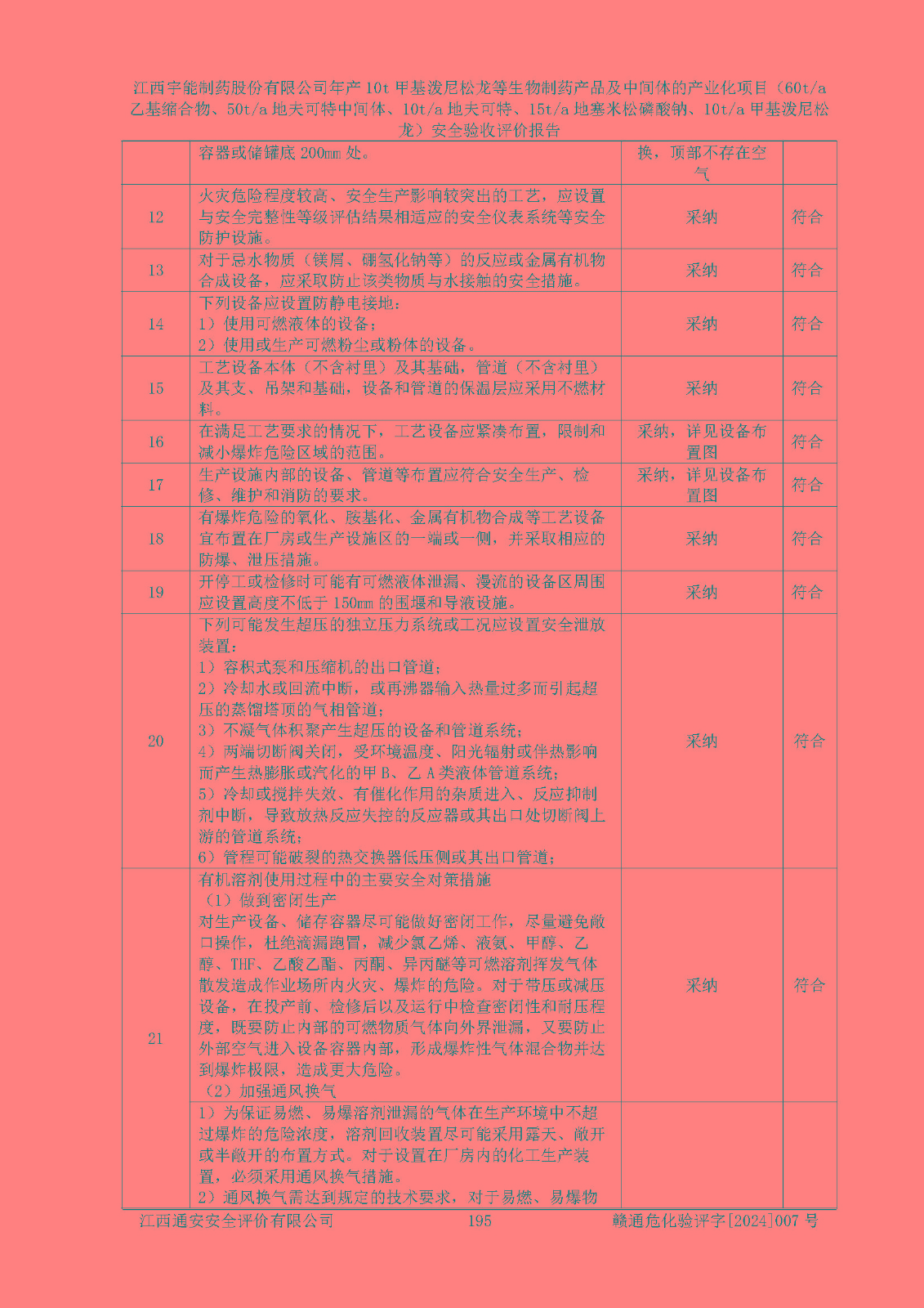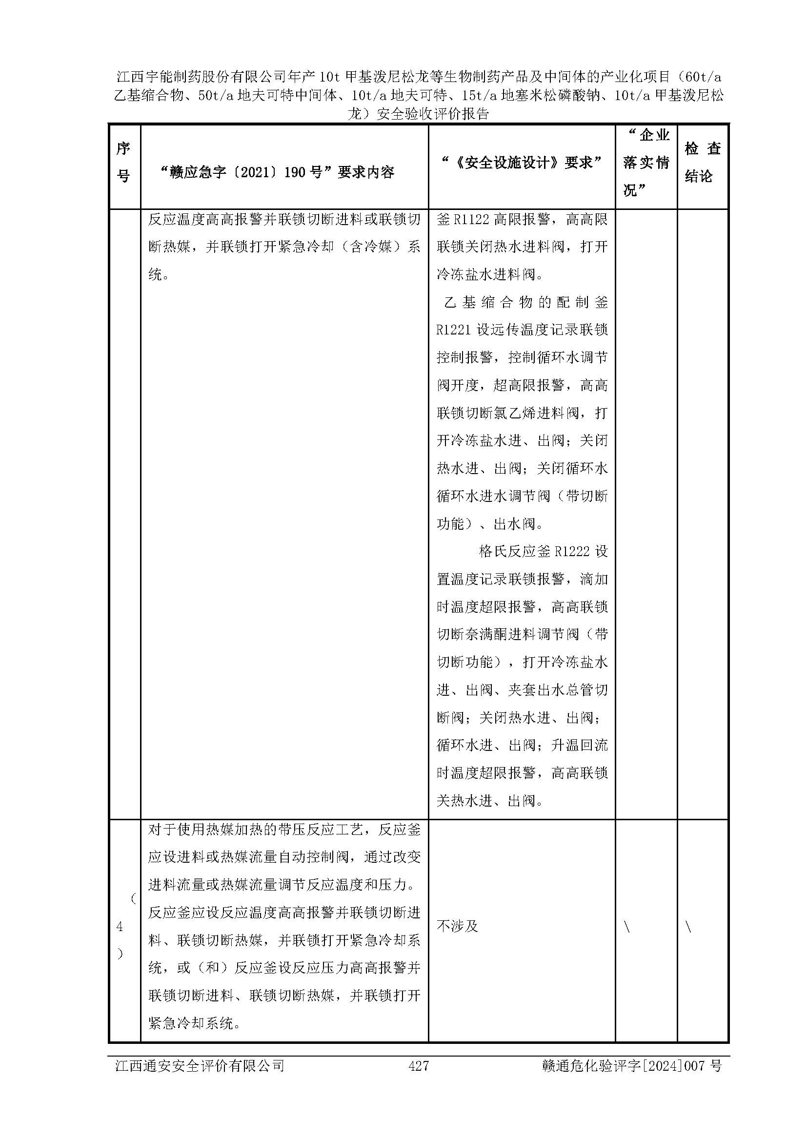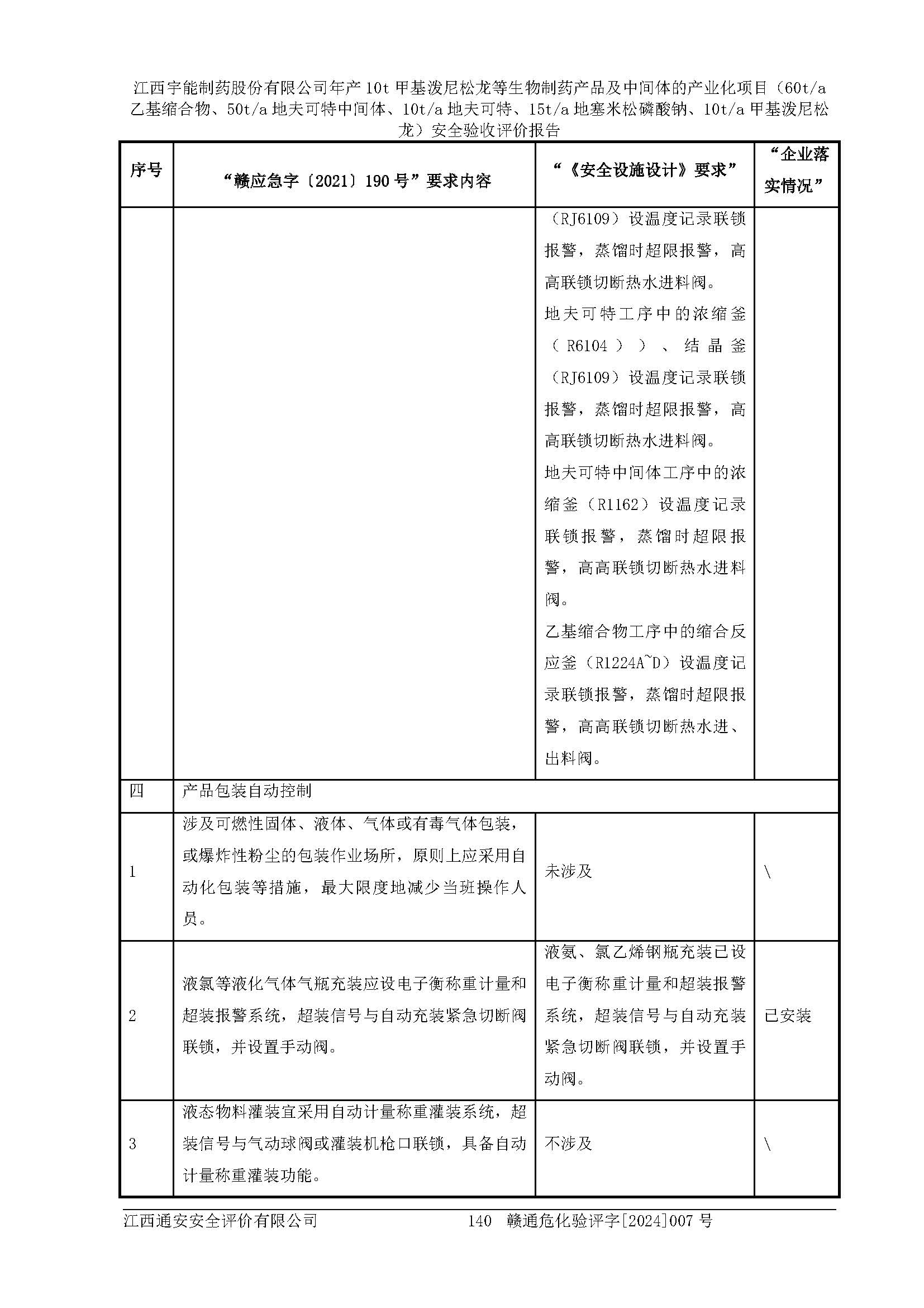 評(píng)價(jià)結(jié)論 | 評(píng)價(jià)結(jié)論:本評(píng)價(jià)認(rèn)為,江西宇能制藥股份有限公司年產(chǎn)10t甲基潑尼松龍等生物制藥產(chǎn)品及中間體的產(chǎn)業(yè)化項(xiàng)目(60t/a乙基縮合物、50t/a地夫可特中間體、10t/a地夫可特、15t/a地塞米松磷酸鈉、10t/a甲基潑尼松龍)工藝設(shè)備和安全設(shè)施運(yùn)行正常,該公司安全管理機(jī)制運(yùn)行正常,安全設(shè)施、措施達(dá)到設(shè)計(jì)要求和預(yù)期結(jié)果,可以滿足建設(shè)項(xiàng)目安全生產(chǎn)的要求,安全生產(chǎn)管理**,符合**有關(guān)安全生產(chǎn)法律、法規(guī)和有關(guān)標(biāo)準(zhǔn)、規(guī)范的要求,工程潛在的危險(xiǎn)、有害因素可得到**控制,風(fēng)險(xiǎn)在**控制和可接受范圍內(nèi)。具備安全設(shè)施竣工驗(yàn)收條件。 | |||