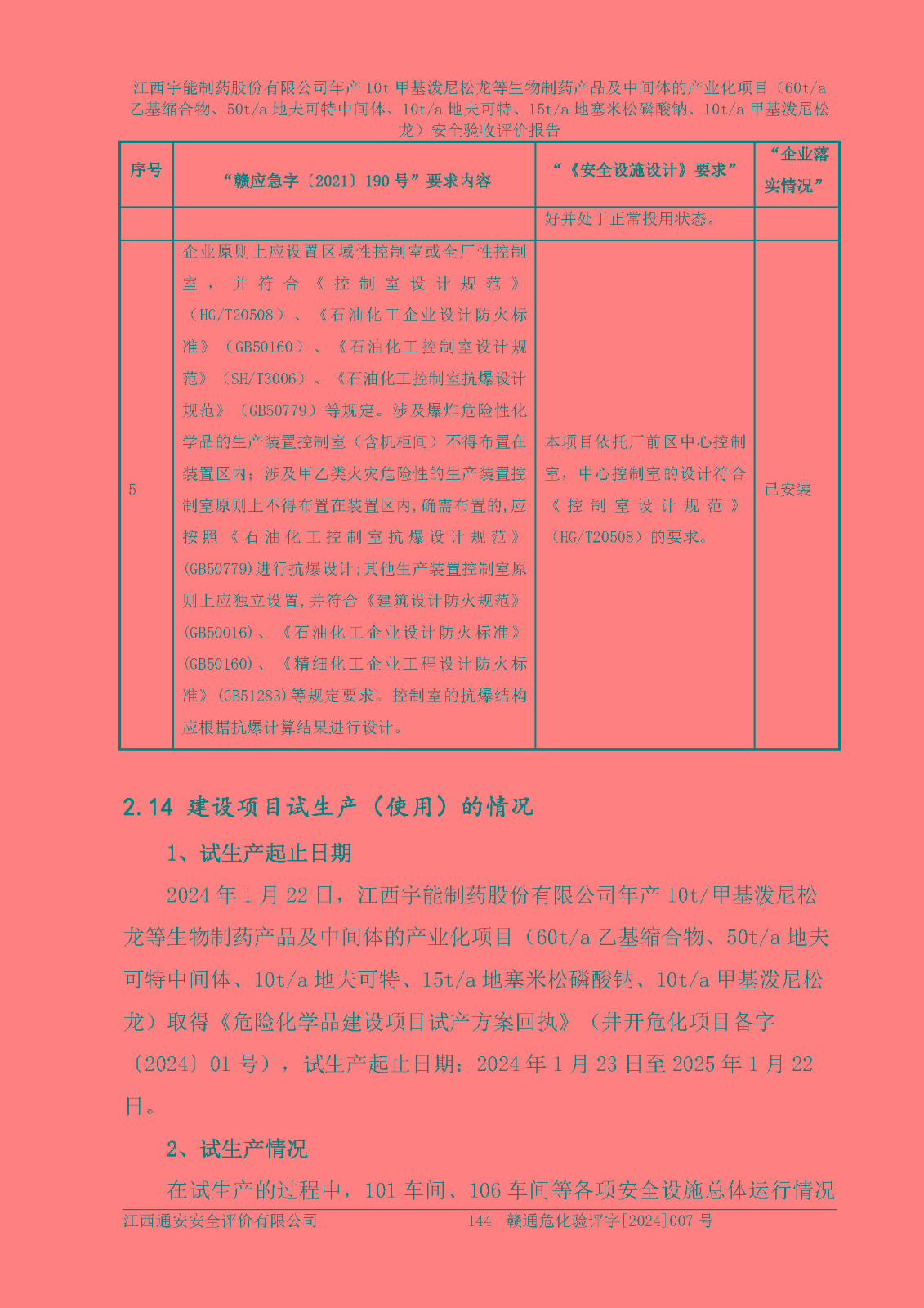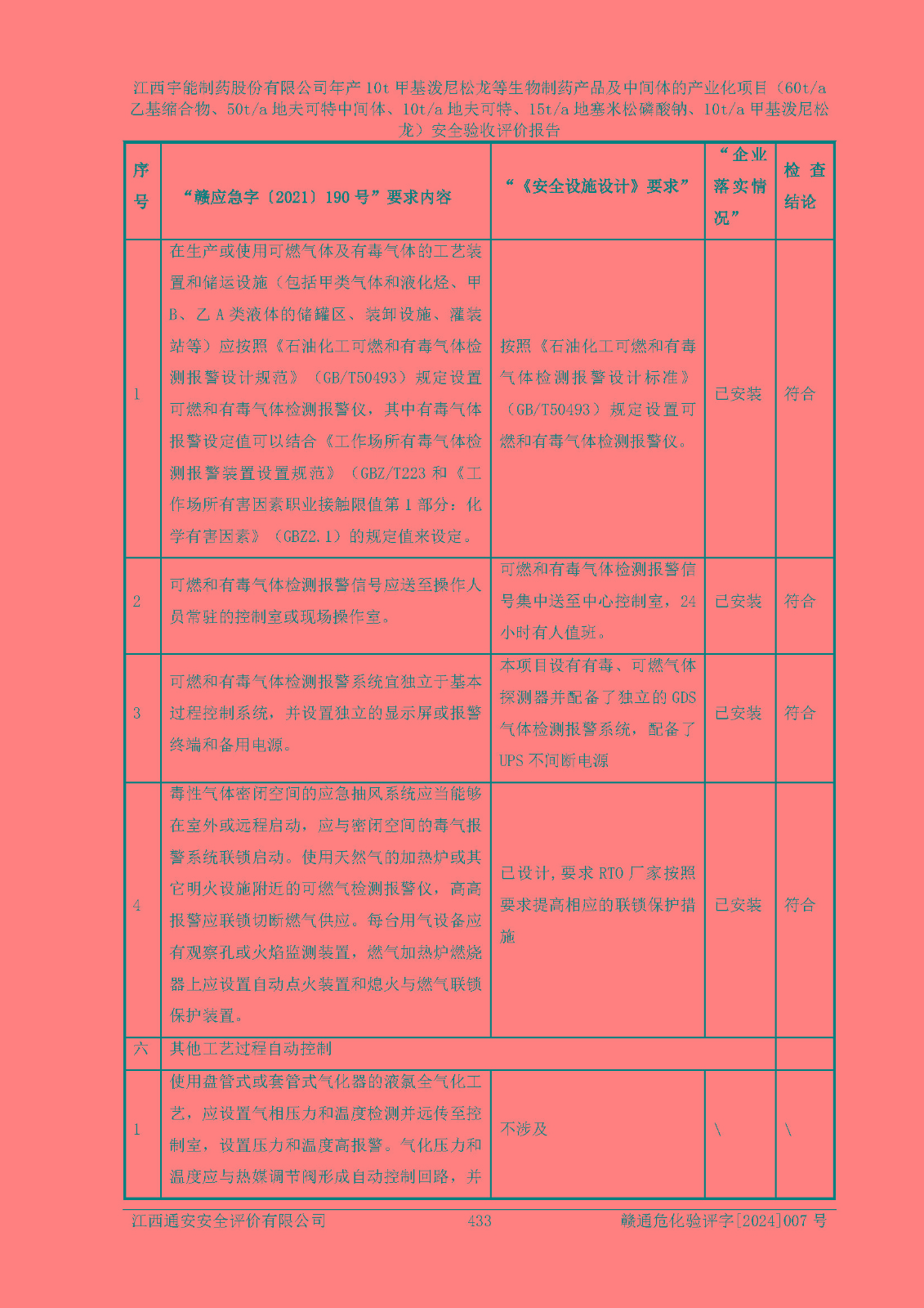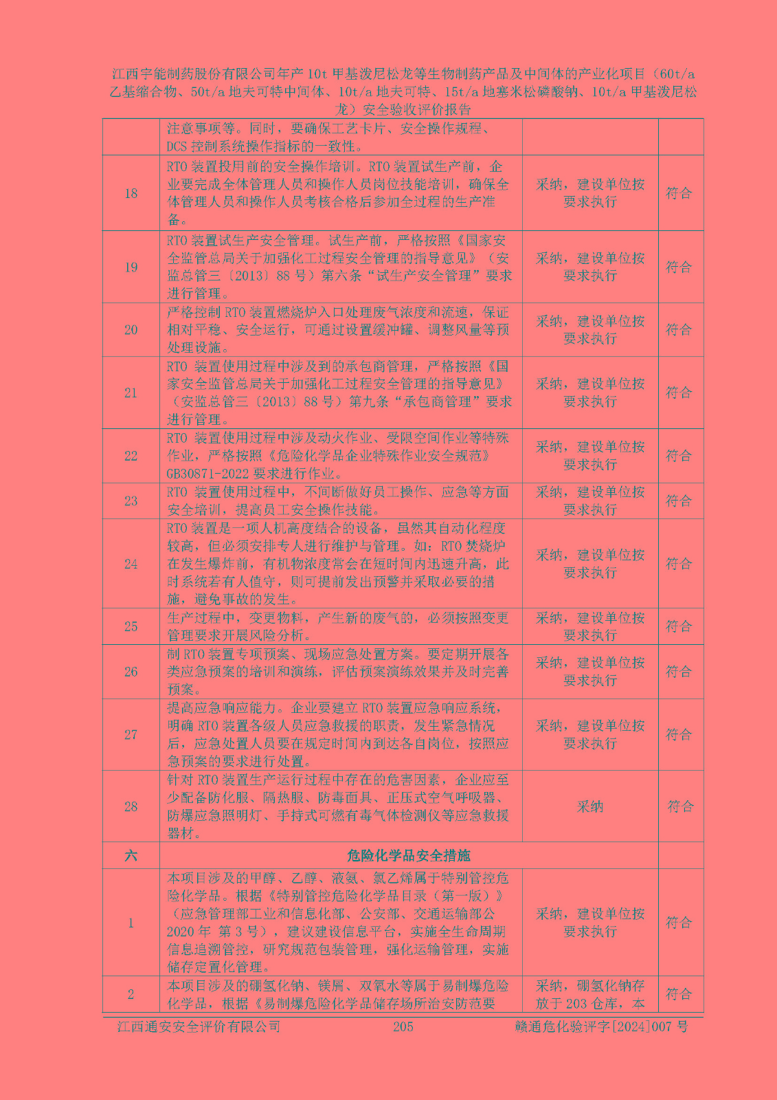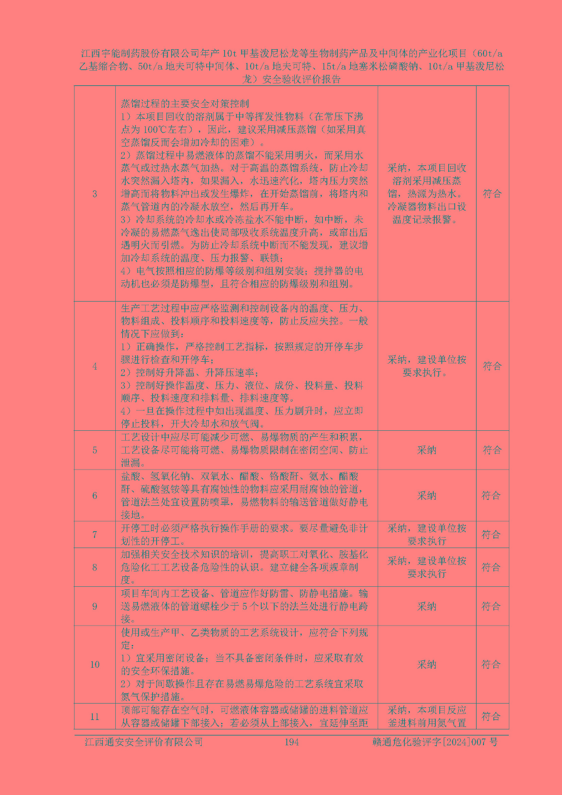 評(píng)價(jià)結(jié)論 | 評(píng)價(jià)結(jié)論:本評(píng)價(jià)認(rèn)為,江西宇能制藥股份有限公司年產(chǎn)10t甲基潑尼松龍等生物制藥產(chǎn)品及中間體的產(chǎn)業(yè)化項(xiàng)目(60t/a乙基縮合物、50t/a地夫可特中間體、10t/a地夫可特、15t/a地塞米松磷酸鈉、10t/a甲基潑尼松龍)工藝設(shè)備和安全設(shè)施運(yùn)行正常,該公司安全管理機(jī)制運(yùn)行正常,安全設(shè)施、措施達(dá)到設(shè)計(jì)要求和預(yù)期結(jié)果,可以滿足建設(shè)項(xiàng)目安全生產(chǎn)的要求,安全生產(chǎn)管理**,符合**有關(guān)安全生產(chǎn)法律、法規(guī)和有關(guān)標(biāo)準(zhǔn)、規(guī)范的要求,工程潛在的危險(xiǎn)、有害因素可得到**控制,風(fēng)險(xiǎn)在**控制和可接受范圍內(nèi)。具備安全設(shè)施竣工驗(yàn)收條件。 | |||