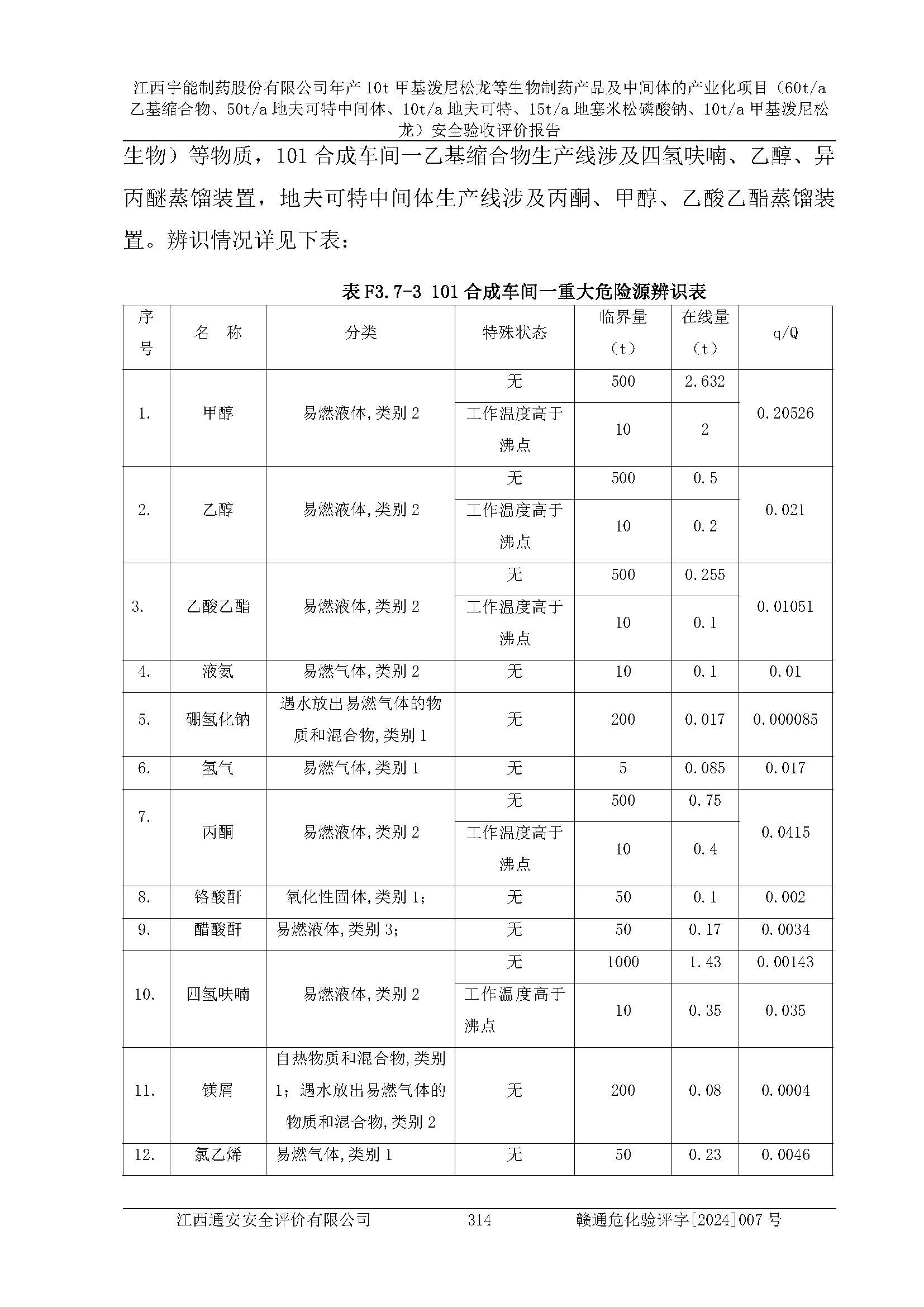 項(xiàng)目簡(jiǎn)介 | 江西宇能制藥股份有限公司成立于2003年1月24日,屬于股份有限公司(非上市,自然人投資或控股)。2023年9月5日取得井岡山經(jīng)濟(jì)技術(shù)開(kāi)發(fā)區(qū)行政審批局《江西省企業(yè)投資項(xiàng)目備案通知書》(統(tǒng)一項(xiàng)目代碼:2307-360861-07-02-106217),備案項(xiàng)目名稱:江西宇能制藥股份有限公司年產(chǎn)10t甲基潑尼松龍等生物制藥產(chǎn)品及中間體的產(chǎn)業(yè)化項(xiàng)目。項(xiàng)目總投資:55759.48萬(wàn)元。根據(jù)《國(guó)民經(jīng)濟(jì)行業(yè)分類》GB/T4754-2017,本項(xiàng)目屬于2710化學(xué)藥品原料藥制造。根據(jù)《關(guān)于公布**批化工重點(diǎn)監(jiān)測(cè)名單的通知》(吉市工信安全[2023]6號(hào))(見(jiàn)附件),江西宇能制藥股份有限公司被認(rèn)定為化工重點(diǎn)監(jiān)測(cè)點(diǎn)。 該公司于2023年10月由山東新安達(dá)工程咨詢有限公司出具了《江西宇能制藥股份有限公司醫(yī)藥原料藥及中間體生產(chǎn)項(xiàng)目安全條件評(píng)價(jià)報(bào)告》,并于2023年10月30日取得吉安市應(yīng)急管理局出具的《危險(xiǎn)化學(xué)品建設(shè)項(xiàng)目安全條件審查意見(jiàn)書》(吉市?;?xiàng)目安條審字[2023]10號(hào));于2023年11月由黑龍江龍維化學(xué)工程設(shè)計(jì)有限公司出具了《江西宇能制藥股份有限公司年產(chǎn)10t甲基潑尼松龍等生物制藥產(chǎn)品及中間體的產(chǎn)業(yè)化項(xiàng)目(60t/a乙基縮合物、50t/a地夫可特中間體、10t/a地夫可特、15t/a地塞米松磷酸鈉、10t/a甲基潑尼松龍)安全設(shè)施設(shè)計(jì)》,并于2023年11月15日取得吉安市應(yīng)急管理局出具的《危險(xiǎn)化學(xué)品建設(shè)項(xiàng)目安全設(shè)施設(shè)計(jì)審查意見(jiàn)書》(吉市?;?xiàng)目安設(shè)審字[2023]27號(hào));2023年11月由黑龍江龍維化學(xué)工程設(shè)計(jì)有限公司出具了《江西宇能制藥股份有限公司年產(chǎn)10t甲基潑尼松龍等生物制藥產(chǎn)品及中間體的產(chǎn)業(yè)化項(xiàng)目(60t/a乙基縮合物、50t/a地夫可特中間體、10t/a地夫可特、15t/a地塞米松磷酸鈉、10t/a甲基潑尼松龍)安全設(shè)施設(shè)計(jì)變更》。本次驗(yàn)收僅對(duì)該項(xiàng)目安全設(shè)施設(shè)計(jì)及變更部分進(jìn)行評(píng)價(jià)。 根據(jù)《危險(xiǎn)化學(xué)品目錄》(2015年版)、應(yīng)急管理部辦公廳關(guān)于修改《危險(xiǎn)化學(xué)品目錄(2015年版)實(shí)施指南(試行)》涉及柴油部分內(nèi)容的通知(應(yīng)急廳函〔2022〕300號(hào))和應(yīng)急管理部 工業(yè)和信息化部 公安部 生態(tài)環(huán)境部 交通運(yùn)輸部 農(nóng)業(yè)農(nóng)村部 衛(wèi)生健康委 市場(chǎng)監(jiān)管總局 鐵路局 民航局 公告2022年第8號(hào)《決定調(diào)整《危險(xiǎn)化學(xué)品目錄(2015版)》,將“1674柴油〔閉杯閃點(diǎn)≤60℃〕”調(diào)整為“1674柴油”》的文件規(guī)定,本項(xiàng)目涉及的氯乙烯、四氫呋喃、鎂屑、甲醇、乙醇、鉻酸酐、鹽酸(37%)、氫氧化鈉、冰醋酸、三氯甲烷、二氯甲烷、乙酸乙酯、液氨、氨水(20%)、醋酸酐、硼氫化鈉、異丙醚、硫酸氫銨、甲醛(36.5%)、**、三乙胺、雙氧水(30%)、氮?dú)猓ㄒ夯模?、氫氣(地夫可特中間體H5制備伴生物)、柴油(發(fā)電機(jī)燃料)、二氧六環(huán)、氫碘酸、重鉻酸鈉、天然氣(燃料)屬于危險(xiǎn)化學(xué)品,其它輔材和產(chǎn)品均不屬于危險(xiǎn)化學(xué)品。本項(xiàng)目地夫可特中間體H1制備涉及氧化工藝和H2制備、H3制備涉及胺基化工藝屬于重點(diǎn)監(jiān)管危險(xiǎn)化工工藝;乙基縮合物生產(chǎn)過(guò)程涉及在THF中,氯乙烯與鎂屑反應(yīng)工藝屬于金屬有機(jī)物合成。該項(xiàng)目涉及的生產(chǎn)單元、儲(chǔ)存單元均不構(gòu)成危險(xiǎn)化學(xué)品重大危險(xiǎn)源。本項(xiàng)目涉及甲醇、三氯甲烷、乙酸乙酯、氯乙烯、液氨、氫氣(伴生物)屬于重點(diǎn)監(jiān)管危險(xiǎn)化學(xué)品。主要的危險(xiǎn)、有害因素為火災(zāi)、爆炸、中毒和窒息、腐蝕灼燙等。 該項(xiàng)目涉及的甲醇、乙醇、液氨、氯乙烯屬于特別管控危險(xiǎn)化學(xué)品;不涉及監(jiān)控化學(xué)品;硼氫化鈉、鎂屑、雙氧水(30%)、重鉻酸鈉屬于易制爆化學(xué)品;**、鹽酸、醋酸酐、三氯甲烷屬于第二、三類易制毒化學(xué)品;液氨、氯乙烯屬于高毒物品;未涉及劇毒化學(xué)品。 該項(xiàng)目技術(shù)主要來(lái)源于企業(yè)****,已委托江西省化學(xué)化工學(xué)會(huì)對(duì)60t/a乙基縮合物、50t/a地夫可特中間體、10t/a地夫可特、15t/a地塞米松磷酸鈉、10t/a甲基潑尼松龍生產(chǎn)工藝進(jìn)行**首次使用的化工工藝技術(shù)安全可靠性論證,并出具《江西省化工建設(shè)項(xiàng)目**首次使用的化工工藝技術(shù)安全可靠性論證報(bào)告》。論證時(shí)間:2023年9月28日,論證結(jié)果:同意通過(guò)上述五個(gè)產(chǎn)品的生產(chǎn)工藝技術(shù)安全可靠性論證。 委托浙江化安安全技術(shù)研究院有限公司(資質(zhì)證書編號(hào)為:CNASL 11758)對(duì)所有的化學(xué)反應(yīng)進(jìn)行了反應(yīng)熱風(fēng)險(xiǎn)評(píng)估,評(píng)估結(jié)果為:乙基縮合物的金屬有機(jī)物合成和地夫可特中間體H3制備胺基化反應(yīng)(液氨),反應(yīn