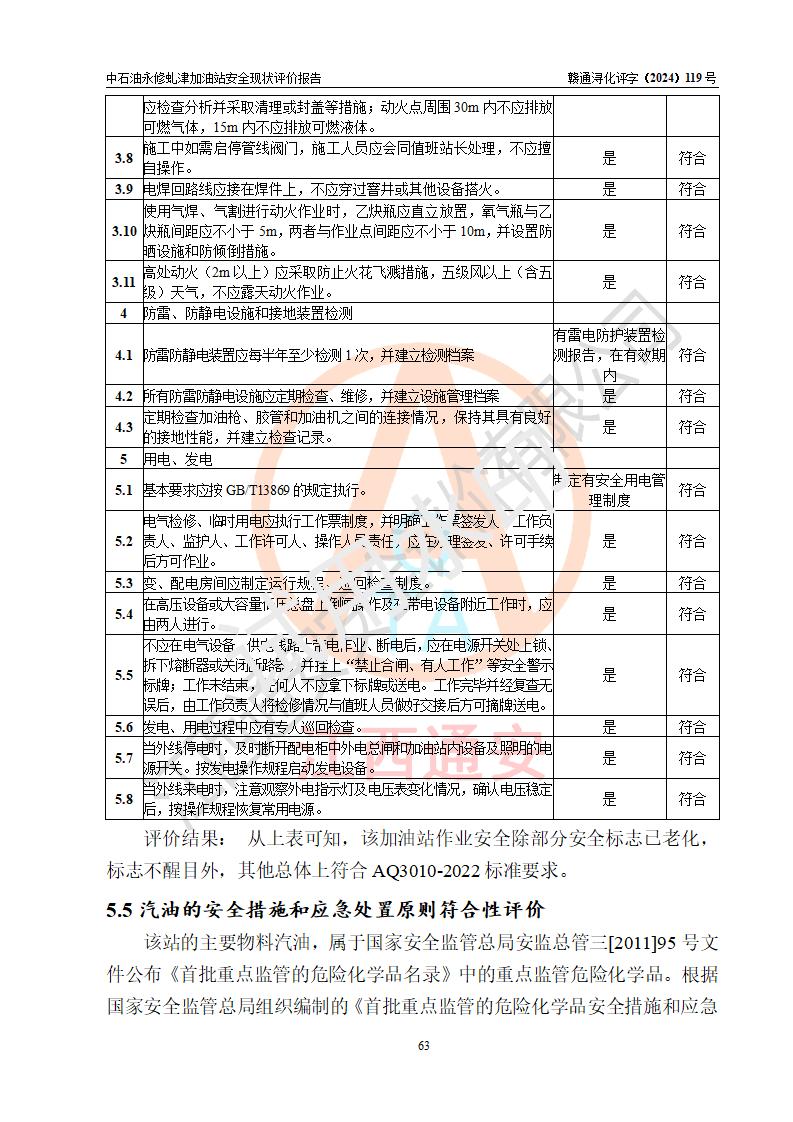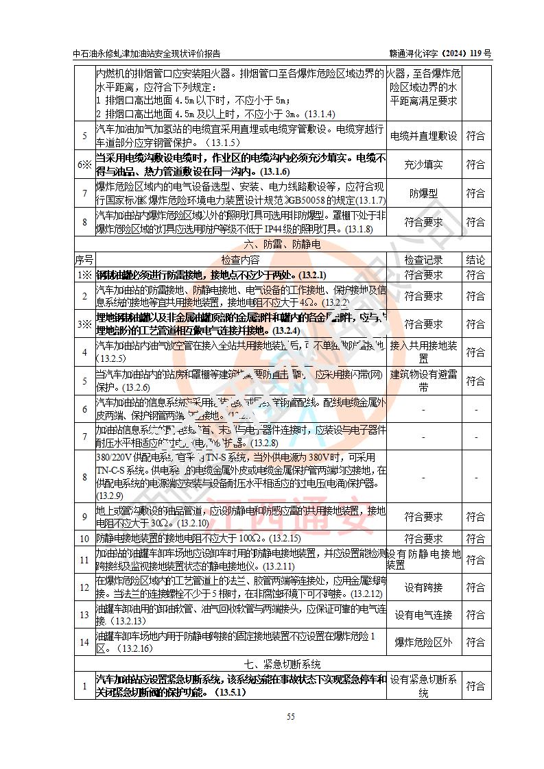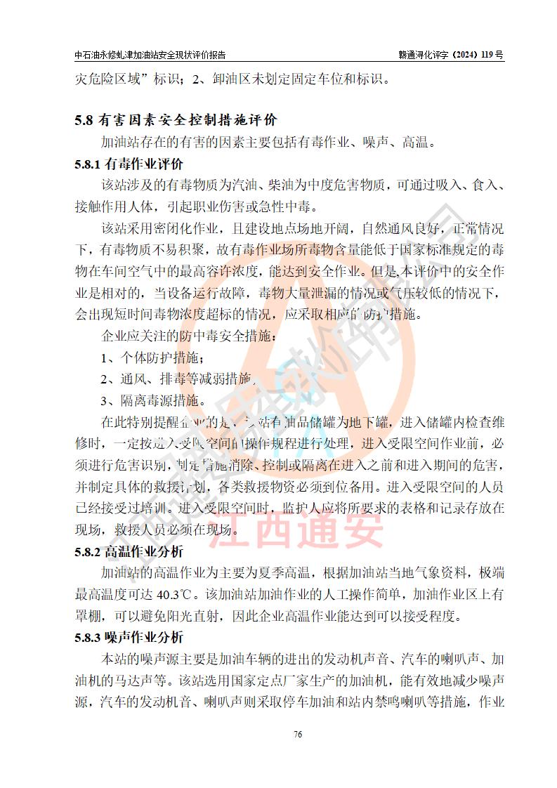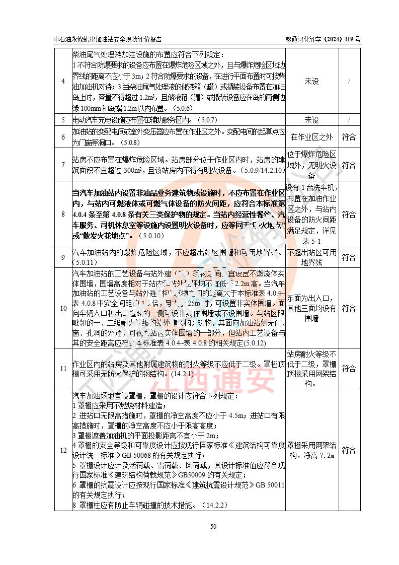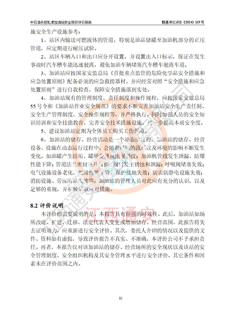 評價結論 | 中國石油天然氣股份有限公司江西九江永修縣虬津加油站涉及的安全條件、安全經(jīng)營條件、安全生產(chǎn)管理符合《危險化學品經(jīng)營許可證管理辦法》、《汽車加油加氣加氫站技術標準》等**有關法規(guī)、標準、規(guī)范要求,能滿足危險化學品經(jīng)營安全條件。 | |||