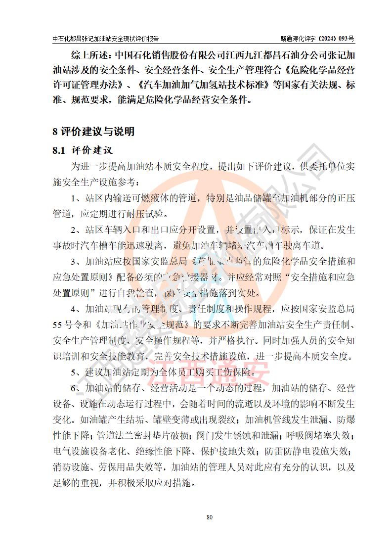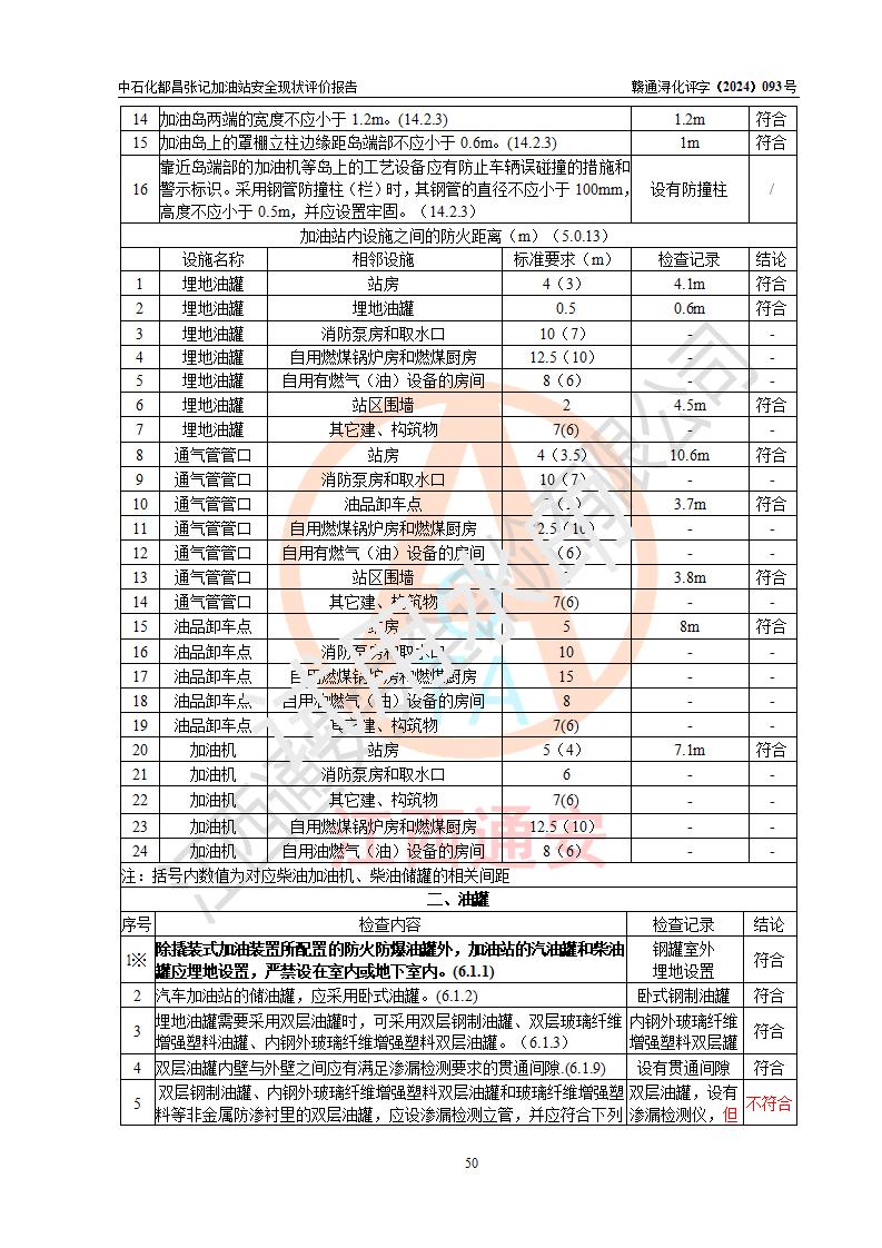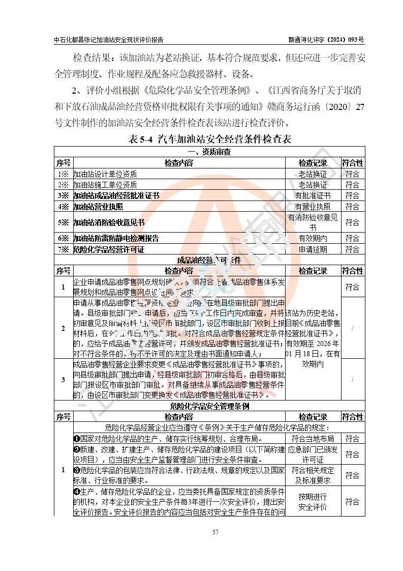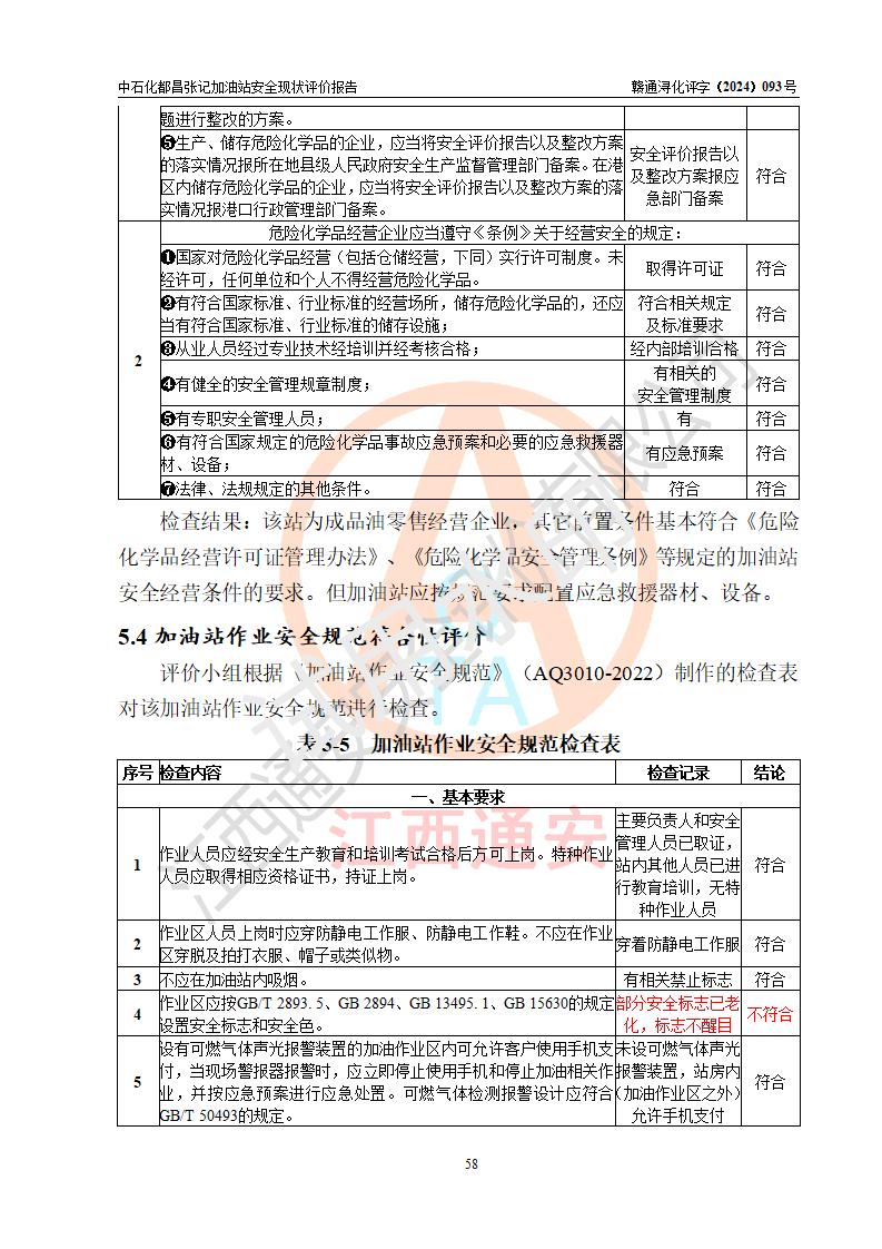 評價結論 | 中國石化銷售股份有限公司江西九江都昌石油分公司張記加油站涉及的安全條件、安全經營條件、安全生產管理符合《危險化學品經營許可證管理辦法》、《汽車加油加氣加氫站技術標準》等**有關法規(guī)、標準、規(guī)范要求,能滿足危險化學品經營安全條件。 | |||