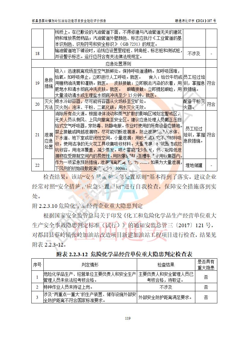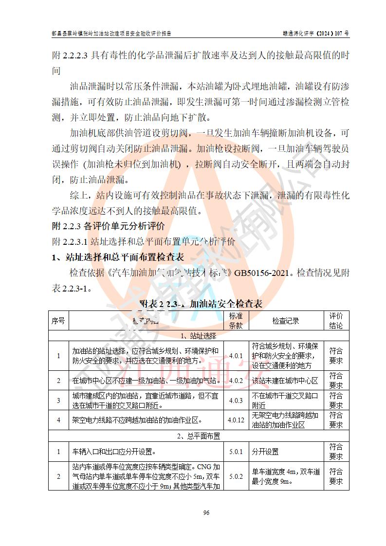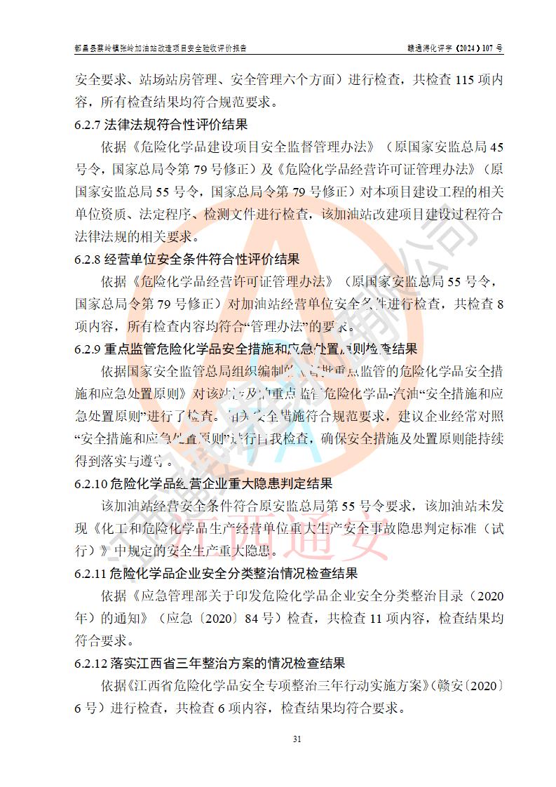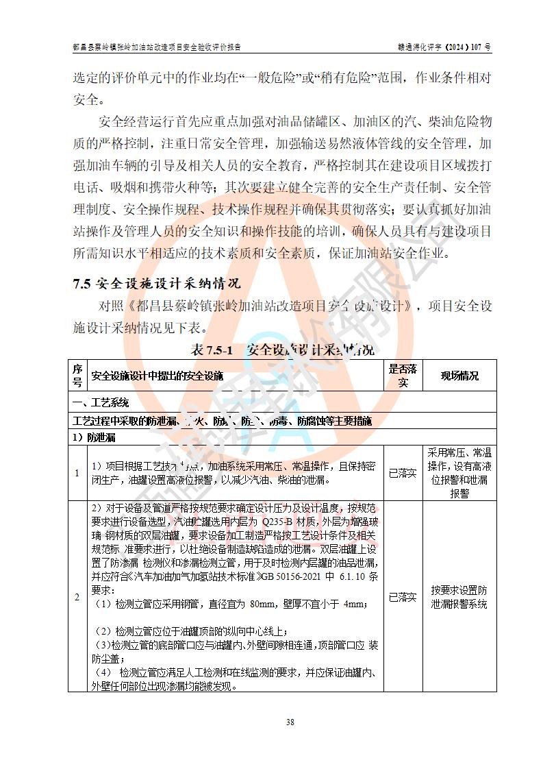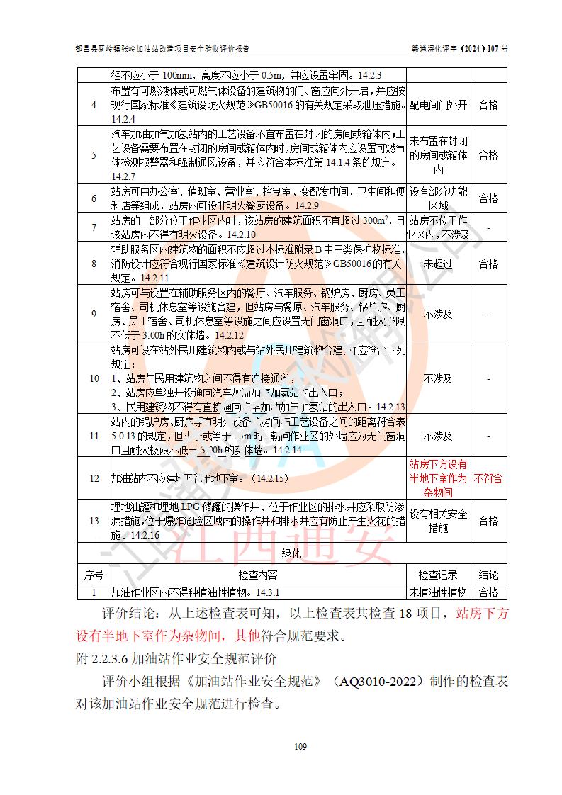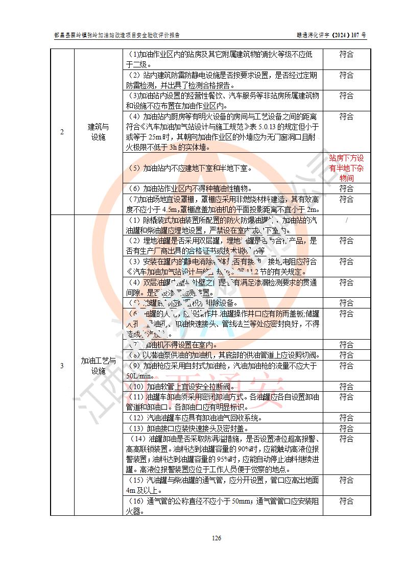 評價結論 | 都昌縣蔡嶺鎮(zhèn)張嶺加油站改造項目涉及的安全條件、安全生產(chǎn)條件、安全生產(chǎn)管理符合《危險化學品經(jīng)營許可證管理辦法》、《汽車加油加氣加氫站技術標準》等**有關法規(guī)、標準、規(guī)范要求,能滿足成品油零售經(jīng)營單位的安全條件,具備項目竣工驗收的條件。 | |||