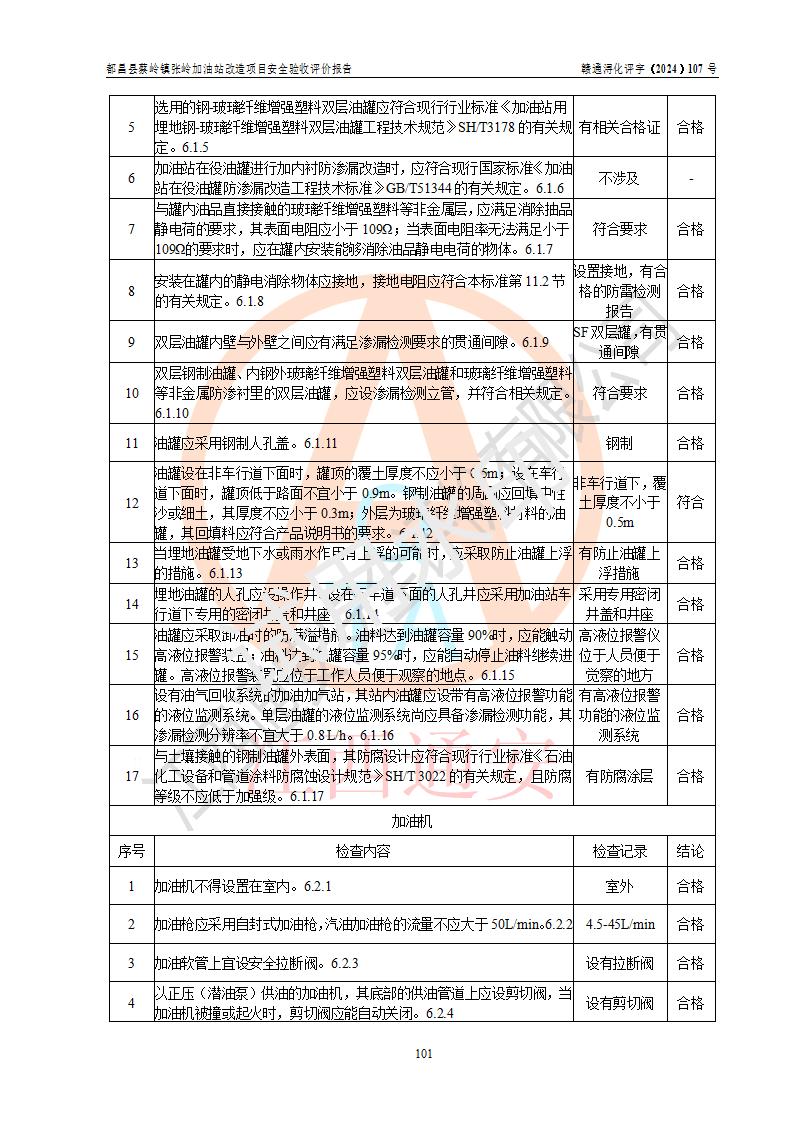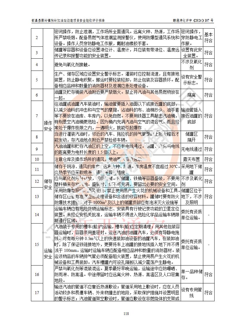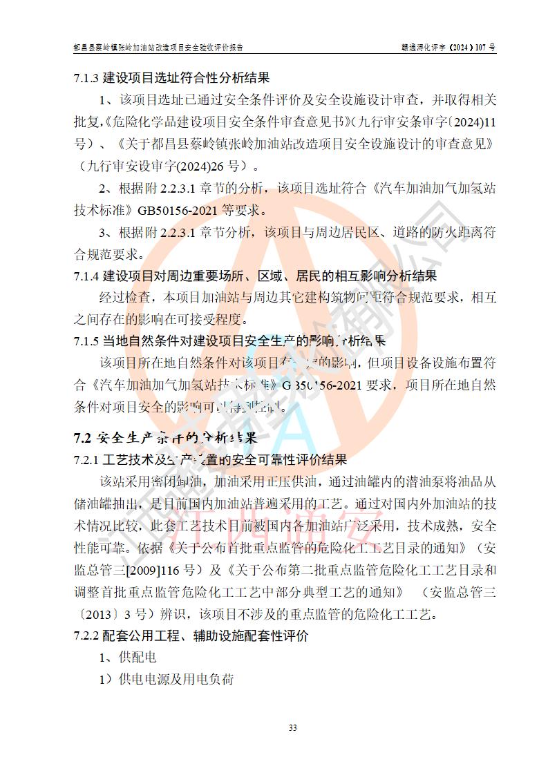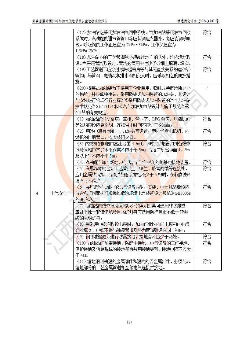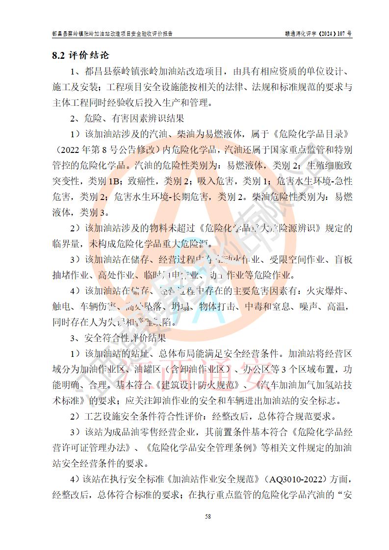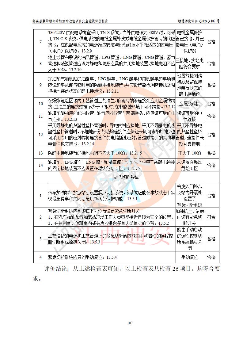 評價結論 | 都昌縣蔡嶺鎮(zhèn)張嶺加油站改造項目涉及的安全條件、安全生產(chǎn)條件、安全生產(chǎn)管理符合《危險化學品經(jīng)營許可證管理辦法》、《汽車加油加氣加氫站技術標準》等**有關法規(guī)、標準、規(guī)范要求,能滿足成品油零售經(jīng)營單位的安全條件,具備項目竣工驗收的條件。 | |||