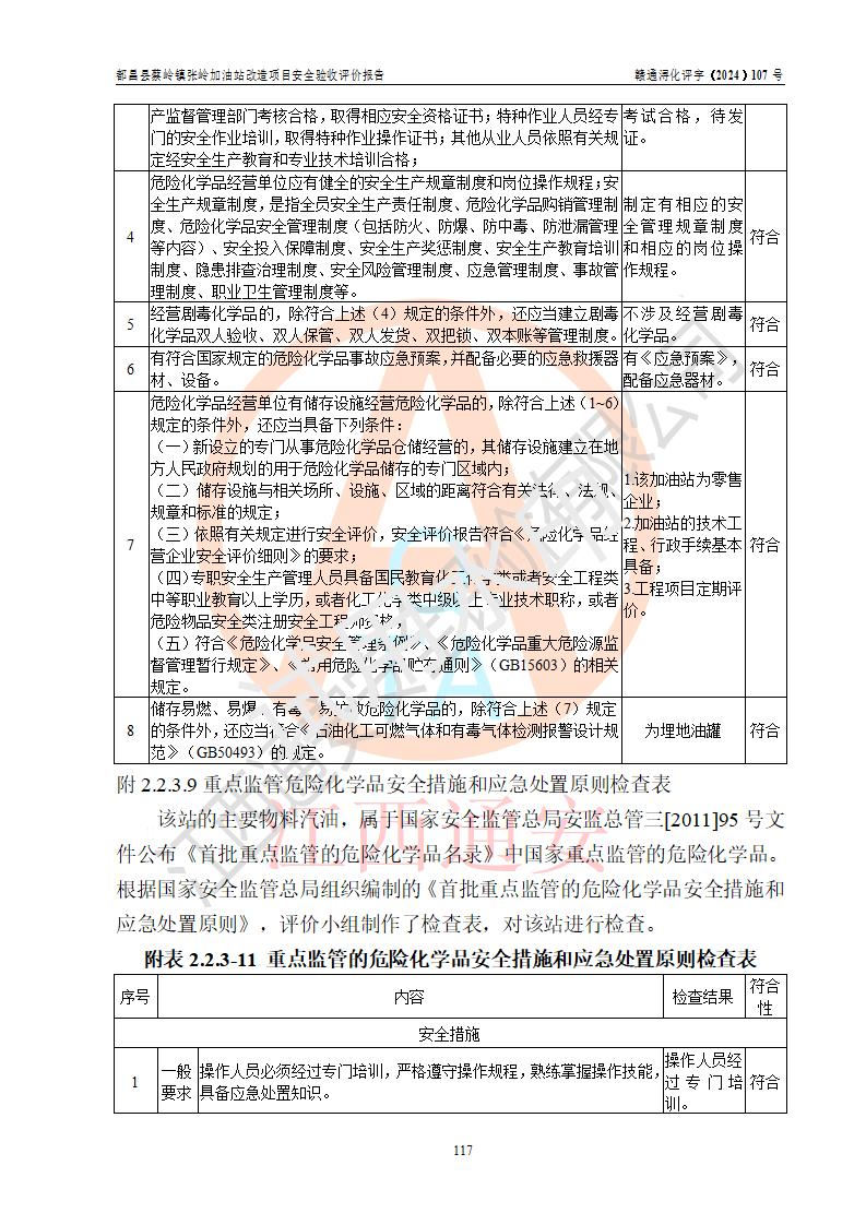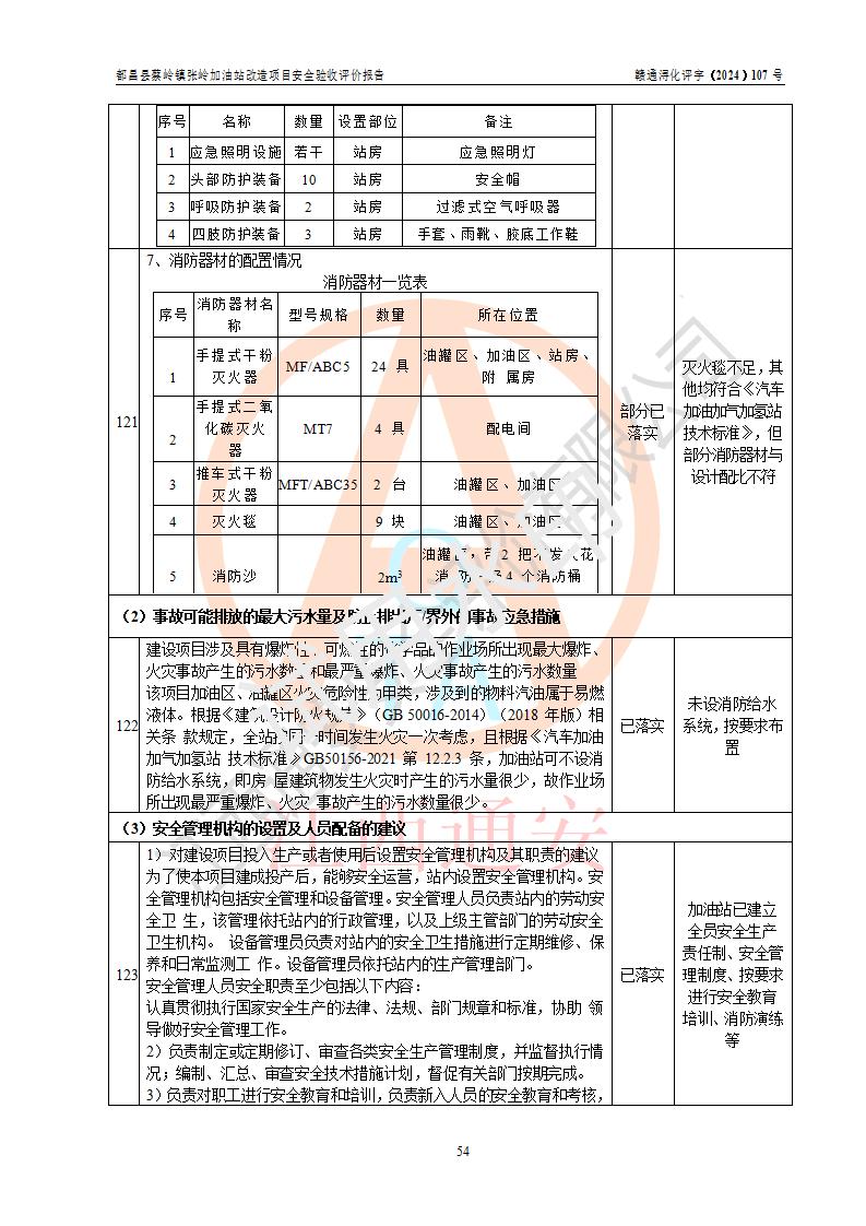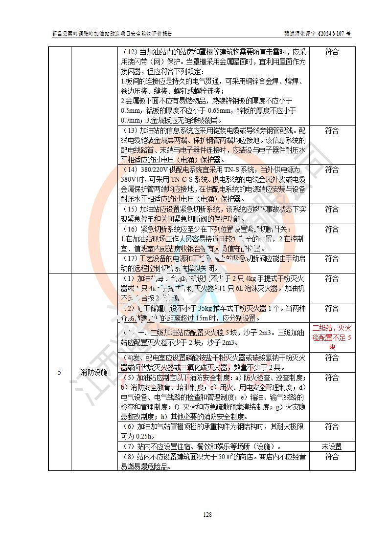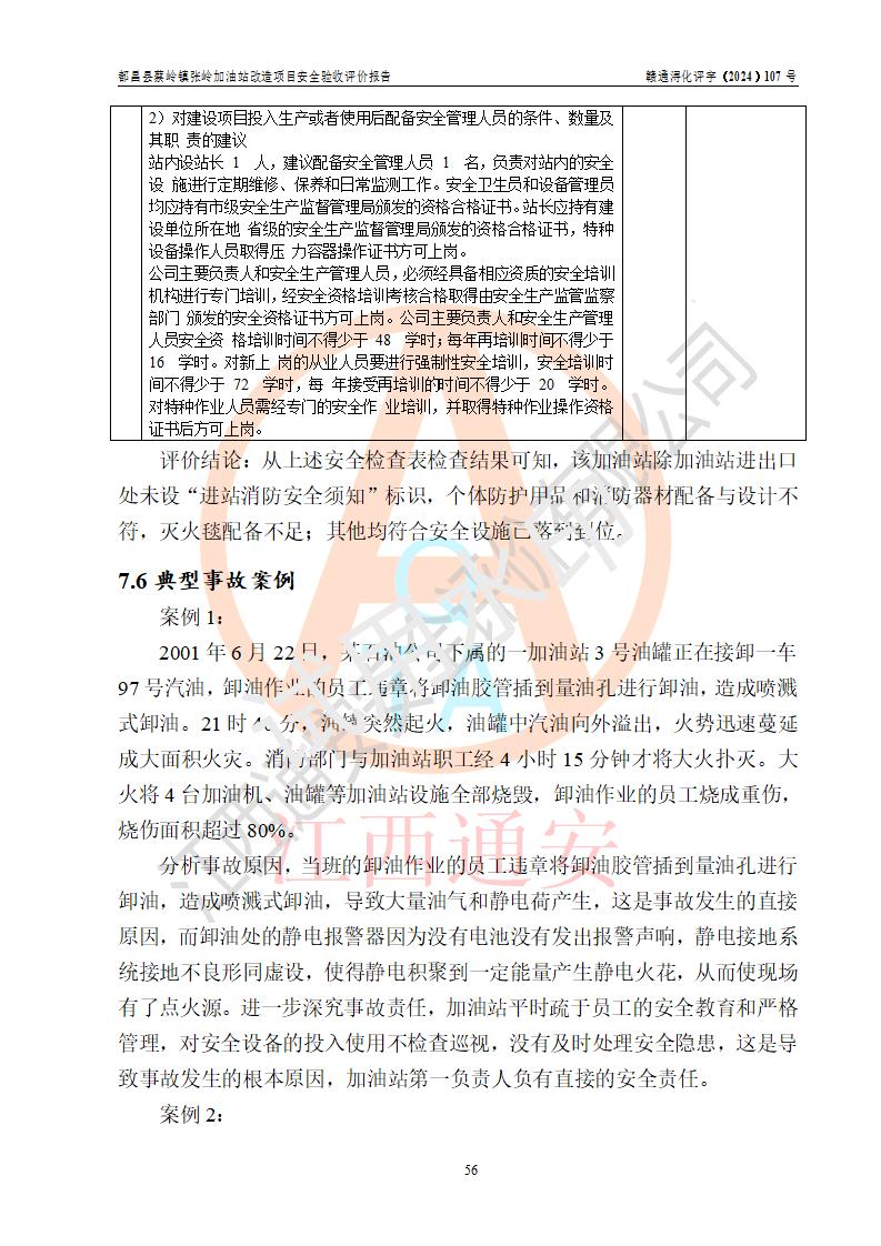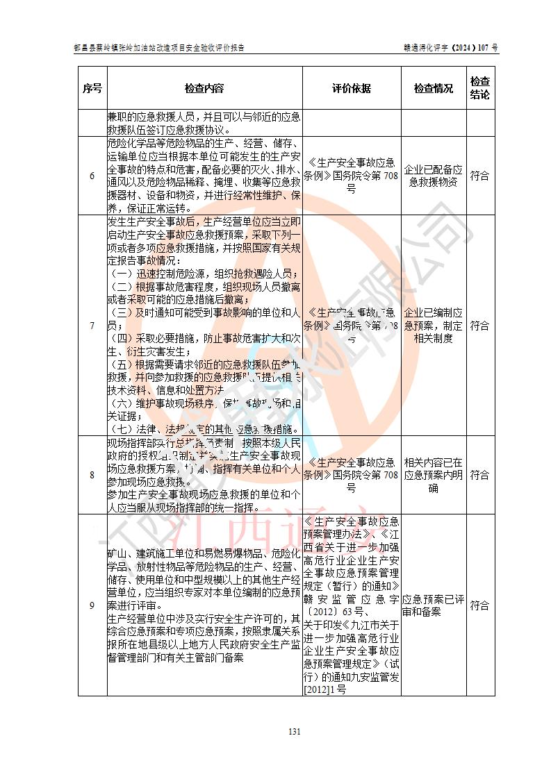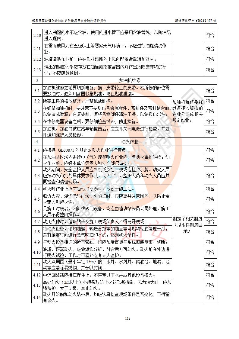 評價結論 | 都昌縣蔡嶺鎮(zhèn)張嶺加油站改造項目涉及的安全條件、安全生產(chǎn)條件、安全生產(chǎn)管理符合《危險化學品經(jīng)營許可證管理辦法》、《汽車加油加氣加氫站技術標準》等**有關法規(guī)、標準、規(guī)范要求,能滿足成品油零售經(jīng)營單位的安全條件,具備項目竣工驗收的條件。 | |||