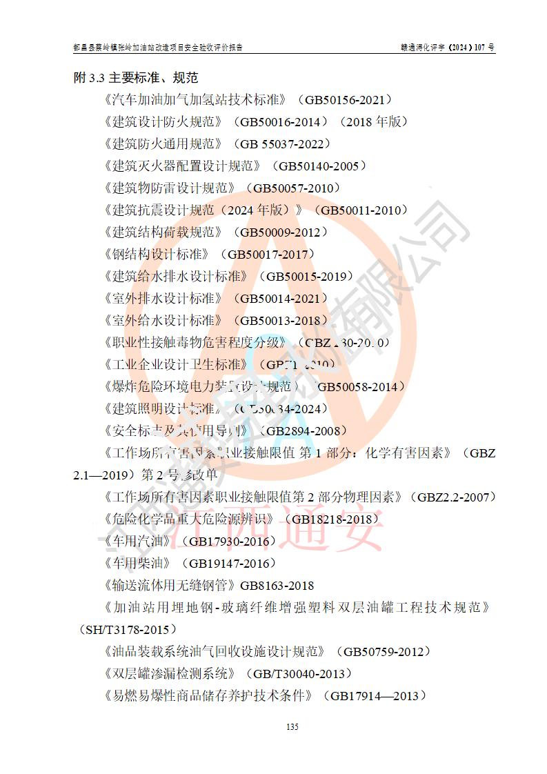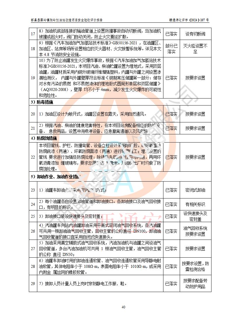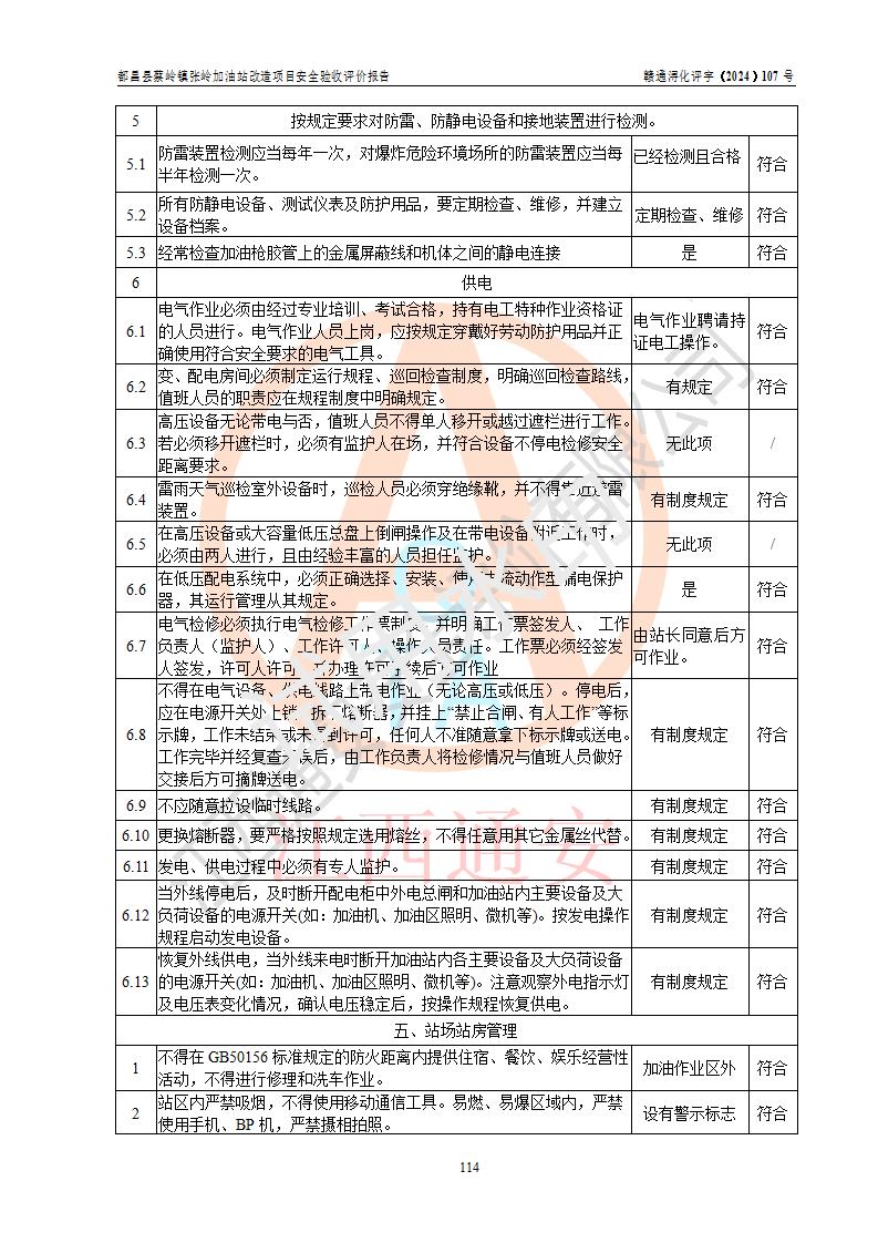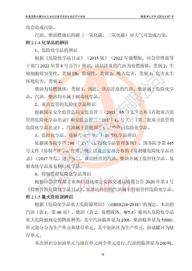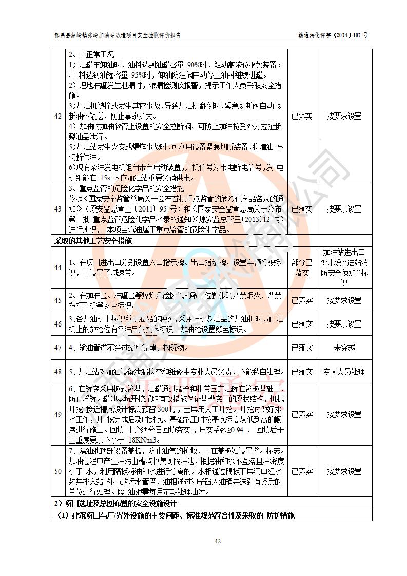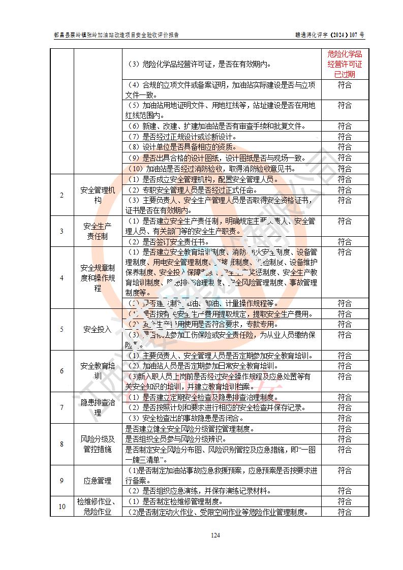評價結論 | 都昌縣蔡嶺鎮(zhèn)張嶺加油站改造項目涉及的安全條件、安全生產(chǎn)條件、安全生產(chǎn)管理符合《危險化學品經(jīng)營許可證管理辦法》、《汽車加油加氣加氫站技術標準》等**有關法規(guī)、標準、規(guī)范要求,能滿足成品油零售經(jīng)營單位的安全條件,具備項目竣工驗收的條件。 | |||