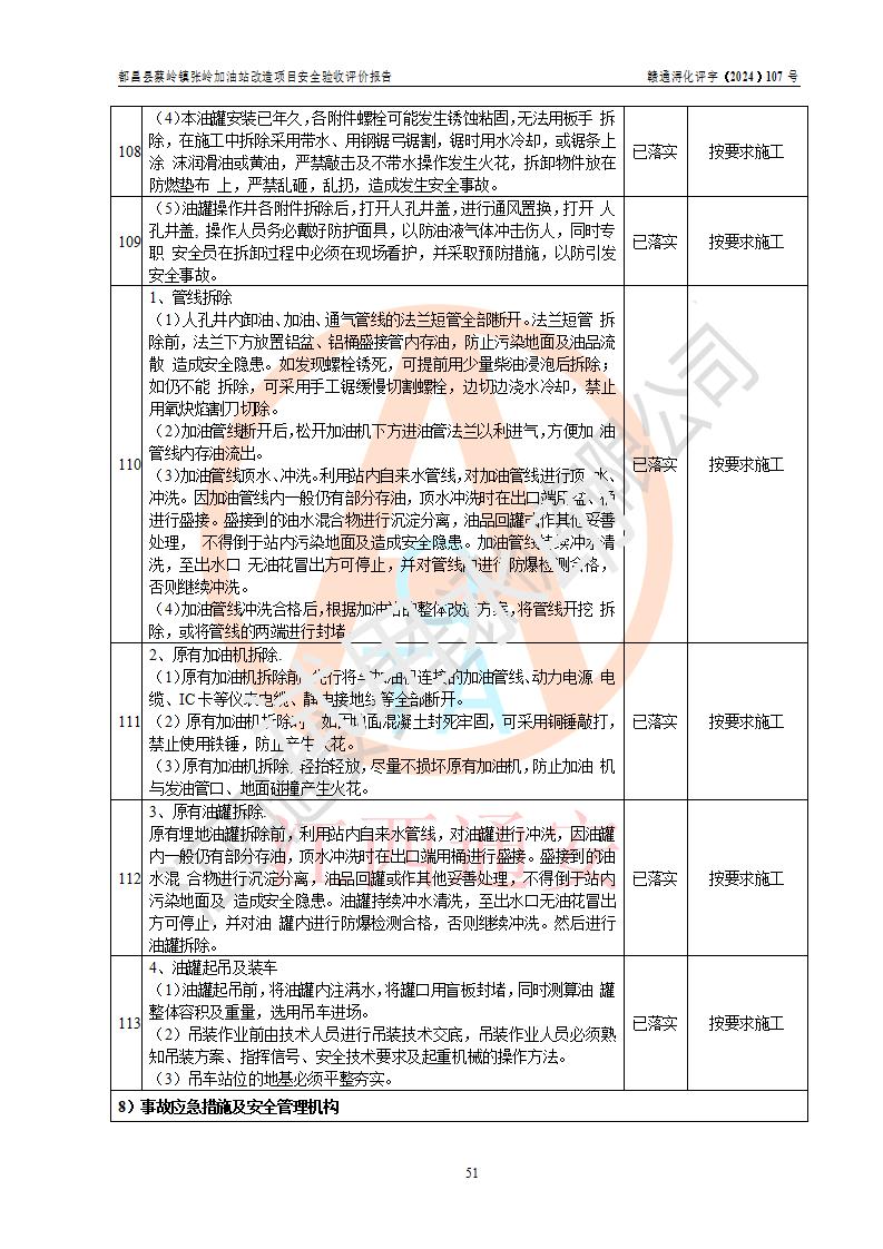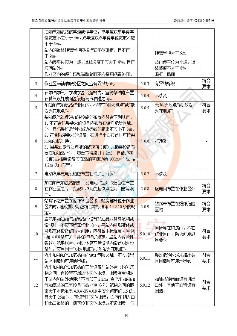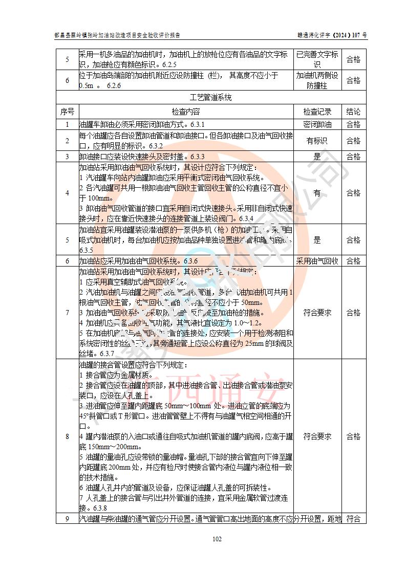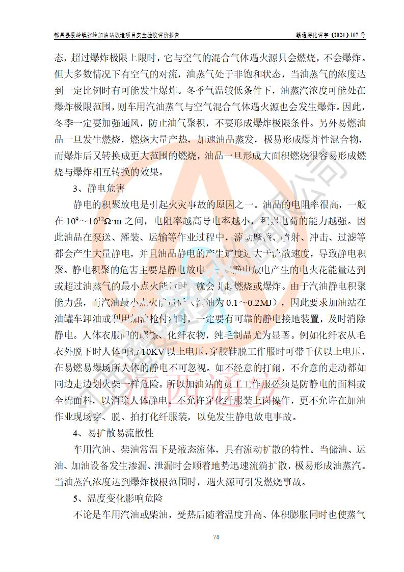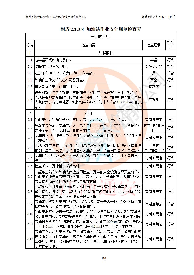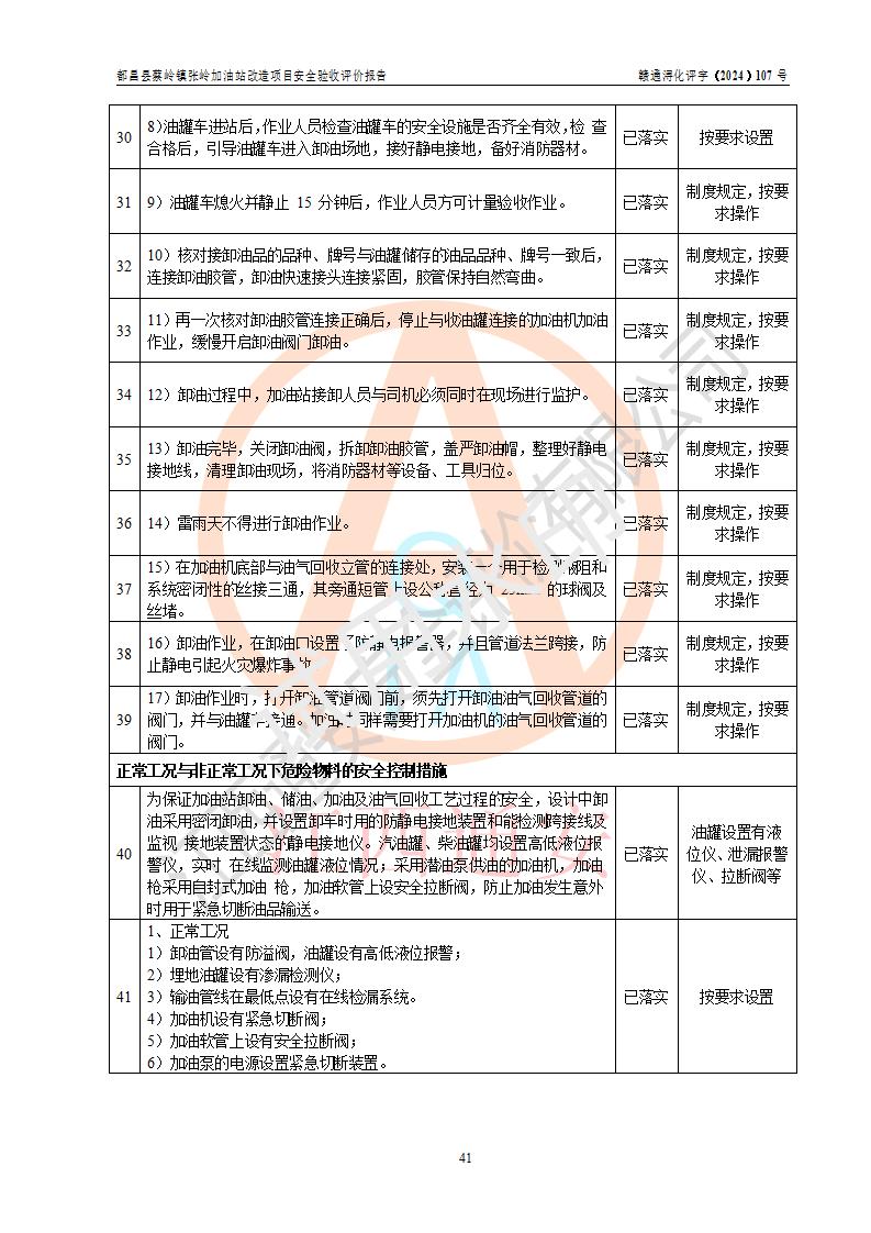 評價結論 | 都昌縣蔡嶺鎮(zhèn)張嶺加油站改造項目涉及的安全條件、安全生產(chǎn)條件、安全生產(chǎn)管理符合《危險化學品經(jīng)營許可證管理辦法》、《汽車加油加氣加氫站技術標準》等**有關法規(guī)、標準、規(guī)范要求,能滿足成品油零售經(jīng)營單位的安全條件,具備項目竣工驗收的條件。 | |||