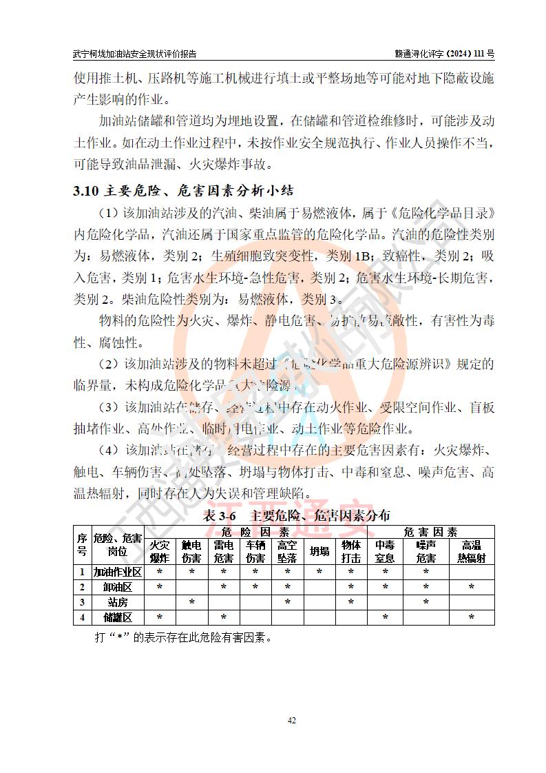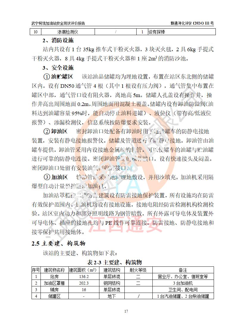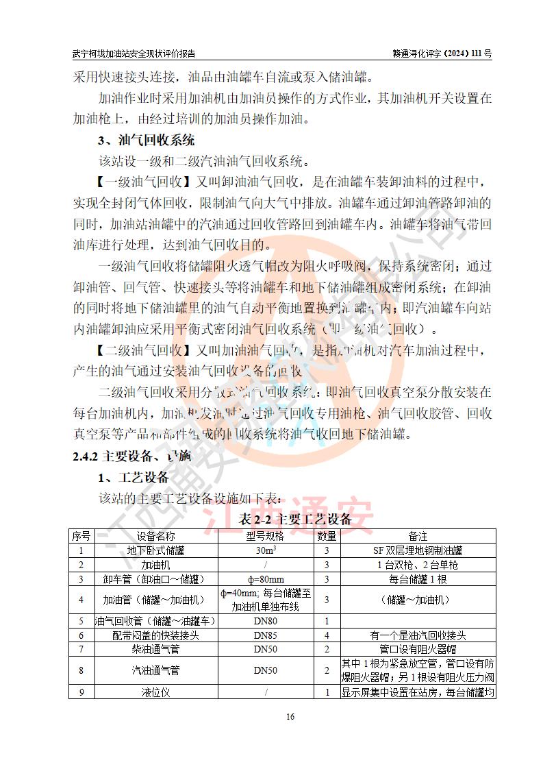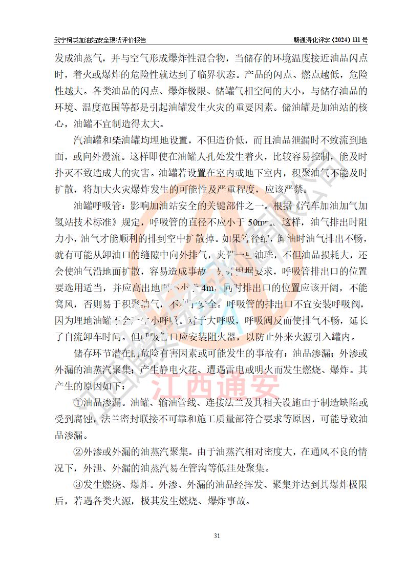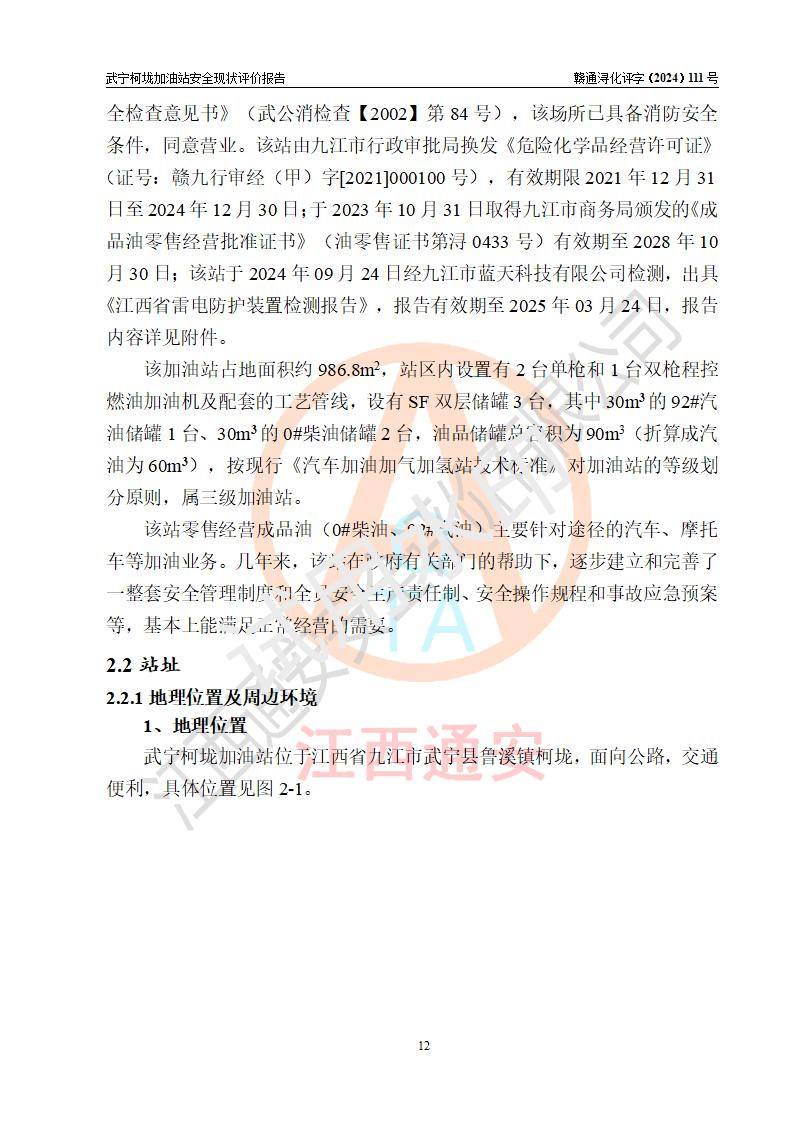 項(xiàng)目簡介 | 武寧柯垅加油站是一家專門從事成品油零售經(jīng)營的個體工商戶,經(jīng)營場所位于江西省九江市武寧縣魯溪鎮(zhèn)柯垅?,F(xiàn)有從業(yè)人員6名,其中安全管理人員1人,加油站負(fù)責(zé)人劉永輝。 該加油站占地面積約986.8m2,站區(qū)內(nèi)設(shè)置有2臺單槍和1臺雙槍程控燃油加油機(jī)及配套的工藝管線,設(shè)有SF雙層儲罐3臺,其中30m3的92#汽油儲罐1臺、30m3的0#柴油儲罐2臺,油品儲罐總?cè)莘e為90m3(折算成汽油為60m3),按現(xiàn)行《汽車加油加氣加氫站技術(shù)標(biāo)準(zhǔn)》對加油站的等級劃分原則,屬三級加油站。 該站由九江市行政審批局換發(fā)《危險化學(xué)品經(jīng)營許可證》(證號:贛九行審經(jīng)(甲)字[2021]000100號),**期限2021年12月31日至2024年12月30日。 | |||