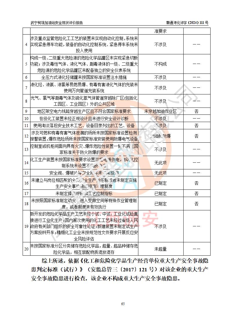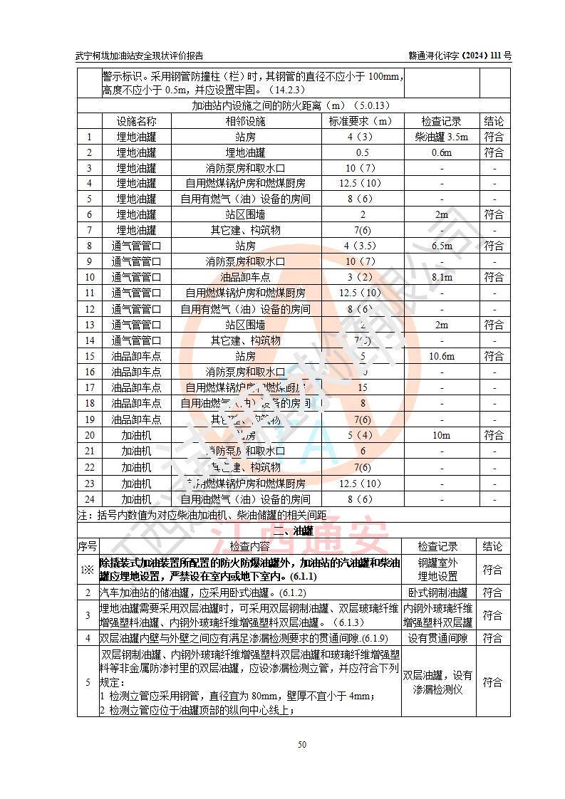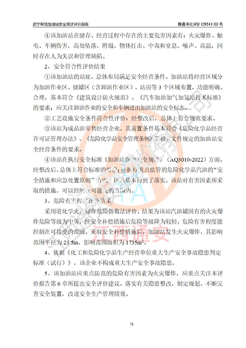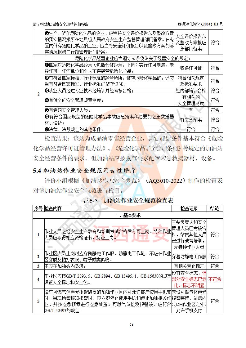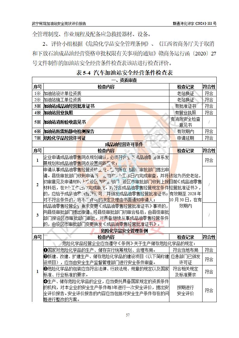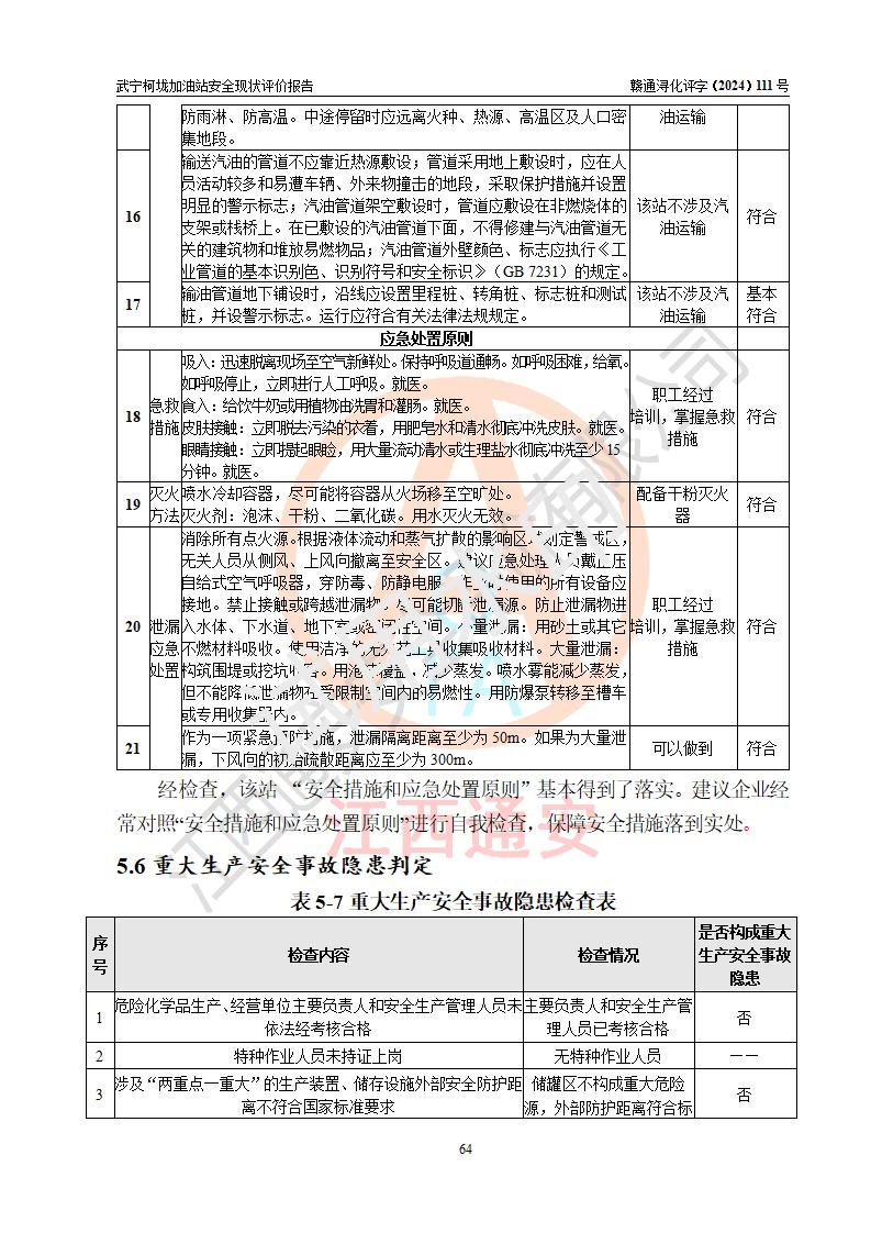 評價結(jié)論 | 武寧柯垅加油站涉及的安全條件、安全經(jīng)營條件、安全生產(chǎn)管理符合《危險化學(xué)品經(jīng)營許可證管理辦法》、《汽車加油加氣加氫站技術(shù)標(biāo)準(zhǔn)》等**有關(guān)法規(guī)、標(biāo)準(zhǔn)、規(guī)范要求,能滿足危險化學(xué)品經(jīng)營安全條件。 | |||