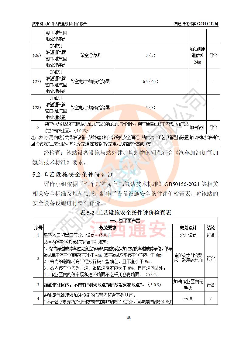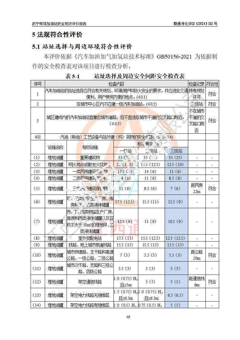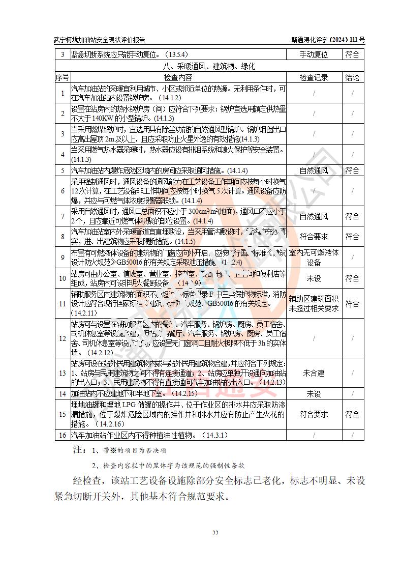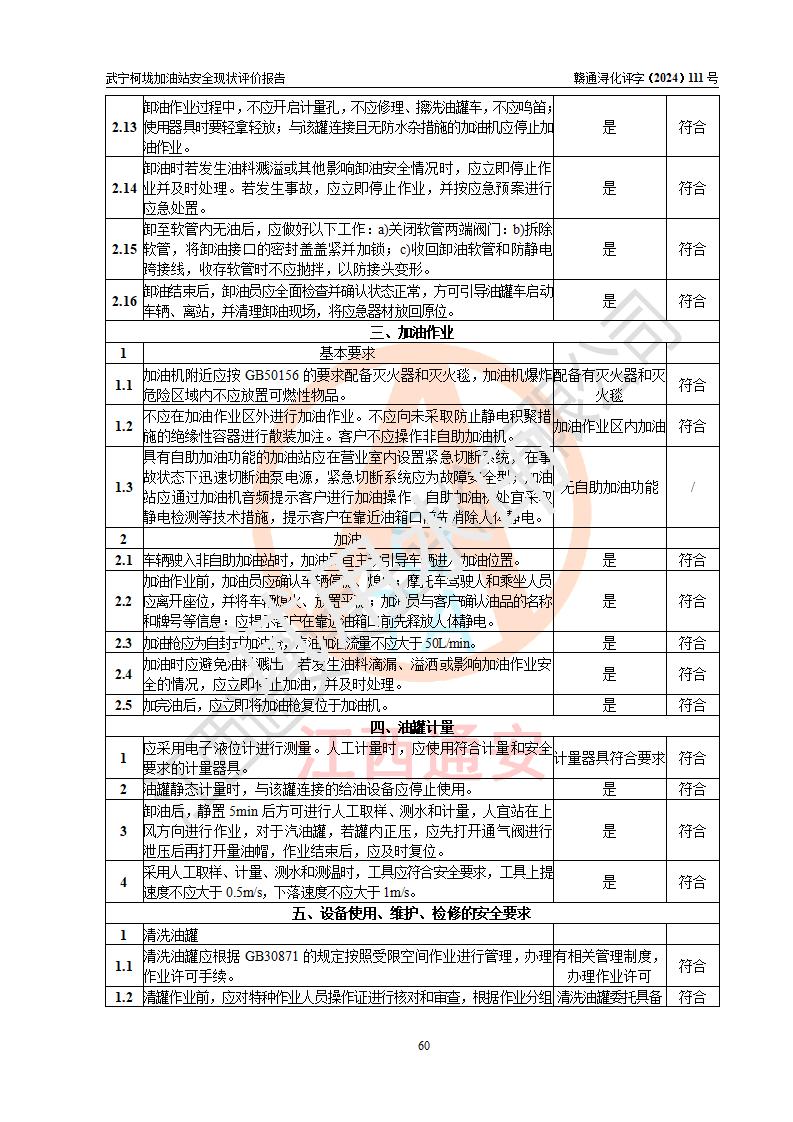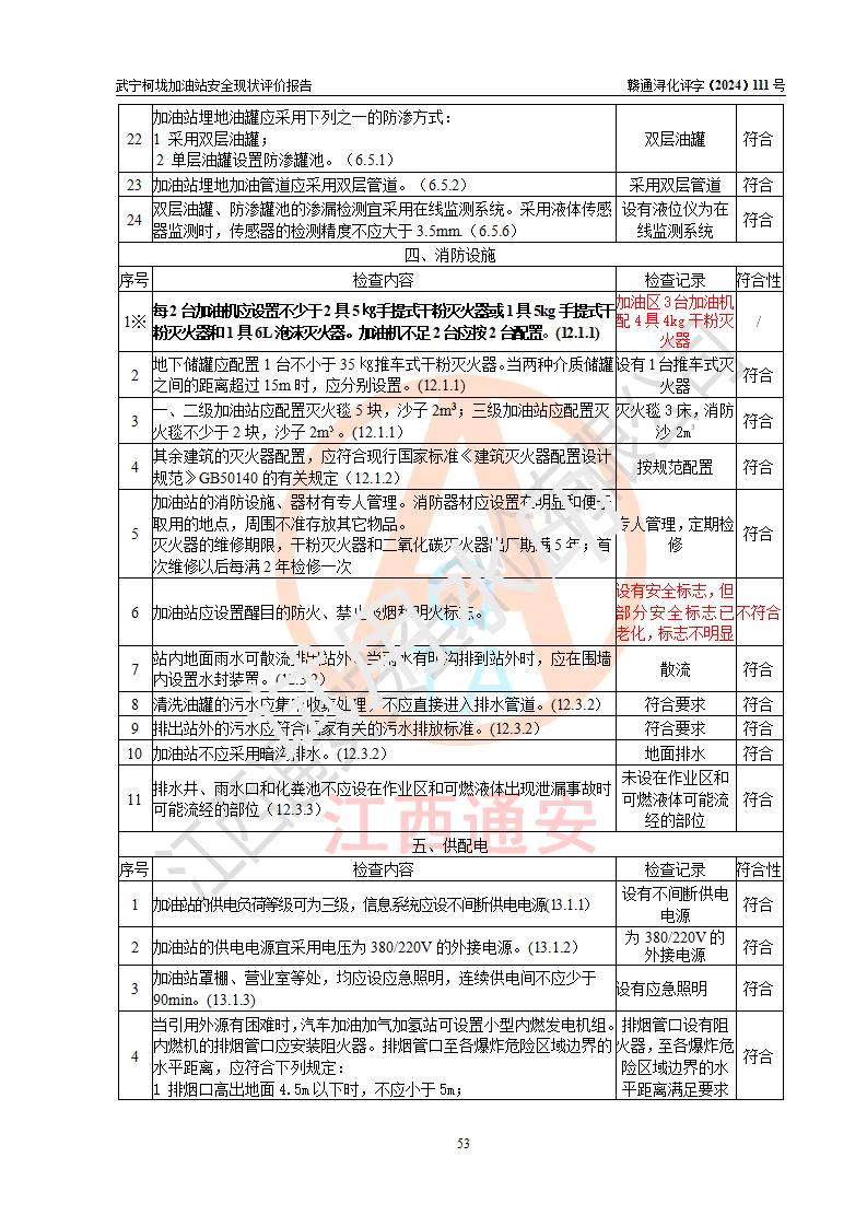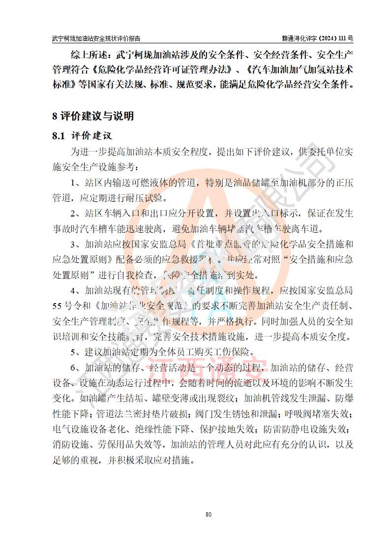 評價結(jié)論 | 武寧柯垅加油站涉及的安全條件、安全經(jīng)營條件、安全生產(chǎn)管理符合《危險化學(xué)品經(jīng)營許可證管理辦法》、《汽車加油加氣加氫站技術(shù)標(biāo)準(zhǔn)》等**有關(guān)法規(guī)、標(biāo)準(zhǔn)、規(guī)范要求,能滿足危險化學(xué)品經(jīng)營安全條件。 | |||