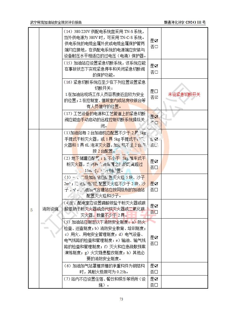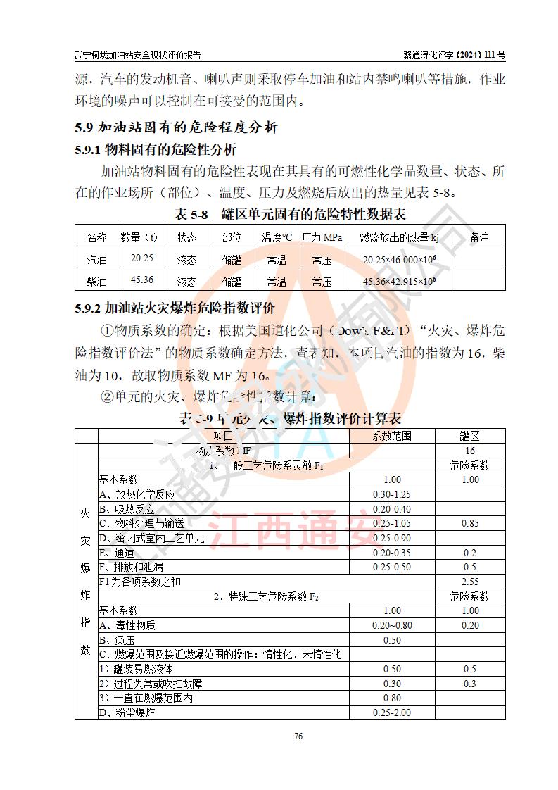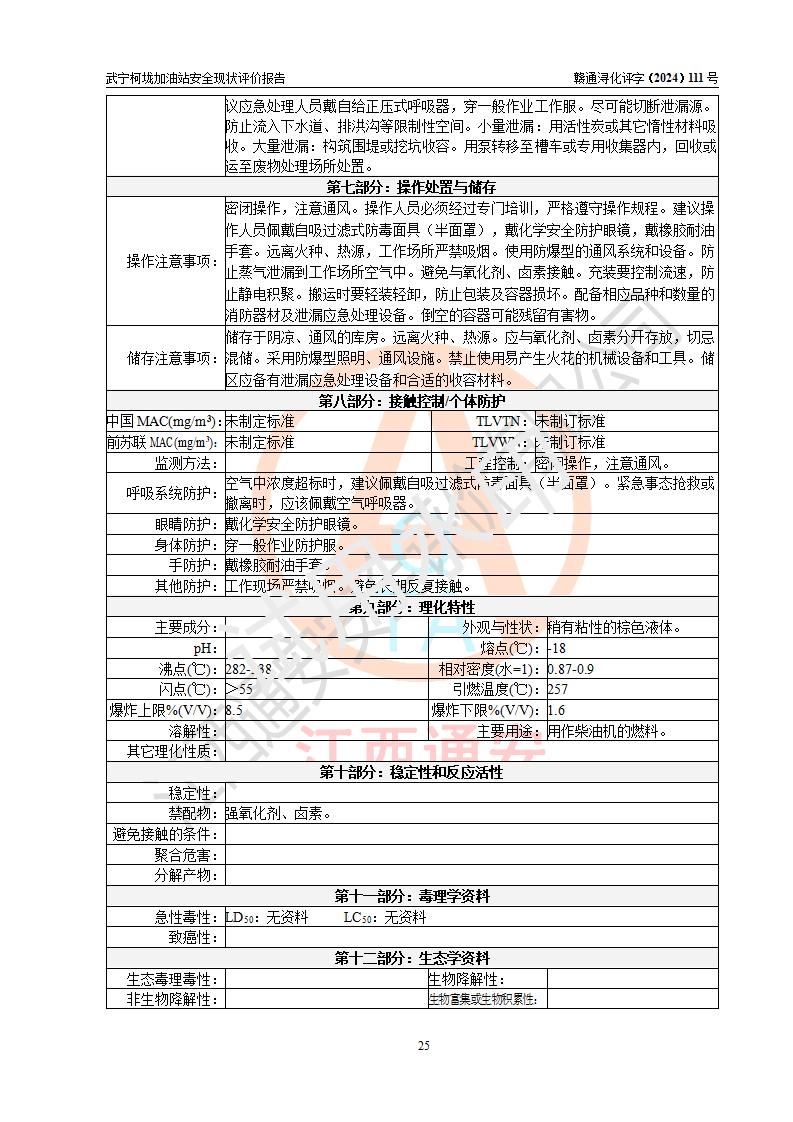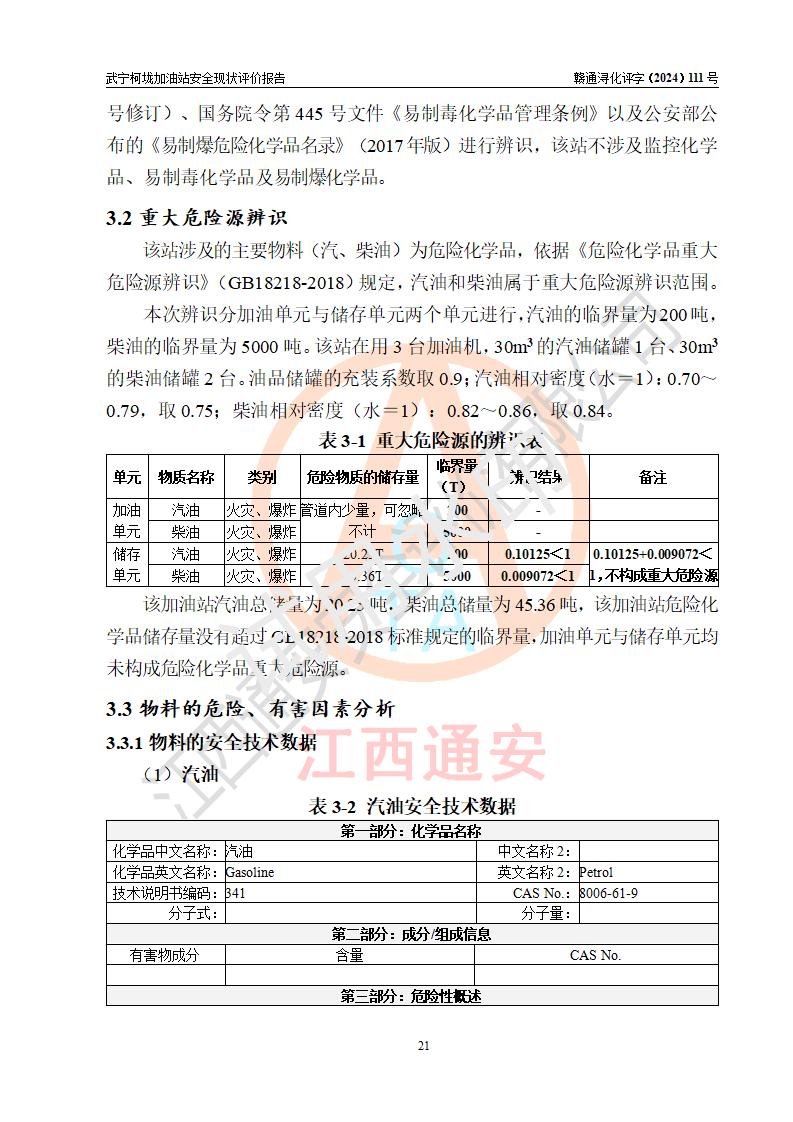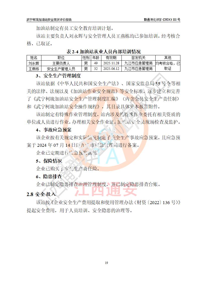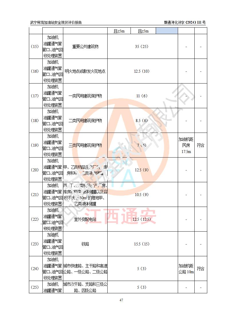 評價結(jié)論 | 武寧柯垅加油站涉及的安全條件、安全經(jīng)營條件、安全生產(chǎn)管理符合《危險化學(xué)品經(jīng)營許可證管理辦法》、《汽車加油加氣加氫站技術(shù)標(biāo)準(zhǔn)》等**有關(guān)法規(guī)、標(biāo)準(zhǔn)、規(guī)范要求,能滿足危險化學(xué)品經(jīng)營安全條件。 | |||
