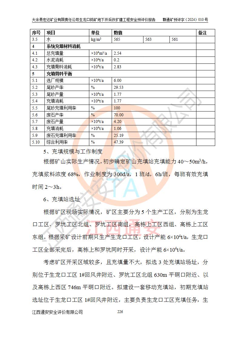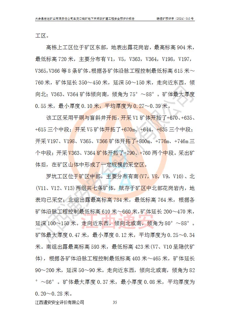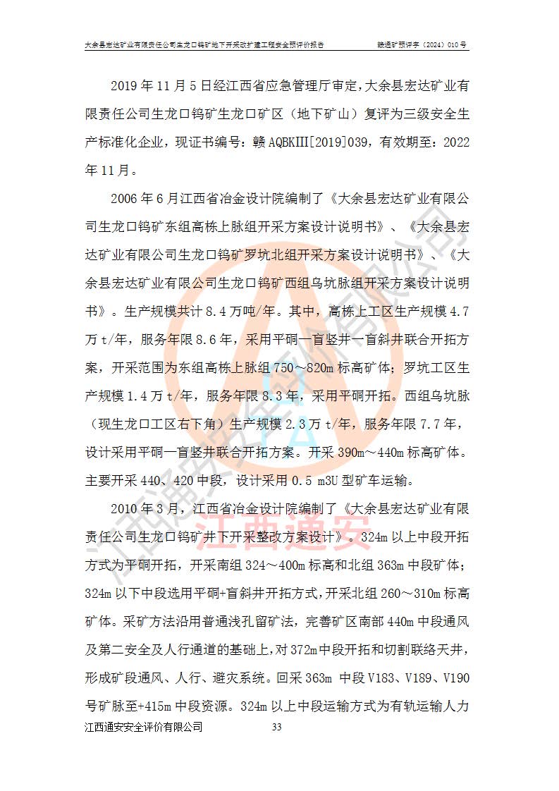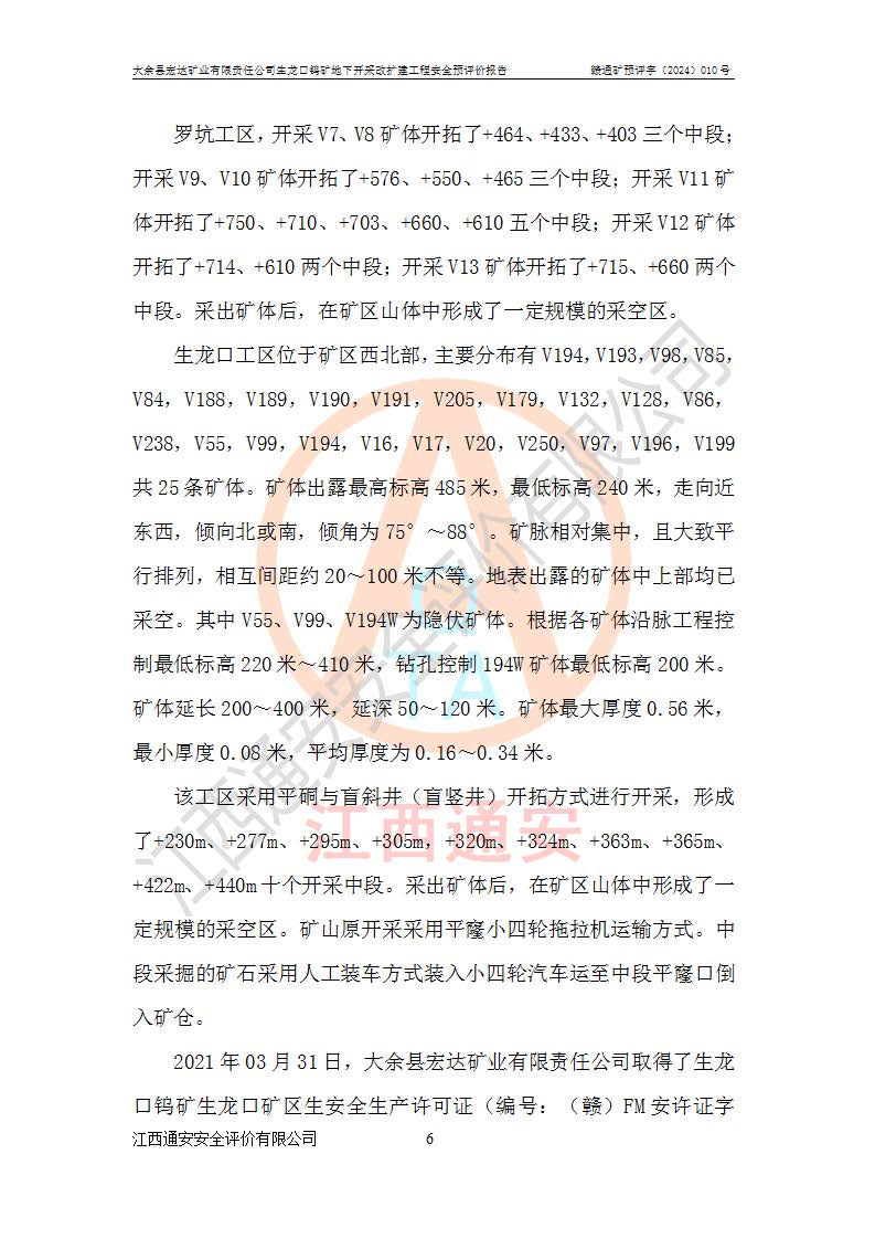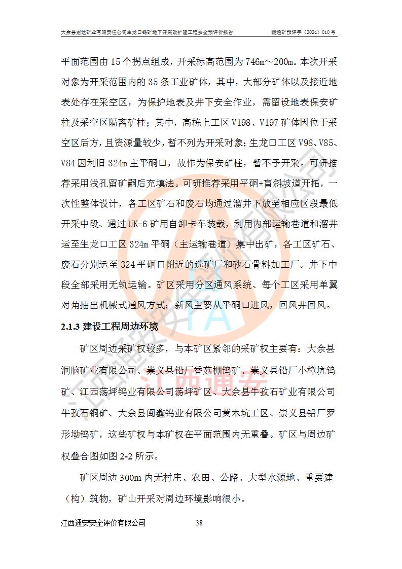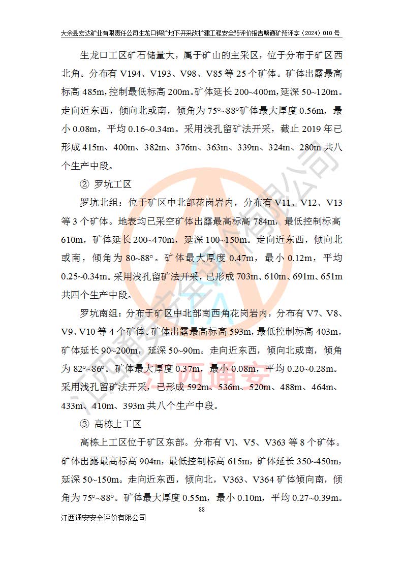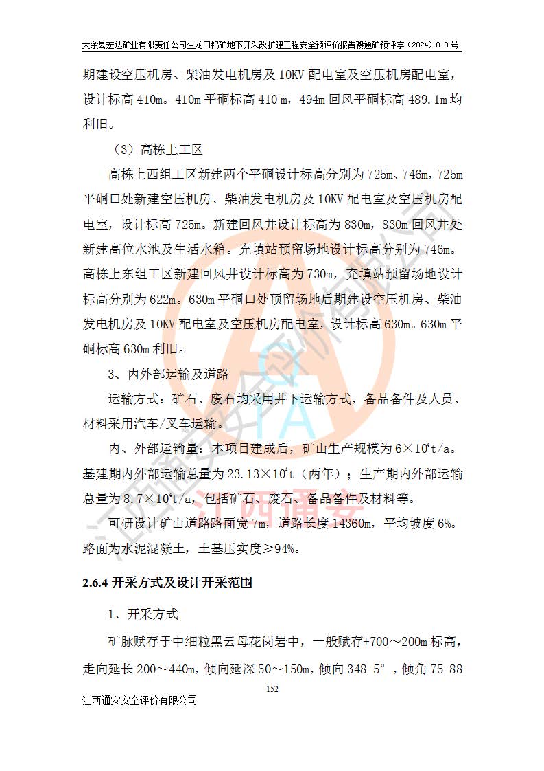 大余縣生龍口礦區(qū)鎢礦位于大余縣城北西 310°方位,距大余縣城直距 12 **,西接生龍口,北接蕩坪礦,南鄰黃木坑、西華山等礦區(qū),礦區(qū)正好是幾個(gè)礦區(qū)的銜接部位。隸屬大余縣浮江鄉(xiāng)管轄。其地理位置為:東經(jīng) 114°17′03″--114°20′11″;北緯 25°27′15″ --25 ° 28 ′ 10″ 。 礦 區(qū) 面 積 為5.97平方**。區(qū)內(nèi)交通較為方便,礦區(qū)東西兩側(cè)不遠(yuǎn)處均有公路通過(guò),西側(cè)為大余至崇義公路,東側(cè)為 大 余 至 蕩 坪 公路,通過(guò)這兩條公路均可向南與大余縣城與 323 國(guó)道相接,至贛州市區(qū)約100 **,往廣東省韶關(guān)贛韶高速約 150 **,向北達(dá)崇義縣城。 生龍口鎢礦建礦以前只有一些小規(guī)模的民采,2003年大余縣宏達(dá)礦業(yè)有限公司取得采礦權(quán),形成規(guī)模采礦,后期采礦證經(jīng)過(guò)多次延續(xù)與變更。生龍口鎢礦共設(shè)置了高棟上、羅坑、生龍口3個(gè)開(kāi)采工區(qū)。3個(gè)工區(qū)相距3**左右。 2024年9月江西晶楚工程技術(shù)有限公司編制完成了《大余縣宏達(dá)礦業(yè)有限責(zé)任公司生龍口鎢礦地下開(kāi)采改擴(kuò)建工程可行性研究報(bào)告》(以下簡(jiǎn)稱(chēng)《可研報(bào)告》)。2024年12月26日取得《江西省工業(yè)和信息化廳關(guān)于大余縣宏達(dá)礦業(yè)有限責(zé)任公司生龍口鎢礦地下開(kāi)采改擴(kuò)建工程核準(zhǔn)的批復(fù)》(贛工信有色〔2024〕49號(hào))。 根據(jù)《可研報(bào)告》,可研設(shè)計(jì)范圍為生龍口鎢礦礦區(qū)礦權(quán)范圍,平面范圍由15個(gè)拐點(diǎn)組成,開(kāi)采標(biāo)高范圍為746m~200m。本次開(kāi)采對(duì)象為開(kāi)采范圍內(nèi)的35條工業(yè)礦體,其中,大部分礦體以及接近地表處存在采空區(qū),為保護(hù)地表及井下安全作業(yè),需留設(shè)地表保安礦柱及采空區(qū)隔離礦柱;其中,高棟上工區(qū)V198、V197礦體因位于采空區(qū)后方,且資源量較少,暫不列為開(kāi)采對(duì)象;生龍口工區(qū)V98、V85、V84因利舊324m主平硐口,故作為保安礦柱,暫不予開(kāi)采??裳?*采用淺孔留礦嗣后充填法??裳?*采用平硐+盲斜坡道開(kāi)拓,一次性整體設(shè)計(jì),各工區(qū)礦石和廢石均通過(guò)溜井下放至相應(yīng)區(qū)段*低開(kāi)采中段、通過(guò)UK-6礦用自卸卡車(chē)裝載,利用內(nèi)部運(yùn)輸巷道和溜井運(yùn)至生龍口工區(qū)324m平硐(主運(yùn)輸巷道)集中出礦,各工區(qū)礦石、廢石分別運(yùn)至324平硐口附近的選礦廠和砂石骨料加工廠。井下中段**采用無(wú)軌運(yùn)輸。礦區(qū)采用分區(qū)通風(fēng)系統(tǒng)、每個(gè)工區(qū)采用單翼對(duì)角抽出機(jī)械式通風(fēng)方式;新風(fēng)主要從平硐口進(jìn)風(fēng),回風(fēng)井回風(fēng)。 本項(xiàng)目已經(jīng)符合編制安全預(yù)評(píng)價(jià)的前置條件,根據(jù)《中華人民共和國(guó)安全生產(chǎn)法》、《建設(shè)項(xiàng)目安全設(shè)施“三同時(shí)”監(jiān)督管理辦法》(**安全生產(chǎn)監(jiān)督管理局令第36號(hào))、《金屬非金屬礦山建設(shè)項(xiàng)目安全設(shè)施目錄》(**安全生產(chǎn)監(jiān)督管理總局令第75號(hào))和《**礦山安全監(jiān)察局關(guān)于進(jìn)一步加強(qiáng)非煤礦山安全生產(chǎn)行政許可工作的通知》(礦安〔2024〕70號(hào))的規(guī)定,大余縣宏達(dá)礦業(yè)有限責(zé)任公司2024年10月8日委托江西通安安全評(píng)價(jià)有限公司對(duì)其生龍口鎢礦地下開(kāi)采改擴(kuò)建工程進(jìn)行安全預(yù)評(píng)價(jià)。 |