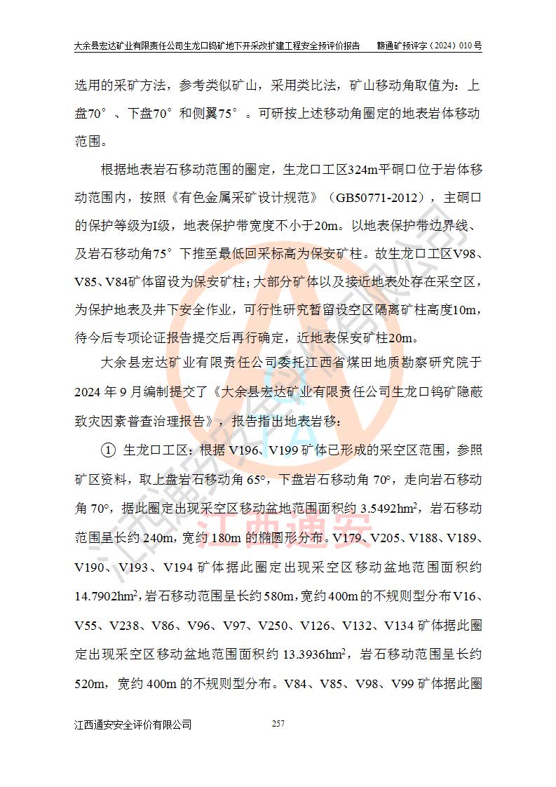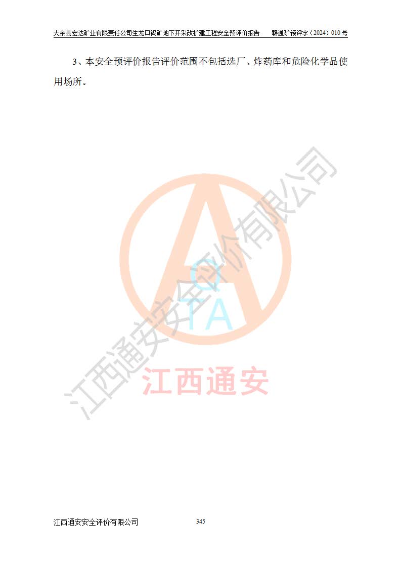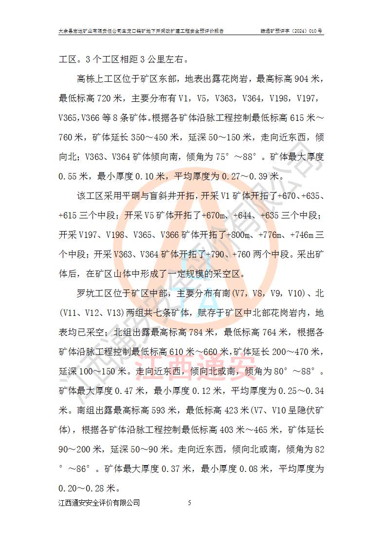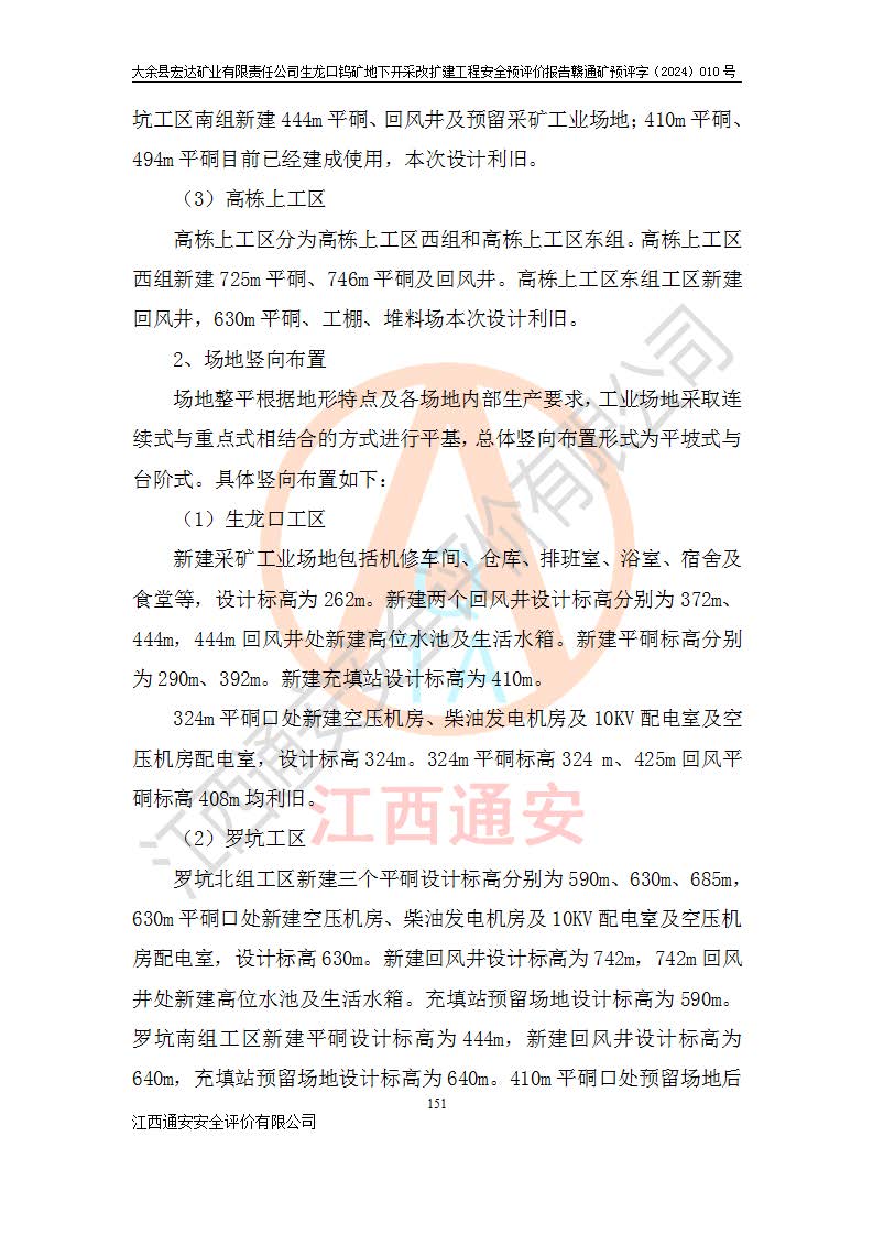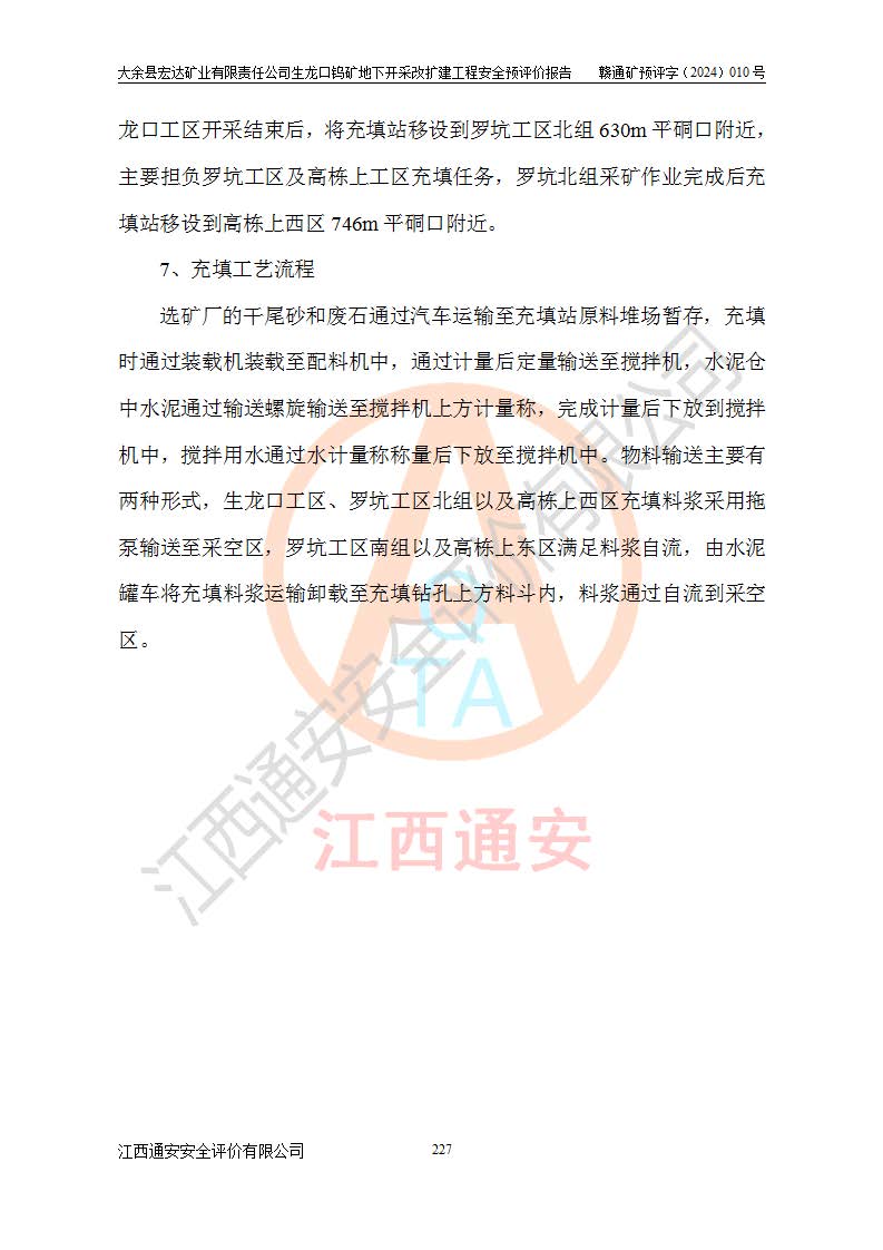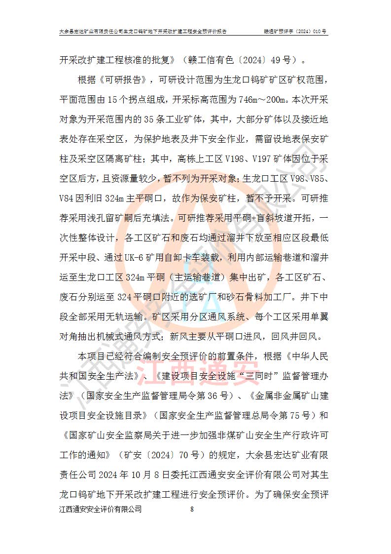 大余縣生龍口礦區(qū)鎢礦位于大余縣城北西 310°方位,距大余縣城直距 12 **,西接生龍口,北接蕩坪礦,南鄰黃木坑、西華山等礦區(qū),礦區(qū)正好是幾個(gè)礦區(qū)的銜接部位。隸屬大余縣浮江鄉(xiāng)管轄。其地理位置為:東經(jīng) 114°17′03″--114°20′11″;北緯 25°27′15″ --25 ° 28 ′ 10″ 。 礦 區(qū) 面 積 為5.97平方**。區(qū)內(nèi)交通較為方便,礦區(qū)東西兩側(cè)不遠(yuǎn)處均有公路通過(guò),西側(cè)為大余至崇義公路,東側(cè)為 大 余 至 蕩 坪 公路,通過(guò)這兩條公路均可向南與大余縣城與 323 國(guó)道相接,至贛州市區(qū)約100 **,往廣東省韶關(guān)贛韶高速約 150 **,向北達(dá)崇義縣城。 生龍口鎢礦建礦以前只有一些小規(guī)模的民采,2003年大余縣宏達(dá)礦業(yè)有限公司取得采礦權(quán),形成規(guī)模采礦,后期采礦證經(jīng)過(guò)多次延續(xù)與變更。生龍口鎢礦共設(shè)置了高棟上、羅坑、生龍口3個(gè)開(kāi)采工區(qū)。3個(gè)工區(qū)相距3**左右。 2024年9月江西晶楚工程技術(shù)有限公司編制完成了《大余縣宏達(dá)礦業(yè)有限責(zé)任公司生龍口鎢礦地下開(kāi)采改擴(kuò)建工程可行性研究報(bào)告》(以下簡(jiǎn)稱(chēng)《可研報(bào)告》)。2024年12月26日取得《江西省工業(yè)和信息化廳關(guān)于大余縣宏達(dá)礦業(yè)有限責(zé)任公司生龍口鎢礦地下開(kāi)采改擴(kuò)建工程核準(zhǔn)的批復(fù)》(贛工信有色〔2024〕49號(hào))。 根據(jù)《可研報(bào)告》,可研設(shè)計(jì)范圍為生龍口鎢礦礦區(qū)礦權(quán)范圍,平面范圍由15個(gè)拐點(diǎn)組成,開(kāi)采標(biāo)高范圍為746m~200m。本次開(kāi)采對(duì)象為開(kāi)采范圍內(nèi)的35條工業(yè)礦體,其中,大部分礦體以及接近地表處存在采空區(qū),為保護(hù)地表及井下安全作業(yè),需留設(shè)地表保安礦柱及采空區(qū)隔離礦柱;其中,高棟上工區(qū)V198、V197礦體因位于采空區(qū)后方,且資源量較少,暫不列為開(kāi)采對(duì)象;生龍口工區(qū)V98、V85、V84因利舊324m主平硐口,故作為保安礦柱,暫不予開(kāi)采??裳?*采用淺孔留礦嗣后充填法??裳?*采用平硐+盲斜坡道開(kāi)拓,一次性整體設(shè)計(jì),各工區(qū)礦石和廢石均通過(guò)溜井下放至相應(yīng)區(qū)段*低開(kāi)采中段、通過(guò)UK-6礦用自卸卡車(chē)裝載,利用內(nèi)部運(yùn)輸巷道和溜井運(yùn)至生龍口工區(qū)324m平硐(主運(yùn)輸巷道)集中出礦,各工區(qū)礦石、廢石分別運(yùn)至324平硐口附近的選礦廠和砂石骨料加工廠。井下中段**采用無(wú)軌運(yùn)輸。礦區(qū)采用分區(qū)通風(fēng)系統(tǒng)、每個(gè)工區(qū)采用單翼對(duì)角抽出機(jī)械式通風(fēng)方式;新風(fēng)主要從平硐口進(jìn)風(fēng),回風(fēng)井回風(fēng)。 本項(xiàng)目已經(jīng)符合編制安全預(yù)評(píng)價(jià)的前置條件,根據(jù)《中華人民共和國(guó)安全生產(chǎn)法》、《建設(shè)項(xiàng)目安全設(shè)施“三同時(shí)”監(jiān)督管理辦法》(**安全生產(chǎn)監(jiān)督管理局令第36號(hào))、《金屬非金屬礦山建設(shè)項(xiàng)目安全設(shè)施目錄》(**安全生產(chǎn)監(jiān)督管理總局令第75號(hào))和《**礦山安全監(jiān)察局關(guān)于進(jìn)一步加強(qiáng)非煤礦山安全生產(chǎn)行政許可工作的通知》(礦安〔2024〕70號(hào))的規(guī)定,大余縣宏達(dá)礦業(yè)有限責(zé)任公司2024年10月8日委托江西通安安全評(píng)價(jià)有限公司對(duì)其生龍口鎢礦地下開(kāi)采改擴(kuò)建工程進(jìn)行安全預(yù)評(píng)價(jià)。 |