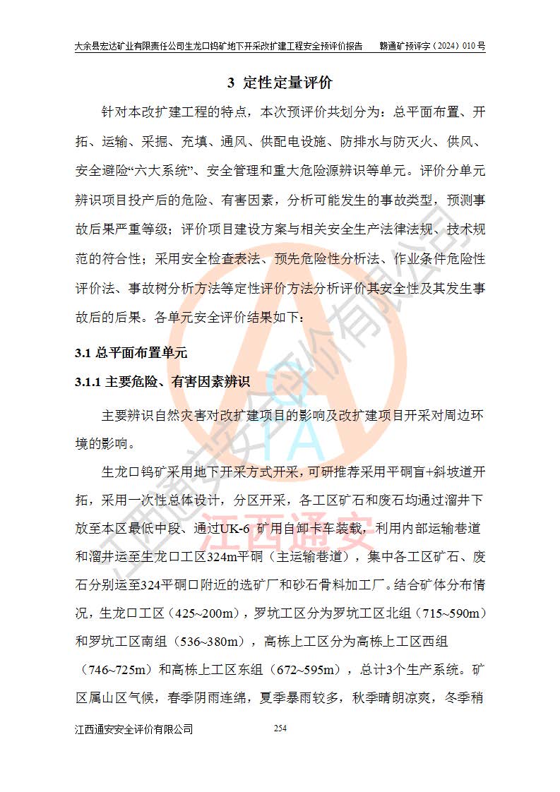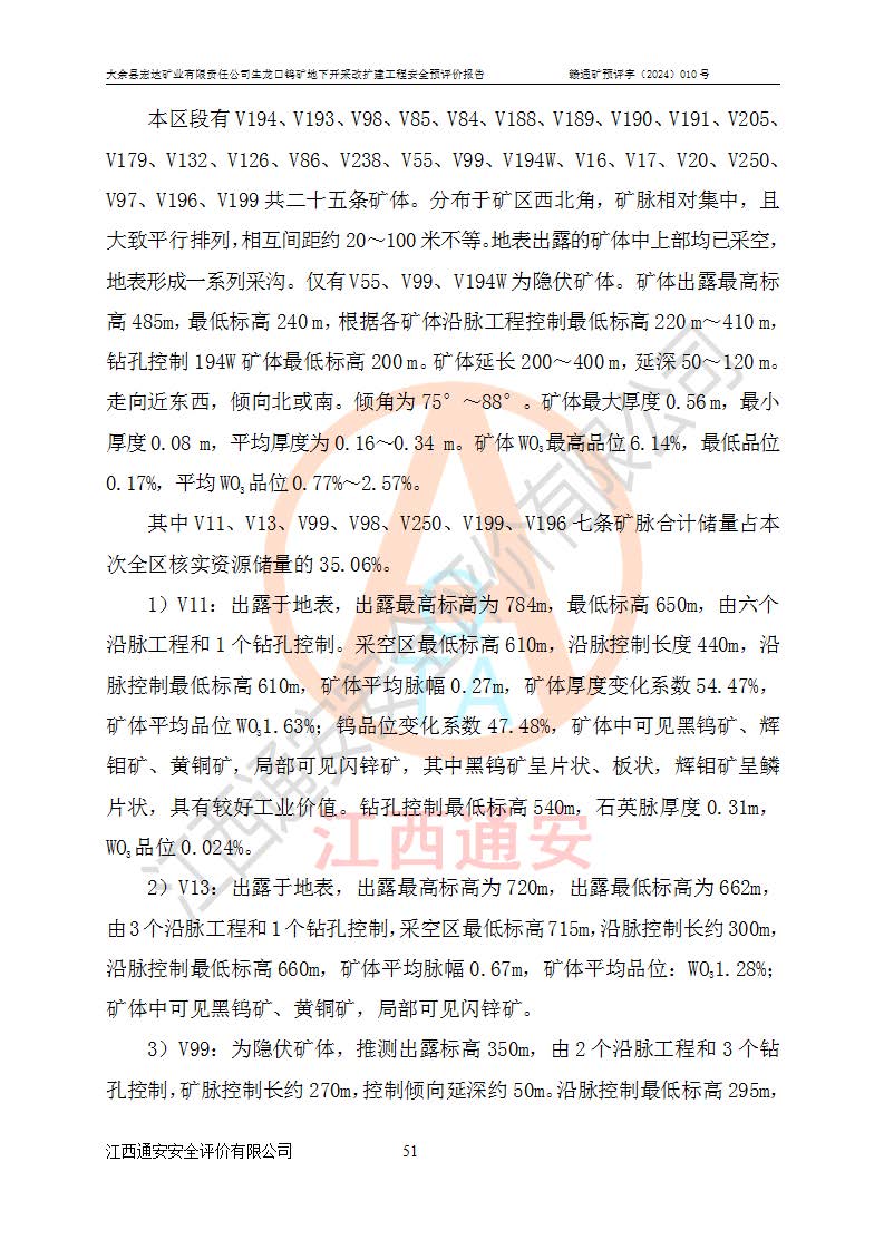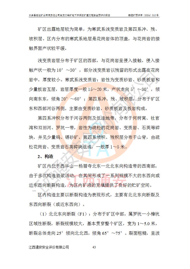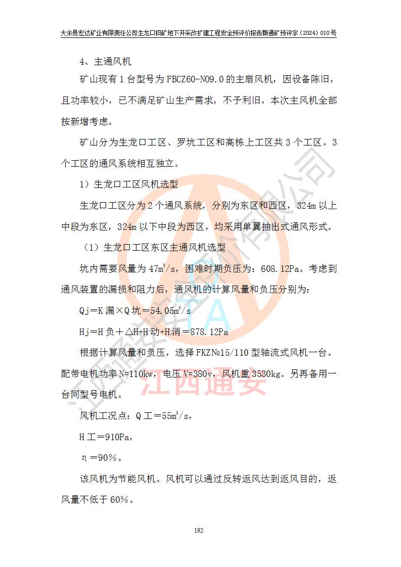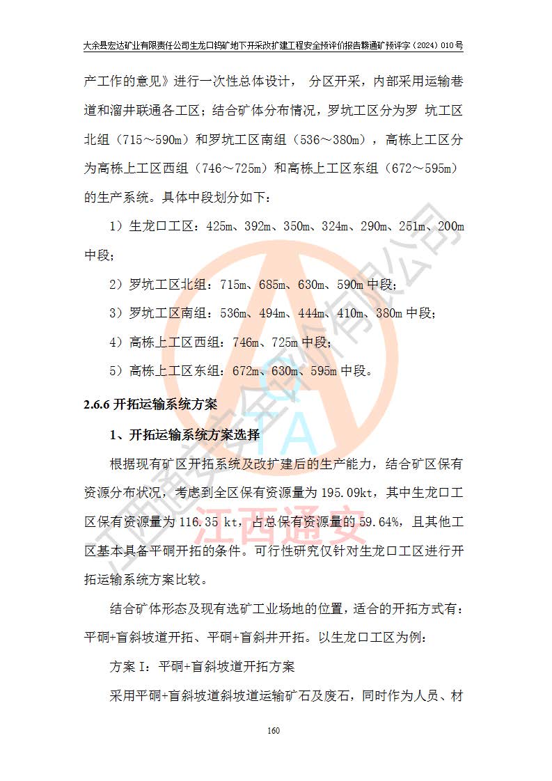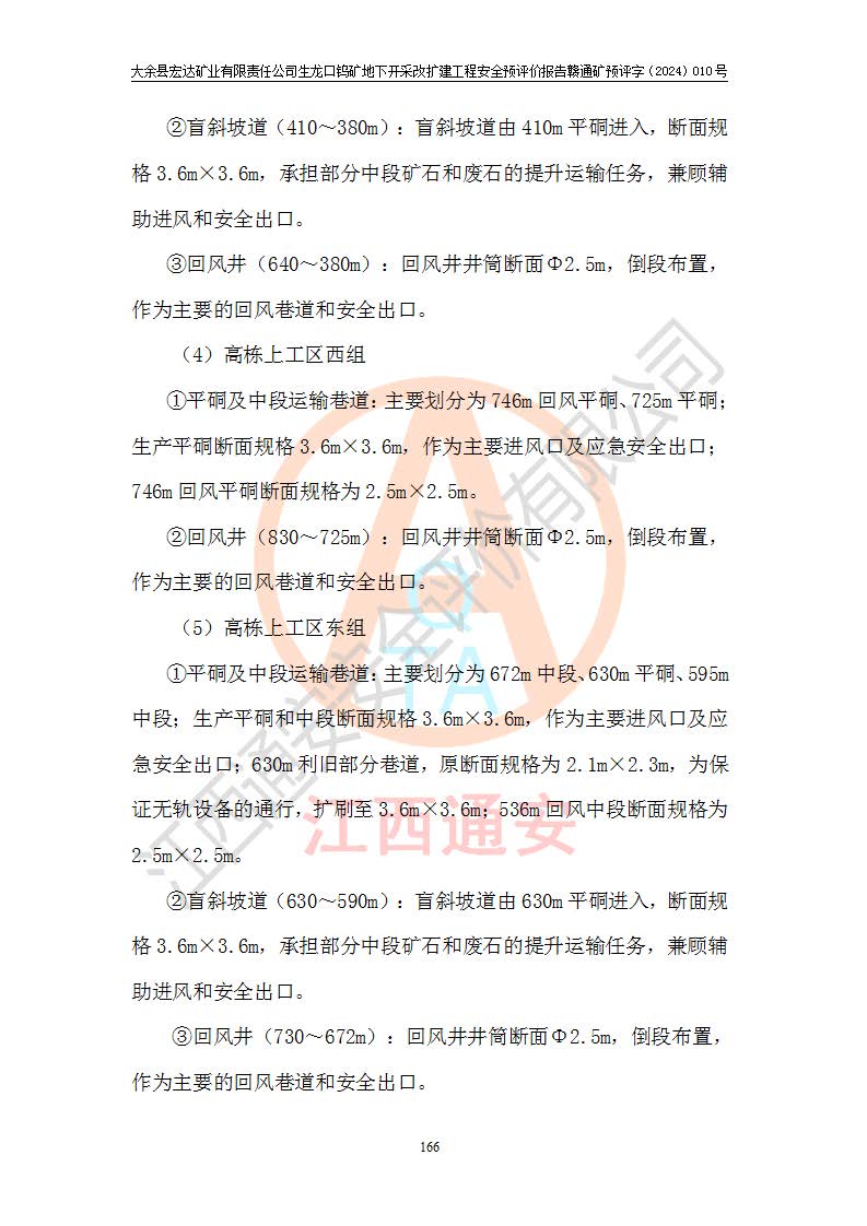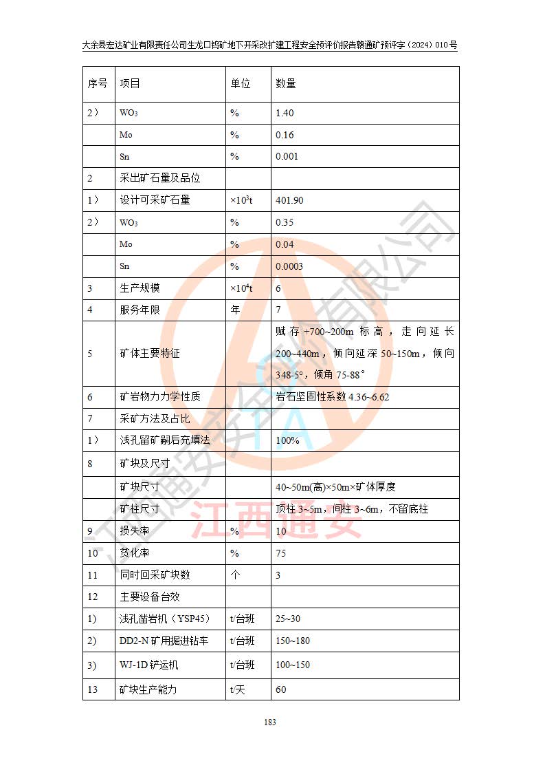 大余縣生龍口礦區(qū)鎢礦位于大余縣城北西 310°方位,距大余縣城直距 12 **,西接生龍口,北接蕩坪礦,南鄰黃木坑、西華山等礦區(qū),礦區(qū)正好是幾個(gè)礦區(qū)的銜接部位。隸屬大余縣浮江鄉(xiāng)管轄。其地理位置為:東經(jīng) 114°17′03″--114°20′11″;北緯 25°27′15″ --25 ° 28 ′ 10″ 。 礦 區(qū) 面 積 為5.97平方**。區(qū)內(nèi)交通較為方便,礦區(qū)東西兩側(cè)不遠(yuǎn)處均有公路通過(guò),西側(cè)為大余至崇義公路,東側(cè)為 大 余 至 蕩 坪 公路,通過(guò)這兩條公路均可向南與大余縣城與 323 國(guó)道相接,至贛州市區(qū)約100 **,往廣東省韶關(guān)贛韶高速約 150 **,向北達(dá)崇義縣城。 生龍口鎢礦建礦以前只有一些小規(guī)模的民采,2003年大余縣宏達(dá)礦業(yè)有限公司取得采礦權(quán),形成規(guī)模采礦,后期采礦證經(jīng)過(guò)多次延續(xù)與變更。生龍口鎢礦共設(shè)置了高棟上、羅坑、生龍口3個(gè)開(kāi)采工區(qū)。3個(gè)工區(qū)相距3**左右。 2024年9月江西晶楚工程技術(shù)有限公司編制完成了《大余縣宏達(dá)礦業(yè)有限責(zé)任公司生龍口鎢礦地下開(kāi)采改擴(kuò)建工程可行性研究報(bào)告》(以下簡(jiǎn)稱(chēng)《可研報(bào)告》)。2024年12月26日取得《江西省工業(yè)和信息化廳關(guān)于大余縣宏達(dá)礦業(yè)有限責(zé)任公司生龍口鎢礦地下開(kāi)采改擴(kuò)建工程核準(zhǔn)的批復(fù)》(贛工信有色〔2024〕49號(hào))。 根據(jù)《可研報(bào)告》,可研設(shè)計(jì)范圍為生龍口鎢礦礦區(qū)礦權(quán)范圍,平面范圍由15個(gè)拐點(diǎn)組成,開(kāi)采標(biāo)高范圍為746m~200m。本次開(kāi)采對(duì)象為開(kāi)采范圍內(nèi)的35條工業(yè)礦體,其中,大部分礦體以及接近地表處存在采空區(qū),為保護(hù)地表及井下安全作業(yè),需留設(shè)地表保安礦柱及采空區(qū)隔離礦柱;其中,高棟上工區(qū)V198、V197礦體因位于采空區(qū)后方,且資源量較少,暫不列為開(kāi)采對(duì)象;生龍口工區(qū)V98、V85、V84因利舊324m主平硐口,故作為保安礦柱,暫不予開(kāi)采??裳?*采用淺孔留礦嗣后充填法??裳?*采用平硐+盲斜坡道開(kāi)拓,一次性整體設(shè)計(jì),各工區(qū)礦石和廢石均通過(guò)溜井下放至相應(yīng)區(qū)段*低開(kāi)采中段、通過(guò)UK-6礦用自卸卡車(chē)裝載,利用內(nèi)部運(yùn)輸巷道和溜井運(yùn)至生龍口工區(qū)324m平硐(主運(yùn)輸巷道)集中出礦,各工區(qū)礦石、廢石分別運(yùn)至324平硐口附近的選礦廠和砂石骨料加工廠。井下中段**采用無(wú)軌運(yùn)輸。礦區(qū)采用分區(qū)通風(fēng)系統(tǒng)、每個(gè)工區(qū)采用單翼對(duì)角抽出機(jī)械式通風(fēng)方式;新風(fēng)主要從平硐口進(jìn)風(fēng),回風(fēng)井回風(fēng)。 本項(xiàng)目已經(jīng)符合編制安全預(yù)評(píng)價(jià)的前置條件,根據(jù)《中華人民共和國(guó)安全生產(chǎn)法》、《建設(shè)項(xiàng)目安全設(shè)施“三同時(shí)”監(jiān)督管理辦法》(**安全生產(chǎn)監(jiān)督管理局令第36號(hào))、《金屬非金屬礦山建設(shè)項(xiàng)目安全設(shè)施目錄》(**安全生產(chǎn)監(jiān)督管理總局令第75號(hào))和《**礦山安全監(jiān)察局關(guān)于進(jìn)一步加強(qiáng)非煤礦山安全生產(chǎn)行政許可工作的通知》(礦安〔2024〕70號(hào))的規(guī)定,大余縣宏達(dá)礦業(yè)有限責(zé)任公司2024年10月8日委托江西通安安全評(píng)價(jià)有限公司對(duì)其生龍口鎢礦地下開(kāi)采改擴(kuò)建工程進(jìn)行安全預(yù)評(píng)價(jià)。 |