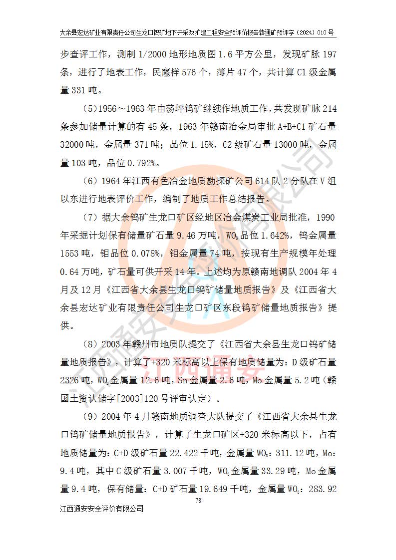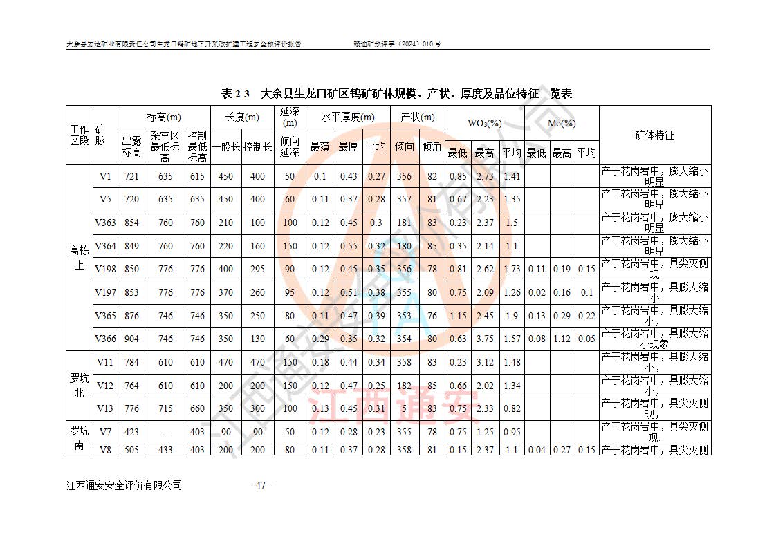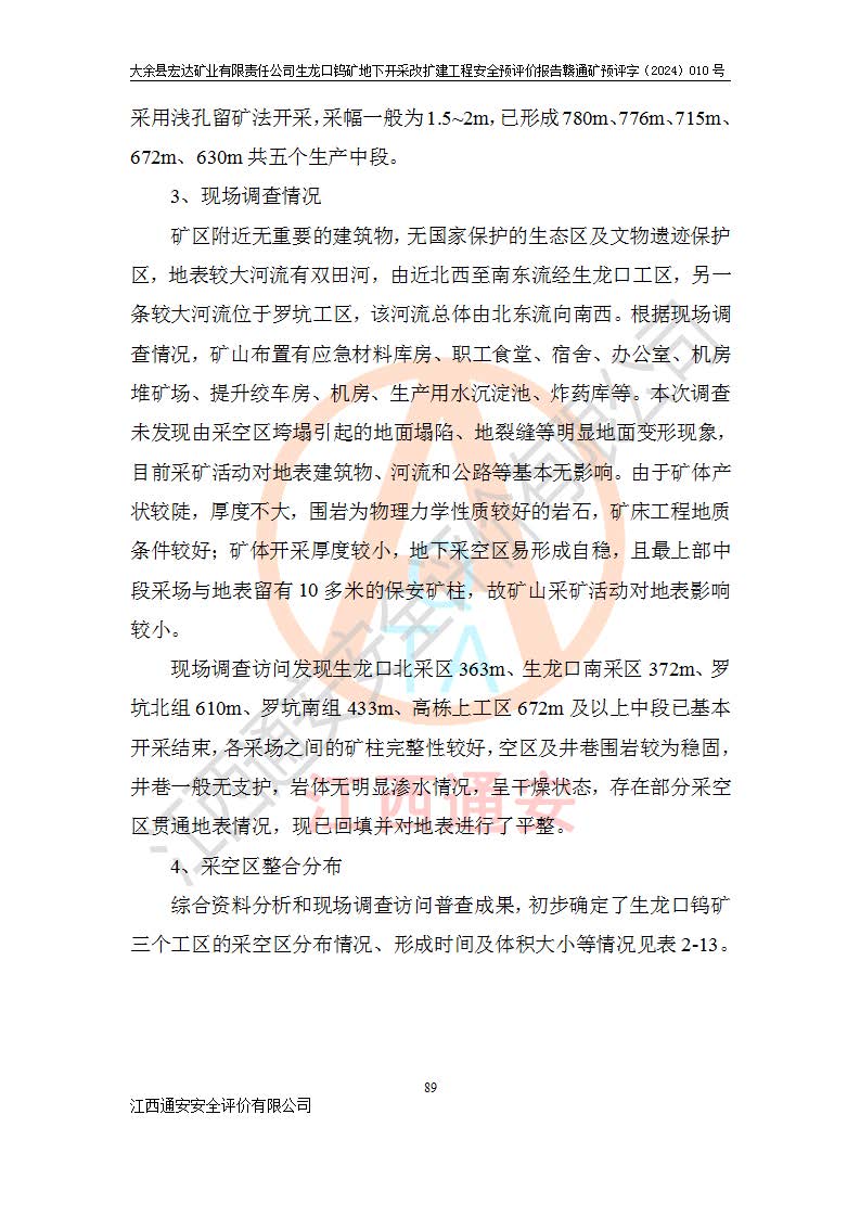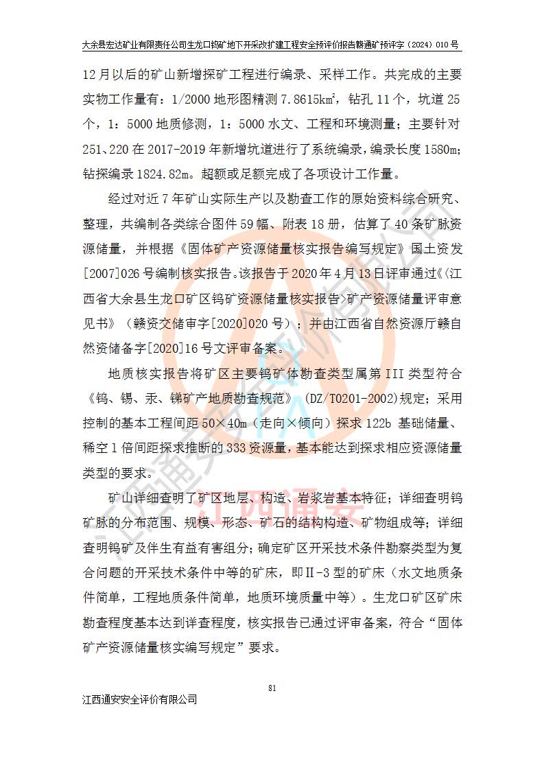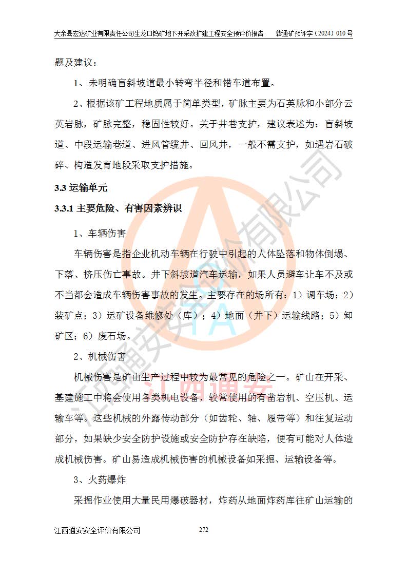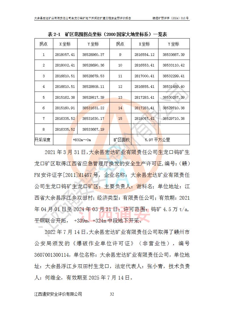 大余縣生龍口礦區(qū)鎢礦位于大余縣城北西 310°方位,距大余縣城直距 12 **,西接生龍口,北接蕩坪礦,南鄰黃木坑、西華山等礦區(qū),礦區(qū)正好是幾個(gè)礦區(qū)的銜接部位。隸屬大余縣浮江鄉(xiāng)管轄。其地理位置為:東經(jīng) 114°17′03″--114°20′11″;北緯 25°27′15″ --25 ° 28 ′ 10″ 。 礦 區(qū) 面 積 為5.97平方**。區(qū)內(nèi)交通較為方便,礦區(qū)東西兩側(cè)不遠(yuǎn)處均有公路通過(guò),西側(cè)為大余至崇義公路,東側(cè)為 大 余 至 蕩 坪 公路,通過(guò)這兩條公路均可向南與大余縣城與 323 國(guó)道相接,至贛州市區(qū)約100 **,往廣東省韶關(guān)贛韶高速約 150 **,向北達(dá)崇義縣城。 生龍口鎢礦建礦以前只有一些小規(guī)模的民采,2003年大余縣宏達(dá)礦業(yè)有限公司取得采礦權(quán),形成規(guī)模采礦,后期采礦證經(jīng)過(guò)多次延續(xù)與變更。生龍口鎢礦共設(shè)置了高棟上、羅坑、生龍口3個(gè)開(kāi)采工區(qū)。3個(gè)工區(qū)相距3**左右。 2024年9月江西晶楚工程技術(shù)有限公司編制完成了《大余縣宏達(dá)礦業(yè)有限責(zé)任公司生龍口鎢礦地下開(kāi)采改擴(kuò)建工程可行性研究報(bào)告》(以下簡(jiǎn)稱(chēng)《可研報(bào)告》)。2024年12月26日取得《江西省工業(yè)和信息化廳關(guān)于大余縣宏達(dá)礦業(yè)有限責(zé)任公司生龍口鎢礦地下開(kāi)采改擴(kuò)建工程核準(zhǔn)的批復(fù)》(贛工信有色〔2024〕49號(hào))。 根據(jù)《可研報(bào)告》,可研設(shè)計(jì)范圍為生龍口鎢礦礦區(qū)礦權(quán)范圍,平面范圍由15個(gè)拐點(diǎn)組成,開(kāi)采標(biāo)高范圍為746m~200m。本次開(kāi)采對(duì)象為開(kāi)采范圍內(nèi)的35條工業(yè)礦體,其中,大部分礦體以及接近地表處存在采空區(qū),為保護(hù)地表及井下安全作業(yè),需留設(shè)地表保安礦柱及采空區(qū)隔離礦柱;其中,高棟上工區(qū)V198、V197礦體因位于采空區(qū)后方,且資源量較少,暫不列為開(kāi)采對(duì)象;生龍口工區(qū)V98、V85、V84因利舊324m主平硐口,故作為保安礦柱,暫不予開(kāi)采??裳?*采用淺孔留礦嗣后充填法??裳?*采用平硐+盲斜坡道開(kāi)拓,一次性整體設(shè)計(jì),各工區(qū)礦石和廢石均通過(guò)溜井下放至相應(yīng)區(qū)段*低開(kāi)采中段、通過(guò)UK-6礦用自卸卡車(chē)裝載,利用內(nèi)部運(yùn)輸巷道和溜井運(yùn)至生龍口工區(qū)324m平硐(主運(yùn)輸巷道)集中出礦,各工區(qū)礦石、廢石分別運(yùn)至324平硐口附近的選礦廠和砂石骨料加工廠。井下中段**采用無(wú)軌運(yùn)輸。礦區(qū)采用分區(qū)通風(fēng)系統(tǒng)、每個(gè)工區(qū)采用單翼對(duì)角抽出機(jī)械式通風(fēng)方式;新風(fēng)主要從平硐口進(jìn)風(fēng),回風(fēng)井回風(fēng)。 本項(xiàng)目已經(jīng)符合編制安全預(yù)評(píng)價(jià)的前置條件,根據(jù)《中華人民共和國(guó)安全生產(chǎn)法》、《建設(shè)項(xiàng)目安全設(shè)施“三同時(shí)”監(jiān)督管理辦法》(**安全生產(chǎn)監(jiān)督管理局令第36號(hào))、《金屬非金屬礦山建設(shè)項(xiàng)目安全設(shè)施目錄》(**安全生產(chǎn)監(jiān)督管理總局令第75號(hào))和《**礦山安全監(jiān)察局關(guān)于進(jìn)一步加強(qiáng)非煤礦山安全生產(chǎn)行政許可工作的通知》(礦安〔2024〕70號(hào))的規(guī)定,大余縣宏達(dá)礦業(yè)有限責(zé)任公司2024年10月8日委托江西通安安全評(píng)價(jià)有限公司對(duì)其生龍口鎢礦地下開(kāi)采改擴(kuò)建工程進(jìn)行安全預(yù)評(píng)價(jià)。 |