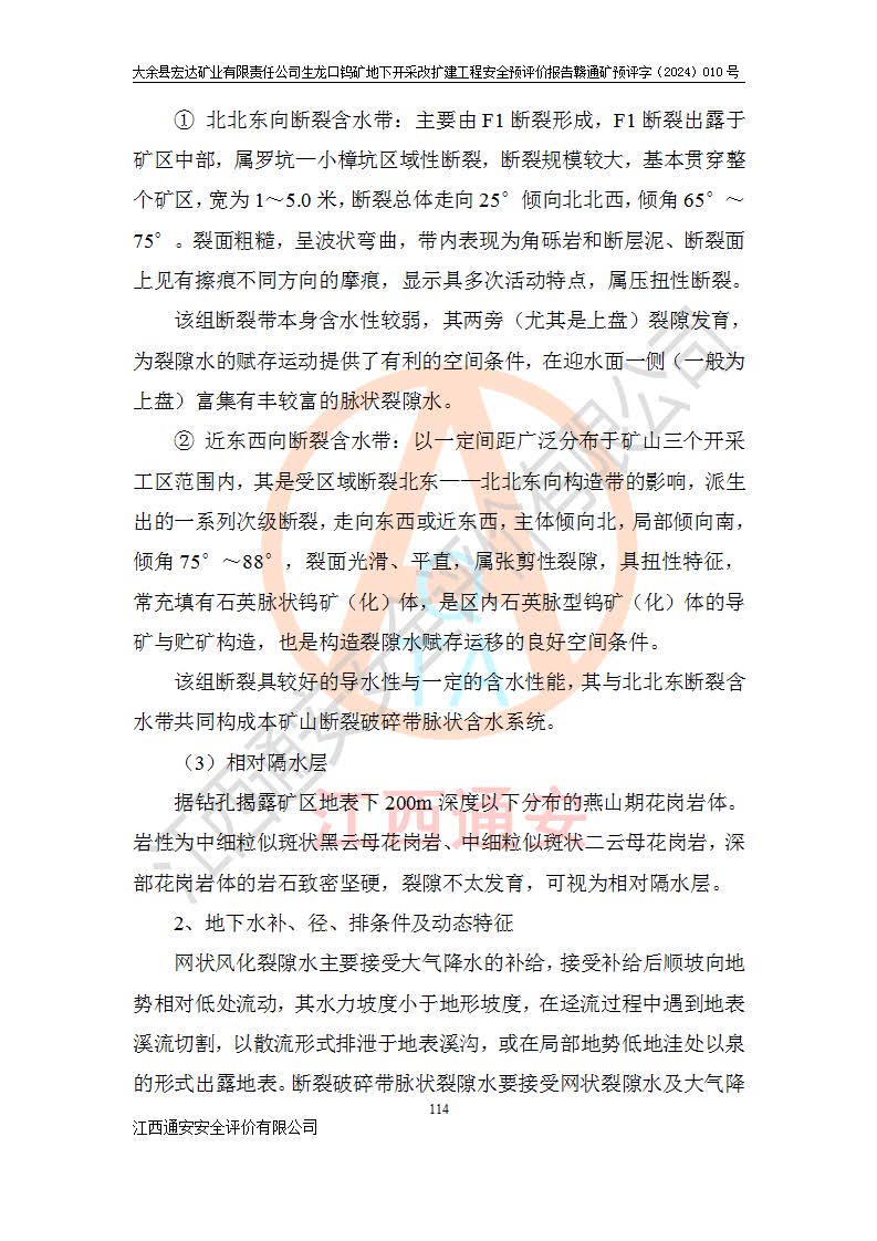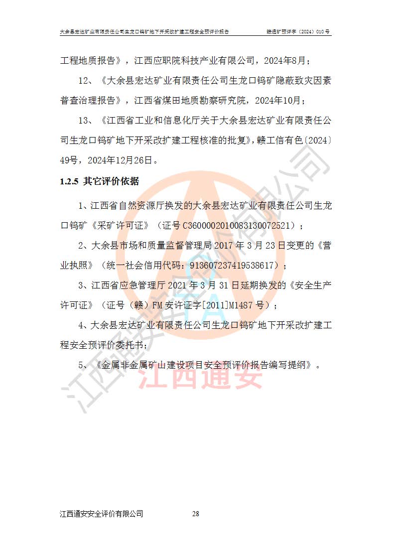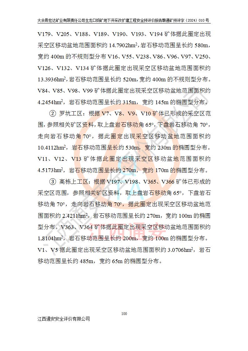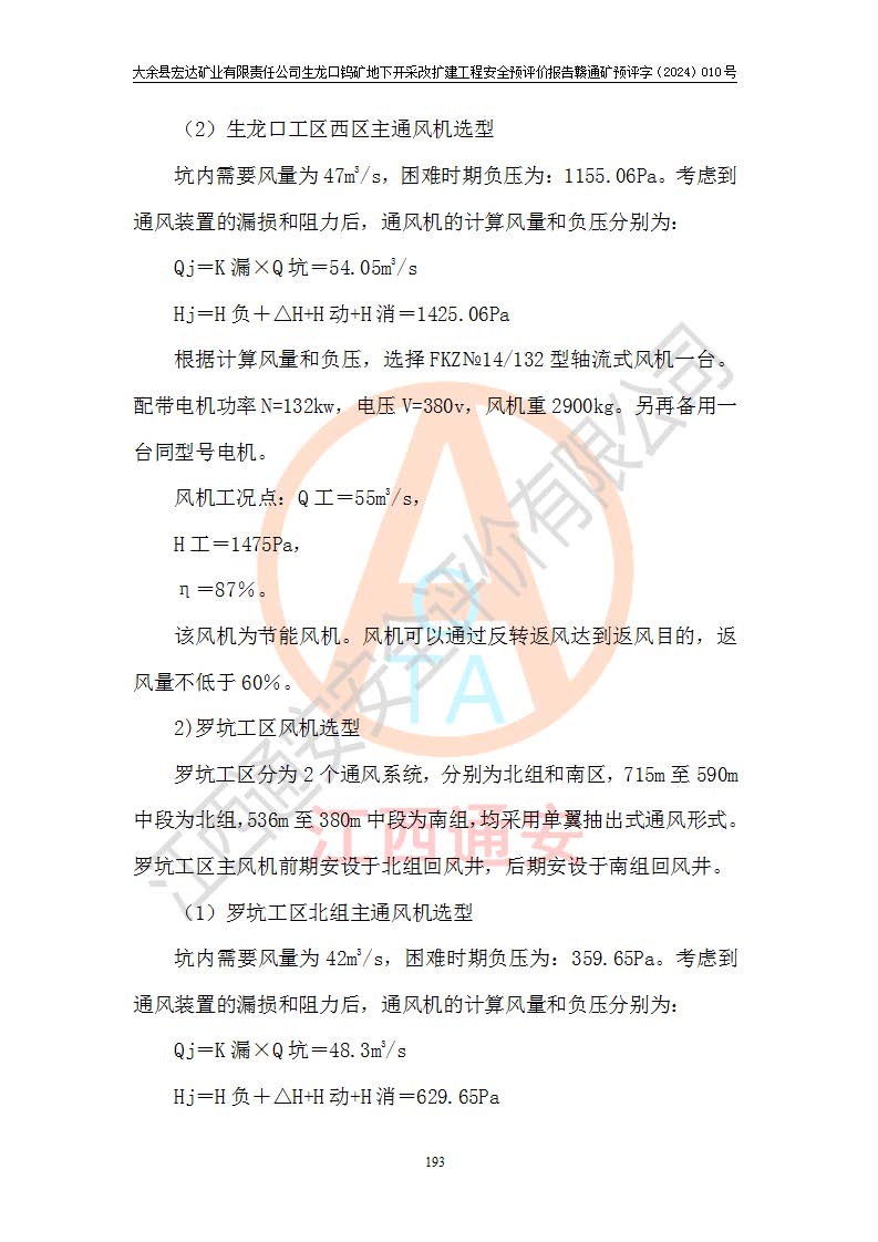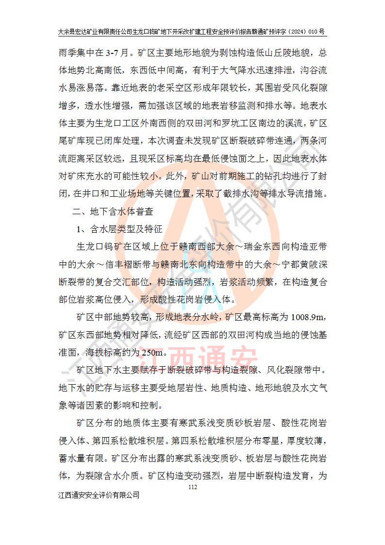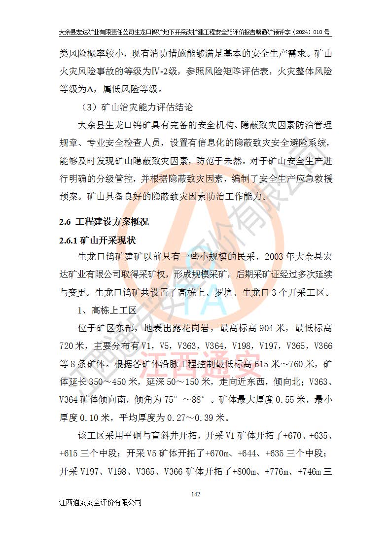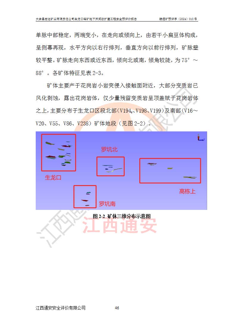 大余縣生龍口礦區(qū)鎢礦位于大余縣城北西 310°方位,距大余縣城直距 12 **,西接生龍口,北接蕩坪礦,南鄰黃木坑、西華山等礦區(qū),礦區(qū)正好是幾個(gè)礦區(qū)的銜接部位。隸屬大余縣浮江鄉(xiāng)管轄。其地理位置為:東經(jīng) 114°17′03″--114°20′11″;北緯 25°27′15″ --25 ° 28 ′ 10″ 。 礦 區(qū) 面 積 為5.97平方**。區(qū)內(nèi)交通較為方便,礦區(qū)東西兩側(cè)不遠(yuǎn)處均有公路通過(guò),西側(cè)為大余至崇義公路,東側(cè)為 大 余 至 蕩 坪 公路,通過(guò)這兩條公路均可向南與大余縣城與 323 國(guó)道相接,至贛州市區(qū)約100 **,往廣東省韶關(guān)贛韶高速約 150 **,向北達(dá)崇義縣城。 生龍口鎢礦建礦以前只有一些小規(guī)模的民采,2003年大余縣宏達(dá)礦業(yè)有限公司取得采礦權(quán),形成規(guī)模采礦,后期采礦證經(jīng)過(guò)多次延續(xù)與變更。生龍口鎢礦共設(shè)置了高棟上、羅坑、生龍口3個(gè)開(kāi)采工區(qū)。3個(gè)工區(qū)相距3**左右。 2024年9月江西晶楚工程技術(shù)有限公司編制完成了《大余縣宏達(dá)礦業(yè)有限責(zé)任公司生龍口鎢礦地下開(kāi)采改擴(kuò)建工程可行性研究報(bào)告》(以下簡(jiǎn)稱(chēng)《可研報(bào)告》)。2024年12月26日取得《江西省工業(yè)和信息化廳關(guān)于大余縣宏達(dá)礦業(yè)有限責(zé)任公司生龍口鎢礦地下開(kāi)采改擴(kuò)建工程核準(zhǔn)的批復(fù)》(贛工信有色〔2024〕49號(hào))。 根據(jù)《可研報(bào)告》,可研設(shè)計(jì)范圍為生龍口鎢礦礦區(qū)礦權(quán)范圍,平面范圍由15個(gè)拐點(diǎn)組成,開(kāi)采標(biāo)高范圍為746m~200m。本次開(kāi)采對(duì)象為開(kāi)采范圍內(nèi)的35條工業(yè)礦體,其中,大部分礦體以及接近地表處存在采空區(qū),為保護(hù)地表及井下安全作業(yè),需留設(shè)地表保安礦柱及采空區(qū)隔離礦柱;其中,高棟上工區(qū)V198、V197礦體因位于采空區(qū)后方,且資源量較少,暫不列為開(kāi)采對(duì)象;生龍口工區(qū)V98、V85、V84因利舊324m主平硐口,故作為保安礦柱,暫不予開(kāi)采??裳?*采用淺孔留礦嗣后充填法??裳?*采用平硐+盲斜坡道開(kāi)拓,一次性整體設(shè)計(jì),各工區(qū)礦石和廢石均通過(guò)溜井下放至相應(yīng)區(qū)段*低開(kāi)采中段、通過(guò)UK-6礦用自卸卡車(chē)裝載,利用內(nèi)部運(yùn)輸巷道和溜井運(yùn)至生龍口工區(qū)324m平硐(主運(yùn)輸巷道)集中出礦,各工區(qū)礦石、廢石分別運(yùn)至324平硐口附近的選礦廠和砂石骨料加工廠。井下中段**采用無(wú)軌運(yùn)輸。礦區(qū)采用分區(qū)通風(fēng)系統(tǒng)、每個(gè)工區(qū)采用單翼對(duì)角抽出機(jī)械式通風(fēng)方式;新風(fēng)主要從平硐口進(jìn)風(fēng),回風(fēng)井回風(fēng)。 本項(xiàng)目已經(jīng)符合編制安全預(yù)評(píng)價(jià)的前置條件,根據(jù)《中華人民共和國(guó)安全生產(chǎn)法》、《建設(shè)項(xiàng)目安全設(shè)施“三同時(shí)”監(jiān)督管理辦法》(**安全生產(chǎn)監(jiān)督管理局令第36號(hào))、《金屬非金屬礦山建設(shè)項(xiàng)目安全設(shè)施目錄》(**安全生產(chǎn)監(jiān)督管理總局令第75號(hào))和《**礦山安全監(jiān)察局關(guān)于進(jìn)一步加強(qiáng)非煤礦山安全生產(chǎn)行政許可工作的通知》(礦安〔2024〕70號(hào))的規(guī)定,大余縣宏達(dá)礦業(yè)有限責(zé)任公司2024年10月8日委托江西通安安全評(píng)價(jià)有限公司對(duì)其生龍口鎢礦地下開(kāi)采改擴(kuò)建工程進(jìn)行安全預(yù)評(píng)價(jià)。 |