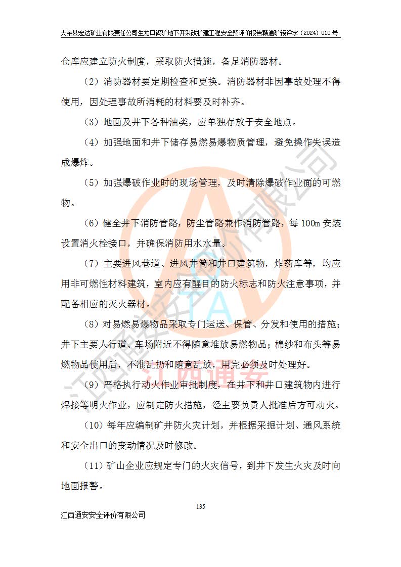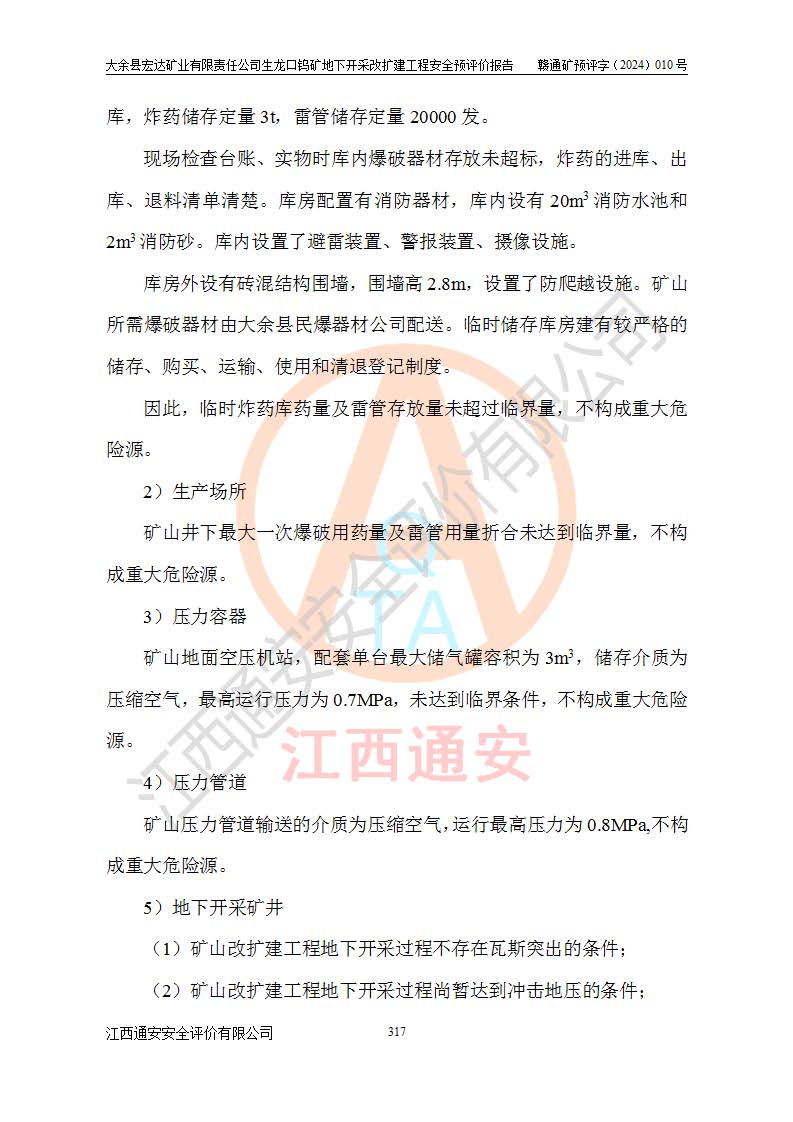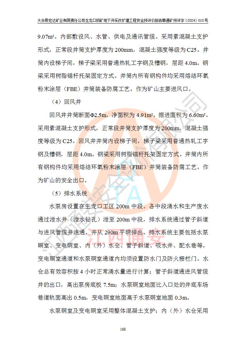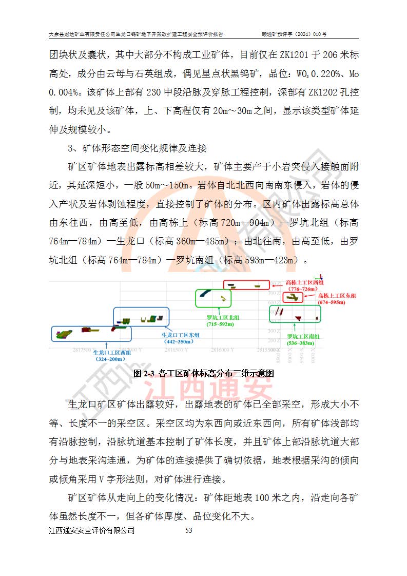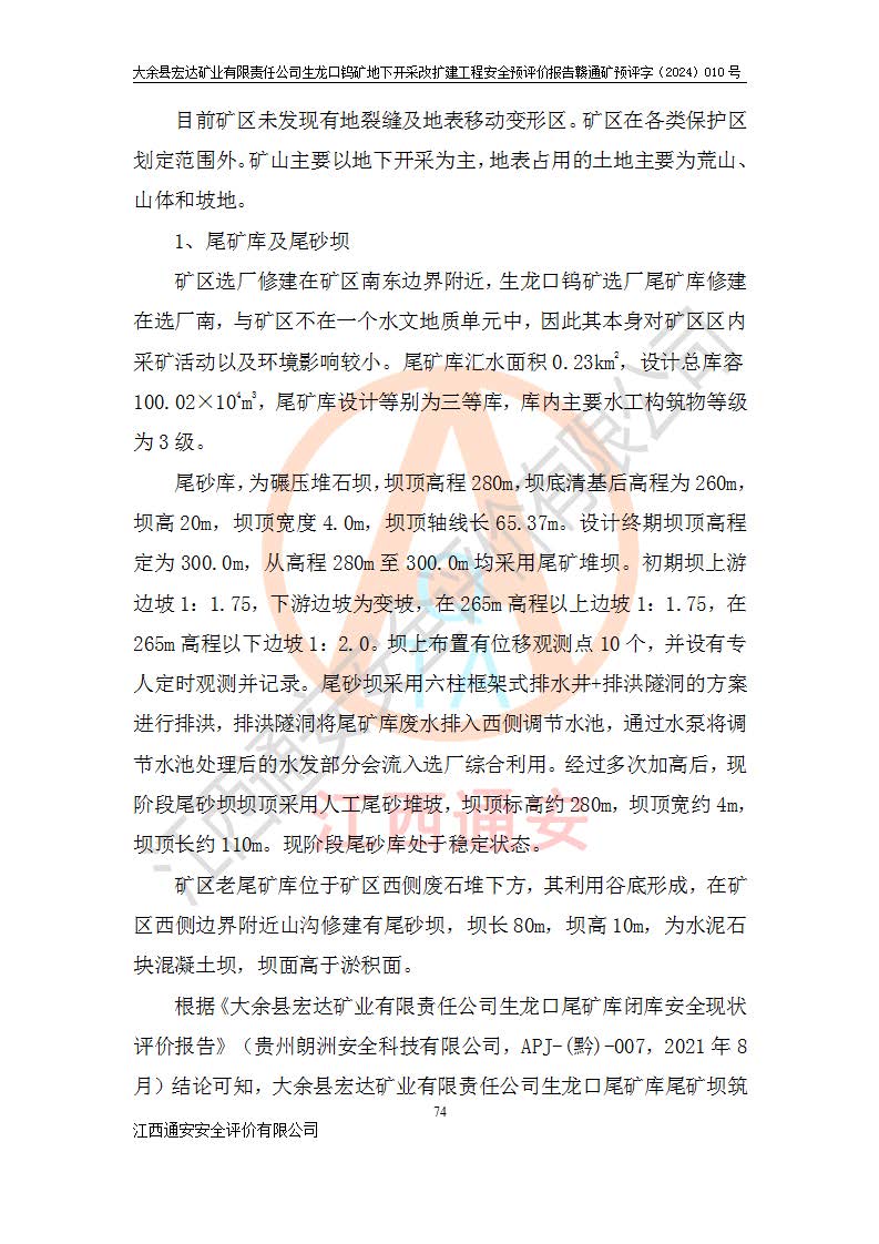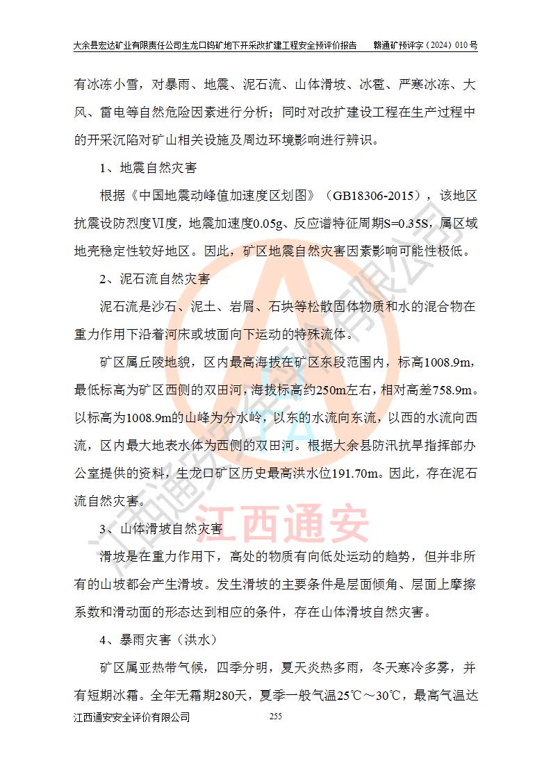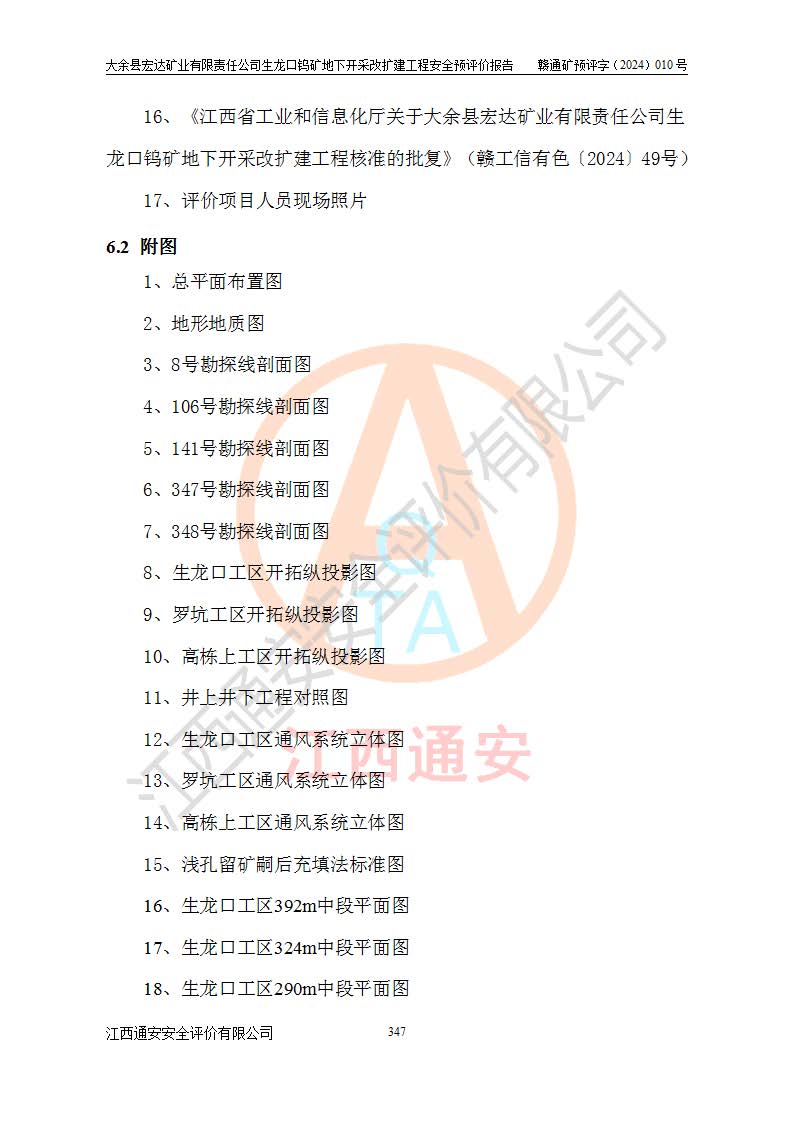大余縣生龍口礦區(qū)鎢礦位于大余縣城北西 310°方位,距大余縣城直距 12 **,西接生龍口,北接蕩坪礦,南鄰黃木坑、西華山等礦區(qū),礦區(qū)正好是幾個(gè)礦區(qū)的銜接部位。隸屬大余縣浮江鄉(xiāng)管轄。其地理位置為:東經(jīng) 114°17′03″--114°20′11″;北緯 25°27′15″ --25 ° 28 ′ 10″ 。 礦 區(qū) 面 積 為5.97平方**。區(qū)內(nèi)交通較為方便,礦區(qū)東西兩側(cè)不遠(yuǎn)處均有公路通過(guò),西側(cè)為大余至崇義公路,東側(cè)為 大 余 至 蕩 坪 公路,通過(guò)這兩條公路均可向南與大余縣城與 323 國(guó)道相接,至贛州市區(qū)約100 **,往廣東省韶關(guān)贛韶高速約 150 **,向北達(dá)崇義縣城。 生龍口鎢礦建礦以前只有一些小規(guī)模的民采,2003年大余縣宏達(dá)礦業(yè)有限公司取得采礦權(quán),形成規(guī)模采礦,后期采礦證經(jīng)過(guò)多次延續(xù)與變更。生龍口鎢礦共設(shè)置了高棟上、羅坑、生龍口3個(gè)開(kāi)采工區(qū)。3個(gè)工區(qū)相距3**左右。 2024年9月江西晶楚工程技術(shù)有限公司編制完成了《大余縣宏達(dá)礦業(yè)有限責(zé)任公司生龍口鎢礦地下開(kāi)采改擴(kuò)建工程可行性研究報(bào)告》(以下簡(jiǎn)稱(chēng)《可研報(bào)告》)。2024年12月26日取得《江西省工業(yè)和信息化廳關(guān)于大余縣宏達(dá)礦業(yè)有限責(zé)任公司生龍口鎢礦地下開(kāi)采改擴(kuò)建工程核準(zhǔn)的批復(fù)》(贛工信有色〔2024〕49號(hào))。 根據(jù)《可研報(bào)告》,可研設(shè)計(jì)范圍為生龍口鎢礦礦區(qū)礦權(quán)范圍,平面范圍由15個(gè)拐點(diǎn)組成,開(kāi)采標(biāo)高范圍為746m~200m。本次開(kāi)采對(duì)象為開(kāi)采范圍內(nèi)的35條工業(yè)礦體,其中,大部分礦體以及接近地表處存在采空區(qū),為保護(hù)地表及井下安全作業(yè),需留設(shè)地表保安礦柱及采空區(qū)隔離礦柱;其中,高棟上工區(qū)V198、V197礦體因位于采空區(qū)后方,且資源量較少,暫不列為開(kāi)采對(duì)象;生龍口工區(qū)V98、V85、V84因利舊324m主平硐口,故作為保安礦柱,暫不予開(kāi)采??裳?*采用淺孔留礦嗣后充填法??裳?*采用平硐+盲斜坡道開(kāi)拓,一次性整體設(shè)計(jì),各工區(qū)礦石和廢石均通過(guò)溜井下放至相應(yīng)區(qū)段*低開(kāi)采中段、通過(guò)UK-6礦用自卸卡車(chē)裝載,利用內(nèi)部運(yùn)輸巷道和溜井運(yùn)至生龍口工區(qū)324m平硐(主運(yùn)輸巷道)集中出礦,各工區(qū)礦石、廢石分別運(yùn)至324平硐口附近的選礦廠和砂石骨料加工廠。井下中段**采用無(wú)軌運(yùn)輸。礦區(qū)采用分區(qū)通風(fēng)系統(tǒng)、每個(gè)工區(qū)采用單翼對(duì)角抽出機(jī)械式通風(fēng)方式;新風(fēng)主要從平硐口進(jìn)風(fēng),回風(fēng)井回風(fēng)。 本項(xiàng)目已經(jīng)符合編制安全預(yù)評(píng)價(jià)的前置條件,根據(jù)《中華人民共和國(guó)安全生產(chǎn)法》、《建設(shè)項(xiàng)目安全設(shè)施“三同時(shí)”監(jiān)督管理辦法》(**安全生產(chǎn)監(jiān)督管理局令第36號(hào))、《金屬非金屬礦山建設(shè)項(xiàng)目安全設(shè)施目錄》(**安全生產(chǎn)監(jiān)督管理總局令第75號(hào))和《**礦山安全監(jiān)察局關(guān)于進(jìn)一步加強(qiáng)非煤礦山安全生產(chǎn)行政許可工作的通知》(礦安〔2024〕70號(hào))的規(guī)定,大余縣宏達(dá)礦業(yè)有限責(zé)任公司2024年10月8日委托江西通安安全評(píng)價(jià)有限公司對(duì)其生龍口鎢礦地下開(kāi)采改擴(kuò)建工程進(jìn)行安全預(yù)評(píng)價(jià)。 |
