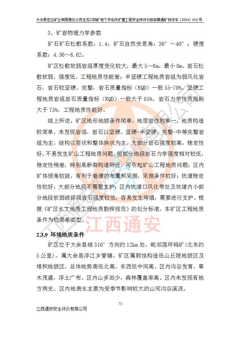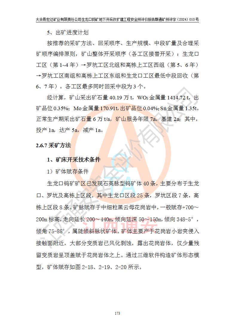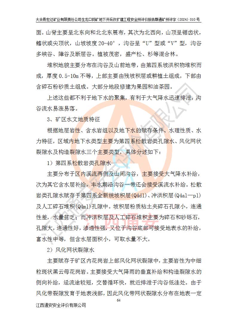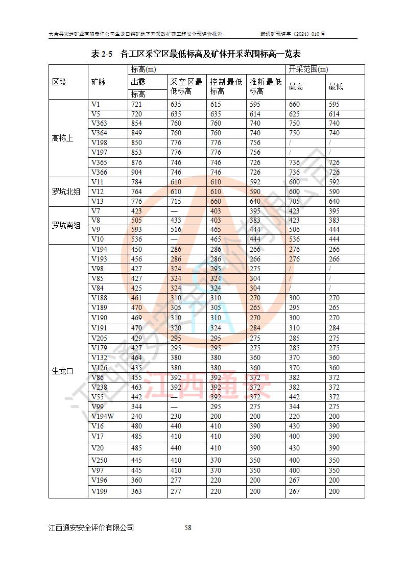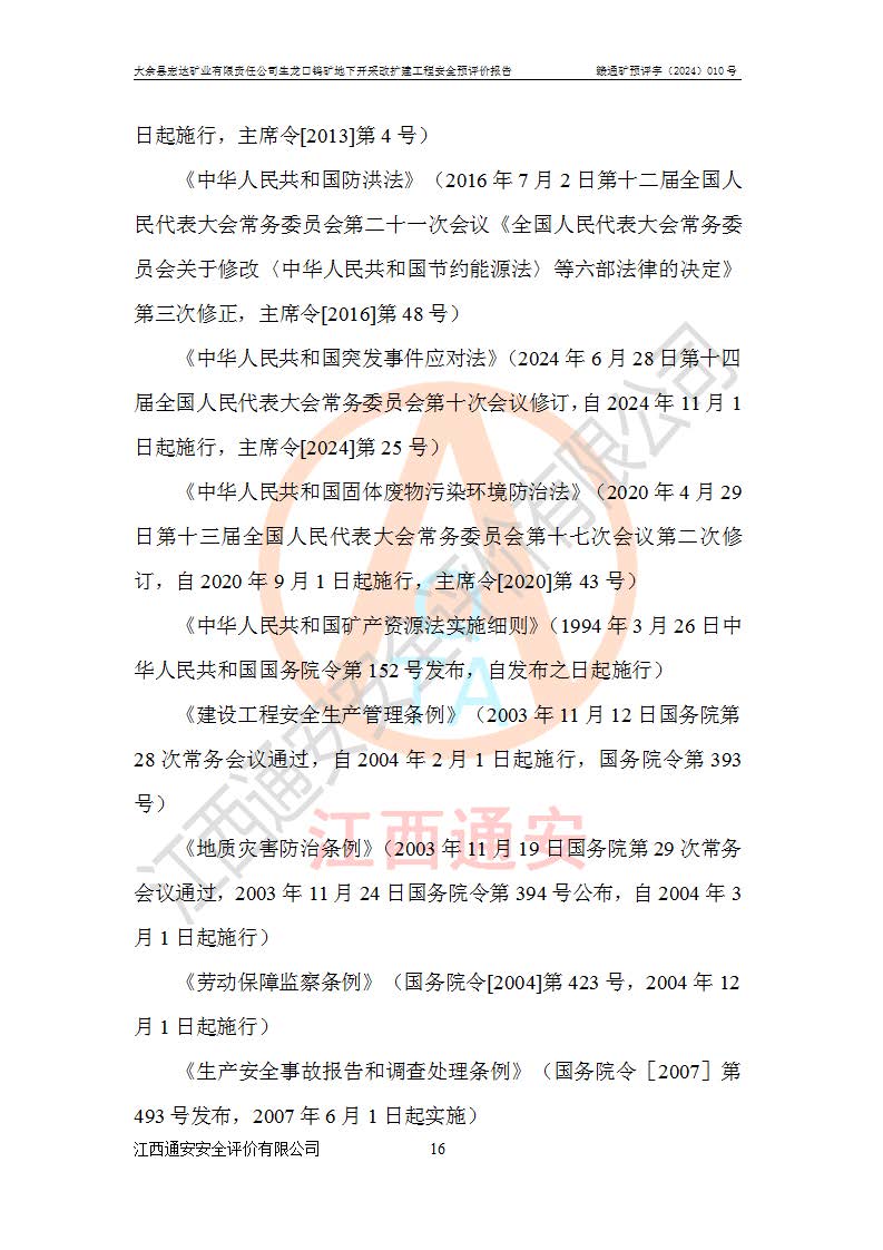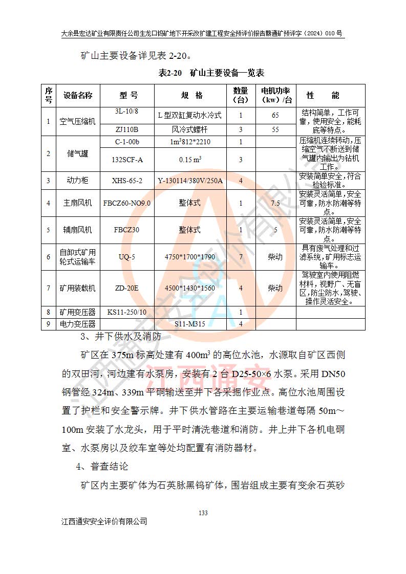 大余縣生龍口礦區(qū)鎢礦位于大余縣城北西 310°方位,距大余縣城直距 12 **,西接生龍口,北接蕩坪礦,南鄰黃木坑、西華山等礦區(qū),礦區(qū)正好是幾個(gè)礦區(qū)的銜接部位。隸屬大余縣浮江鄉(xiāng)管轄。其地理位置為:東經(jīng) 114°17′03″--114°20′11″;北緯 25°27′15″ --25 ° 28 ′ 10″ 。 礦 區(qū) 面 積 為5.97平方**。區(qū)內(nèi)交通較為方便,礦區(qū)東西兩側(cè)不遠(yuǎn)處均有公路通過(guò),西側(cè)為大余至崇義公路,東側(cè)為 大 余 至 蕩 坪 公路,通過(guò)這兩條公路均可向南與大余縣城與 323 國(guó)道相接,至贛州市區(qū)約100 **,往廣東省韶關(guān)贛韶高速約 150 **,向北達(dá)崇義縣城。 生龍口鎢礦建礦以前只有一些小規(guī)模的民采,2003年大余縣宏達(dá)礦業(yè)有限公司取得采礦權(quán),形成規(guī)模采礦,后期采礦證經(jīng)過(guò)多次延續(xù)與變更。生龍口鎢礦共設(shè)置了高棟上、羅坑、生龍口3個(gè)開(kāi)采工區(qū)。3個(gè)工區(qū)相距3**左右。 2024年9月江西晶楚工程技術(shù)有限公司編制完成了《大余縣宏達(dá)礦業(yè)有限責(zé)任公司生龍口鎢礦地下開(kāi)采改擴(kuò)建工程可行性研究報(bào)告》(以下簡(jiǎn)稱(chēng)《可研報(bào)告》)。2024年12月26日取得《江西省工業(yè)和信息化廳關(guān)于大余縣宏達(dá)礦業(yè)有限責(zé)任公司生龍口鎢礦地下開(kāi)采改擴(kuò)建工程核準(zhǔn)的批復(fù)》(贛工信有色〔2024〕49號(hào))。 根據(jù)《可研報(bào)告》,可研設(shè)計(jì)范圍為生龍口鎢礦礦區(qū)礦權(quán)范圍,平面范圍由15個(gè)拐點(diǎn)組成,開(kāi)采標(biāo)高范圍為746m~200m。本次開(kāi)采對(duì)象為開(kāi)采范圍內(nèi)的35條工業(yè)礦體,其中,大部分礦體以及接近地表處存在采空區(qū),為保護(hù)地表及井下安全作業(yè),需留設(shè)地表保安礦柱及采空區(qū)隔離礦柱;其中,高棟上工區(qū)V198、V197礦體因位于采空區(qū)后方,且資源量較少,暫不列為開(kāi)采對(duì)象;生龍口工區(qū)V98、V85、V84因利舊324m主平硐口,故作為保安礦柱,暫不予開(kāi)采??裳?*采用淺孔留礦嗣后充填法??裳?*采用平硐+盲斜坡道開(kāi)拓,一次性整體設(shè)計(jì),各工區(qū)礦石和廢石均通過(guò)溜井下放至相應(yīng)區(qū)段*低開(kāi)采中段、通過(guò)UK-6礦用自卸卡車(chē)裝載,利用內(nèi)部運(yùn)輸巷道和溜井運(yùn)至生龍口工區(qū)324m平硐(主運(yùn)輸巷道)集中出礦,各工區(qū)礦石、廢石分別運(yùn)至324平硐口附近的選礦廠和砂石骨料加工廠。井下中段**采用無(wú)軌運(yùn)輸。礦區(qū)采用分區(qū)通風(fēng)系統(tǒng)、每個(gè)工區(qū)采用單翼對(duì)角抽出機(jī)械式通風(fēng)方式;新風(fēng)主要從平硐口進(jìn)風(fēng),回風(fēng)井回風(fēng)。 本項(xiàng)目已經(jīng)符合編制安全預(yù)評(píng)價(jià)的前置條件,根據(jù)《中華人民共和國(guó)安全生產(chǎn)法》、《建設(shè)項(xiàng)目安全設(shè)施“三同時(shí)”監(jiān)督管理辦法》(**安全生產(chǎn)監(jiān)督管理局令第36號(hào))、《金屬非金屬礦山建設(shè)項(xiàng)目安全設(shè)施目錄》(**安全生產(chǎn)監(jiān)督管理總局令第75號(hào))和《**礦山安全監(jiān)察局關(guān)于進(jìn)一步加強(qiáng)非煤礦山安全生產(chǎn)行政許可工作的通知》(礦安〔2024〕70號(hào))的規(guī)定,大余縣宏達(dá)礦業(yè)有限責(zé)任公司2024年10月8日委托江西通安安全評(píng)價(jià)有限公司對(duì)其生龍口鎢礦地下開(kāi)采改擴(kuò)建工程進(jìn)行安全預(yù)評(píng)價(jià)。 |