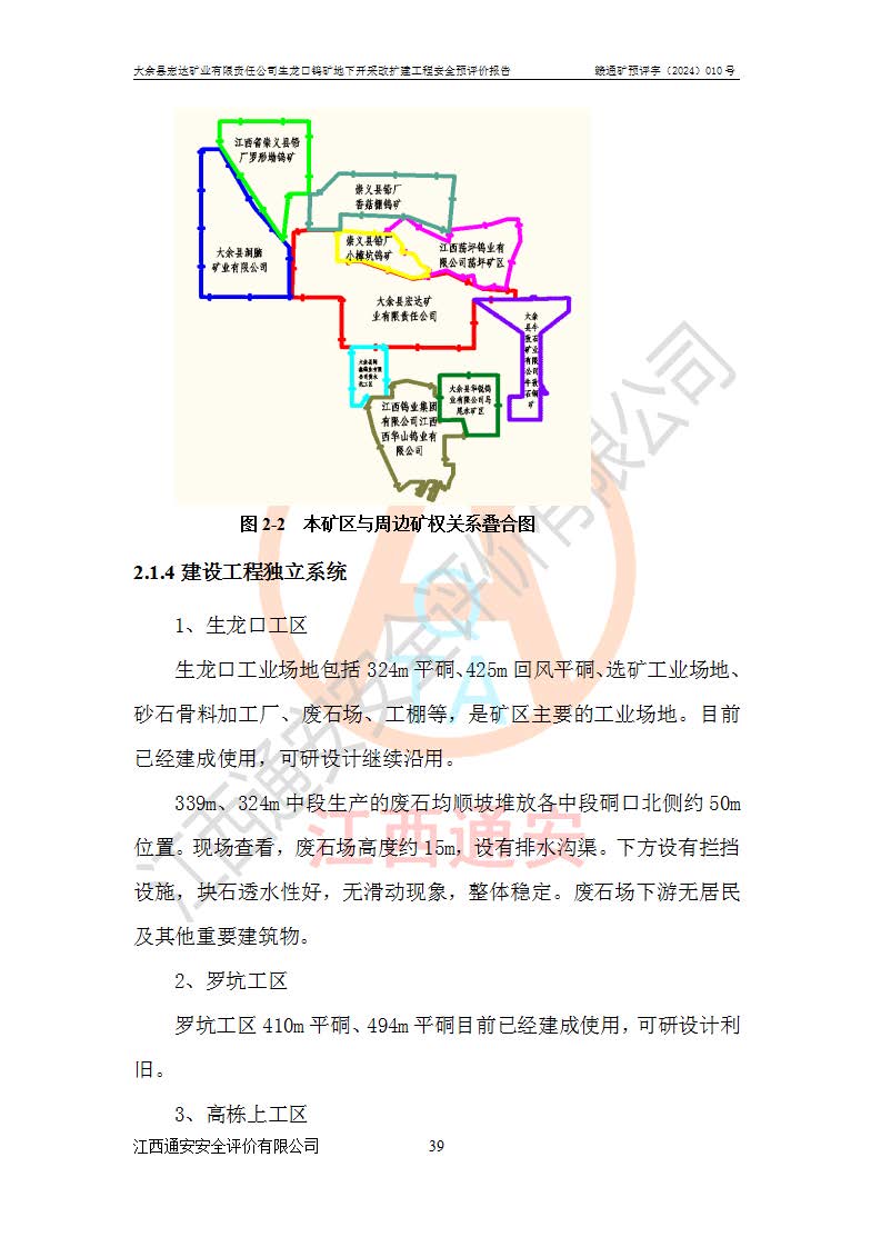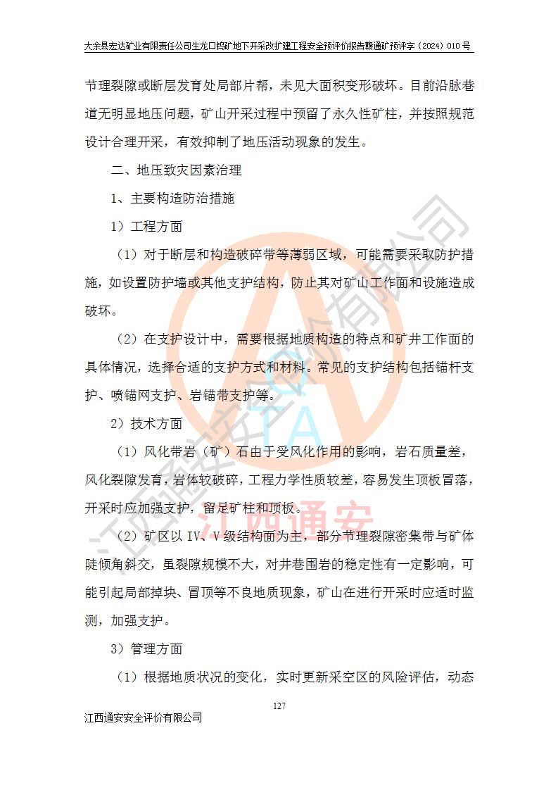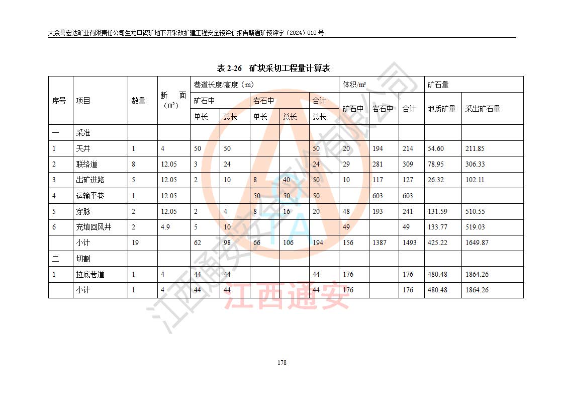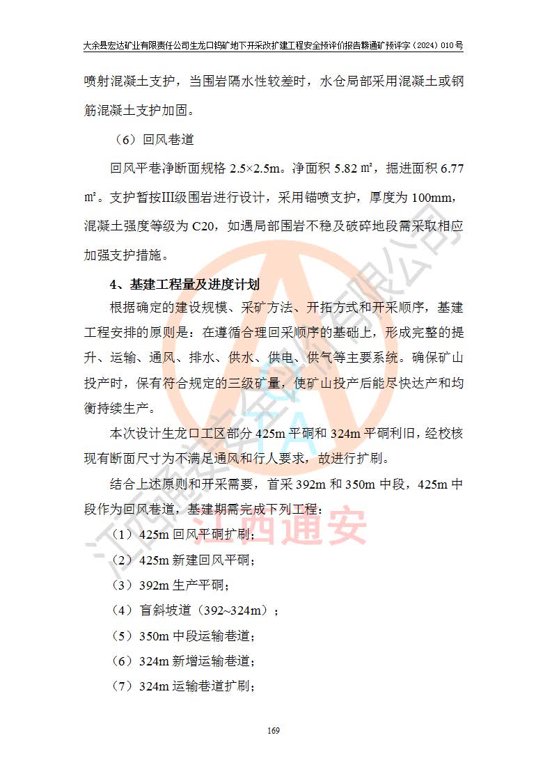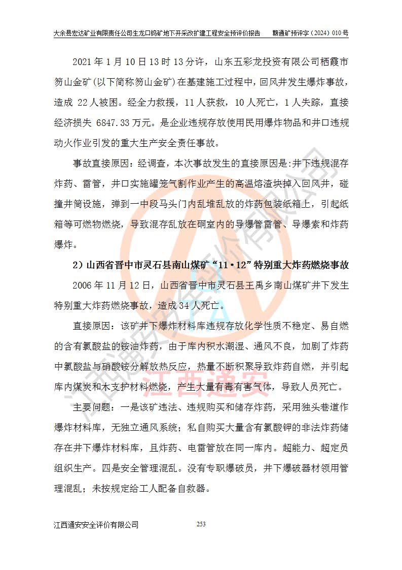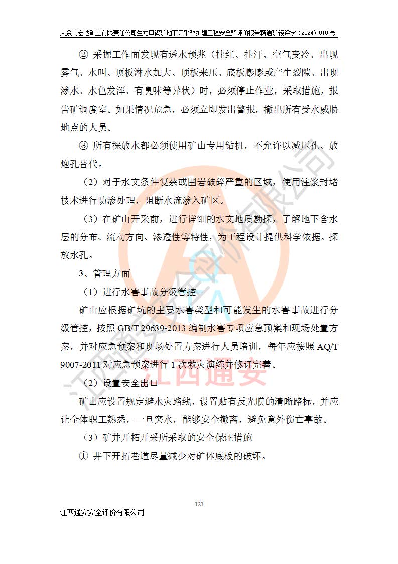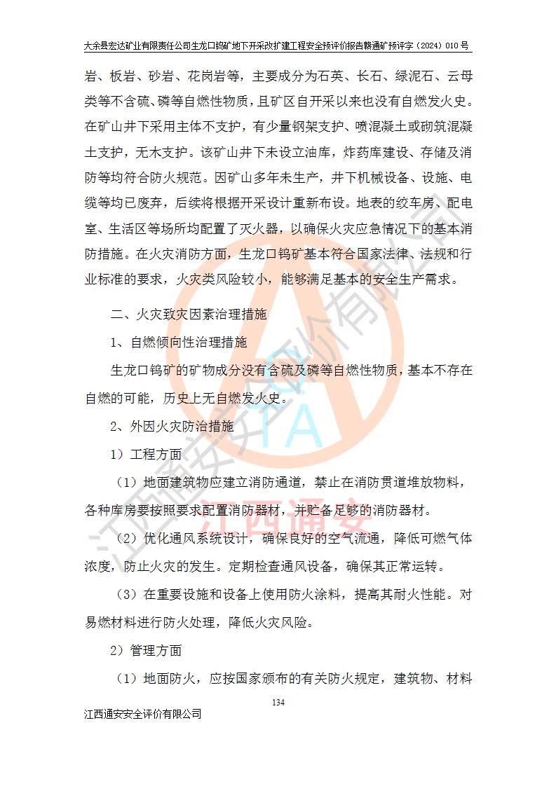 大余縣生龍口礦區(qū)鎢礦位于大余縣城北西 310°方位,距大余縣城直距 12 **,西接生龍口,北接蕩坪礦,南鄰黃木坑、西華山等礦區(qū),礦區(qū)正好是幾個(gè)礦區(qū)的銜接部位。隸屬大余縣浮江鄉(xiāng)管轄。其地理位置為:東經(jīng) 114°17′03″--114°20′11″;北緯 25°27′15″ --25 ° 28 ′ 10″ 。 礦 區(qū) 面 積 為5.97平方**。區(qū)內(nèi)交通較為方便,礦區(qū)東西兩側(cè)不遠(yuǎn)處均有公路通過(guò),西側(cè)為大余至崇義公路,東側(cè)為 大 余 至 蕩 坪 公路,通過(guò)這兩條公路均可向南與大余縣城與 323 國(guó)道相接,至贛州市區(qū)約100 **,往廣東省韶關(guān)贛韶高速約 150 **,向北達(dá)崇義縣城。 生龍口鎢礦建礦以前只有一些小規(guī)模的民采,2003年大余縣宏達(dá)礦業(yè)有限公司取得采礦權(quán),形成規(guī)模采礦,后期采礦證經(jīng)過(guò)多次延續(xù)與變更。生龍口鎢礦共設(shè)置了高棟上、羅坑、生龍口3個(gè)開(kāi)采工區(qū)。3個(gè)工區(qū)相距3**左右。 2024年9月江西晶楚工程技術(shù)有限公司編制完成了《大余縣宏達(dá)礦業(yè)有限責(zé)任公司生龍口鎢礦地下開(kāi)采改擴(kuò)建工程可行性研究報(bào)告》(以下簡(jiǎn)稱(chēng)《可研報(bào)告》)。2024年12月26日取得《江西省工業(yè)和信息化廳關(guān)于大余縣宏達(dá)礦業(yè)有限責(zé)任公司生龍口鎢礦地下開(kāi)采改擴(kuò)建工程核準(zhǔn)的批復(fù)》(贛工信有色〔2024〕49號(hào))。 根據(jù)《可研報(bào)告》,可研設(shè)計(jì)范圍為生龍口鎢礦礦區(qū)礦權(quán)范圍,平面范圍由15個(gè)拐點(diǎn)組成,開(kāi)采標(biāo)高范圍為746m~200m。本次開(kāi)采對(duì)象為開(kāi)采范圍內(nèi)的35條工業(yè)礦體,其中,大部分礦體以及接近地表處存在采空區(qū),為保護(hù)地表及井下安全作業(yè),需留設(shè)地表保安礦柱及采空區(qū)隔離礦柱;其中,高棟上工區(qū)V198、V197礦體因位于采空區(qū)后方,且資源量較少,暫不列為開(kāi)采對(duì)象;生龍口工區(qū)V98、V85、V84因利舊324m主平硐口,故作為保安礦柱,暫不予開(kāi)采??裳?*采用淺孔留礦嗣后充填法??裳?*采用平硐+盲斜坡道開(kāi)拓,一次性整體設(shè)計(jì),各工區(qū)礦石和廢石均通過(guò)溜井下放至相應(yīng)區(qū)段*低開(kāi)采中段、通過(guò)UK-6礦用自卸卡車(chē)裝載,利用內(nèi)部運(yùn)輸巷道和溜井運(yùn)至生龍口工區(qū)324m平硐(主運(yùn)輸巷道)集中出礦,各工區(qū)礦石、廢石分別運(yùn)至324平硐口附近的選礦廠和砂石骨料加工廠。井下中段**采用無(wú)軌運(yùn)輸。礦區(qū)采用分區(qū)通風(fēng)系統(tǒng)、每個(gè)工區(qū)采用單翼對(duì)角抽出機(jī)械式通風(fēng)方式;新風(fēng)主要從平硐口進(jìn)風(fēng),回風(fēng)井回風(fēng)。 本項(xiàng)目已經(jīng)符合編制安全預(yù)評(píng)價(jià)的前置條件,根據(jù)《中華人民共和國(guó)安全生產(chǎn)法》、《建設(shè)項(xiàng)目安全設(shè)施“三同時(shí)”監(jiān)督管理辦法》(**安全生產(chǎn)監(jiān)督管理局令第36號(hào))、《金屬非金屬礦山建設(shè)項(xiàng)目安全設(shè)施目錄》(**安全生產(chǎn)監(jiān)督管理總局令第75號(hào))和《**礦山安全監(jiān)察局關(guān)于進(jìn)一步加強(qiáng)非煤礦山安全生產(chǎn)行政許可工作的通知》(礦安〔2024〕70號(hào))的規(guī)定,大余縣宏達(dá)礦業(yè)有限責(zé)任公司2024年10月8日委托江西通安安全評(píng)價(jià)有限公司對(duì)其生龍口鎢礦地下開(kāi)采改擴(kuò)建工程進(jìn)行安全預(yù)評(píng)價(jià)。 |