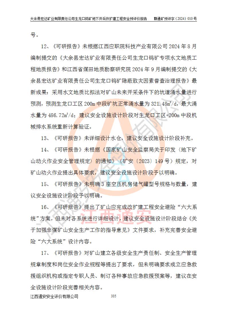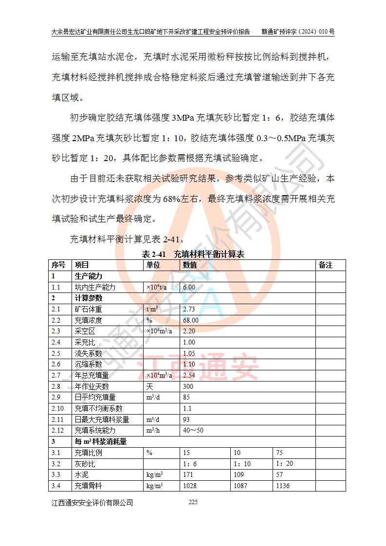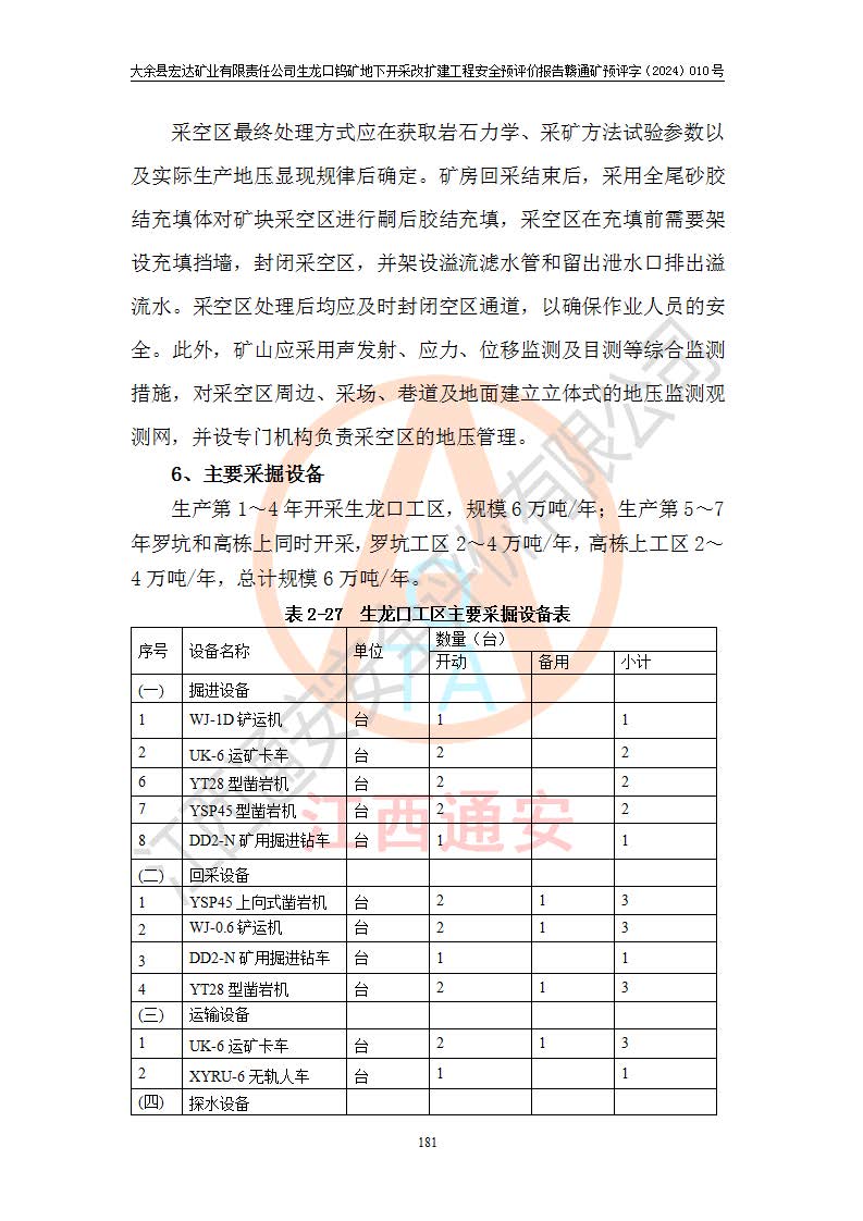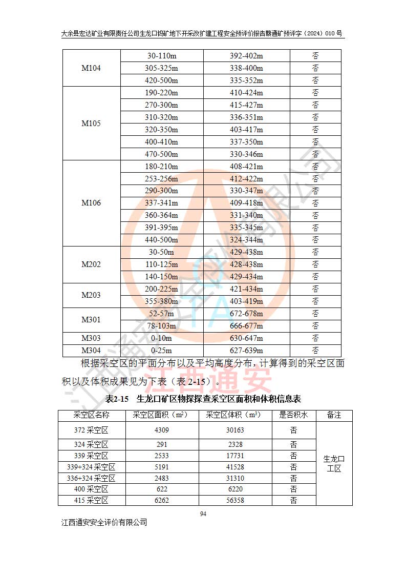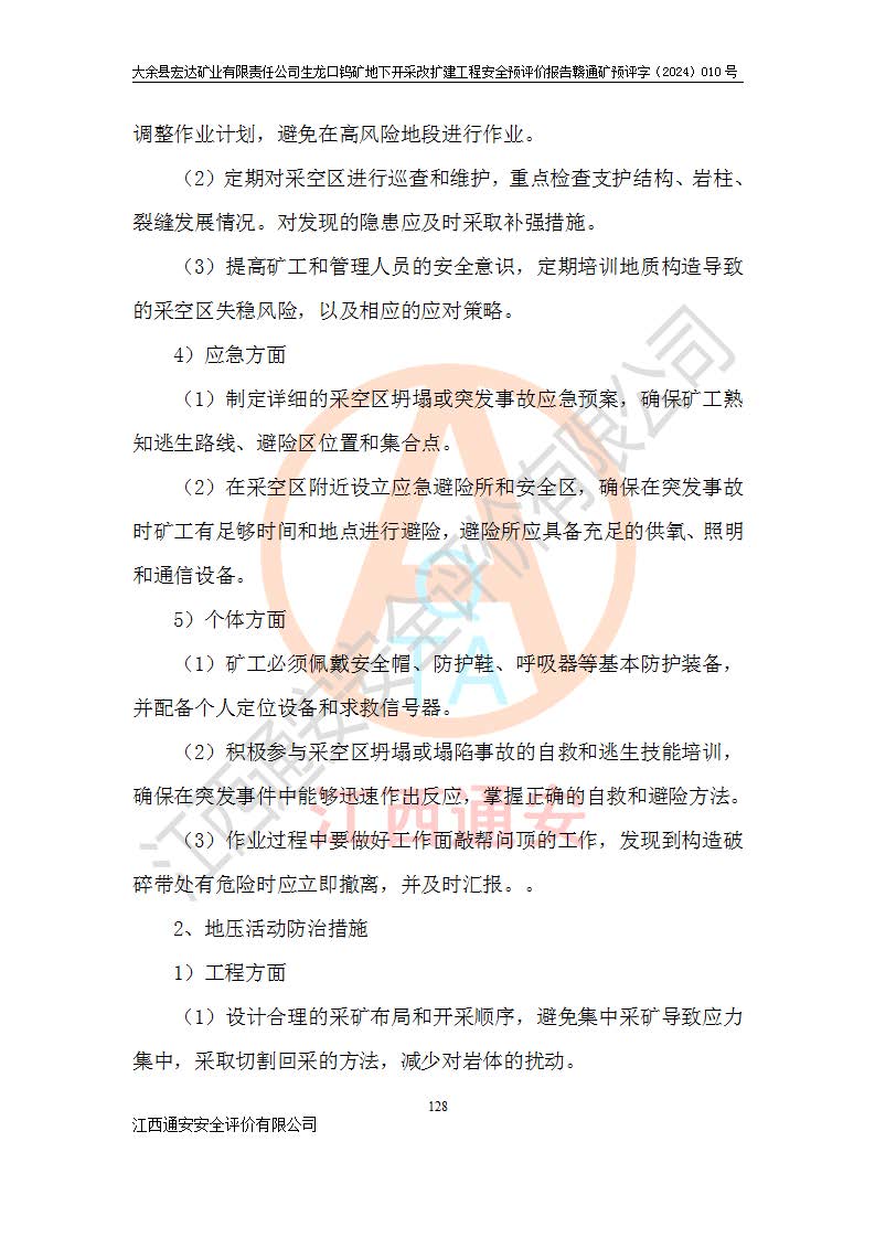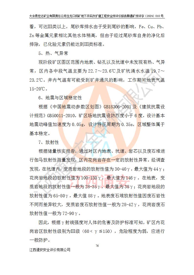 大余縣生龍口礦區(qū)鎢礦位于大余縣城北西 310°方位,距大余縣城直距 12 **,西接生龍口,北接蕩坪礦,南鄰黃木坑、西華山等礦區(qū),礦區(qū)正好是幾個(gè)礦區(qū)的銜接部位。隸屬大余縣浮江鄉(xiāng)管轄。其地理位置為:東經(jīng) 114°17′03″--114°20′11″;北緯 25°27′15″ --25 ° 28 ′ 10″ 。 礦 區(qū) 面 積 為5.97平方**。區(qū)內(nèi)交通較為方便,礦區(qū)東西兩側(cè)不遠(yuǎn)處均有公路通過(guò),西側(cè)為大余至崇義公路,東側(cè)為 大 余 至 蕩 坪 公路,通過(guò)這兩條公路均可向南與大余縣城與 323 國(guó)道相接,至贛州市區(qū)約100 **,往廣東省韶關(guān)贛韶高速約 150 **,向北達(dá)崇義縣城。 生龍口鎢礦建礦以前只有一些小規(guī)模的民采,2003年大余縣宏達(dá)礦業(yè)有限公司取得采礦權(quán),形成規(guī)模采礦,后期采礦證經(jīng)過(guò)多次延續(xù)與變更。生龍口鎢礦共設(shè)置了高棟上、羅坑、生龍口3個(gè)開(kāi)采工區(qū)。3個(gè)工區(qū)相距3**左右。 2024年9月江西晶楚工程技術(shù)有限公司編制完成了《大余縣宏達(dá)礦業(yè)有限責(zé)任公司生龍口鎢礦地下開(kāi)采改擴(kuò)建工程可行性研究報(bào)告》(以下簡(jiǎn)稱(chēng)《可研報(bào)告》)。2024年12月26日取得《江西省工業(yè)和信息化廳關(guān)于大余縣宏達(dá)礦業(yè)有限責(zé)任公司生龍口鎢礦地下開(kāi)采改擴(kuò)建工程核準(zhǔn)的批復(fù)》(贛工信有色〔2024〕49號(hào))。 根據(jù)《可研報(bào)告》,可研設(shè)計(jì)范圍為生龍口鎢礦礦區(qū)礦權(quán)范圍,平面范圍由15個(gè)拐點(diǎn)組成,開(kāi)采標(biāo)高范圍為746m~200m。本次開(kāi)采對(duì)象為開(kāi)采范圍內(nèi)的35條工業(yè)礦體,其中,大部分礦體以及接近地表處存在采空區(qū),為保護(hù)地表及井下安全作業(yè),需留設(shè)地表保安礦柱及采空區(qū)隔離礦柱;其中,高棟上工區(qū)V198、V197礦體因位于采空區(qū)后方,且資源量較少,暫不列為開(kāi)采對(duì)象;生龍口工區(qū)V98、V85、V84因利舊324m主平硐口,故作為保安礦柱,暫不予開(kāi)采??裳?*采用淺孔留礦嗣后充填法??裳?*采用平硐+盲斜坡道開(kāi)拓,一次性整體設(shè)計(jì),各工區(qū)礦石和廢石均通過(guò)溜井下放至相應(yīng)區(qū)段*低開(kāi)采中段、通過(guò)UK-6礦用自卸卡車(chē)裝載,利用內(nèi)部運(yùn)輸巷道和溜井運(yùn)至生龍口工區(qū)324m平硐(主運(yùn)輸巷道)集中出礦,各工區(qū)礦石、廢石分別運(yùn)至324平硐口附近的選礦廠和砂石骨料加工廠。井下中段**采用無(wú)軌運(yùn)輸。礦區(qū)采用分區(qū)通風(fēng)系統(tǒng)、每個(gè)工區(qū)采用單翼對(duì)角抽出機(jī)械式通風(fēng)方式;新風(fēng)主要從平硐口進(jìn)風(fēng),回風(fēng)井回風(fēng)。 本項(xiàng)目已經(jīng)符合編制安全預(yù)評(píng)價(jià)的前置條件,根據(jù)《中華人民共和國(guó)安全生產(chǎn)法》、《建設(shè)項(xiàng)目安全設(shè)施“三同時(shí)”監(jiān)督管理辦法》(**安全生產(chǎn)監(jiān)督管理局令第36號(hào))、《金屬非金屬礦山建設(shè)項(xiàng)目安全設(shè)施目錄》(**安全生產(chǎn)監(jiān)督管理總局令第75號(hào))和《**礦山安全監(jiān)察局關(guān)于進(jìn)一步加強(qiáng)非煤礦山安全生產(chǎn)行政許可工作的通知》(礦安〔2024〕70號(hào))的規(guī)定,大余縣宏達(dá)礦業(yè)有限責(zé)任公司2024年10月8日委托江西通安安全評(píng)價(jià)有限公司對(duì)其生龍口鎢礦地下開(kāi)采改擴(kuò)建工程進(jìn)行安全預(yù)評(píng)價(jià)。 |