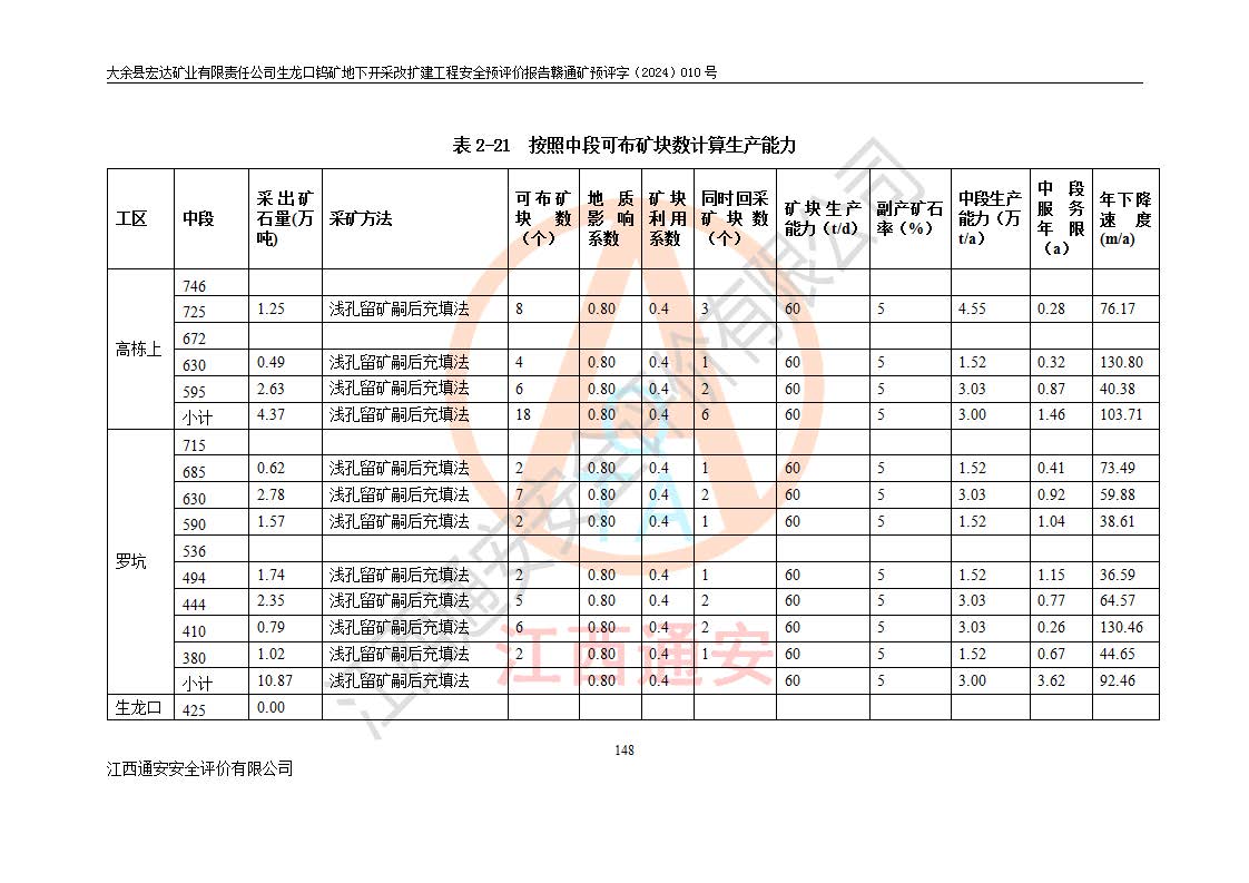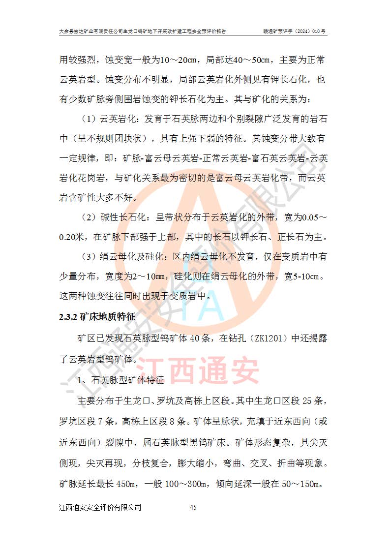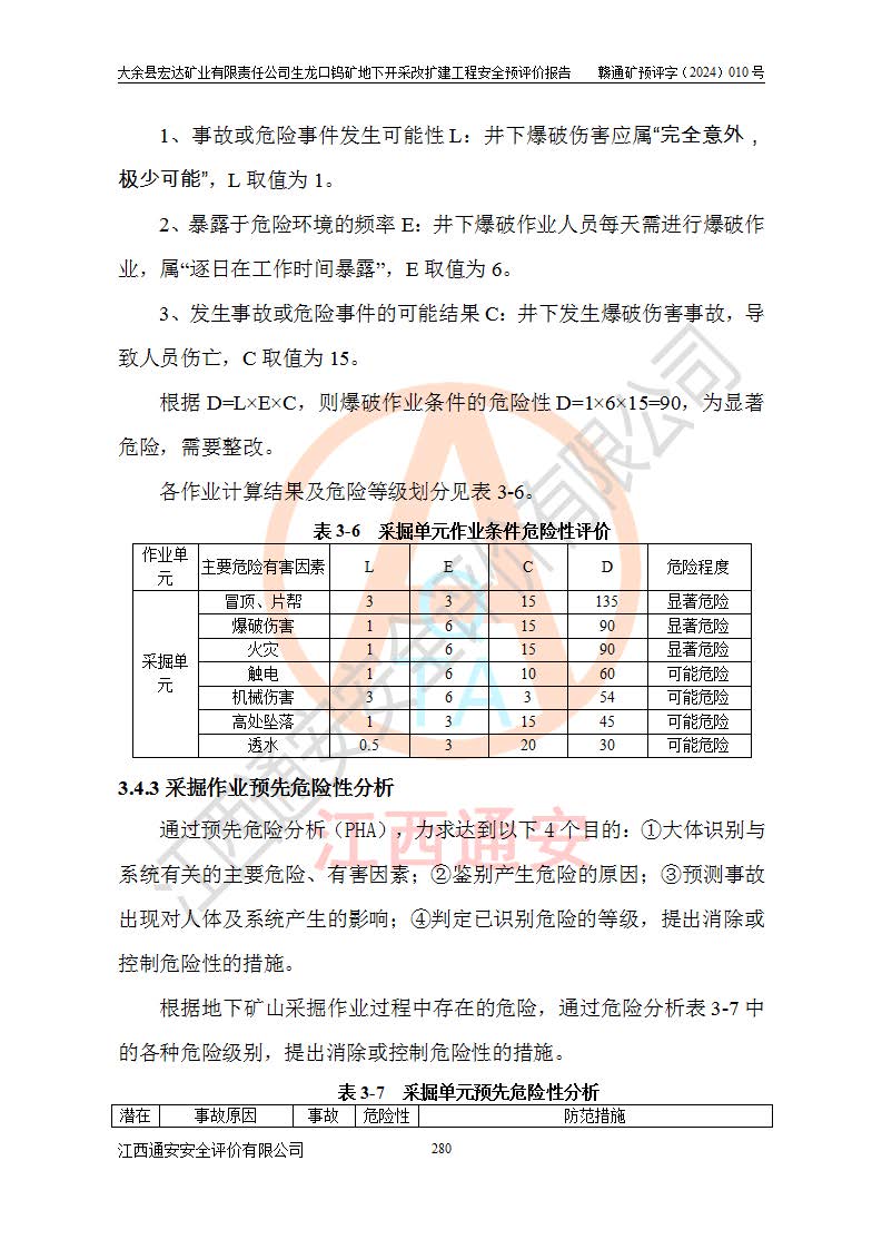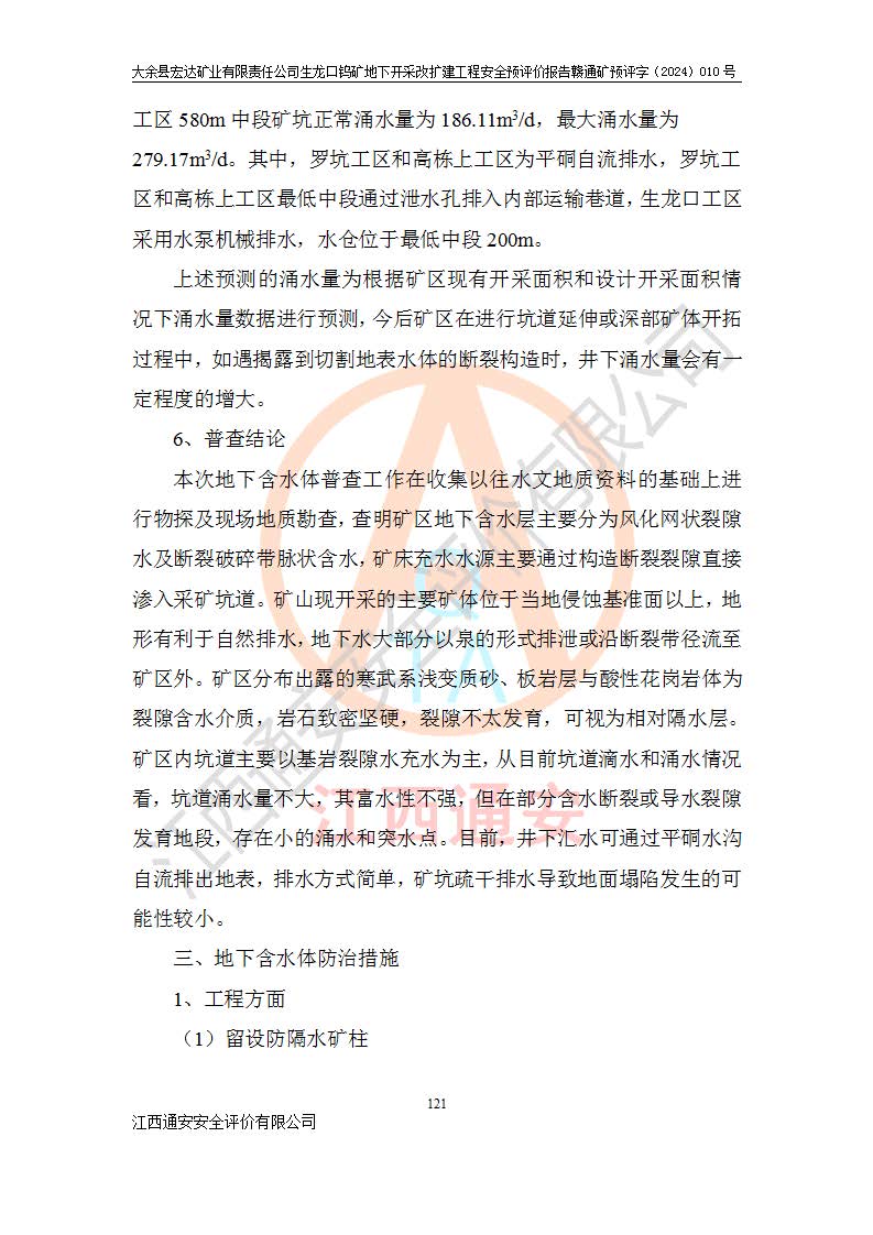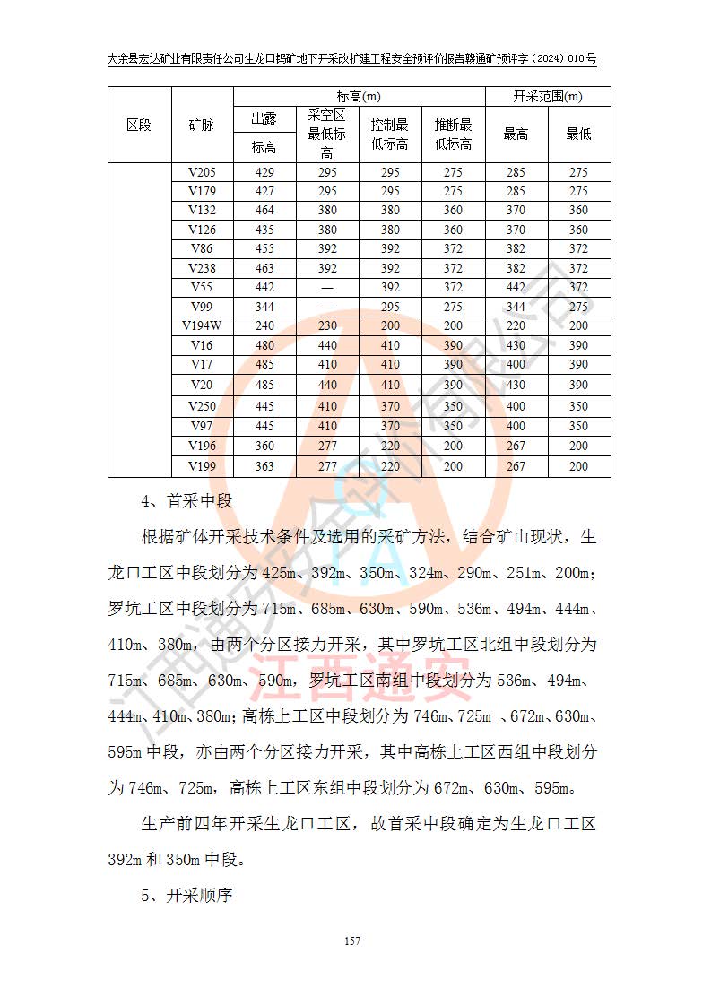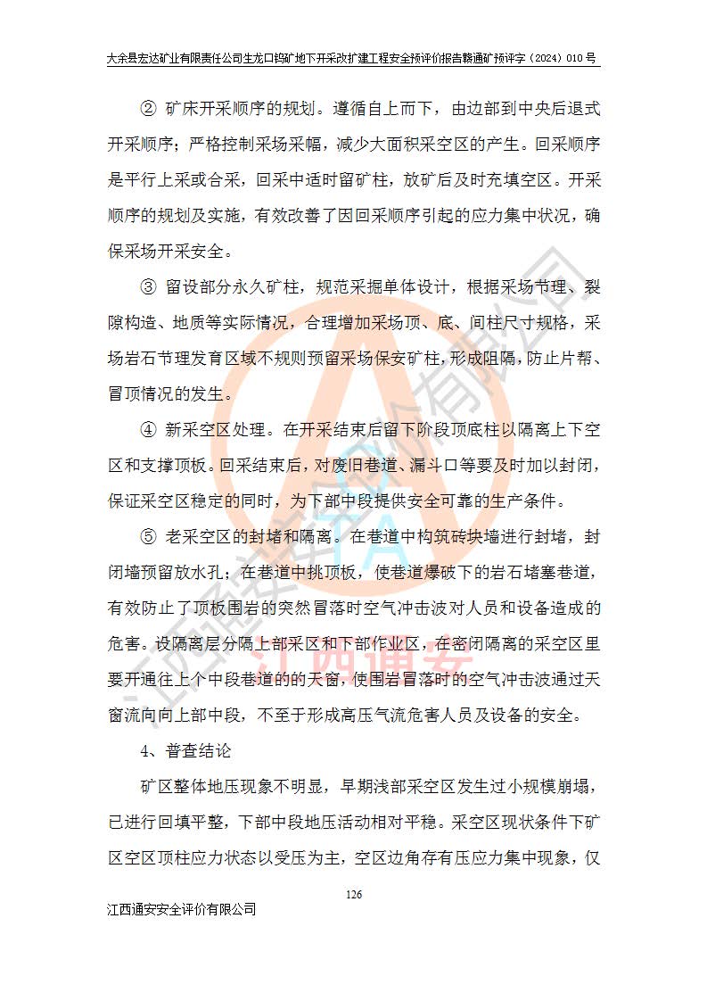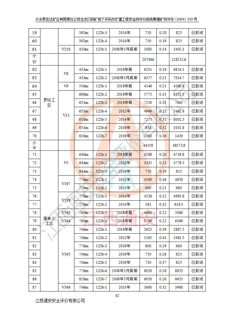 大余縣生龍口礦區(qū)鎢礦位于大余縣城北西 310°方位,距大余縣城直距 12 **,西接生龍口,北接蕩坪礦,南鄰黃木坑、西華山等礦區(qū),礦區(qū)正好是幾個(gè)礦區(qū)的銜接部位。隸屬大余縣浮江鄉(xiāng)管轄。其地理位置為:東經(jīng) 114°17′03″--114°20′11″;北緯 25°27′15″ --25 ° 28 ′ 10″ 。 礦 區(qū) 面 積 為5.97平方**。區(qū)內(nèi)交通較為方便,礦區(qū)東西兩側(cè)不遠(yuǎn)處均有公路通過(guò),西側(cè)為大余至崇義公路,東側(cè)為 大 余 至 蕩 坪 公路,通過(guò)這兩條公路均可向南與大余縣城與 323 國(guó)道相接,至贛州市區(qū)約100 **,往廣東省韶關(guān)贛韶高速約 150 **,向北達(dá)崇義縣城。 生龍口鎢礦建礦以前只有一些小規(guī)模的民采,2003年大余縣宏達(dá)礦業(yè)有限公司取得采礦權(quán),形成規(guī)模采礦,后期采礦證經(jīng)過(guò)多次延續(xù)與變更。生龍口鎢礦共設(shè)置了高棟上、羅坑、生龍口3個(gè)開(kāi)采工區(qū)。3個(gè)工區(qū)相距3**左右。 2024年9月江西晶楚工程技術(shù)有限公司編制完成了《大余縣宏達(dá)礦業(yè)有限責(zé)任公司生龍口鎢礦地下開(kāi)采改擴(kuò)建工程可行性研究報(bào)告》(以下簡(jiǎn)稱(chēng)《可研報(bào)告》)。2024年12月26日取得《江西省工業(yè)和信息化廳關(guān)于大余縣宏達(dá)礦業(yè)有限責(zé)任公司生龍口鎢礦地下開(kāi)采改擴(kuò)建工程核準(zhǔn)的批復(fù)》(贛工信有色〔2024〕49號(hào))。 根據(jù)《可研報(bào)告》,可研設(shè)計(jì)范圍為生龍口鎢礦礦區(qū)礦權(quán)范圍,平面范圍由15個(gè)拐點(diǎn)組成,開(kāi)采標(biāo)高范圍為746m~200m。本次開(kāi)采對(duì)象為開(kāi)采范圍內(nèi)的35條工業(yè)礦體,其中,大部分礦體以及接近地表處存在采空區(qū),為保護(hù)地表及井下安全作業(yè),需留設(shè)地表保安礦柱及采空區(qū)隔離礦柱;其中,高棟上工區(qū)V198、V197礦體因位于采空區(qū)后方,且資源量較少,暫不列為開(kāi)采對(duì)象;生龍口工區(qū)V98、V85、V84因利舊324m主平硐口,故作為保安礦柱,暫不予開(kāi)采??裳?*采用淺孔留礦嗣后充填法??裳?*采用平硐+盲斜坡道開(kāi)拓,一次性整體設(shè)計(jì),各工區(qū)礦石和廢石均通過(guò)溜井下放至相應(yīng)區(qū)段*低開(kāi)采中段、通過(guò)UK-6礦用自卸卡車(chē)裝載,利用內(nèi)部運(yùn)輸巷道和溜井運(yùn)至生龍口工區(qū)324m平硐(主運(yùn)輸巷道)集中出礦,各工區(qū)礦石、廢石分別運(yùn)至324平硐口附近的選礦廠和砂石骨料加工廠。井下中段**采用無(wú)軌運(yùn)輸。礦區(qū)采用分區(qū)通風(fēng)系統(tǒng)、每個(gè)工區(qū)采用單翼對(duì)角抽出機(jī)械式通風(fēng)方式;新風(fēng)主要從平硐口進(jìn)風(fēng),回風(fēng)井回風(fēng)。 本項(xiàng)目已經(jīng)符合編制安全預(yù)評(píng)價(jià)的前置條件,根據(jù)《中華人民共和國(guó)安全生產(chǎn)法》、《建設(shè)項(xiàng)目安全設(shè)施“三同時(shí)”監(jiān)督管理辦法》(**安全生產(chǎn)監(jiān)督管理局令第36號(hào))、《金屬非金屬礦山建設(shè)項(xiàng)目安全設(shè)施目錄》(**安全生產(chǎn)監(jiān)督管理總局令第75號(hào))和《**礦山安全監(jiān)察局關(guān)于進(jìn)一步加強(qiáng)非煤礦山安全生產(chǎn)行政許可工作的通知》(礦安〔2024〕70號(hào))的規(guī)定,大余縣宏達(dá)礦業(yè)有限責(zé)任公司2024年10月8日委托江西通安安全評(píng)價(jià)有限公司對(duì)其生龍口鎢礦地下開(kāi)采改擴(kuò)建工程進(jìn)行安全預(yù)評(píng)價(jià)。 |