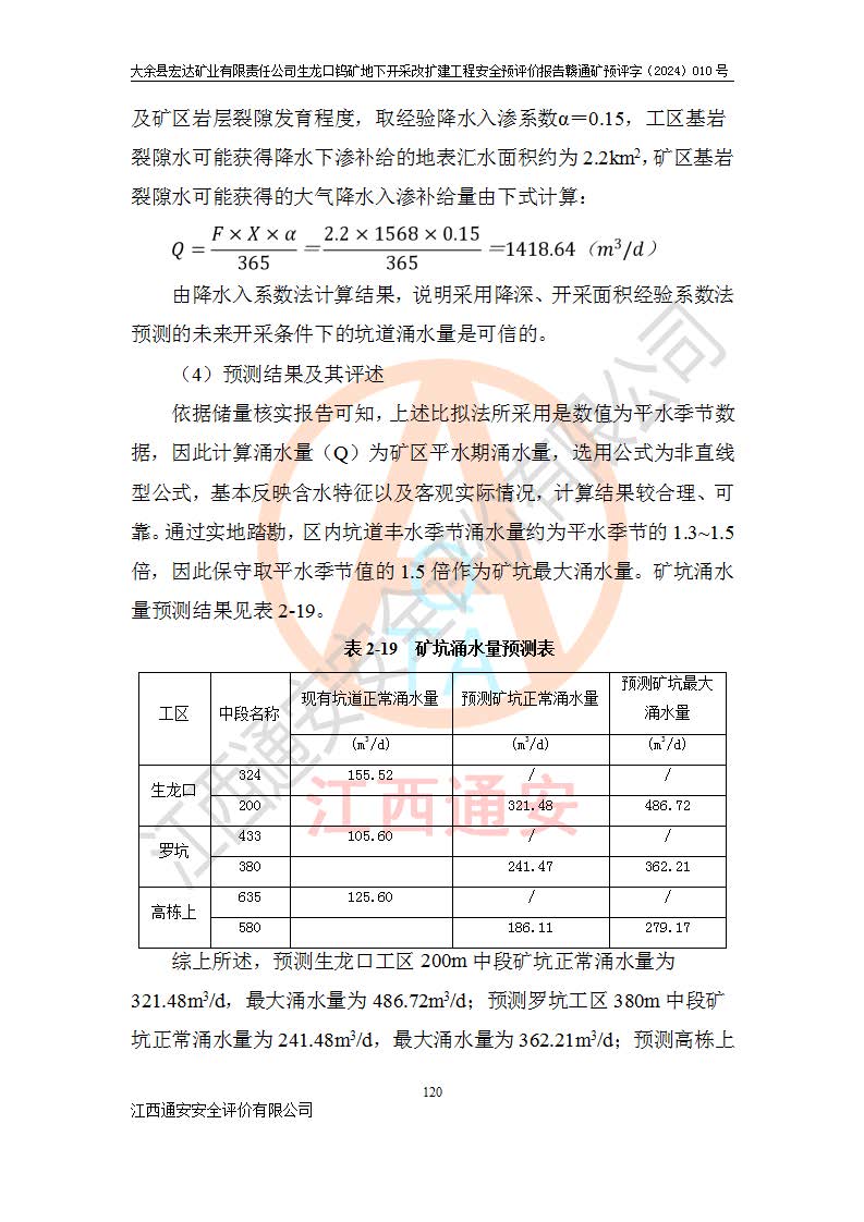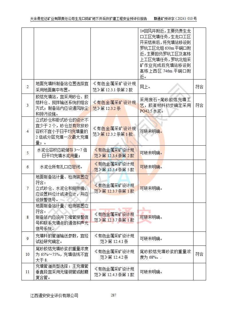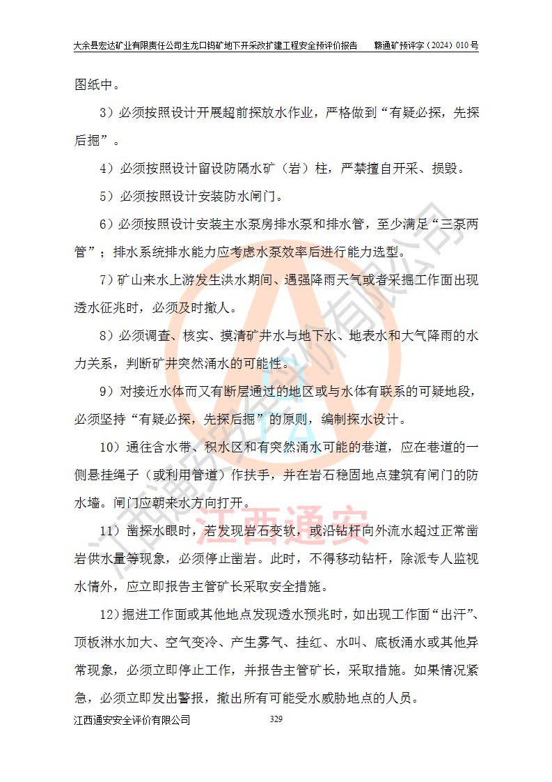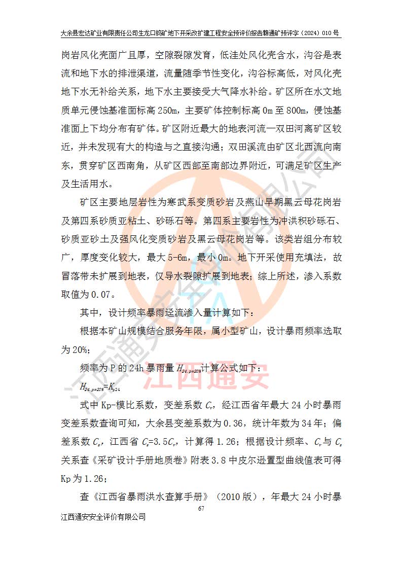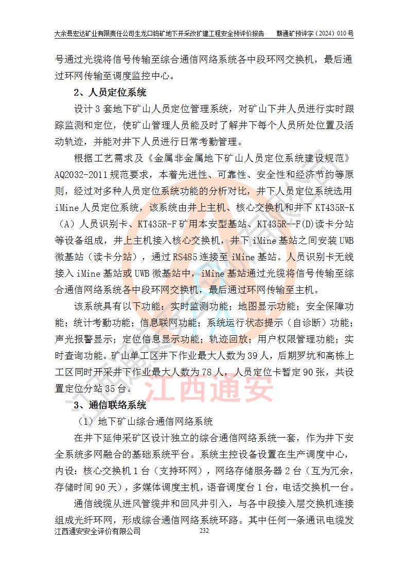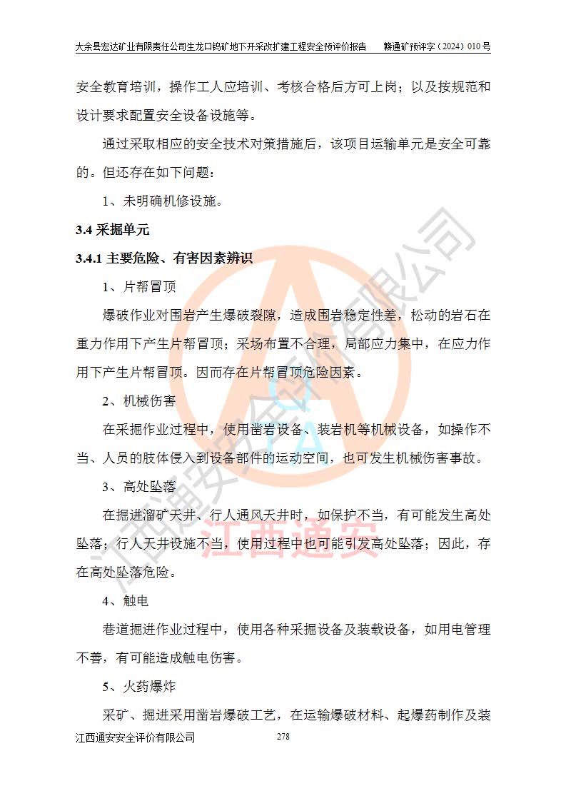 大余縣生龍口礦區(qū)鎢礦位于大余縣城北西 310°方位,距大余縣城直距 12 **,西接生龍口,北接蕩坪礦,南鄰黃木坑、西華山等礦區(qū),礦區(qū)正好是幾個(gè)礦區(qū)的銜接部位。隸屬大余縣浮江鄉(xiāng)管轄。其地理位置為:東經(jīng) 114°17′03″--114°20′11″;北緯 25°27′15″ --25 ° 28 ′ 10″ 。 礦 區(qū) 面 積 為5.97平方**。區(qū)內(nèi)交通較為方便,礦區(qū)東西兩側(cè)不遠(yuǎn)處均有公路通過(guò),西側(cè)為大余至崇義公路,東側(cè)為 大 余 至 蕩 坪 公路,通過(guò)這兩條公路均可向南與大余縣城與 323 國(guó)道相接,至贛州市區(qū)約100 **,往廣東省韶關(guān)贛韶高速約 150 **,向北達(dá)崇義縣城。 生龍口鎢礦建礦以前只有一些小規(guī)模的民采,2003年大余縣宏達(dá)礦業(yè)有限公司取得采礦權(quán),形成規(guī)模采礦,后期采礦證經(jīng)過(guò)多次延續(xù)與變更。生龍口鎢礦共設(shè)置了高棟上、羅坑、生龍口3個(gè)開(kāi)采工區(qū)。3個(gè)工區(qū)相距3**左右。 2024年9月江西晶楚工程技術(shù)有限公司編制完成了《大余縣宏達(dá)礦業(yè)有限責(zé)任公司生龍口鎢礦地下開(kāi)采改擴(kuò)建工程可行性研究報(bào)告》(以下簡(jiǎn)稱(chēng)《可研報(bào)告》)。2024年12月26日取得《江西省工業(yè)和信息化廳關(guān)于大余縣宏達(dá)礦業(yè)有限責(zé)任公司生龍口鎢礦地下開(kāi)采改擴(kuò)建工程核準(zhǔn)的批復(fù)》(贛工信有色〔2024〕49號(hào))。 根據(jù)《可研報(bào)告》,可研設(shè)計(jì)范圍為生龍口鎢礦礦區(qū)礦權(quán)范圍,平面范圍由15個(gè)拐點(diǎn)組成,開(kāi)采標(biāo)高范圍為746m~200m。本次開(kāi)采對(duì)象為開(kāi)采范圍內(nèi)的35條工業(yè)礦體,其中,大部分礦體以及接近地表處存在采空區(qū),為保護(hù)地表及井下安全作業(yè),需留設(shè)地表保安礦柱及采空區(qū)隔離礦柱;其中,高棟上工區(qū)V198、V197礦體因位于采空區(qū)后方,且資源量較少,暫不列為開(kāi)采對(duì)象;生龍口工區(qū)V98、V85、V84因利舊324m主平硐口,故作為保安礦柱,暫不予開(kāi)采??裳?*采用淺孔留礦嗣后充填法??裳?*采用平硐+盲斜坡道開(kāi)拓,一次性整體設(shè)計(jì),各工區(qū)礦石和廢石均通過(guò)溜井下放至相應(yīng)區(qū)段*低開(kāi)采中段、通過(guò)UK-6礦用自卸卡車(chē)裝載,利用內(nèi)部運(yùn)輸巷道和溜井運(yùn)至生龍口工區(qū)324m平硐(主運(yùn)輸巷道)集中出礦,各工區(qū)礦石、廢石分別運(yùn)至324平硐口附近的選礦廠和砂石骨料加工廠。井下中段**采用無(wú)軌運(yùn)輸。礦區(qū)采用分區(qū)通風(fēng)系統(tǒng)、每個(gè)工區(qū)采用單翼對(duì)角抽出機(jī)械式通風(fēng)方式;新風(fēng)主要從平硐口進(jìn)風(fēng),回風(fēng)井回風(fēng)。 本項(xiàng)目已經(jīng)符合編制安全預(yù)評(píng)價(jià)的前置條件,根據(jù)《中華人民共和國(guó)安全生產(chǎn)法》、《建設(shè)項(xiàng)目安全設(shè)施“三同時(shí)”監(jiān)督管理辦法》(**安全生產(chǎn)監(jiān)督管理局令第36號(hào))、《金屬非金屬礦山建設(shè)項(xiàng)目安全設(shè)施目錄》(**安全生產(chǎn)監(jiān)督管理總局令第75號(hào))和《**礦山安全監(jiān)察局關(guān)于進(jìn)一步加強(qiáng)非煤礦山安全生產(chǎn)行政許可工作的通知》(礦安〔2024〕70號(hào))的規(guī)定,大余縣宏達(dá)礦業(yè)有限責(zé)任公司2024年10月8日委托江西通安安全評(píng)價(jià)有限公司對(duì)其生龍口鎢礦地下開(kāi)采改擴(kuò)建工程進(jìn)行安全預(yù)評(píng)價(jià)。 |