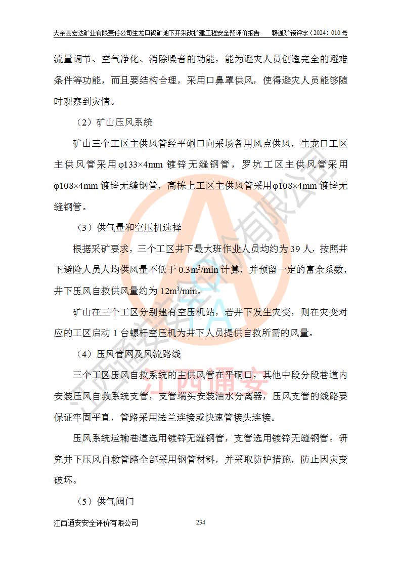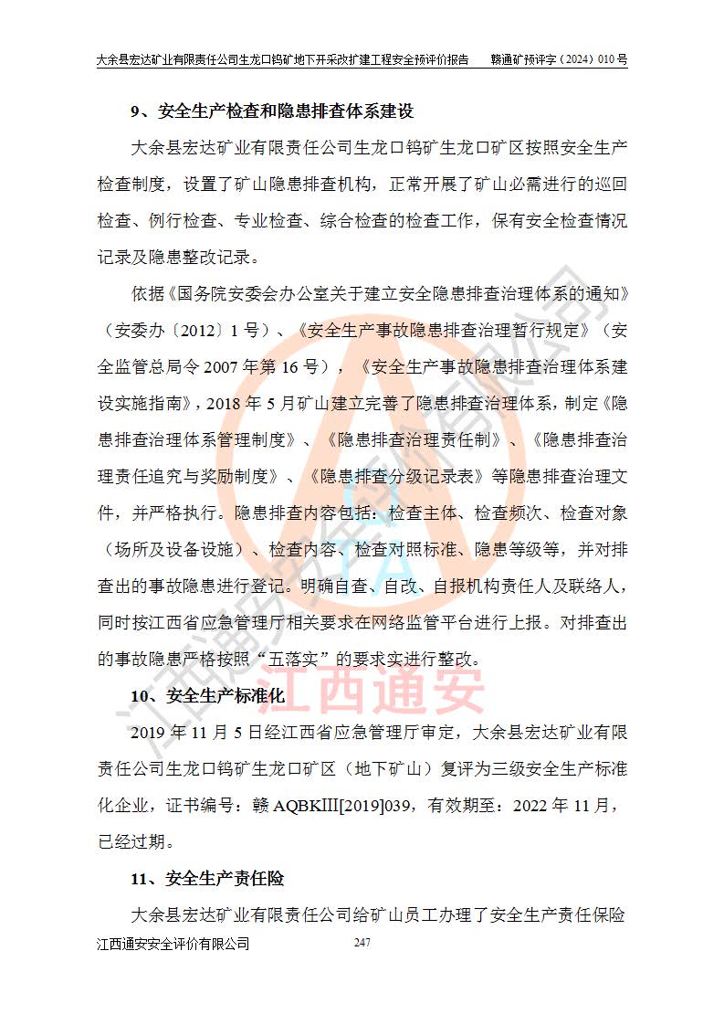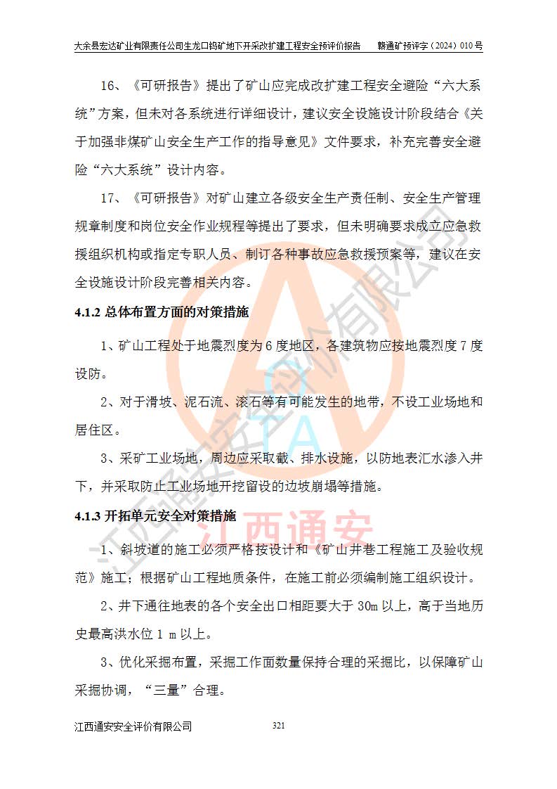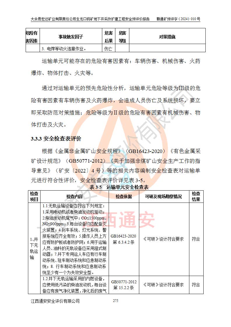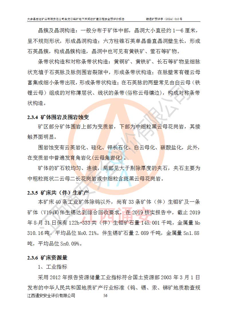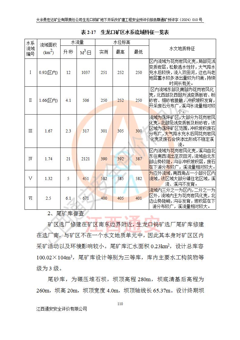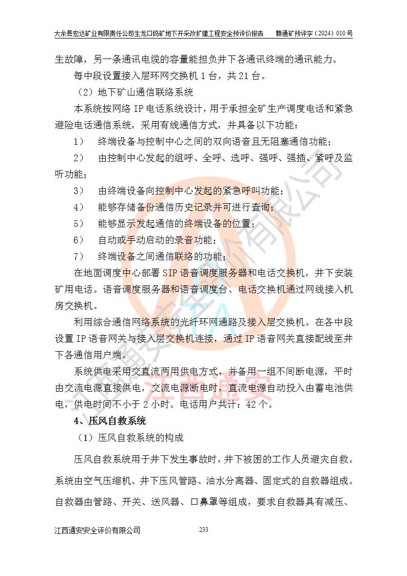 大余縣生龍口礦區(qū)鎢礦位于大余縣城北西 310°方位,距大余縣城直距 12 **,西接生龍口,北接蕩坪礦,南鄰黃木坑、西華山等礦區(qū),礦區(qū)正好是幾個(gè)礦區(qū)的銜接部位。隸屬大余縣浮江鄉(xiāng)管轄。其地理位置為:東經(jīng) 114°17′03″--114°20′11″;北緯 25°27′15″ --25 ° 28 ′ 10″ 。 礦 區(qū) 面 積 為5.97平方**。區(qū)內(nèi)交通較為方便,礦區(qū)東西兩側(cè)不遠(yuǎn)處均有公路通過(guò),西側(cè)為大余至崇義公路,東側(cè)為 大 余 至 蕩 坪 公路,通過(guò)這兩條公路均可向南與大余縣城與 323 國(guó)道相接,至贛州市區(qū)約100 **,往廣東省韶關(guān)贛韶高速約 150 **,向北達(dá)崇義縣城。 生龍口鎢礦建礦以前只有一些小規(guī)模的民采,2003年大余縣宏達(dá)礦業(yè)有限公司取得采礦權(quán),形成規(guī)模采礦,后期采礦證經(jīng)過(guò)多次延續(xù)與變更。生龍口鎢礦共設(shè)置了高棟上、羅坑、生龍口3個(gè)開(kāi)采工區(qū)。3個(gè)工區(qū)相距3**左右。 2024年9月江西晶楚工程技術(shù)有限公司編制完成了《大余縣宏達(dá)礦業(yè)有限責(zé)任公司生龍口鎢礦地下開(kāi)采改擴(kuò)建工程可行性研究報(bào)告》(以下簡(jiǎn)稱(chēng)《可研報(bào)告》)。2024年12月26日取得《江西省工業(yè)和信息化廳關(guān)于大余縣宏達(dá)礦業(yè)有限責(zé)任公司生龍口鎢礦地下開(kāi)采改擴(kuò)建工程核準(zhǔn)的批復(fù)》(贛工信有色〔2024〕49號(hào))。 根據(jù)《可研報(bào)告》,可研設(shè)計(jì)范圍為生龍口鎢礦礦區(qū)礦權(quán)范圍,平面范圍由15個(gè)拐點(diǎn)組成,開(kāi)采標(biāo)高范圍為746m~200m。本次開(kāi)采對(duì)象為開(kāi)采范圍內(nèi)的35條工業(yè)礦體,其中,大部分礦體以及接近地表處存在采空區(qū),為保護(hù)地表及井下安全作業(yè),需留設(shè)地表保安礦柱及采空區(qū)隔離礦柱;其中,高棟上工區(qū)V198、V197礦體因位于采空區(qū)后方,且資源量較少,暫不列為開(kāi)采對(duì)象;生龍口工區(qū)V98、V85、V84因利舊324m主平硐口,故作為保安礦柱,暫不予開(kāi)采??裳?*采用淺孔留礦嗣后充填法??裳?*采用平硐+盲斜坡道開(kāi)拓,一次性整體設(shè)計(jì),各工區(qū)礦石和廢石均通過(guò)溜井下放至相應(yīng)區(qū)段*低開(kāi)采中段、通過(guò)UK-6礦用自卸卡車(chē)裝載,利用內(nèi)部運(yùn)輸巷道和溜井運(yùn)至生龍口工區(qū)324m平硐(主運(yùn)輸巷道)集中出礦,各工區(qū)礦石、廢石分別運(yùn)至324平硐口附近的選礦廠和砂石骨料加工廠。井下中段**采用無(wú)軌運(yùn)輸。礦區(qū)采用分區(qū)通風(fēng)系統(tǒng)、每個(gè)工區(qū)采用單翼對(duì)角抽出機(jī)械式通風(fēng)方式;新風(fēng)主要從平硐口進(jìn)風(fēng),回風(fēng)井回風(fēng)。 本項(xiàng)目已經(jīng)符合編制安全預(yù)評(píng)價(jià)的前置條件,根據(jù)《中華人民共和國(guó)安全生產(chǎn)法》、《建設(shè)項(xiàng)目安全設(shè)施“三同時(shí)”監(jiān)督管理辦法》(**安全生產(chǎn)監(jiān)督管理局令第36號(hào))、《金屬非金屬礦山建設(shè)項(xiàng)目安全設(shè)施目錄》(**安全生產(chǎn)監(jiān)督管理總局令第75號(hào))和《**礦山安全監(jiān)察局關(guān)于進(jìn)一步加強(qiáng)非煤礦山安全生產(chǎn)行政許可工作的通知》(礦安〔2024〕70號(hào))的規(guī)定,大余縣宏達(dá)礦業(yè)有限責(zé)任公司2024年10月8日委托江西通安安全評(píng)價(jià)有限公司對(duì)其生龍口鎢礦地下開(kāi)采改擴(kuò)建工程進(jìn)行安全預(yù)評(píng)價(jià)。 |