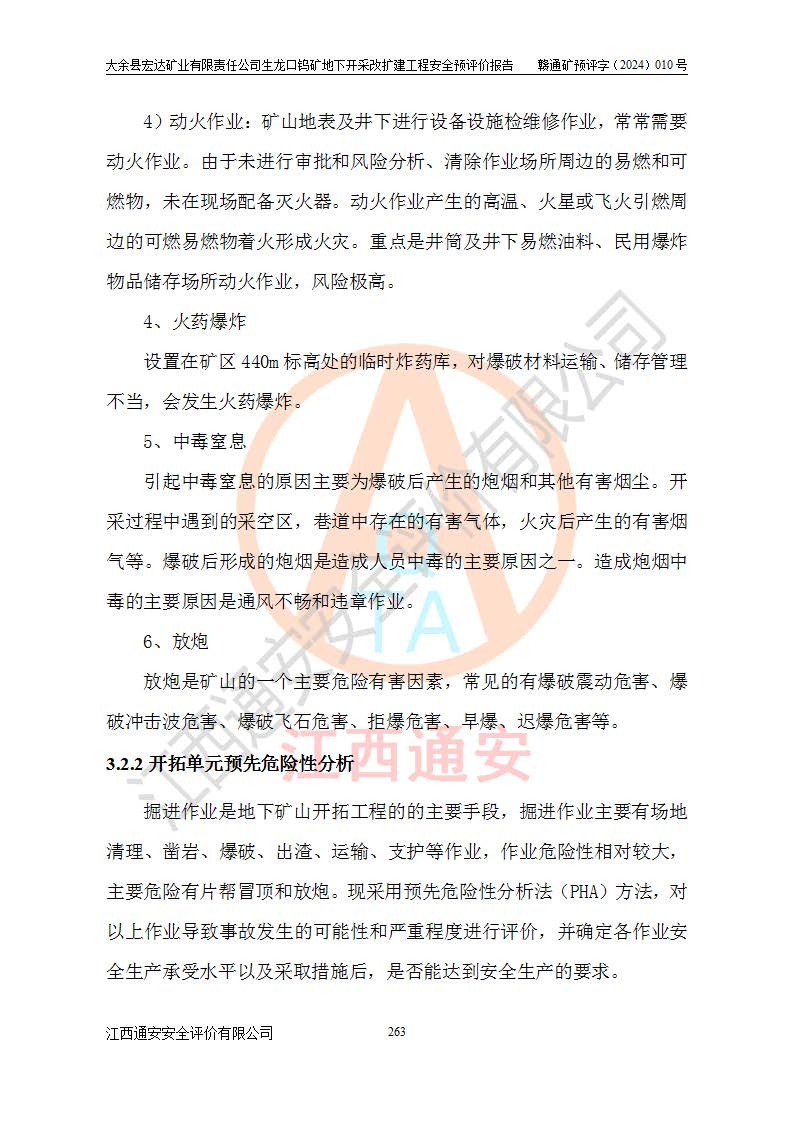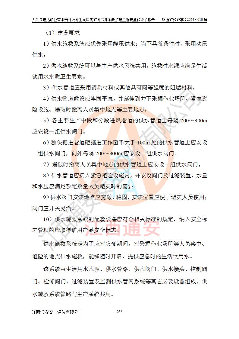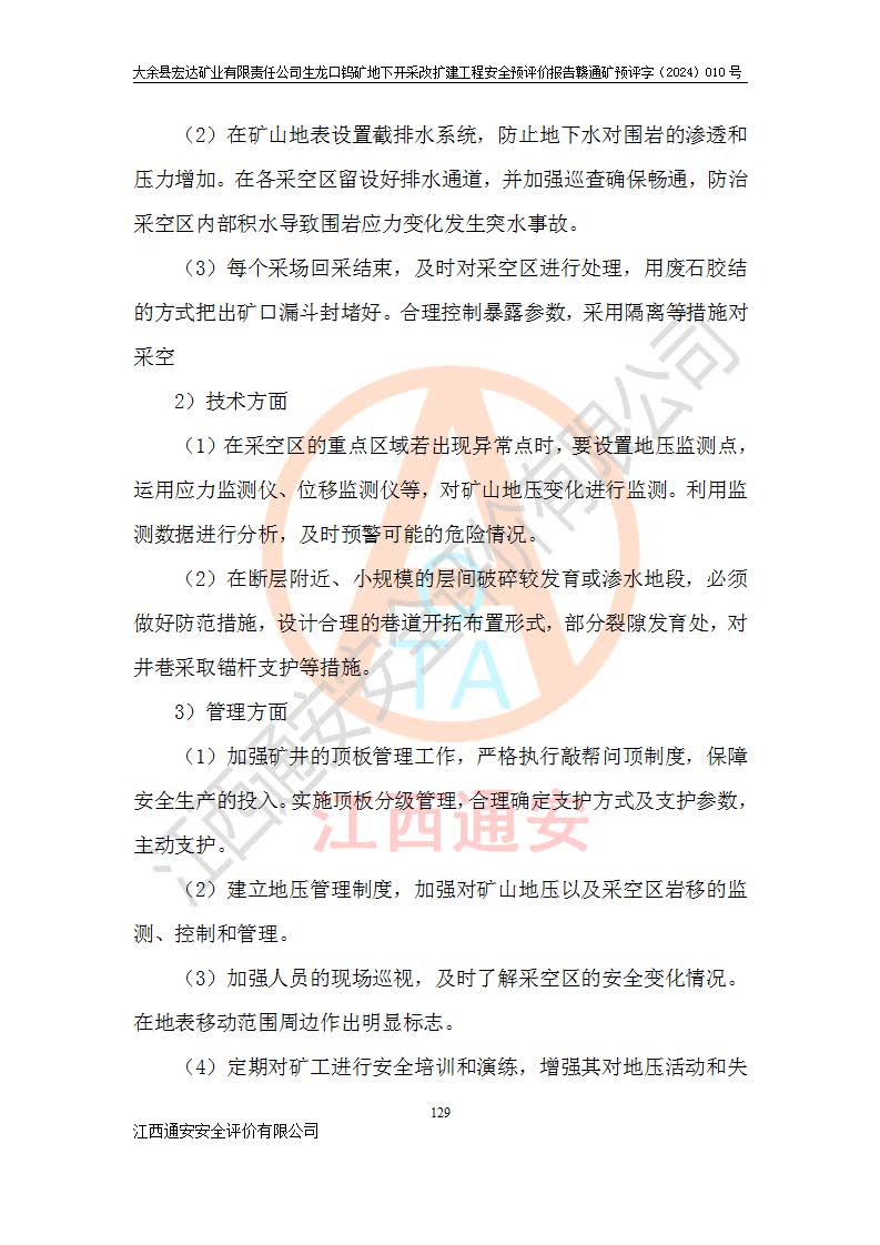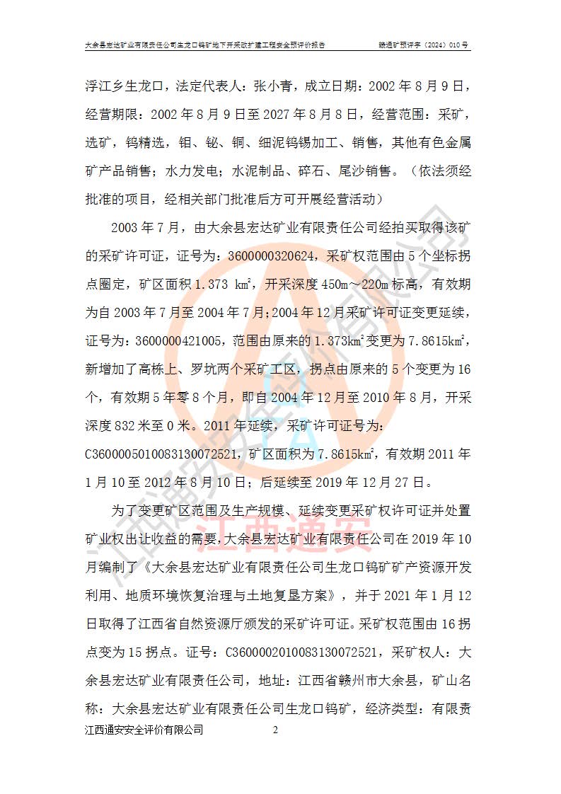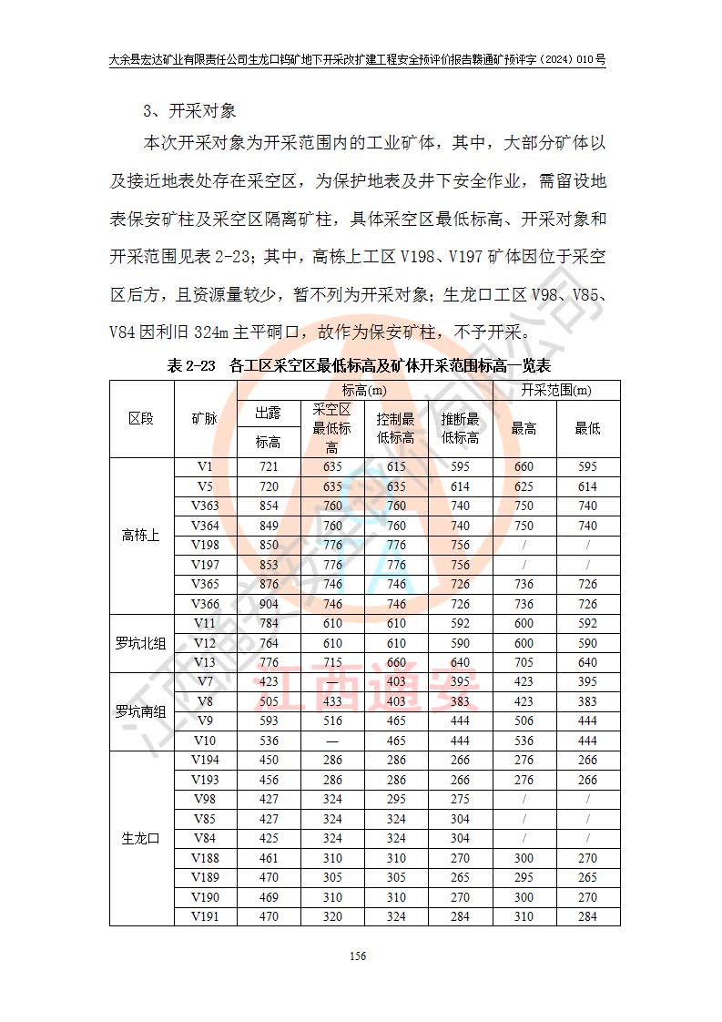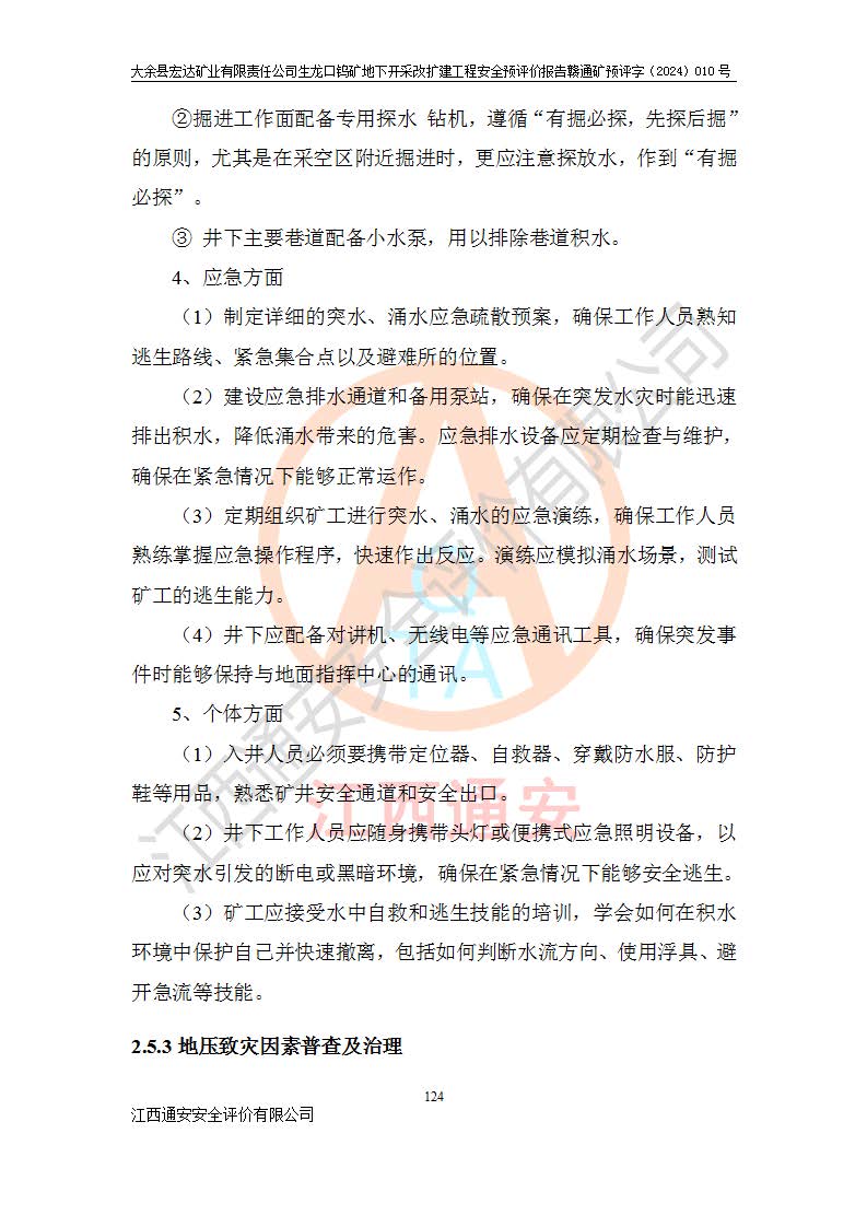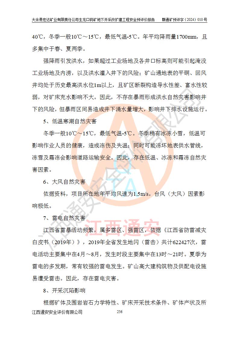 大余縣生龍口礦區(qū)鎢礦位于大余縣城北西 310°方位,距大余縣城直距 12 **,西接生龍口,北接蕩坪礦,南鄰黃木坑、西華山等礦區(qū),礦區(qū)正好是幾個(gè)礦區(qū)的銜接部位。隸屬大余縣浮江鄉(xiāng)管轄。其地理位置為:東經(jīng) 114°17′03″--114°20′11″;北緯 25°27′15″ --25 ° 28 ′ 10″ 。 礦 區(qū) 面 積 為5.97平方**。區(qū)內(nèi)交通較為方便,礦區(qū)東西兩側(cè)不遠(yuǎn)處均有公路通過(guò),西側(cè)為大余至崇義公路,東側(cè)為 大 余 至 蕩 坪 公路,通過(guò)這兩條公路均可向南與大余縣城與 323 國(guó)道相接,至贛州市區(qū)約100 **,往廣東省韶關(guān)贛韶高速約 150 **,向北達(dá)崇義縣城。 生龍口鎢礦建礦以前只有一些小規(guī)模的民采,2003年大余縣宏達(dá)礦業(yè)有限公司取得采礦權(quán),形成規(guī)模采礦,后期采礦證經(jīng)過(guò)多次延續(xù)與變更。生龍口鎢礦共設(shè)置了高棟上、羅坑、生龍口3個(gè)開(kāi)采工區(qū)。3個(gè)工區(qū)相距3**左右。 2024年9月江西晶楚工程技術(shù)有限公司編制完成了《大余縣宏達(dá)礦業(yè)有限責(zé)任公司生龍口鎢礦地下開(kāi)采改擴(kuò)建工程可行性研究報(bào)告》(以下簡(jiǎn)稱(chēng)《可研報(bào)告》)。2024年12月26日取得《江西省工業(yè)和信息化廳關(guān)于大余縣宏達(dá)礦業(yè)有限責(zé)任公司生龍口鎢礦地下開(kāi)采改擴(kuò)建工程核準(zhǔn)的批復(fù)》(贛工信有色〔2024〕49號(hào))。 根據(jù)《可研報(bào)告》,可研設(shè)計(jì)范圍為生龍口鎢礦礦區(qū)礦權(quán)范圍,平面范圍由15個(gè)拐點(diǎn)組成,開(kāi)采標(biāo)高范圍為746m~200m。本次開(kāi)采對(duì)象為開(kāi)采范圍內(nèi)的35條工業(yè)礦體,其中,大部分礦體以及接近地表處存在采空區(qū),為保護(hù)地表及井下安全作業(yè),需留設(shè)地表保安礦柱及采空區(qū)隔離礦柱;其中,高棟上工區(qū)V198、V197礦體因位于采空區(qū)后方,且資源量較少,暫不列為開(kāi)采對(duì)象;生龍口工區(qū)V98、V85、V84因利舊324m主平硐口,故作為保安礦柱,暫不予開(kāi)采??裳?*采用淺孔留礦嗣后充填法??裳?*采用平硐+盲斜坡道開(kāi)拓,一次性整體設(shè)計(jì),各工區(qū)礦石和廢石均通過(guò)溜井下放至相應(yīng)區(qū)段*低開(kāi)采中段、通過(guò)UK-6礦用自卸卡車(chē)裝載,利用內(nèi)部運(yùn)輸巷道和溜井運(yùn)至生龍口工區(qū)324m平硐(主運(yùn)輸巷道)集中出礦,各工區(qū)礦石、廢石分別運(yùn)至324平硐口附近的選礦廠和砂石骨料加工廠。井下中段**采用無(wú)軌運(yùn)輸。礦區(qū)采用分區(qū)通風(fēng)系統(tǒng)、每個(gè)工區(qū)采用單翼對(duì)角抽出機(jī)械式通風(fēng)方式;新風(fēng)主要從平硐口進(jìn)風(fēng),回風(fēng)井回風(fēng)。 本項(xiàng)目已經(jīng)符合編制安全預(yù)評(píng)價(jià)的前置條件,根據(jù)《中華人民共和國(guó)安全生產(chǎn)法》、《建設(shè)項(xiàng)目安全設(shè)施“三同時(shí)”監(jiān)督管理辦法》(**安全生產(chǎn)監(jiān)督管理局令第36號(hào))、《金屬非金屬礦山建設(shè)項(xiàng)目安全設(shè)施目錄》(**安全生產(chǎn)監(jiān)督管理總局令第75號(hào))和《**礦山安全監(jiān)察局關(guān)于進(jìn)一步加強(qiáng)非煤礦山安全生產(chǎn)行政許可工作的通知》(礦安〔2024〕70號(hào))的規(guī)定,大余縣宏達(dá)礦業(yè)有限責(zé)任公司2024年10月8日委托江西通安安全評(píng)價(jià)有限公司對(duì)其生龍口鎢礦地下開(kāi)采改擴(kuò)建工程進(jìn)行安全預(yù)評(píng)價(jià)。 |