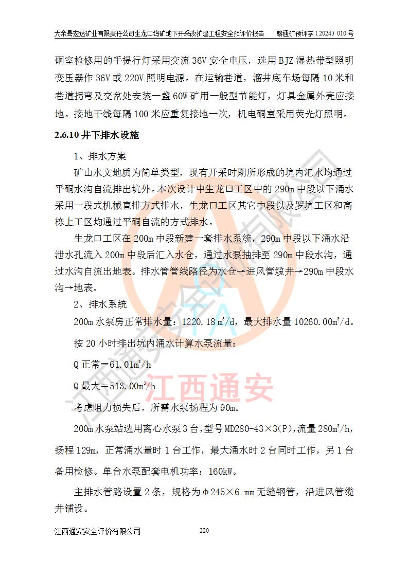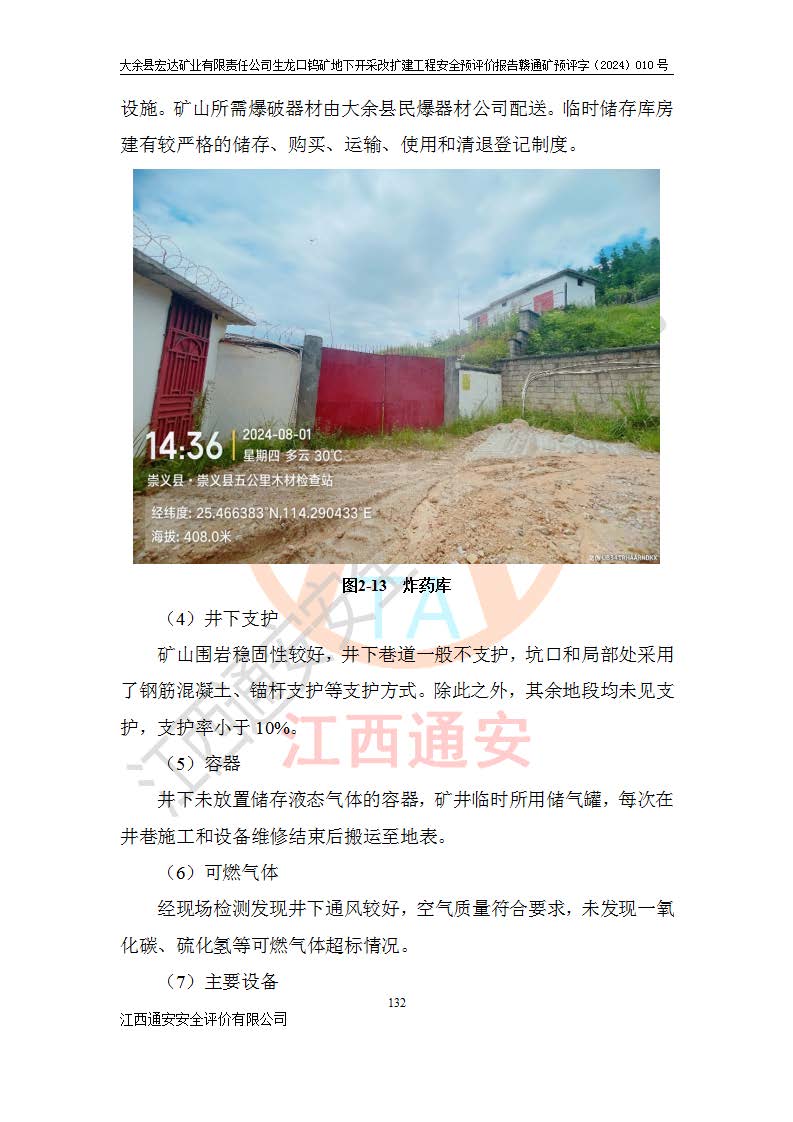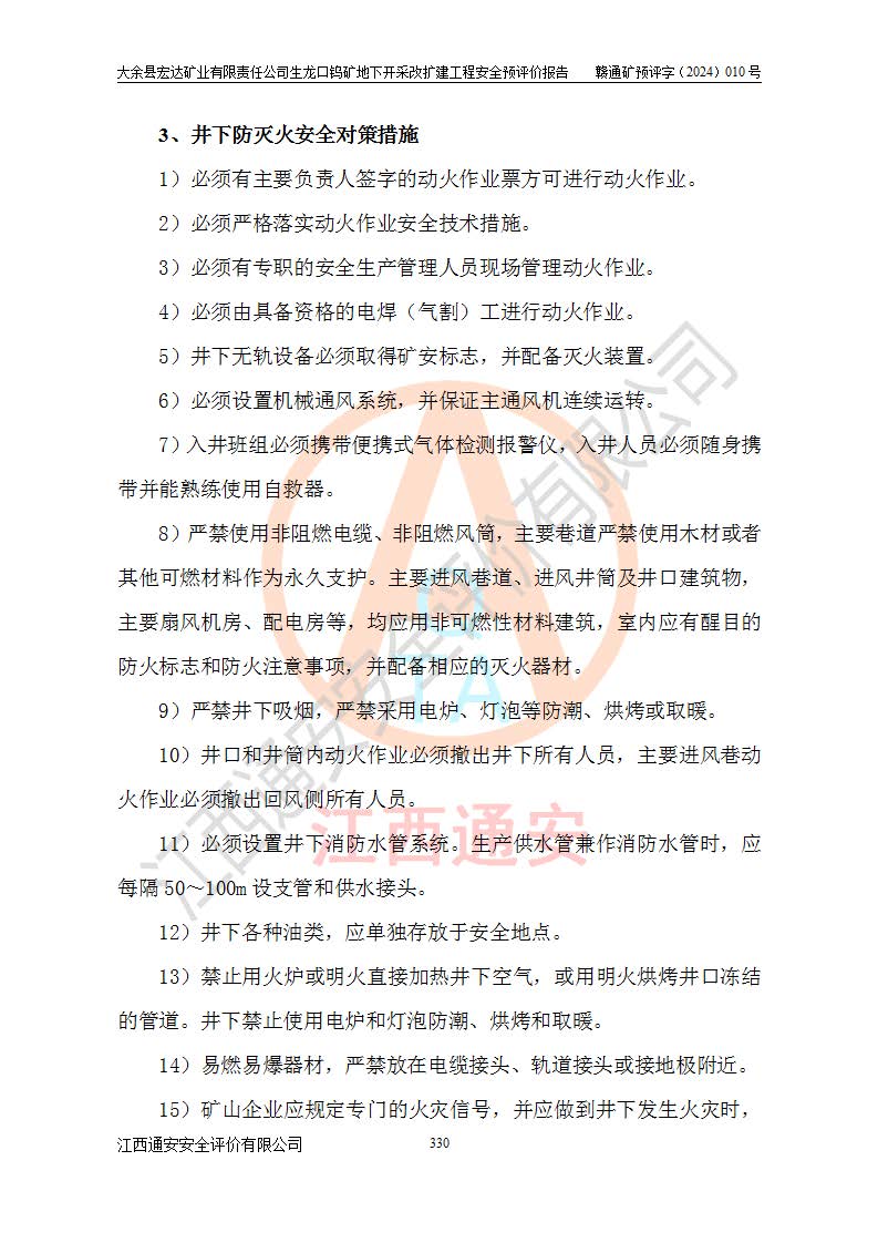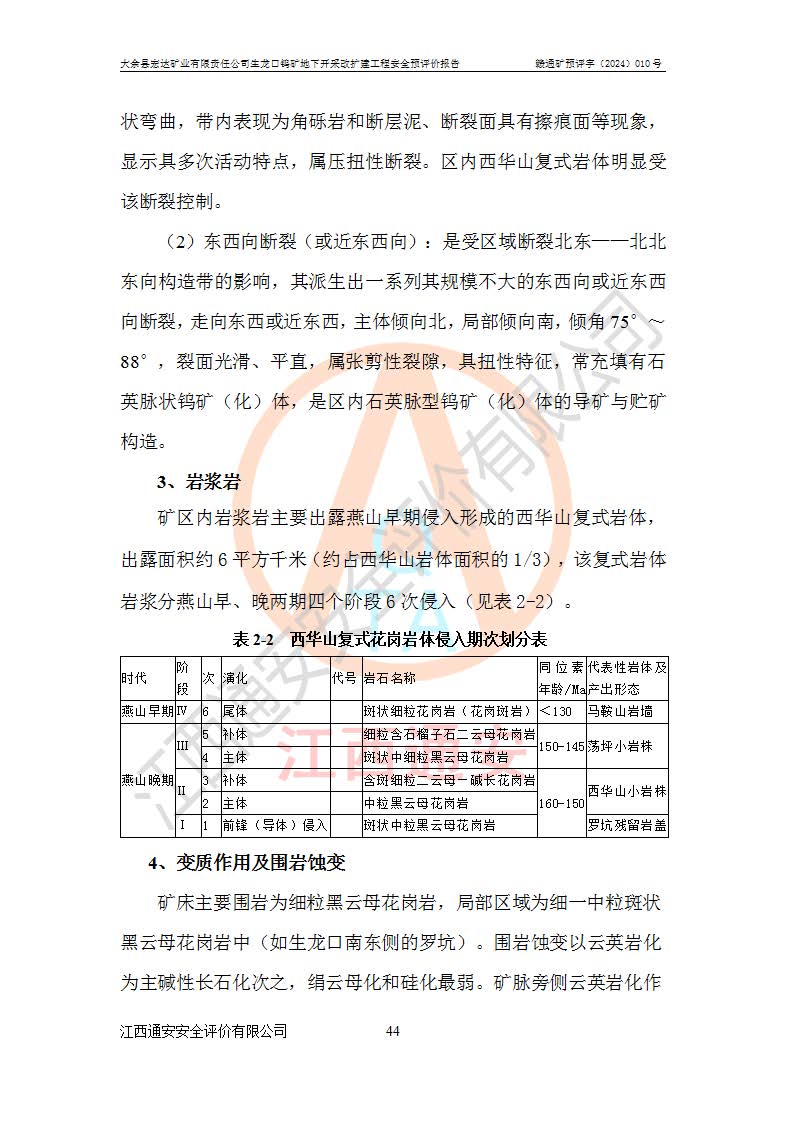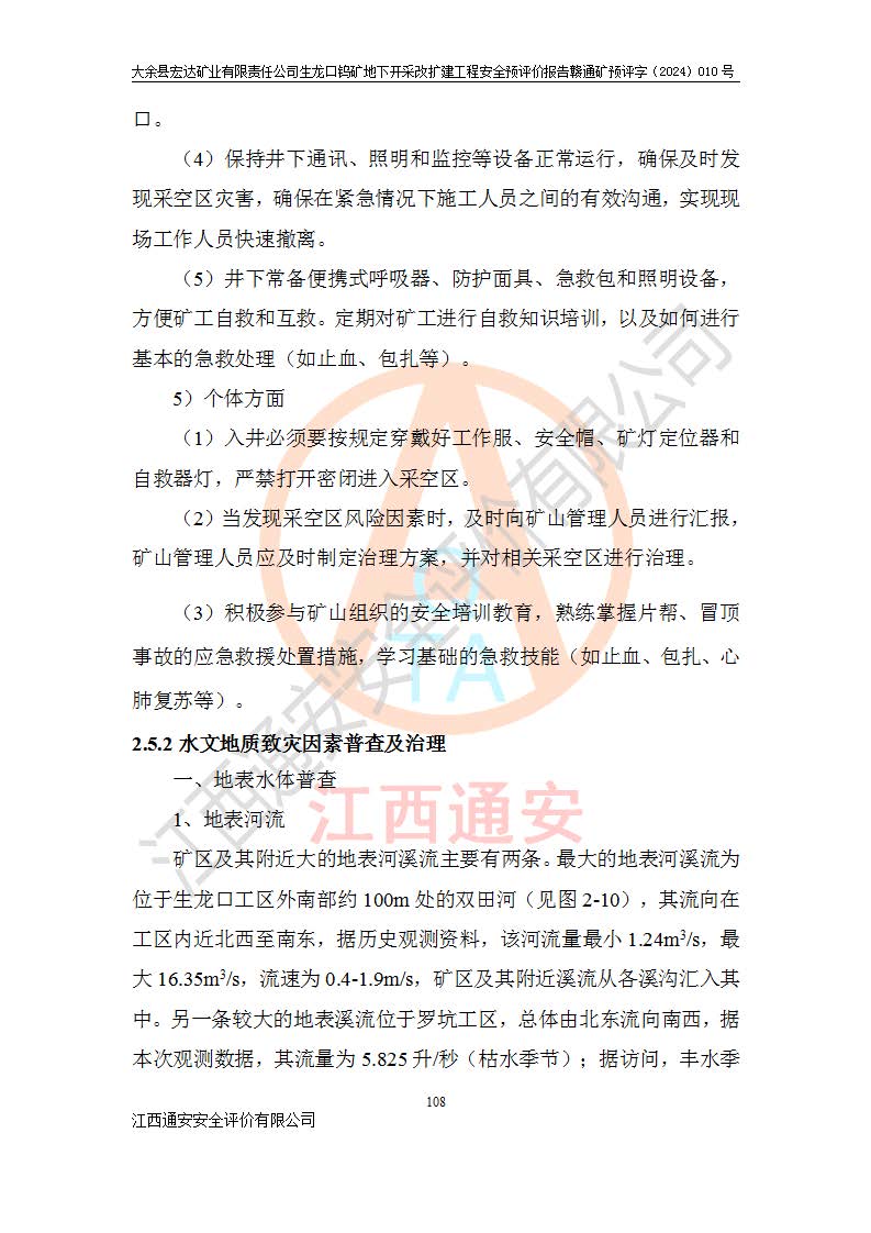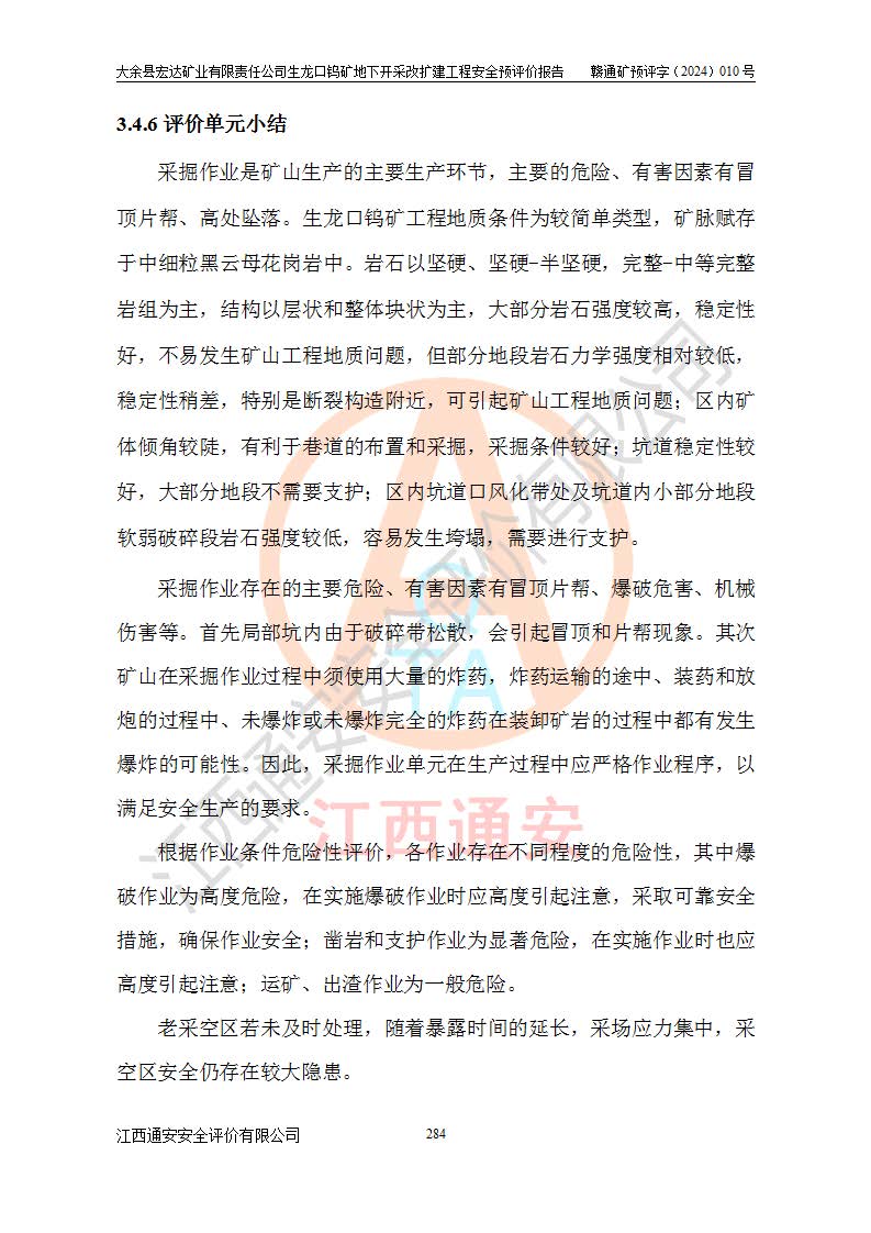 大余縣生龍口礦區(qū)鎢礦位于大余縣城北西 310°方位,距大余縣城直距 12 **,西接生龍口,北接蕩坪礦,南鄰黃木坑、西華山等礦區(qū),礦區(qū)正好是幾個(gè)礦區(qū)的銜接部位。隸屬大余縣浮江鄉(xiāng)管轄。其地理位置為:東經(jīng) 114°17′03″--114°20′11″;北緯 25°27′15″ --25 ° 28 ′ 10″ 。 礦 區(qū) 面 積 為5.97平方**。區(qū)內(nèi)交通較為方便,礦區(qū)東西兩側(cè)不遠(yuǎn)處均有公路通過(guò),西側(cè)為大余至崇義公路,東側(cè)為 大 余 至 蕩 坪 公路,通過(guò)這兩條公路均可向南與大余縣城與 323 國(guó)道相接,至贛州市區(qū)約100 **,往廣東省韶關(guān)贛韶高速約 150 **,向北達(dá)崇義縣城。 生龍口鎢礦建礦以前只有一些小規(guī)模的民采,2003年大余縣宏達(dá)礦業(yè)有限公司取得采礦權(quán),形成規(guī)模采礦,后期采礦證經(jīng)過(guò)多次延續(xù)與變更。生龍口鎢礦共設(shè)置了高棟上、羅坑、生龍口3個(gè)開(kāi)采工區(qū)。3個(gè)工區(qū)相距3**左右。 2024年9月江西晶楚工程技術(shù)有限公司編制完成了《大余縣宏達(dá)礦業(yè)有限責(zé)任公司生龍口鎢礦地下開(kāi)采改擴(kuò)建工程可行性研究報(bào)告》(以下簡(jiǎn)稱(chēng)《可研報(bào)告》)。2024年12月26日取得《江西省工業(yè)和信息化廳關(guān)于大余縣宏達(dá)礦業(yè)有限責(zé)任公司生龍口鎢礦地下開(kāi)采改擴(kuò)建工程核準(zhǔn)的批復(fù)》(贛工信有色〔2024〕49號(hào))。 根據(jù)《可研報(bào)告》,可研設(shè)計(jì)范圍為生龍口鎢礦礦區(qū)礦權(quán)范圍,平面范圍由15個(gè)拐點(diǎn)組成,開(kāi)采標(biāo)高范圍為746m~200m。本次開(kāi)采對(duì)象為開(kāi)采范圍內(nèi)的35條工業(yè)礦體,其中,大部分礦體以及接近地表處存在采空區(qū),為保護(hù)地表及井下安全作業(yè),需留設(shè)地表保安礦柱及采空區(qū)隔離礦柱;其中,高棟上工區(qū)V198、V197礦體因位于采空區(qū)后方,且資源量較少,暫不列為開(kāi)采對(duì)象;生龍口工區(qū)V98、V85、V84因利舊324m主平硐口,故作為保安礦柱,暫不予開(kāi)采??裳?*采用淺孔留礦嗣后充填法??裳?*采用平硐+盲斜坡道開(kāi)拓,一次性整體設(shè)計(jì),各工區(qū)礦石和廢石均通過(guò)溜井下放至相應(yīng)區(qū)段*低開(kāi)采中段、通過(guò)UK-6礦用自卸卡車(chē)裝載,利用內(nèi)部運(yùn)輸巷道和溜井運(yùn)至生龍口工區(qū)324m平硐(主運(yùn)輸巷道)集中出礦,各工區(qū)礦石、廢石分別運(yùn)至324平硐口附近的選礦廠和砂石骨料加工廠。井下中段**采用無(wú)軌運(yùn)輸。礦區(qū)采用分區(qū)通風(fēng)系統(tǒng)、每個(gè)工區(qū)采用單翼對(duì)角抽出機(jī)械式通風(fēng)方式;新風(fēng)主要從平硐口進(jìn)風(fēng),回風(fēng)井回風(fēng)。 本項(xiàng)目已經(jīng)符合編制安全預(yù)評(píng)價(jià)的前置條件,根據(jù)《中華人民共和國(guó)安全生產(chǎn)法》、《建設(shè)項(xiàng)目安全設(shè)施“三同時(shí)”監(jiān)督管理辦法》(**安全生產(chǎn)監(jiān)督管理局令第36號(hào))、《金屬非金屬礦山建設(shè)項(xiàng)目安全設(shè)施目錄》(**安全生產(chǎn)監(jiān)督管理總局令第75號(hào))和《**礦山安全監(jiān)察局關(guān)于進(jìn)一步加強(qiáng)非煤礦山安全生產(chǎn)行政許可工作的通知》(礦安〔2024〕70號(hào))的規(guī)定,大余縣宏達(dá)礦業(yè)有限責(zé)任公司2024年10月8日委托江西通安安全評(píng)價(jià)有限公司對(duì)其生龍口鎢礦地下開(kāi)采改擴(kuò)建工程進(jìn)行安全預(yù)評(píng)價(jià)。 |