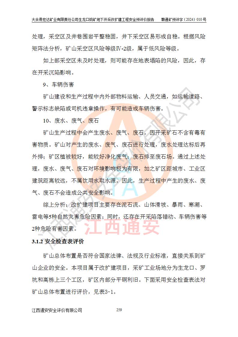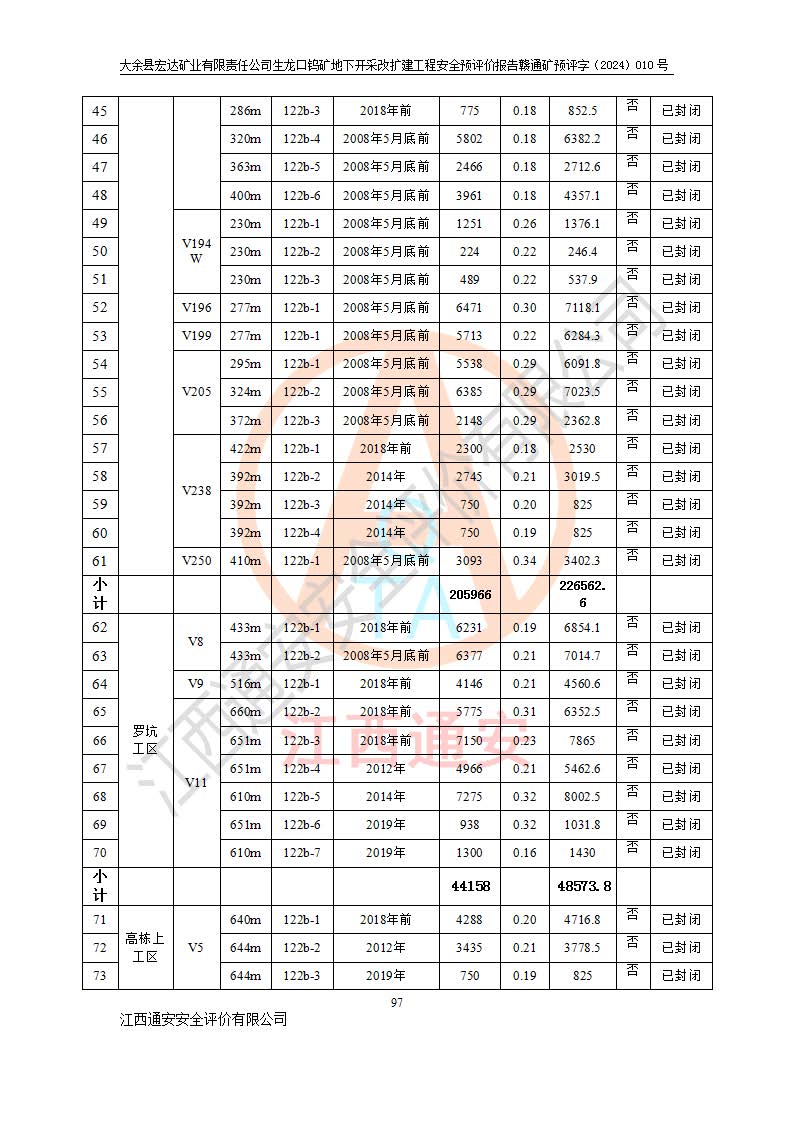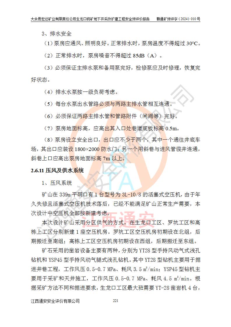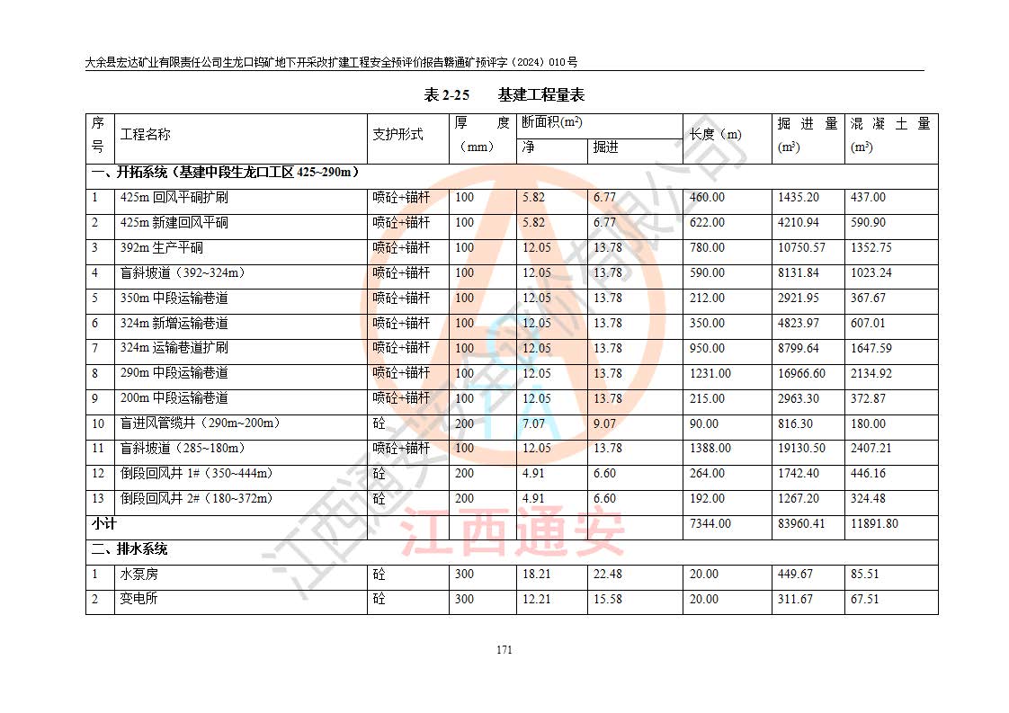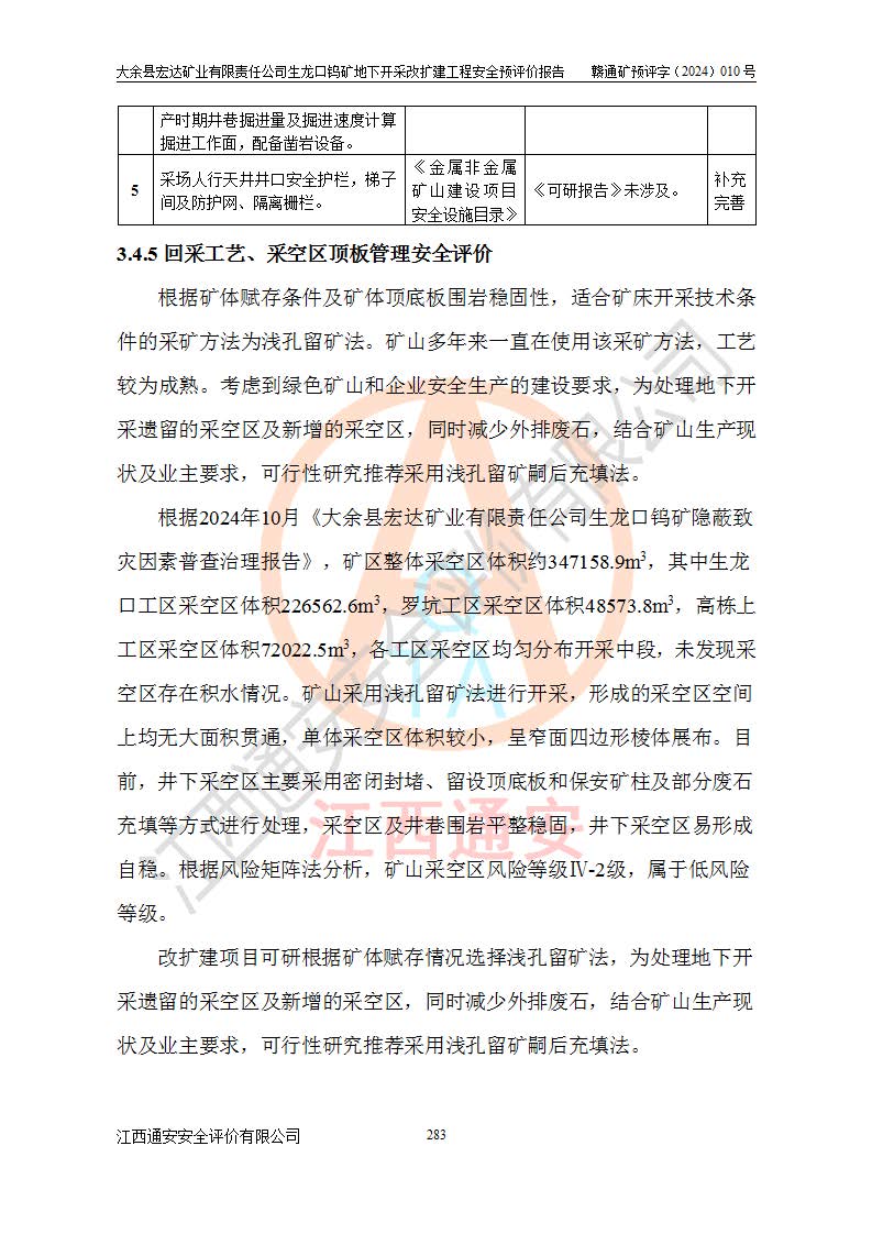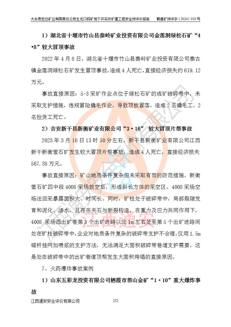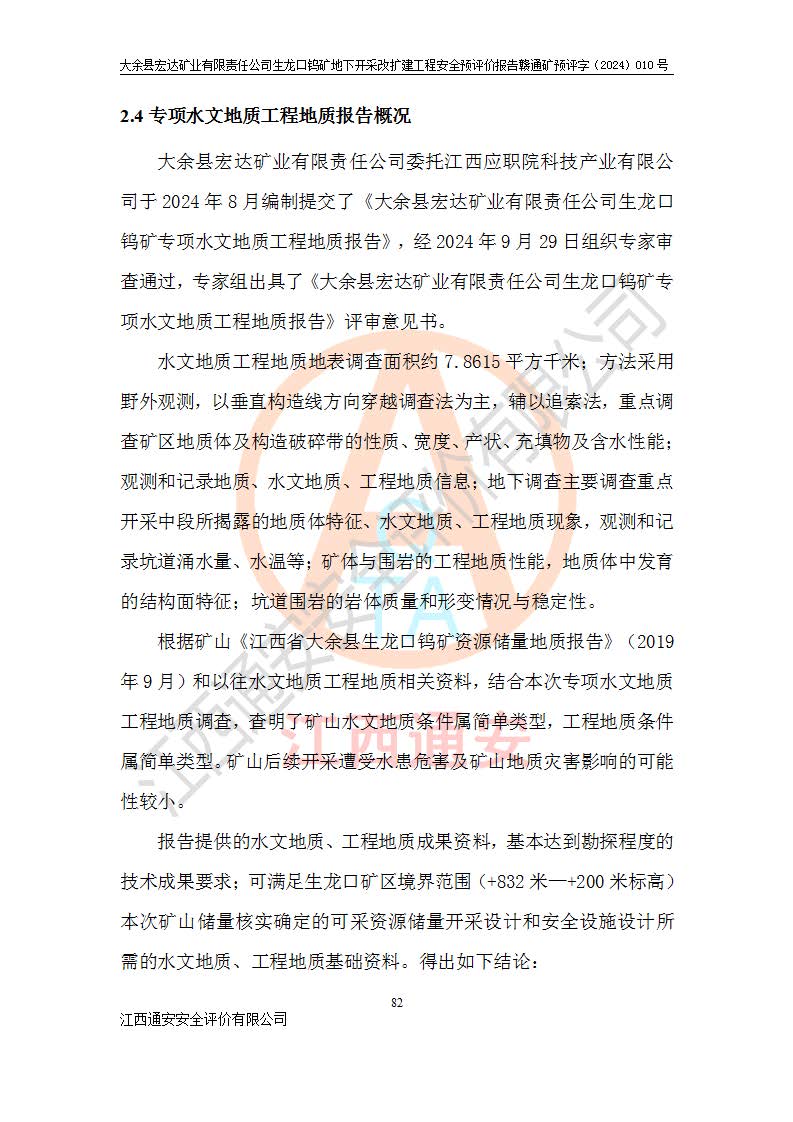 大余縣生龍口礦區(qū)鎢礦位于大余縣城北西 310°方位,距大余縣城直距 12 **,西接生龍口,北接蕩坪礦,南鄰黃木坑、西華山等礦區(qū),礦區(qū)正好是幾個(gè)礦區(qū)的銜接部位。隸屬大余縣浮江鄉(xiāng)管轄。其地理位置為:東經(jīng) 114°17′03″--114°20′11″;北緯 25°27′15″ --25 ° 28 ′ 10″ 。 礦 區(qū) 面 積 為5.97平方**。區(qū)內(nèi)交通較為方便,礦區(qū)東西兩側(cè)不遠(yuǎn)處均有公路通過(guò),西側(cè)為大余至崇義公路,東側(cè)為 大 余 至 蕩 坪 公路,通過(guò)這兩條公路均可向南與大余縣城與 323 國(guó)道相接,至贛州市區(qū)約100 **,往廣東省韶關(guān)贛韶高速約 150 **,向北達(dá)崇義縣城。 生龍口鎢礦建礦以前只有一些小規(guī)模的民采,2003年大余縣宏達(dá)礦業(yè)有限公司取得采礦權(quán),形成規(guī)模采礦,后期采礦證經(jīng)過(guò)多次延續(xù)與變更。生龍口鎢礦共設(shè)置了高棟上、羅坑、生龍口3個(gè)開(kāi)采工區(qū)。3個(gè)工區(qū)相距3**左右。 2024年9月江西晶楚工程技術(shù)有限公司編制完成了《大余縣宏達(dá)礦業(yè)有限責(zé)任公司生龍口鎢礦地下開(kāi)采改擴(kuò)建工程可行性研究報(bào)告》(以下簡(jiǎn)稱(chēng)《可研報(bào)告》)。2024年12月26日取得《江西省工業(yè)和信息化廳關(guān)于大余縣宏達(dá)礦業(yè)有限責(zé)任公司生龍口鎢礦地下開(kāi)采改擴(kuò)建工程核準(zhǔn)的批復(fù)》(贛工信有色〔2024〕49號(hào))。 根據(jù)《可研報(bào)告》,可研設(shè)計(jì)范圍為生龍口鎢礦礦區(qū)礦權(quán)范圍,平面范圍由15個(gè)拐點(diǎn)組成,開(kāi)采標(biāo)高范圍為746m~200m。本次開(kāi)采對(duì)象為開(kāi)采范圍內(nèi)的35條工業(yè)礦體,其中,大部分礦體以及接近地表處存在采空區(qū),為保護(hù)地表及井下安全作業(yè),需留設(shè)地表保安礦柱及采空區(qū)隔離礦柱;其中,高棟上工區(qū)V198、V197礦體因位于采空區(qū)后方,且資源量較少,暫不列為開(kāi)采對(duì)象;生龍口工區(qū)V98、V85、V84因利舊324m主平硐口,故作為保安礦柱,暫不予開(kāi)采??裳?*采用淺孔留礦嗣后充填法??裳?*采用平硐+盲斜坡道開(kāi)拓,一次性整體設(shè)計(jì),各工區(qū)礦石和廢石均通過(guò)溜井下放至相應(yīng)區(qū)段*低開(kāi)采中段、通過(guò)UK-6礦用自卸卡車(chē)裝載,利用內(nèi)部運(yùn)輸巷道和溜井運(yùn)至生龍口工區(qū)324m平硐(主運(yùn)輸巷道)集中出礦,各工區(qū)礦石、廢石分別運(yùn)至324平硐口附近的選礦廠和砂石骨料加工廠。井下中段**采用無(wú)軌運(yùn)輸。礦區(qū)采用分區(qū)通風(fēng)系統(tǒng)、每個(gè)工區(qū)采用單翼對(duì)角抽出機(jī)械式通風(fēng)方式;新風(fēng)主要從平硐口進(jìn)風(fēng),回風(fēng)井回風(fēng)。 本項(xiàng)目已經(jīng)符合編制安全預(yù)評(píng)價(jià)的前置條件,根據(jù)《中華人民共和國(guó)安全生產(chǎn)法》、《建設(shè)項(xiàng)目安全設(shè)施“三同時(shí)”監(jiān)督管理辦法》(**安全生產(chǎn)監(jiān)督管理局令第36號(hào))、《金屬非金屬礦山建設(shè)項(xiàng)目安全設(shè)施目錄》(**安全生產(chǎn)監(jiān)督管理總局令第75號(hào))和《**礦山安全監(jiān)察局關(guān)于進(jìn)一步加強(qiáng)非煤礦山安全生產(chǎn)行政許可工作的通知》(礦安〔2024〕70號(hào))的規(guī)定,大余縣宏達(dá)礦業(yè)有限責(zé)任公司2024年10月8日委托江西通安安全評(píng)價(jià)有限公司對(duì)其生龍口鎢礦地下開(kāi)采改擴(kuò)建工程進(jìn)行安全預(yù)評(píng)價(jià)。 |