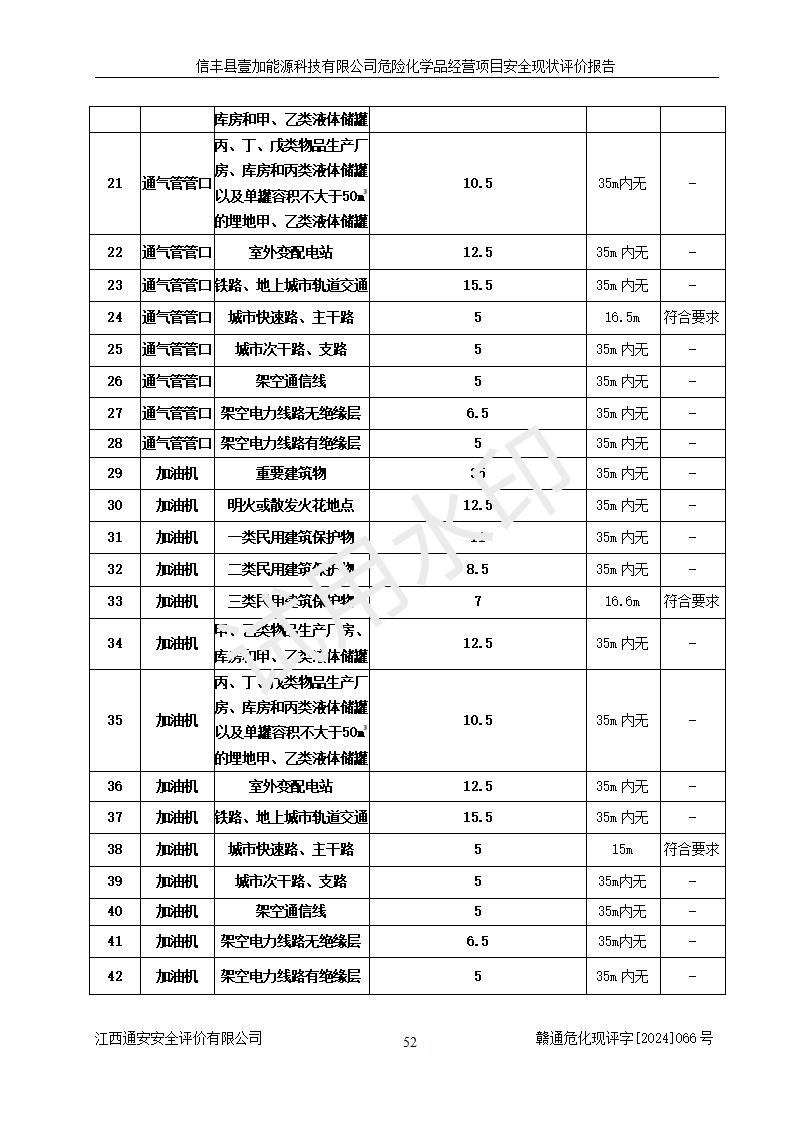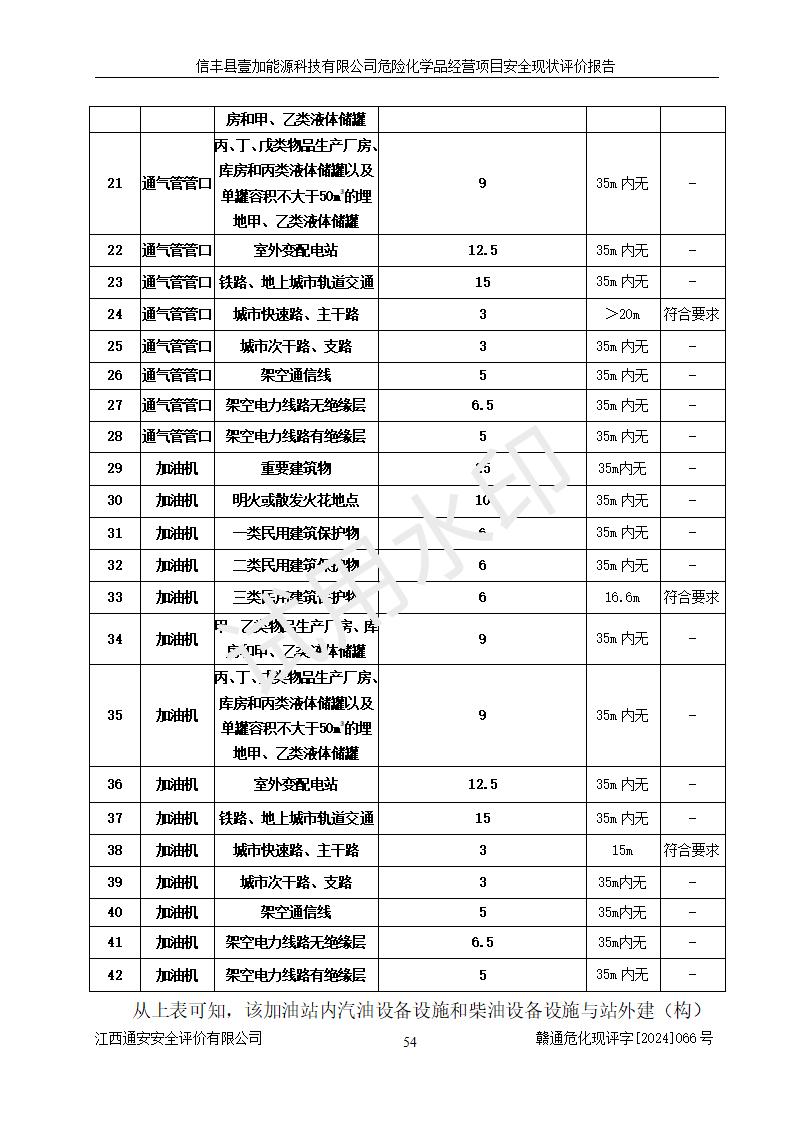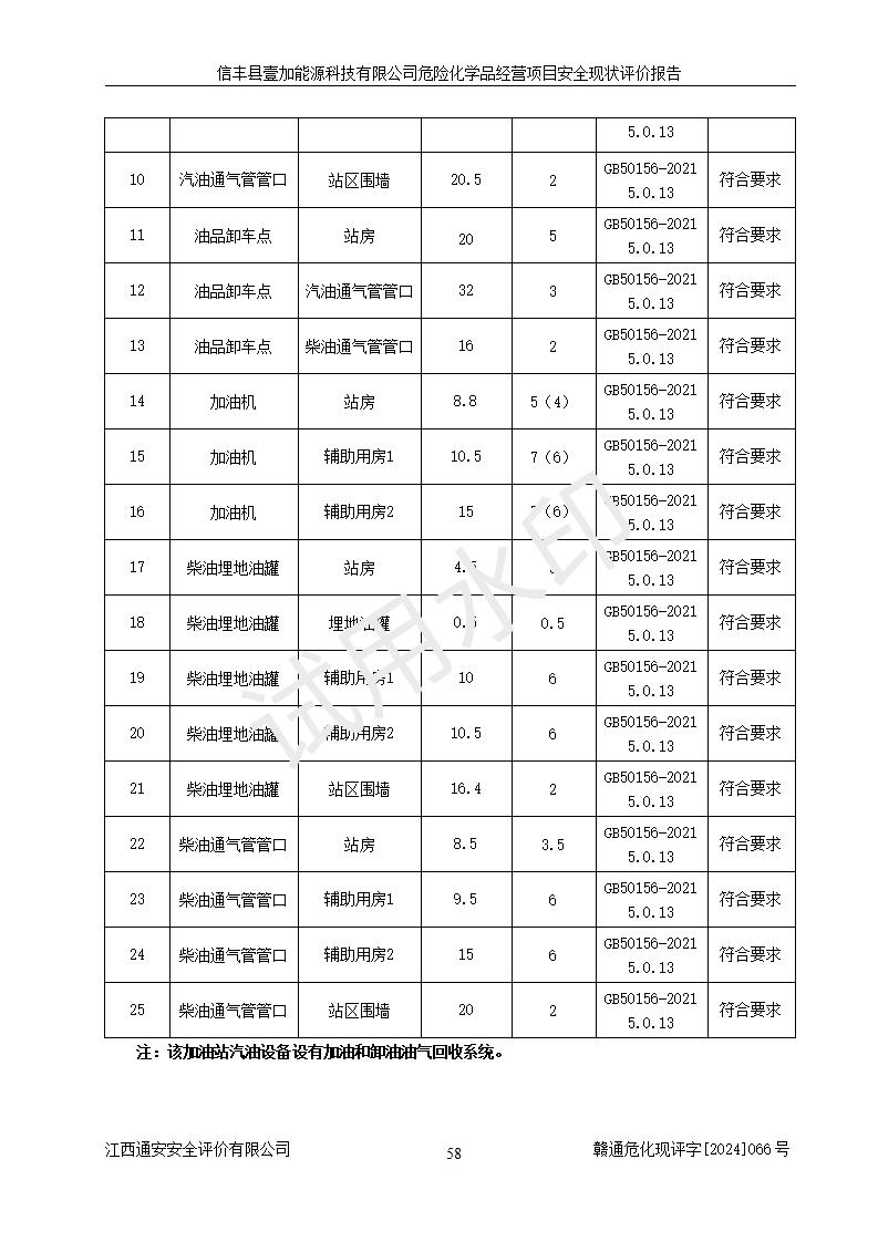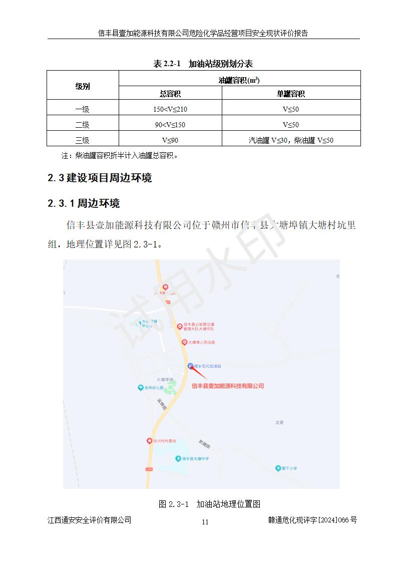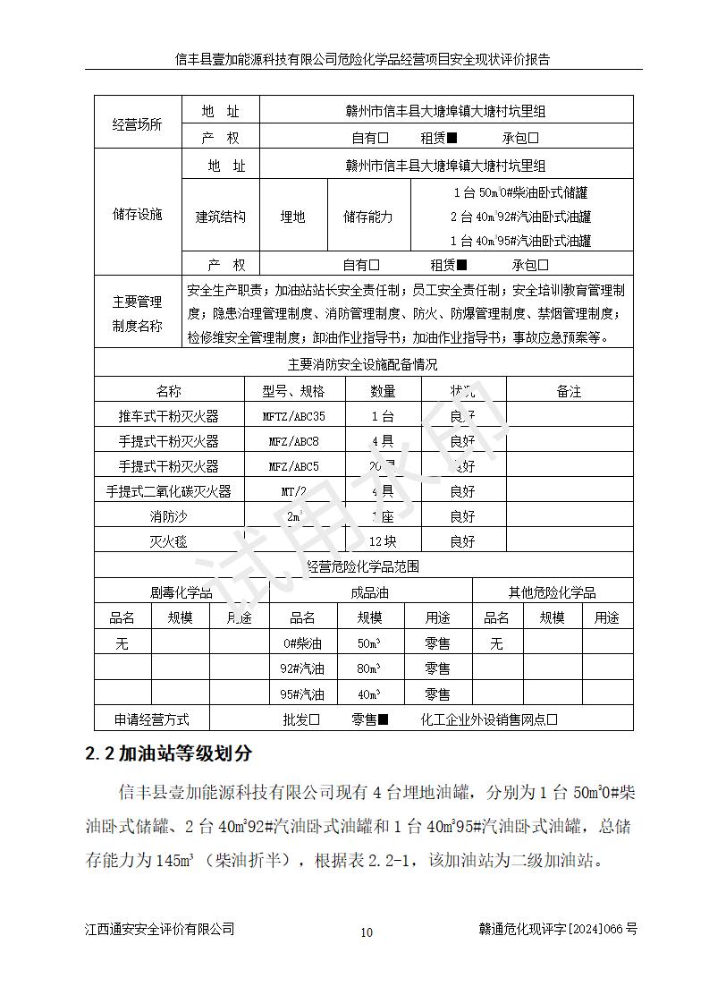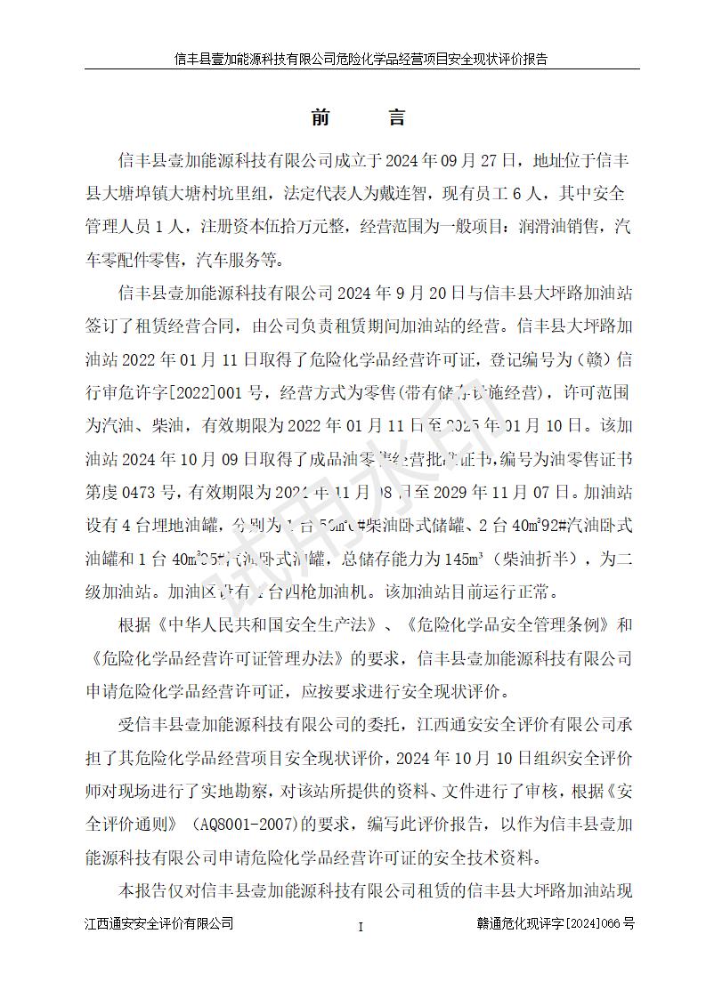 項(xiàng)目簡(jiǎn)介 | 信豐縣壹加能源科技有限公司成立于2024年09月27日,地址位于信豐縣大塘埠鎮(zhèn)大塘村坑里組,法定**人為戴連智,現(xiàn)有員工6人,其中安全管理人員1人,注冊(cè)資本伍拾萬(wàn)元整,經(jīng)營(yíng)范圍為一般項(xiàng)目:潤(rùn)滑油銷(xiāo)售,汽車(chē)零配件零售,汽車(chē)服務(wù)等。 信豐縣壹加能源科技有限公司2024年9月20日與信豐縣大坪路加油站簽訂了租賃經(jīng)營(yíng)合同,由公司負(fù)責(zé)租賃期間加油站的經(jīng)營(yíng)。信豐縣大坪路加油站2022年01月11日取得了危險(xiǎn)化學(xué)品經(jīng)營(yíng)許可證,登記編號(hào)為(贛)信行審危許字[2022]001號(hào),經(jīng)營(yíng)方式為零售(帶有儲(chǔ)存設(shè)施經(jīng)營(yíng)),許可范圍為汽油、柴油,**期限為2022年01月11日至2025年01月10日。該加油站2024年10月09日取得了成品油零售經(jīng)營(yíng)批準(zhǔn)證書(shū),編號(hào)為油零售證書(shū)第虔0473號(hào),**期限為2024年11月08日至2029年11月07日。加油站設(shè)有4臺(tái)埋地油罐,分別為1臺(tái)50m30#柴油臥式儲(chǔ)罐、2臺(tái)40m392#汽油臥式油罐和1臺(tái)40m395#汽油臥式油罐,總儲(chǔ)存能力為145m3(柴油折半),為二級(jí)加油站。加油區(qū)設(shè)有4臺(tái)四槍加油機(jī)。該加油站目前運(yùn)行正常。 | |||