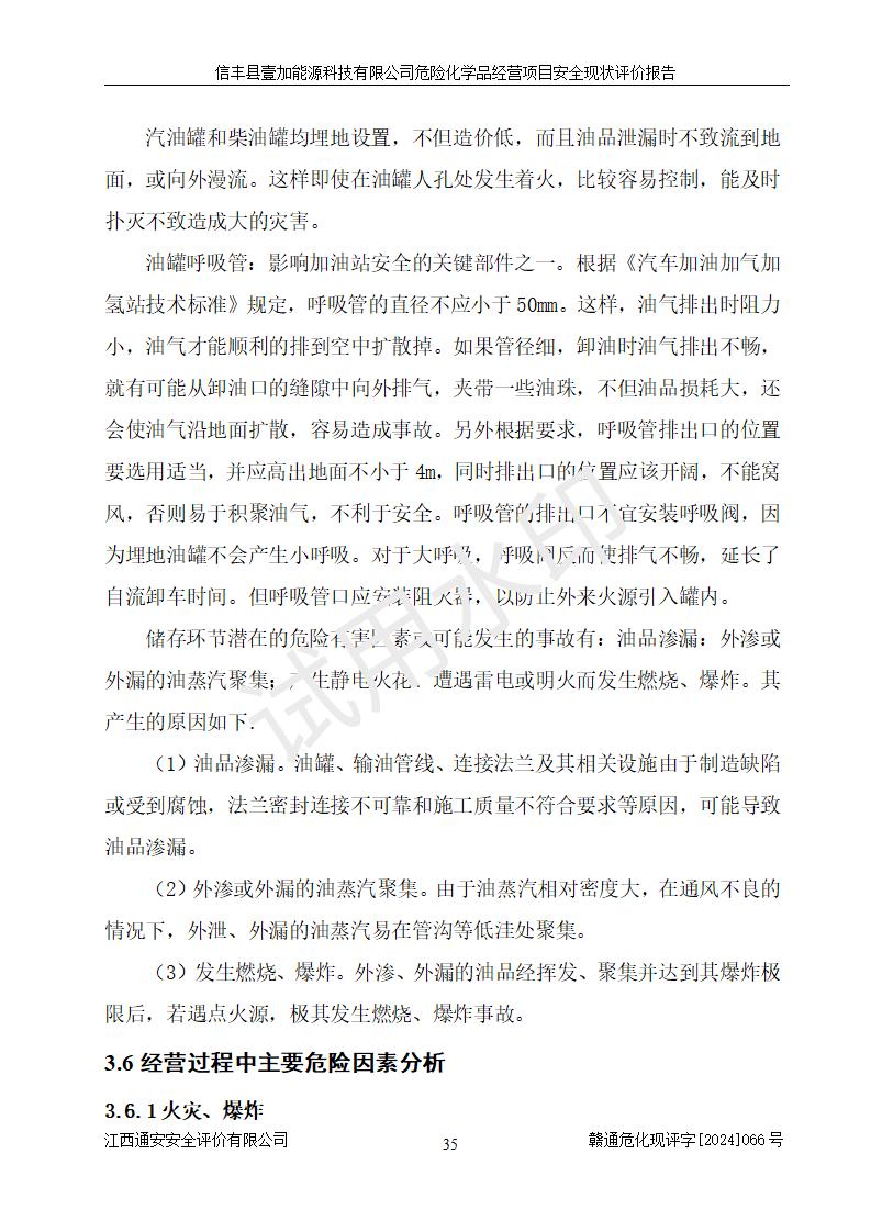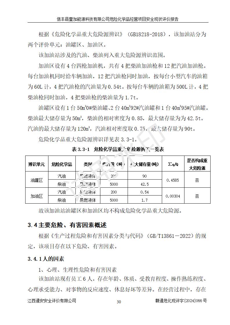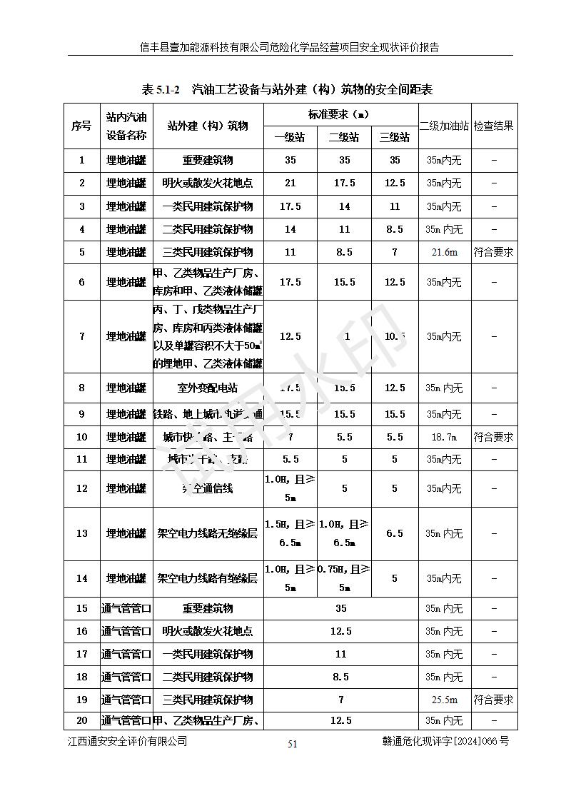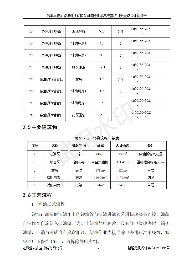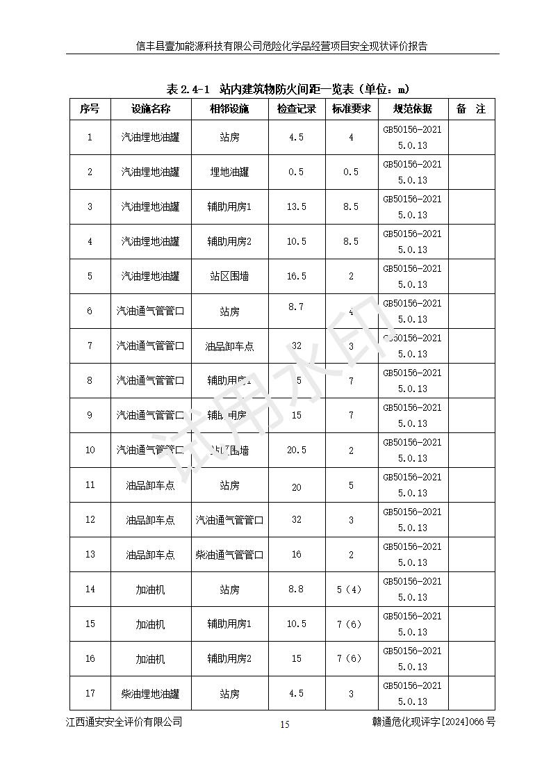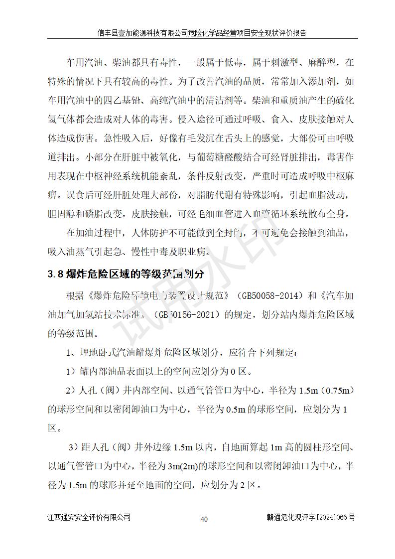項(xiàng)目簡(jiǎn)介 | 信豐縣壹加能源科技有限公司成立于2024年09月27日,地址位于信豐縣大塘埠鎮(zhèn)大塘村坑里組,法定**人為戴連智,現(xiàn)有員工6人,其中安全管理人員1人,注冊(cè)資本伍拾萬(wàn)元整,經(jīng)營(yíng)范圍為一般項(xiàng)目:潤(rùn)滑油銷(xiāo)售,汽車(chē)零配件零售,汽車(chē)服務(wù)等。 信豐縣壹加能源科技有限公司2024年9月20日與信豐縣大坪路加油站簽訂了租賃經(jīng)營(yíng)合同,由公司負(fù)責(zé)租賃期間加油站的經(jīng)營(yíng)。信豐縣大坪路加油站2022年01月11日取得了危險(xiǎn)化學(xué)品經(jīng)營(yíng)許可證,登記編號(hào)為(贛)信行審危許字[2022]001號(hào),經(jīng)營(yíng)方式為零售(帶有儲(chǔ)存設(shè)施經(jīng)營(yíng)),許可范圍為汽油、柴油,**期限為2022年01月11日至2025年01月10日。該加油站2024年10月09日取得了成品油零售經(jīng)營(yíng)批準(zhǔn)證書(shū),編號(hào)為油零售證書(shū)第虔0473號(hào),**期限為2024年11月08日至2029年11月07日。加油站設(shè)有4臺(tái)埋地油罐,分別為1臺(tái)50m30#柴油臥式儲(chǔ)罐、2臺(tái)40m392#汽油臥式油罐和1臺(tái)40m395#汽油臥式油罐,總儲(chǔ)存能力為145m3(柴油折半),為二級(jí)加油站。加油區(qū)設(shè)有4臺(tái)四槍加油機(jī)。該加油站目前運(yùn)行正常。 | |||